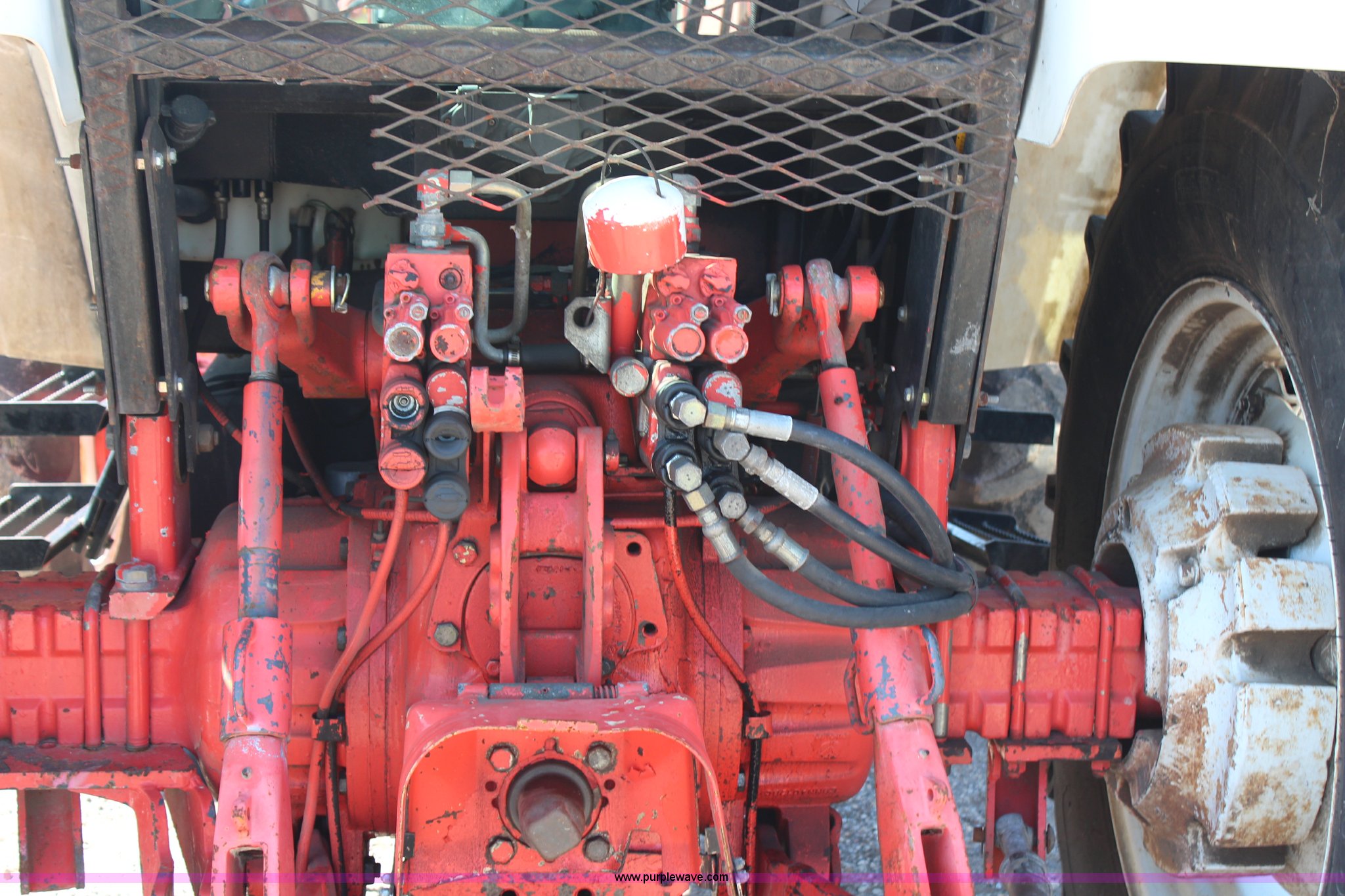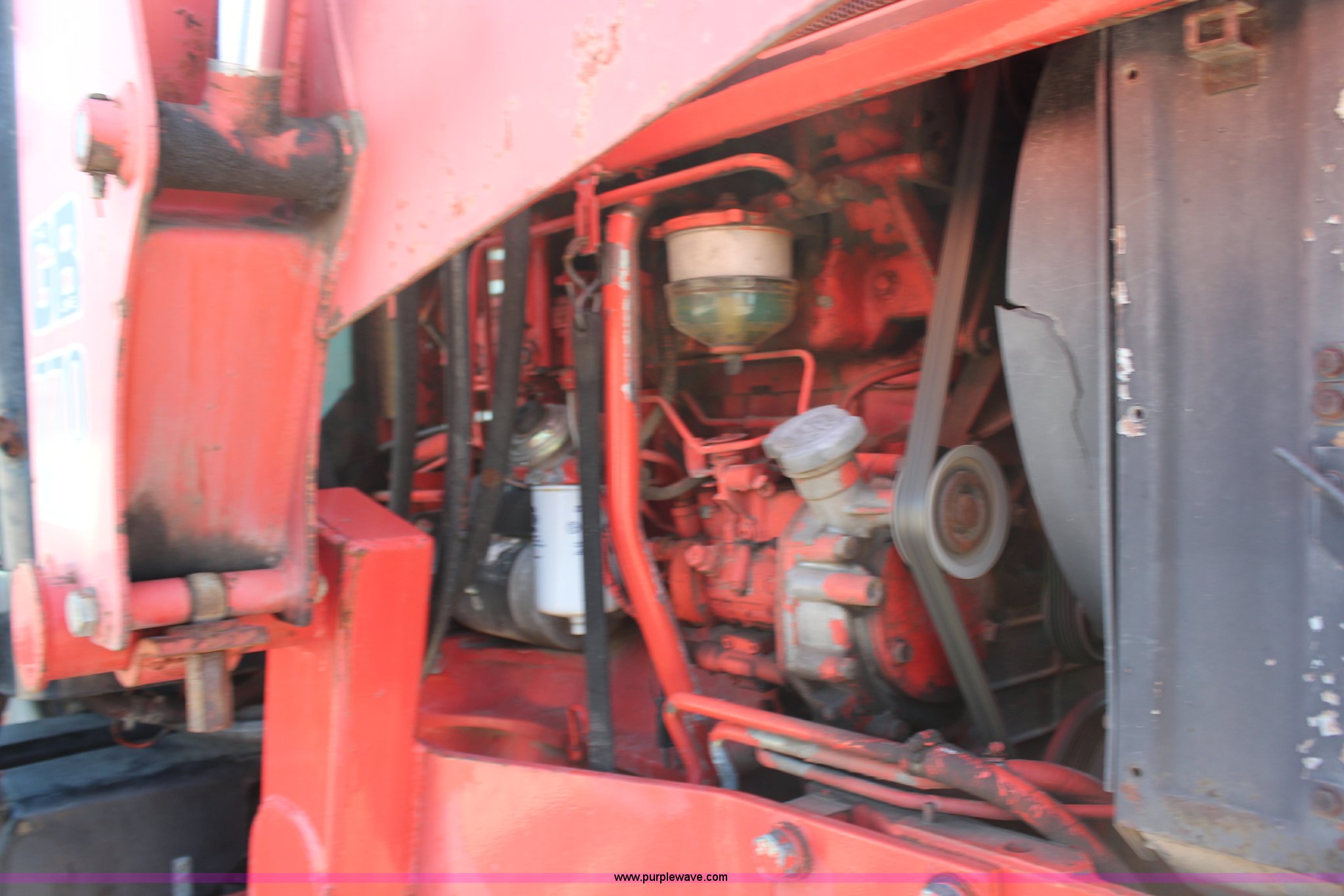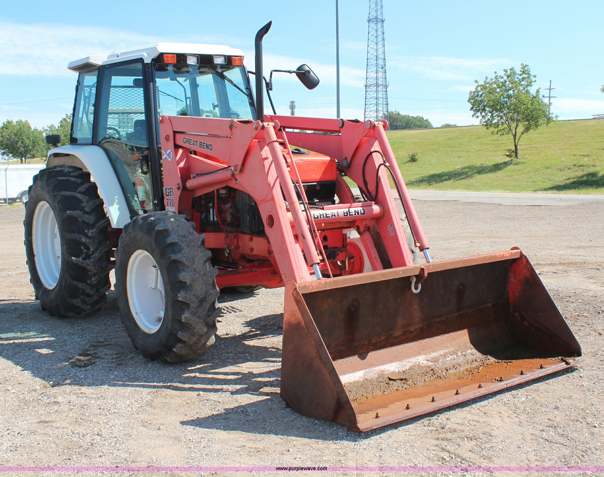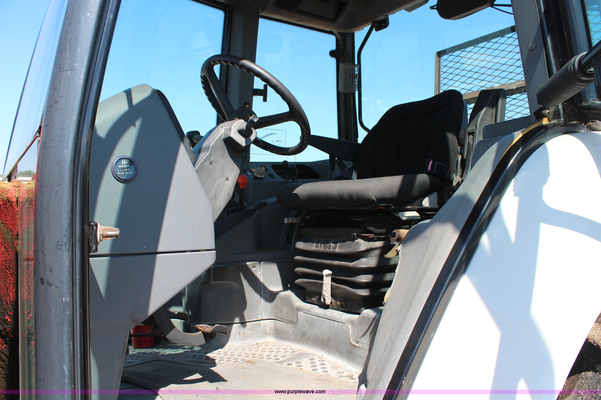 Purple Wave is selling a used Tractor in Kansas. This item is a 1997 New Holland 7740SL MFWD tractor with the following: 4,586 hours on meter, Ford 5.0L four cylinder diesel engine, Synchroshift transmission, 12F-12R gears, Differential lock, AC and heat, AM/FM/cassette, Spring suspension seat, Tilt steering wheel, Great Bend 770 loader, 7' bucket, Bolt-on cutting edge, Quick attach, Two-lever control, Serial 1694, Three point, Auxiliary outlet, 540/1000 PTO, 86 PTO HP, (4) rear hydraulic remotes, Wheel weights, 94" wheelbase, 14.9-24 front tires, 18.4-34 rear tires, Paint faded and scratched, Hydraulics weak, Poor condition of forward and reverse, Synchronizer bad, PTO clutch is out, Damaged steering cylinder, Dead batteries, Serial 087692B, KDOT ID 366-1018