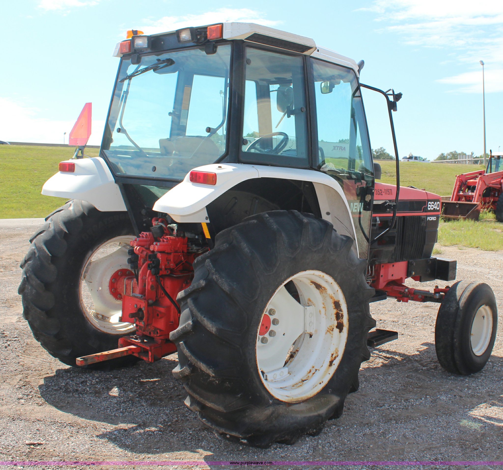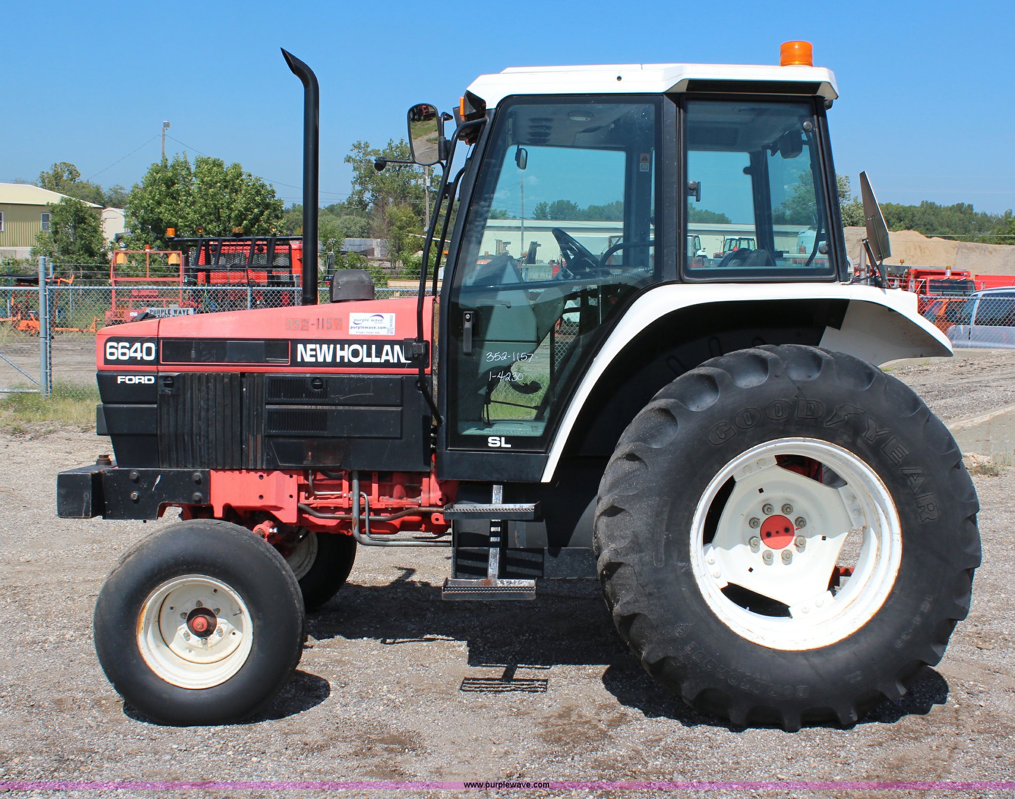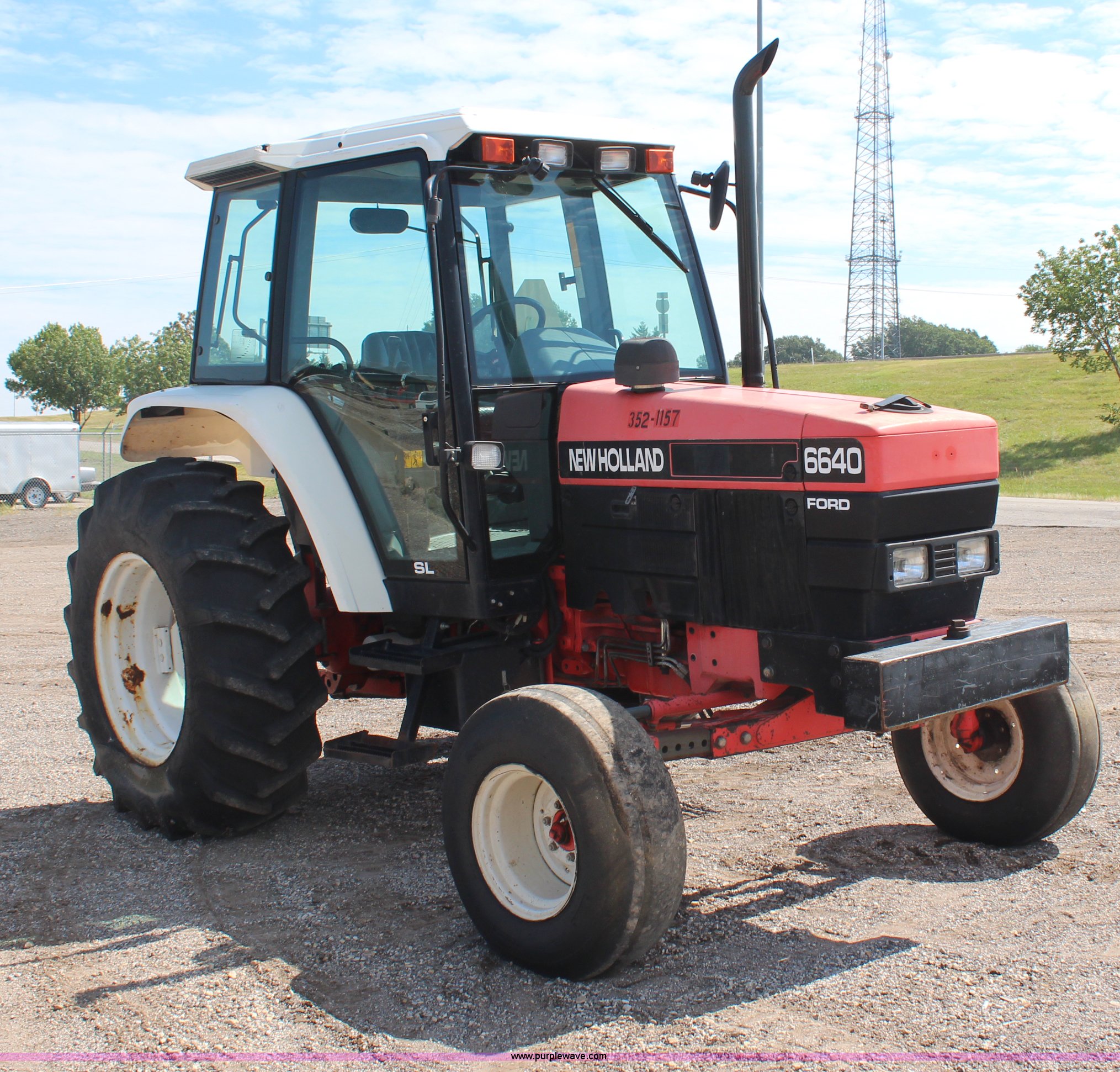 Purple Wave is selling a used Tractor in Kansas. This item is a 1997 Ford New Holland 6640SL tractor with the following: 5,448 hours on meter, Ford 5.0L four cylinder diesel engine, Synchroshift transmission, 12F-12R gears, AC and heat, AM/FM/cassette, Spring suspension seat, Tilt steering wheel, Three point, Arms missing, Draw bar, 540/1000 PTO, 76 PTO HP, (4) rear hydraulic remotes, 94" wheelbase, Strobe light, 10.00-16 front tires, 18.4-30 rear tires, Paint faded and scratched, Flat right rear tire, Serial 087440B, KDOT ID 352-1157