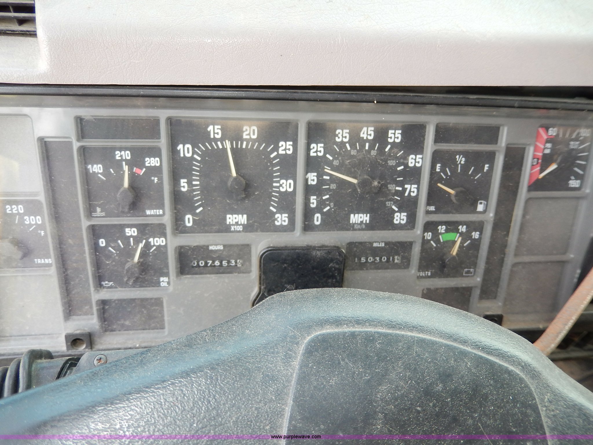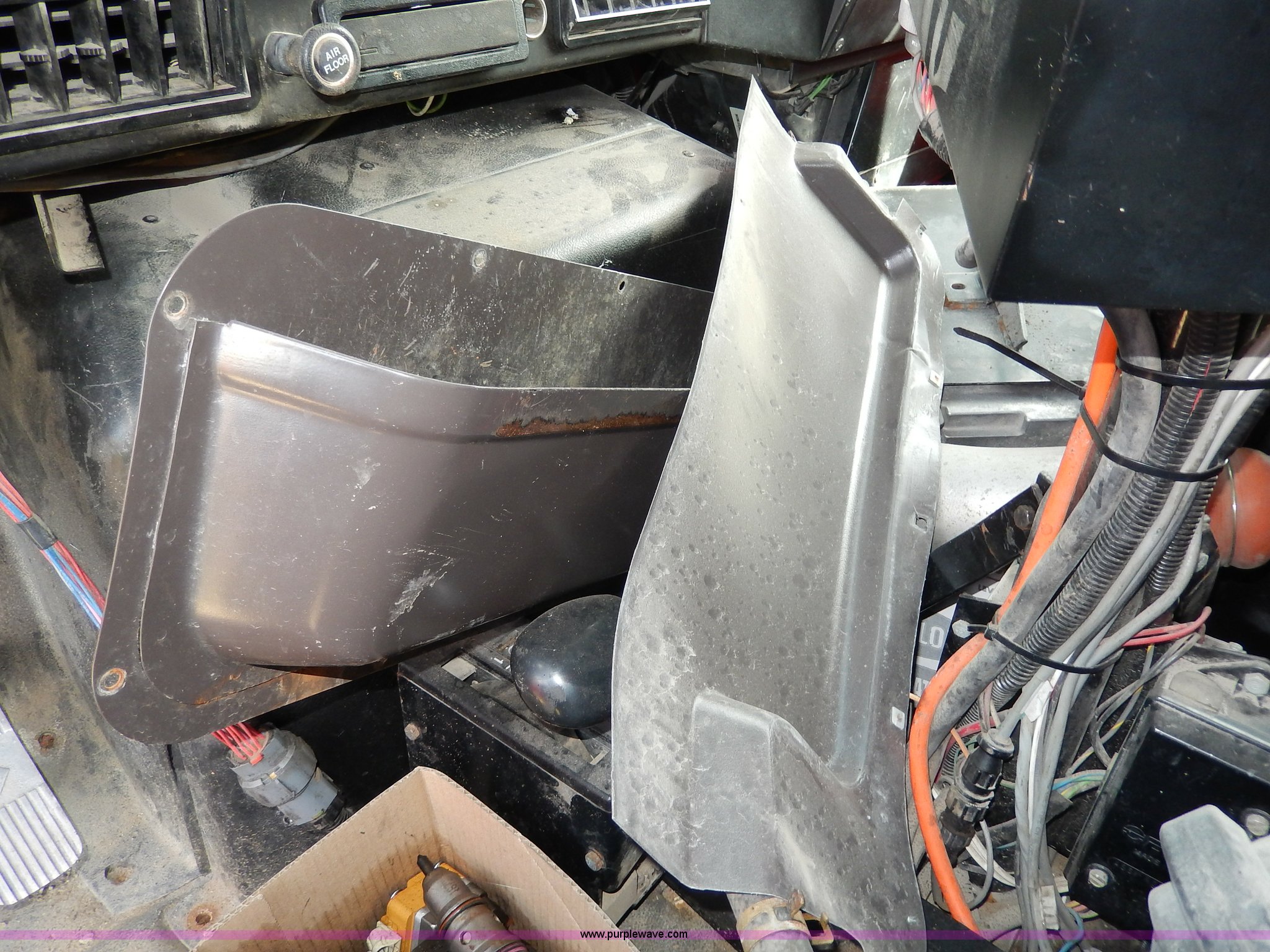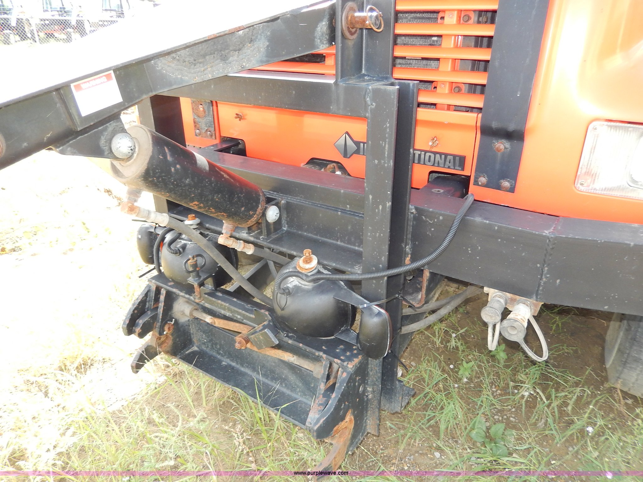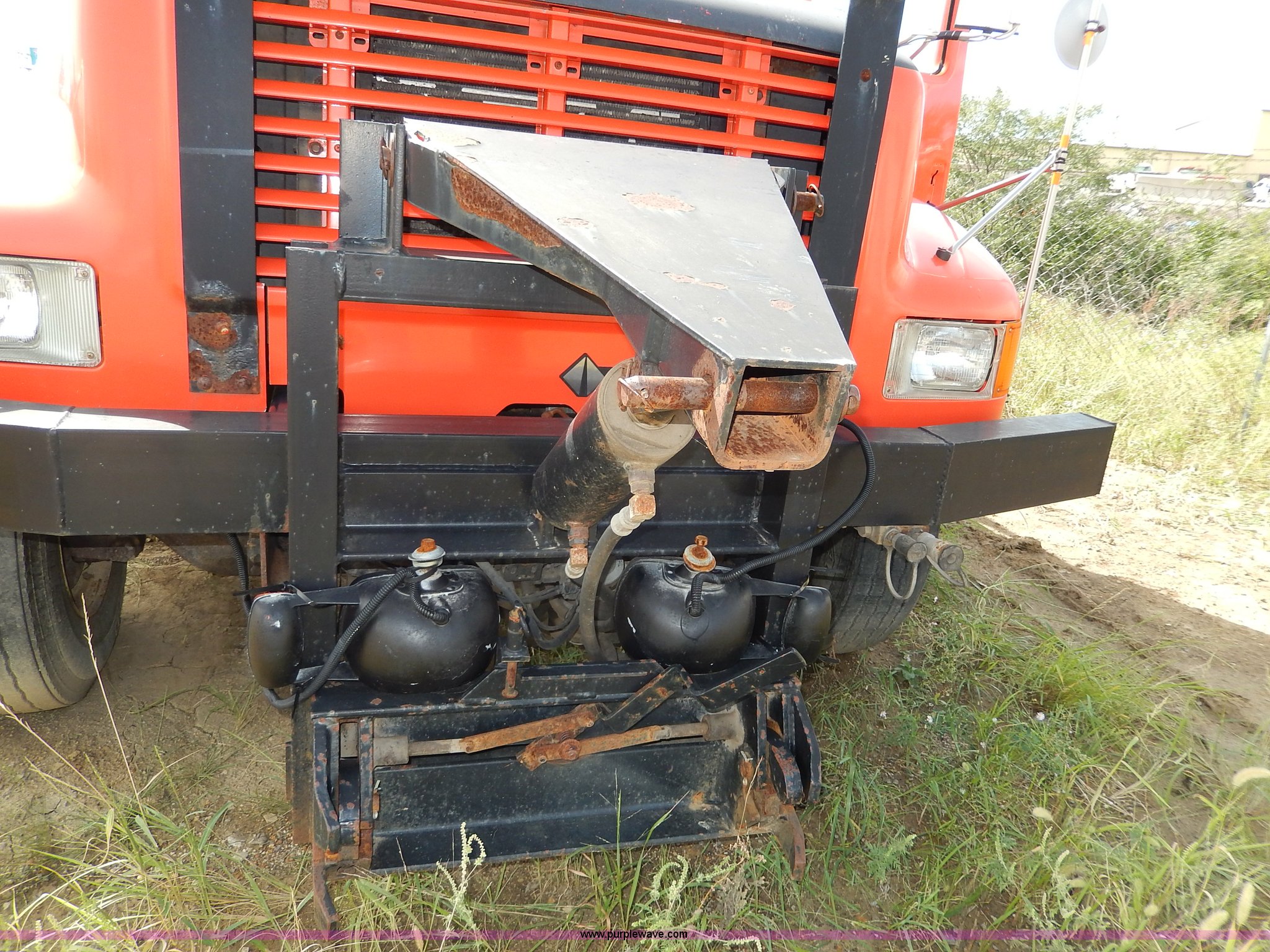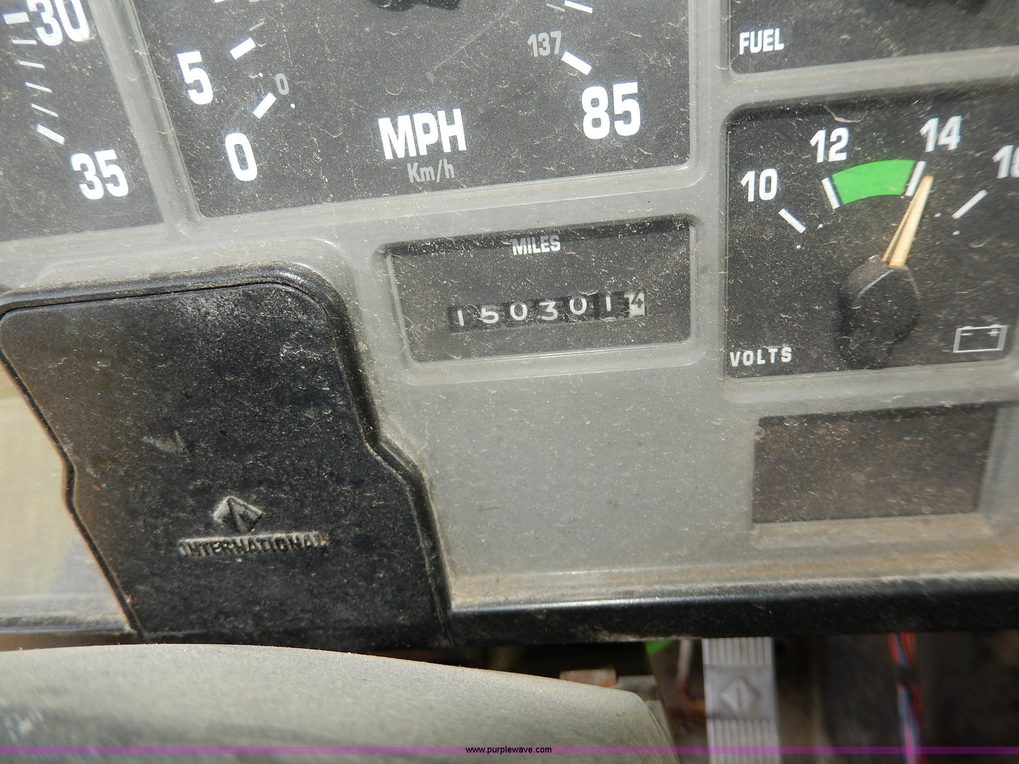Purple Wave is selling a used Construction Dump Truck in Kansas. This item is a 1999 International 4900 dump truck with the following: 150,301 miles on odometer, 7,653 hours on meter, International DT530E 8.7L L6 diesel engine, Engine is bad, Allison MD3060-CR automatic transmission, Power divider lock, AC and heat, Cruise, AM/FM, Air suspension seat, Heated mirrors, Force spreader controls, 13' x 8' bed, 11' plow, Included in bed, Block heater, Trailer wiring, Toolboxes, Pintle hitch, Rear hydraulics, Single rear exhaust stack, 70 gallon fuel tank, Air brakes, 275/80R22.5 tires, Paint faded and scratched, Driver side exterior door handle missing, No keys, KDOT ID 264-1058