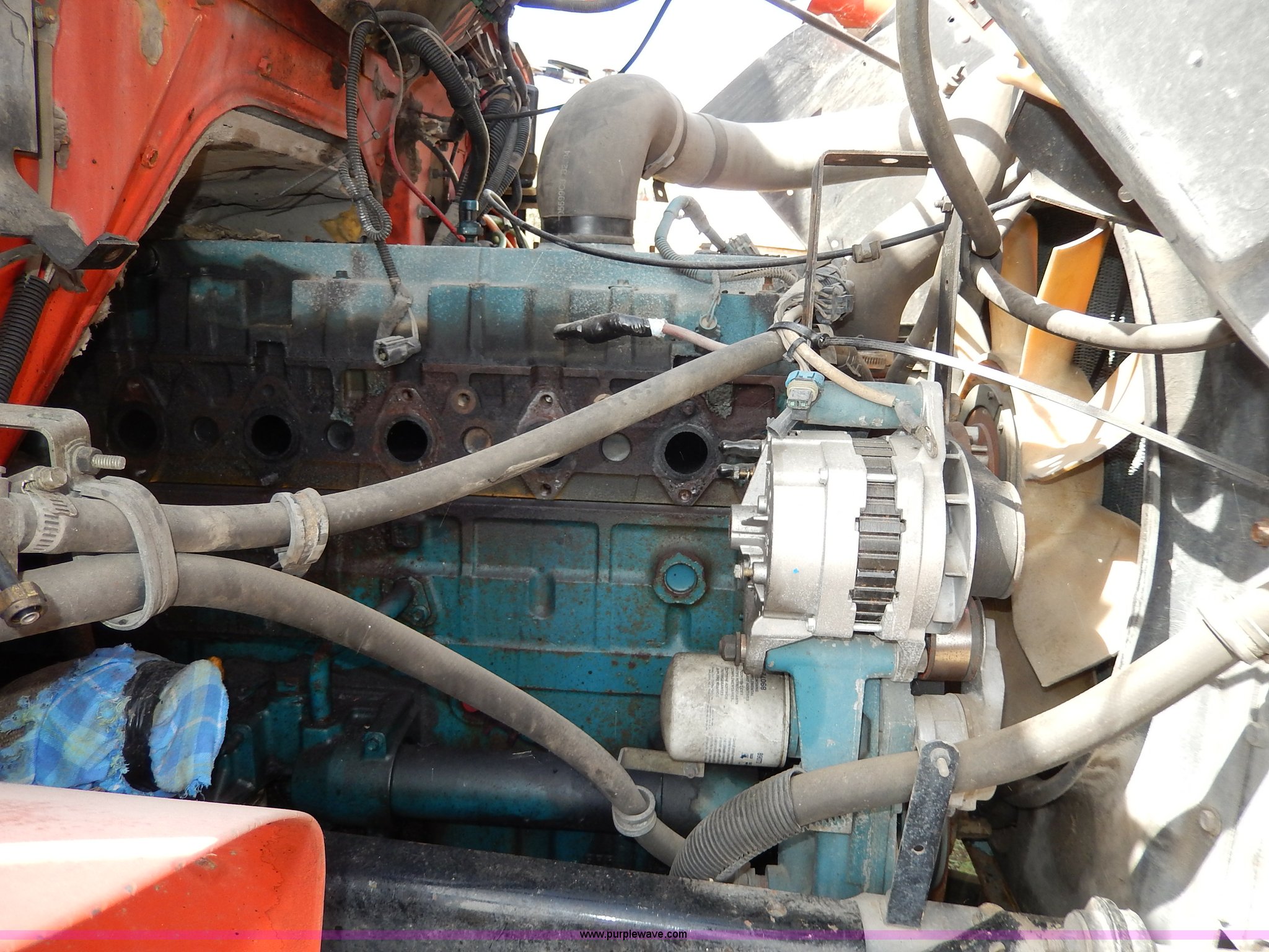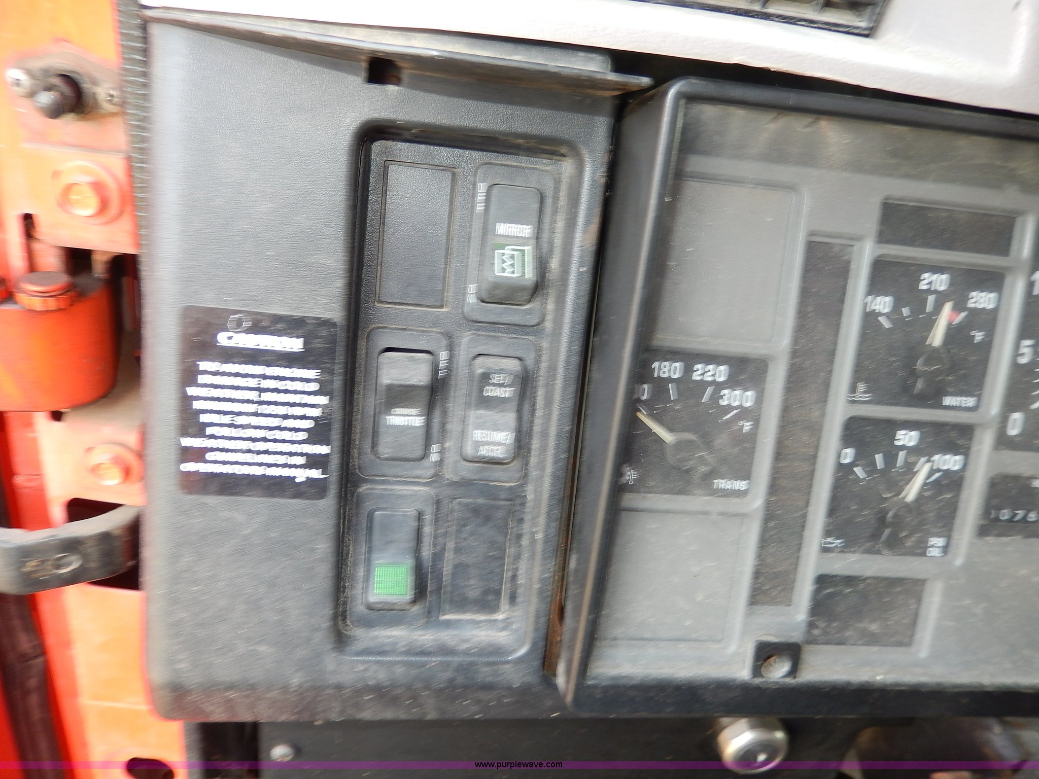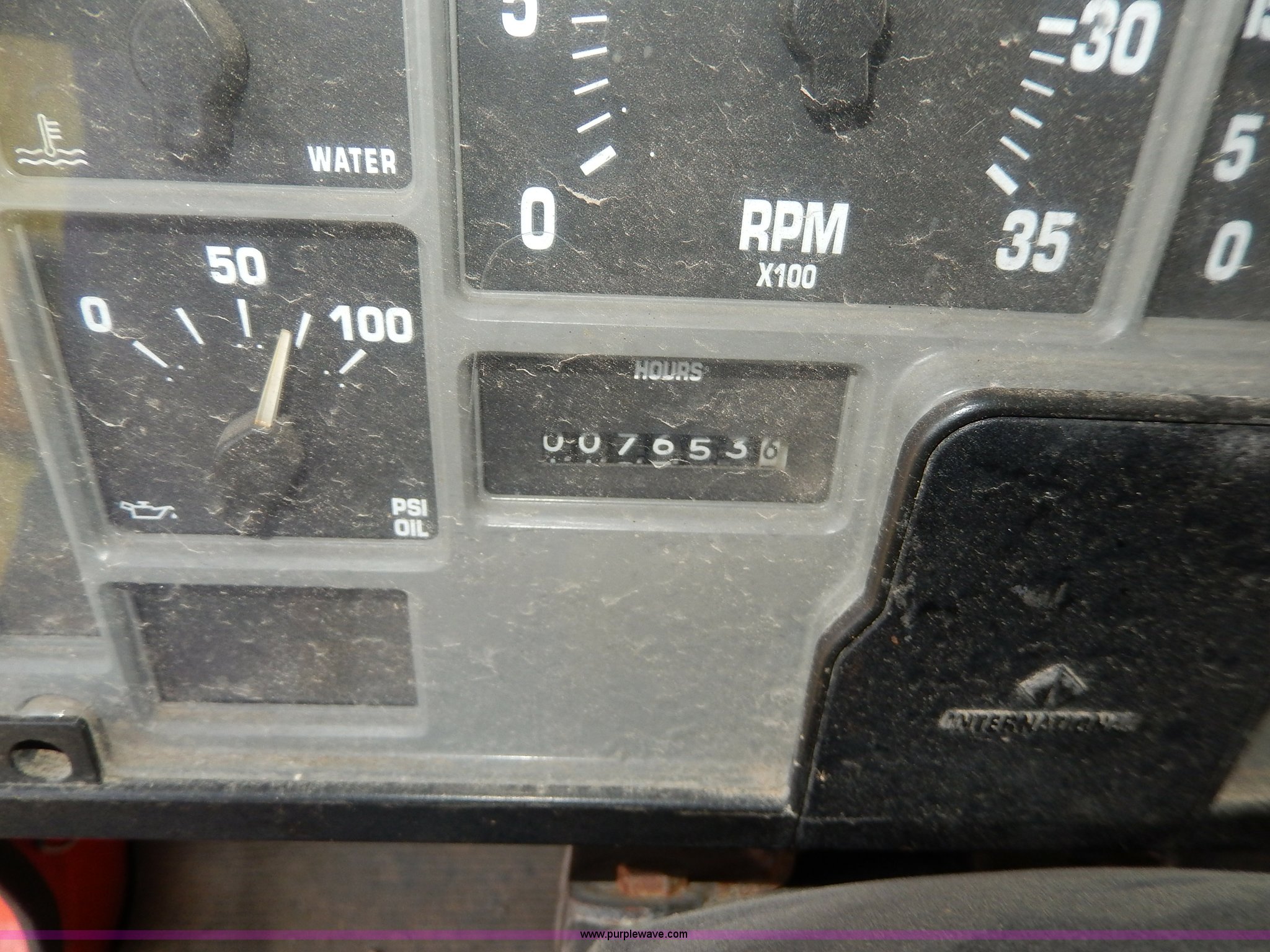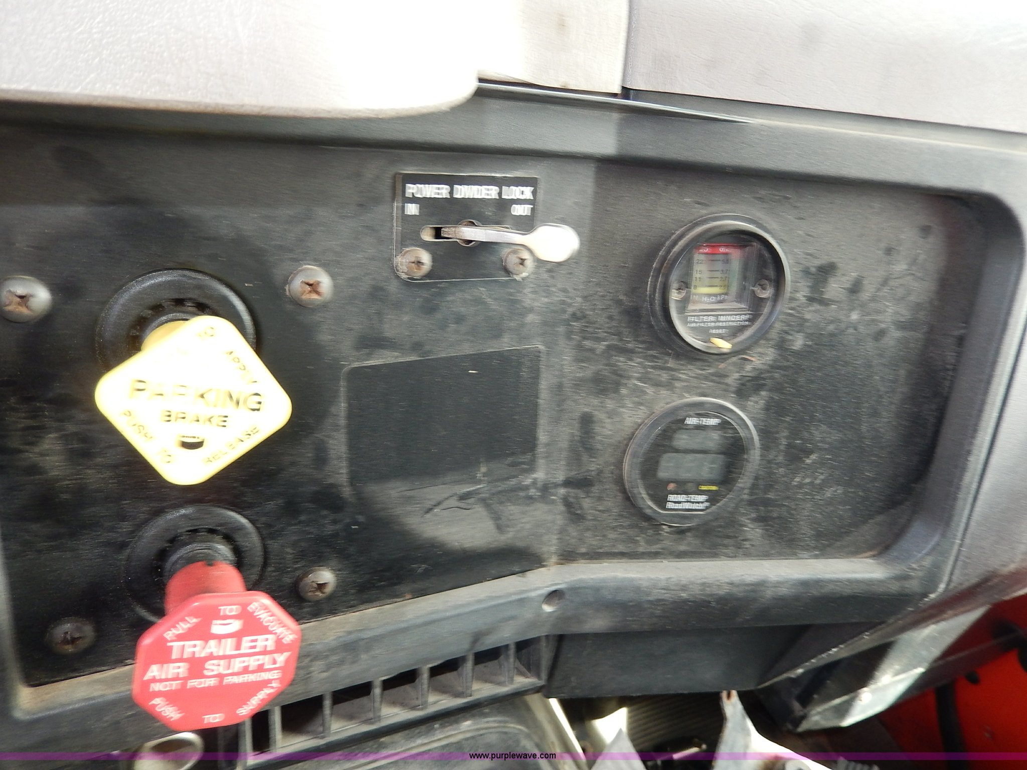 Purple Wave is selling a used Construction Dump Truck in Kansas. This item is a 1999 International 4900 dump truck with the following: 150,301 miles on odometer, 7,653 hours on meter, International DT530E 8.7L L6 diesel engine, Engine is bad, Allison MD3060-CR automatic transmission, Power divider lock, AC and heat, Cruise, AM/FM, Air suspension seat, Heated mirrors, Force spreader controls, 13' x 8' bed, 11' plow, Included in bed, Block heater, Trailer wiring, Toolboxes, Pintle hitch, Rear hydraulics, Single rear exhaust stack, 70 gallon fuel tank, Air brakes, 275/80R22.5 tires, Paint faded and scratched, Driver side exterior door handle missing, No keys, KDOT ID 264-1058