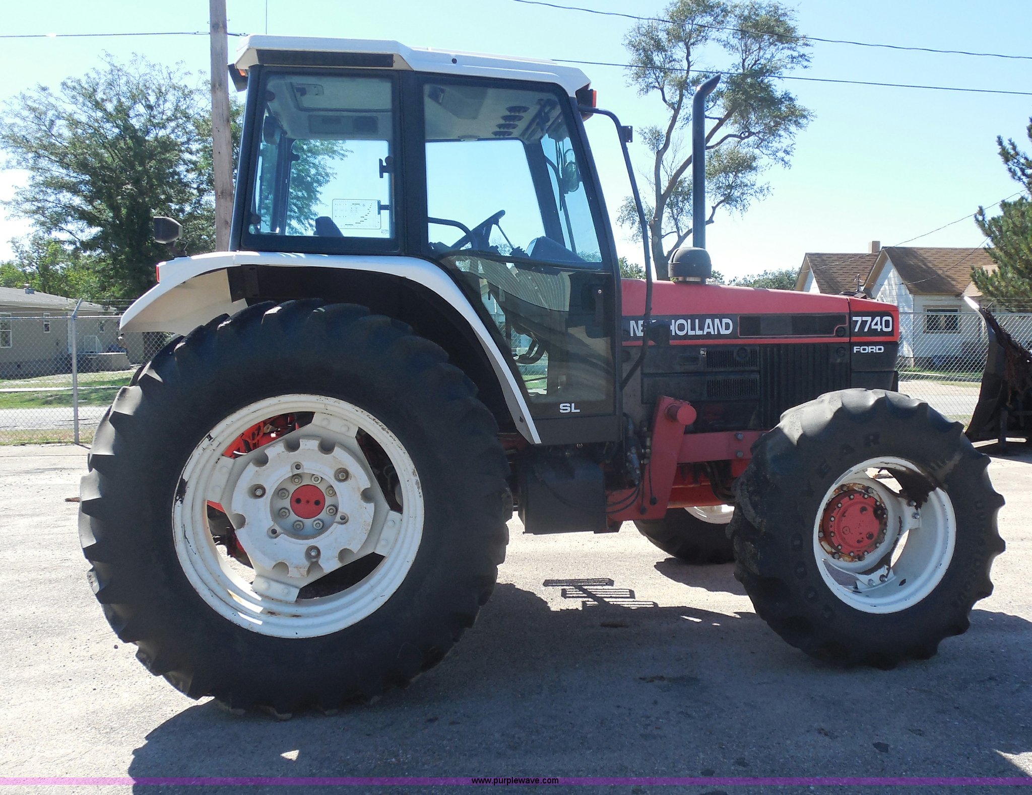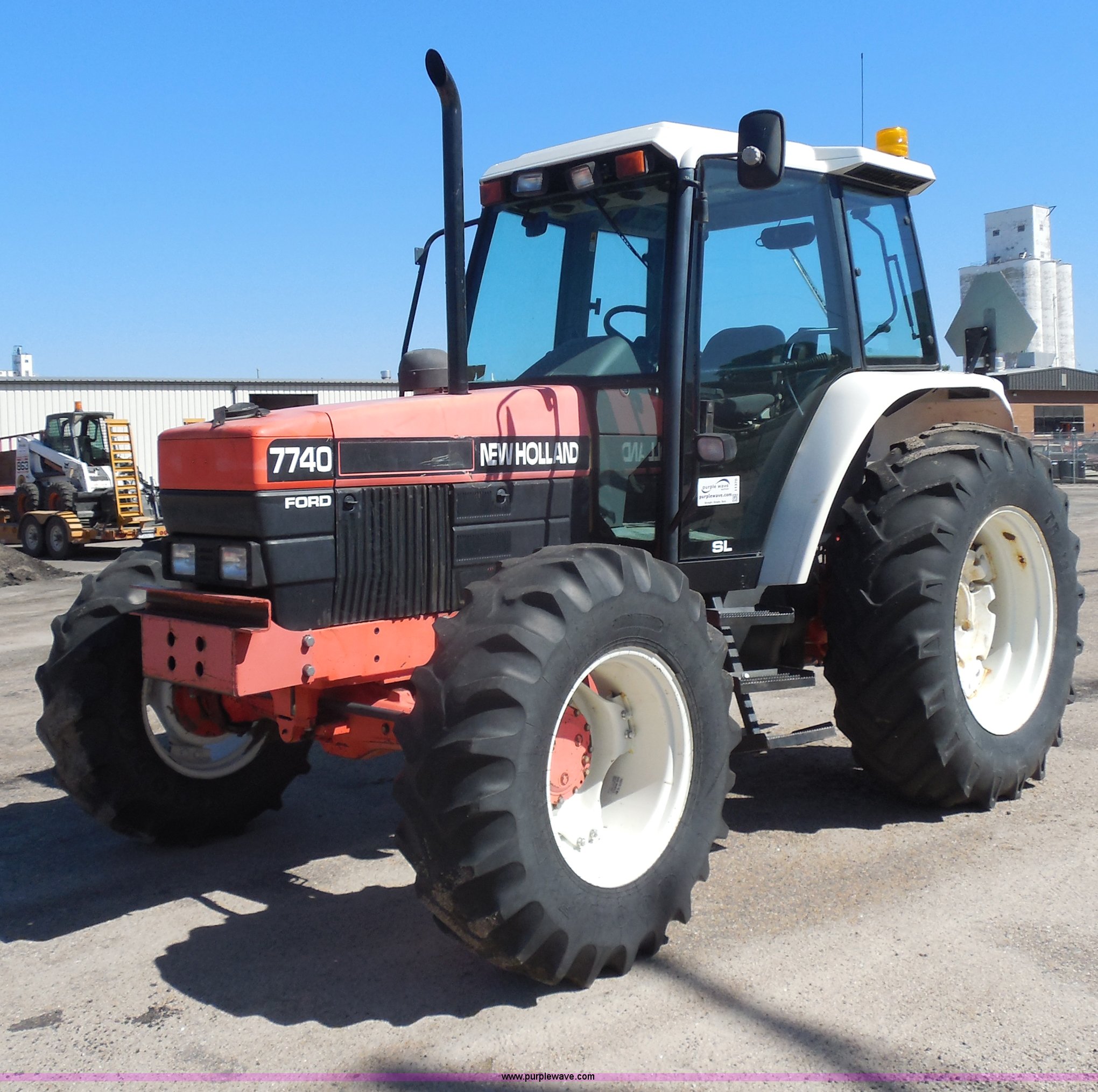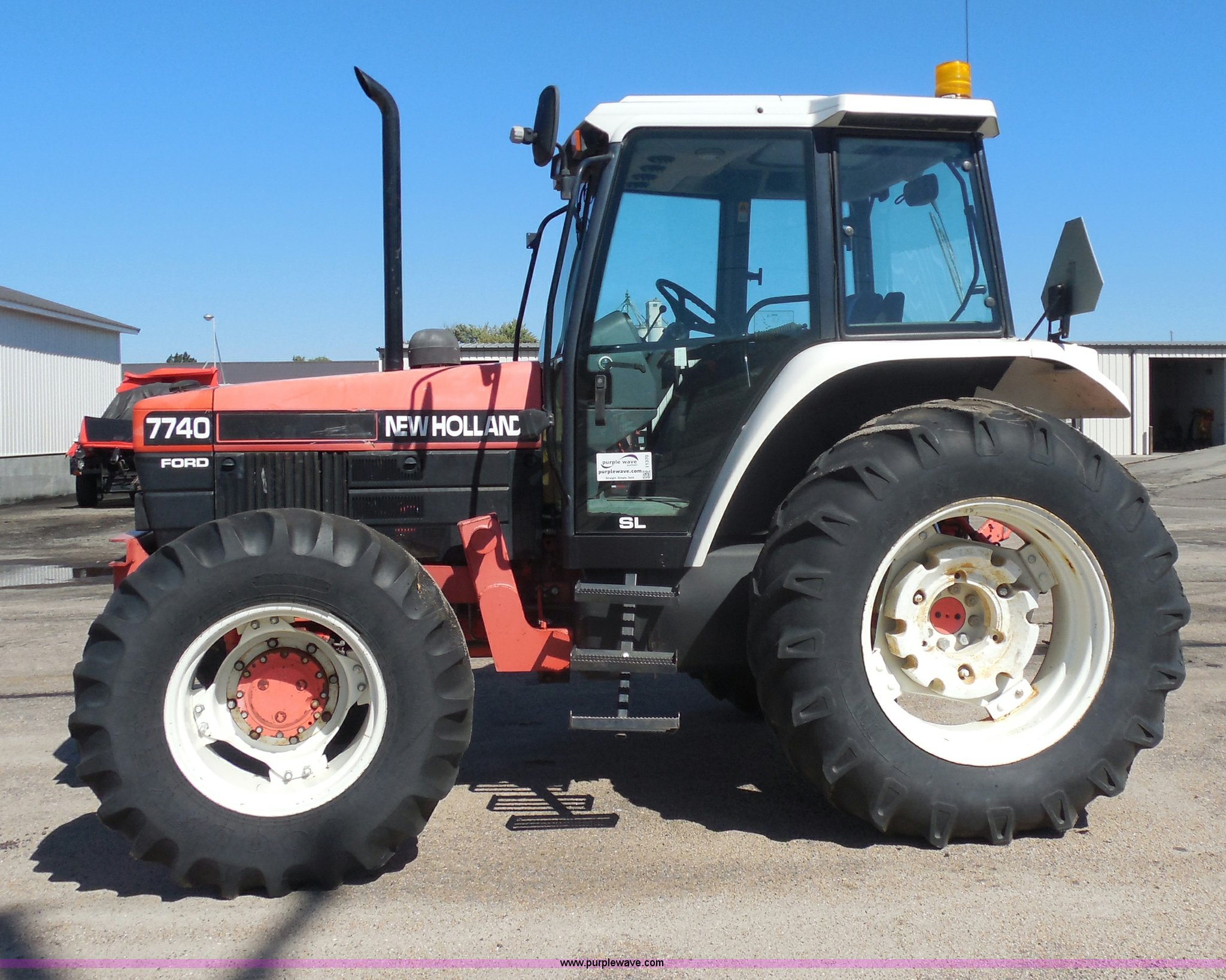 Purple Wave is selling a used Tractor in Kansas. This item is a 1998 Ford 7740SL MFWD tractor with the following: 5,371 hours on meter, Ford 5.0L four cylinder diesel engine, Synchroshift transmission, 12F-12R gears, Differential lock, AC and heat, AM/FM, Spring suspension seat, Tilt steering wheel, Great Bend 770 loader, 7' bucket, Bolt-on cutting edge, Quick attach, Joystick control, Serial 1676, Three point, Auxiliary outlet, 540 PTO, 86 PTO HP, Draw bar, (4) rear hydraulic remotes, Wheel weights, 94" wheelbase, 14.9-24 front tires, 18.4-34 rear tires, Paint faded and scratched, Front main seal leaks, Hydraulic leaks on rear of tractor, Serial 087748B, KDOT ID 366-3027