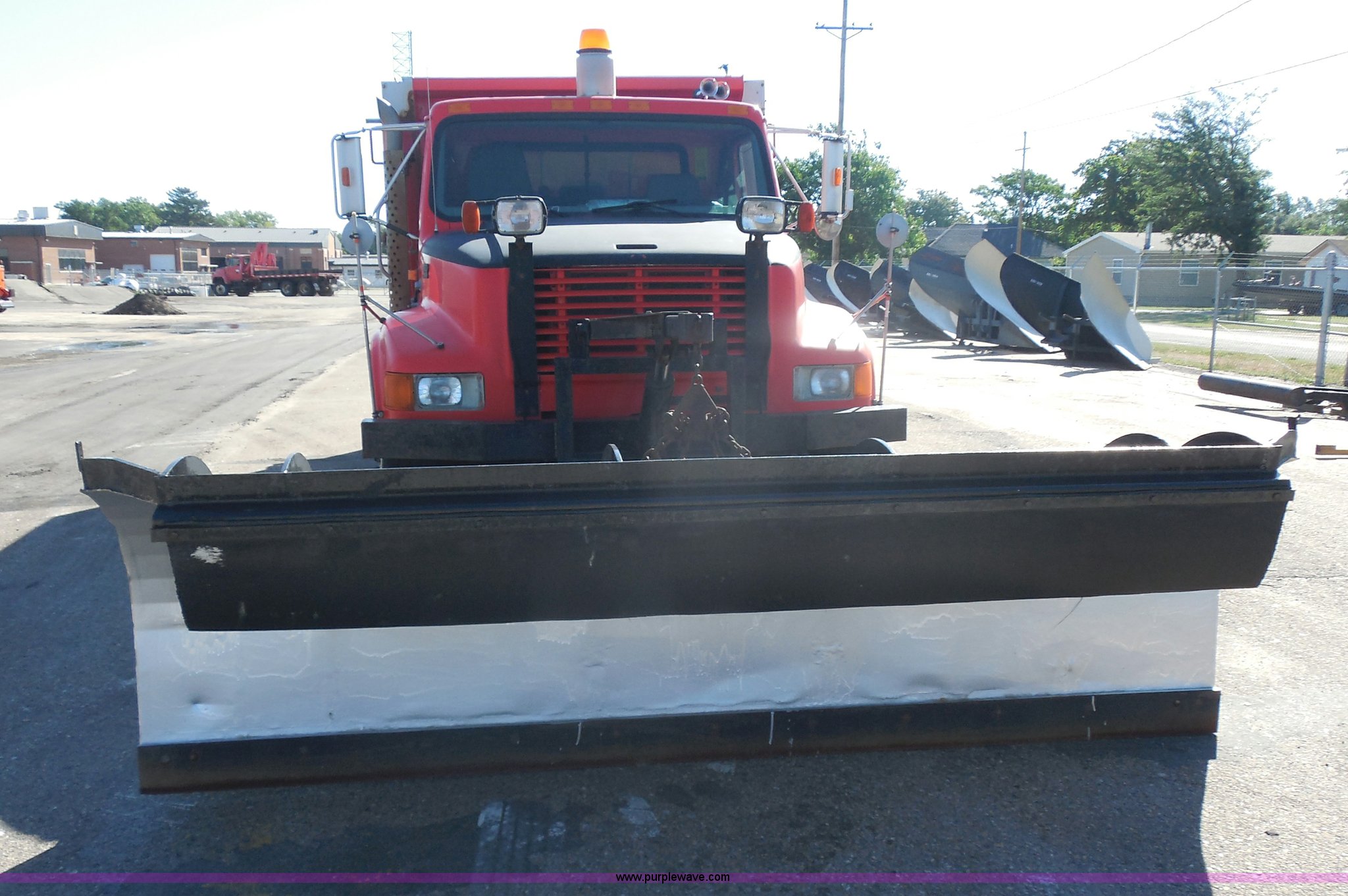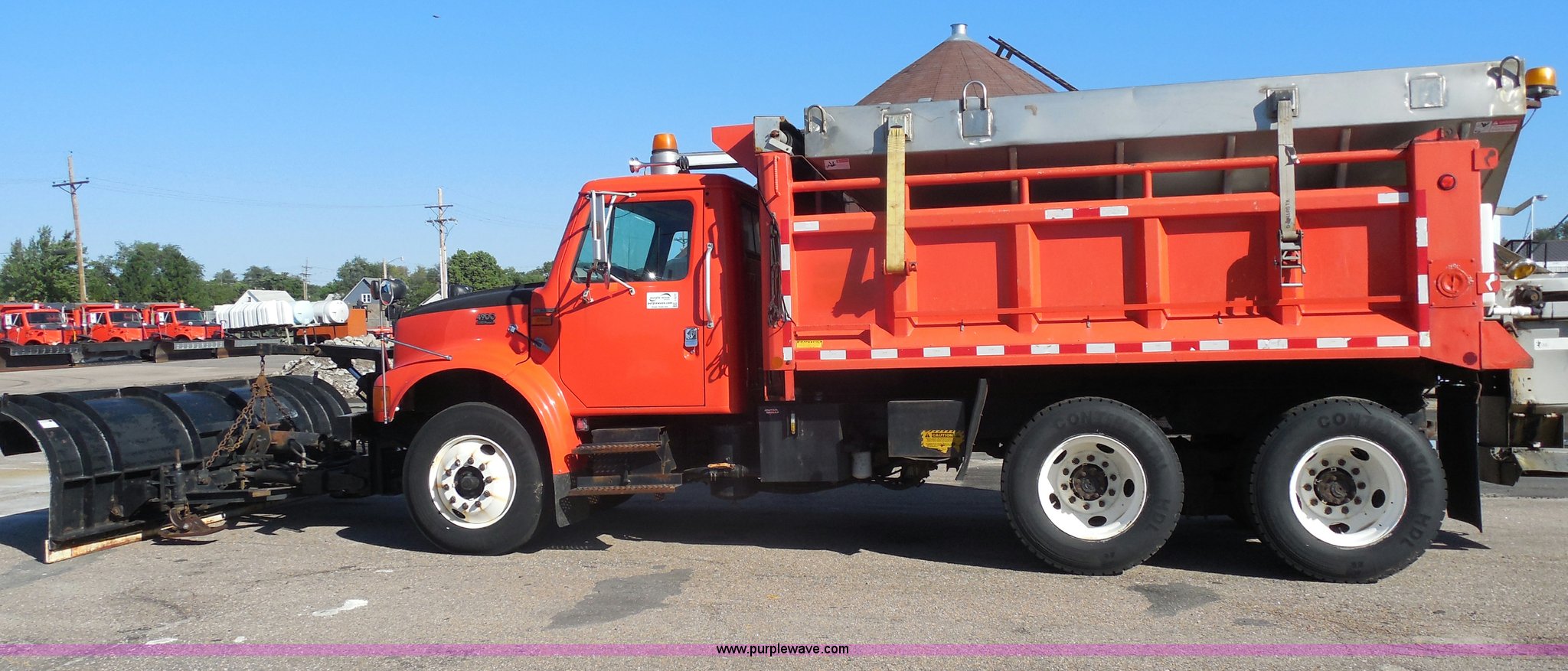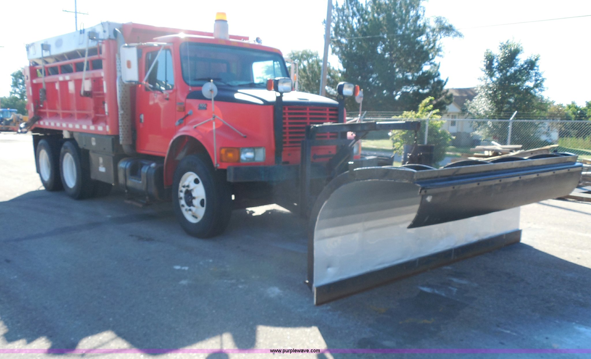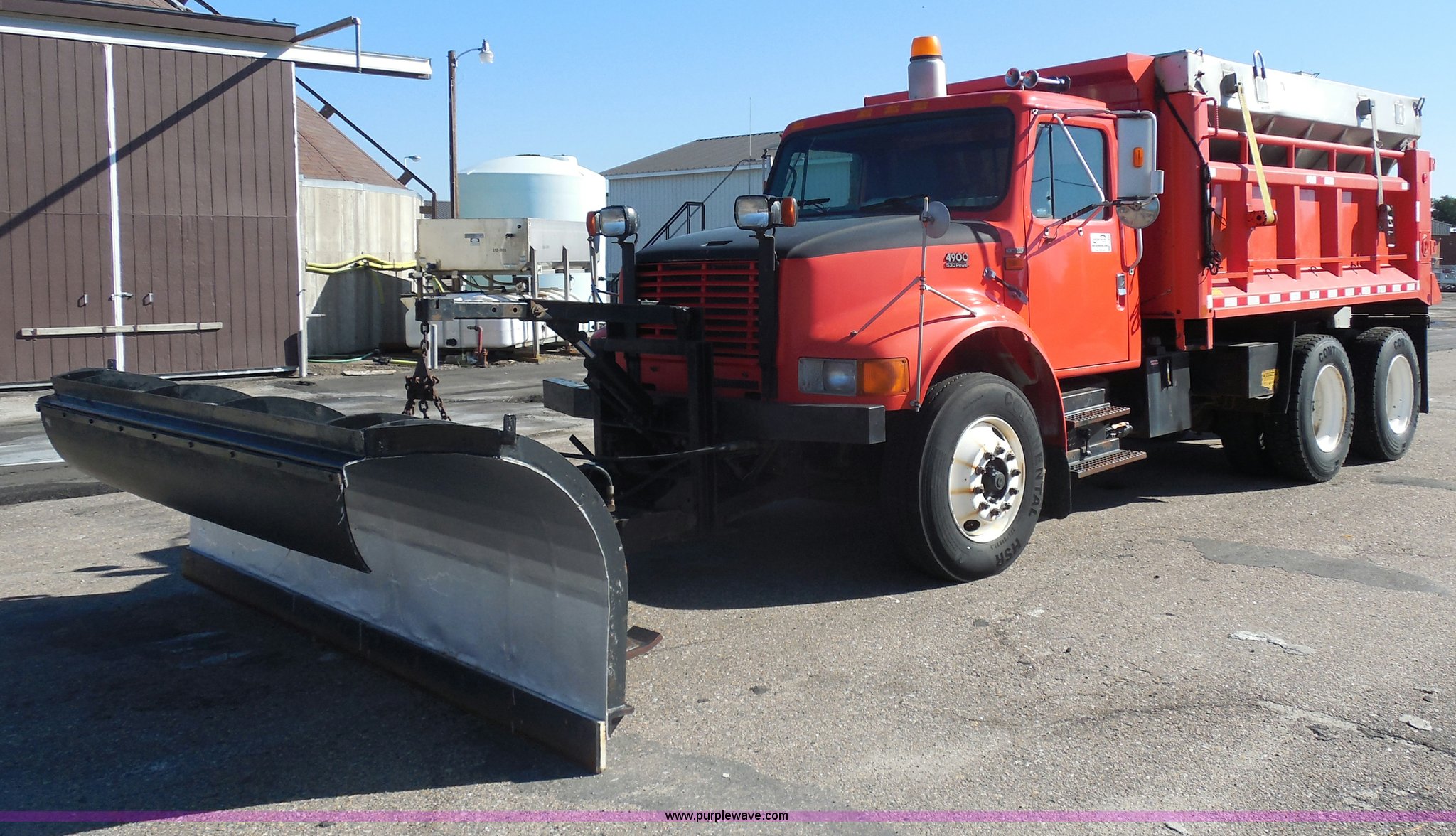 Purple Wave is selling a used Construction Dump Truck in Kansas. This item is a 1999 International 4900 dump truck with the following: 166,616 miles on odometer, International DT530 8.7L L6 diesel engine, Allison MD3060-CR automatic transmission, Nine cu. yd. spreader, 11' snow plow, 275/80R22.5 front tires, 295/75R22.5 rear tires, Paint faded and scratched, Engine misfire, Engine weak, Rust, Right front fender damaged, KDOT ID 264-3119