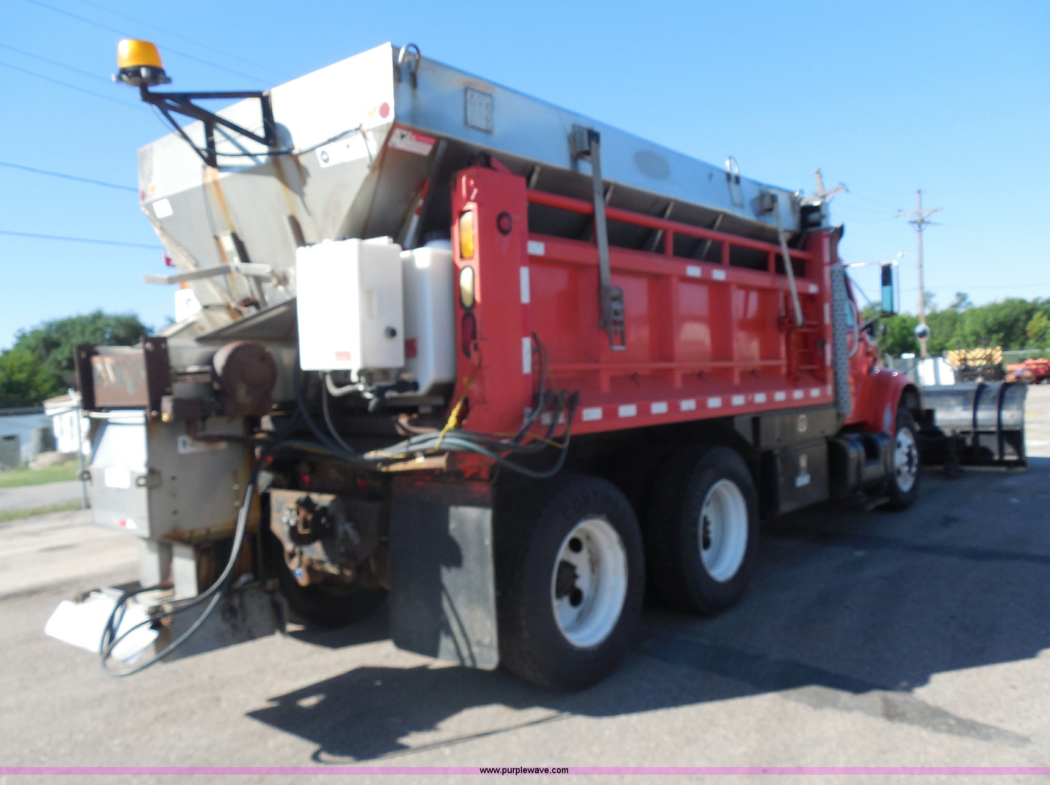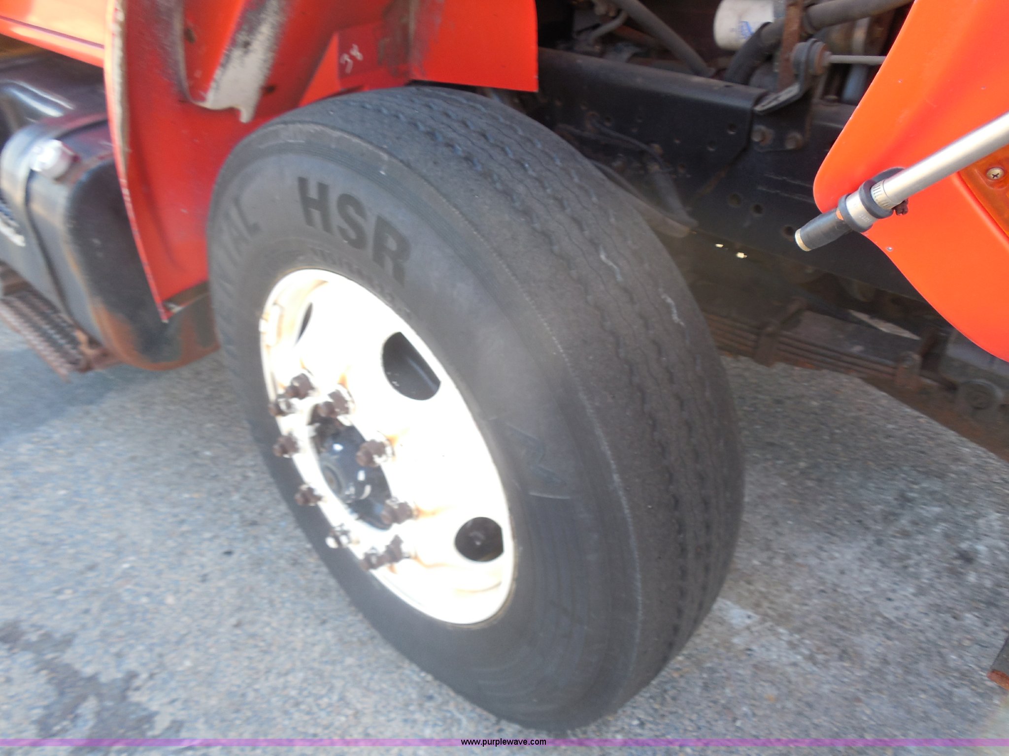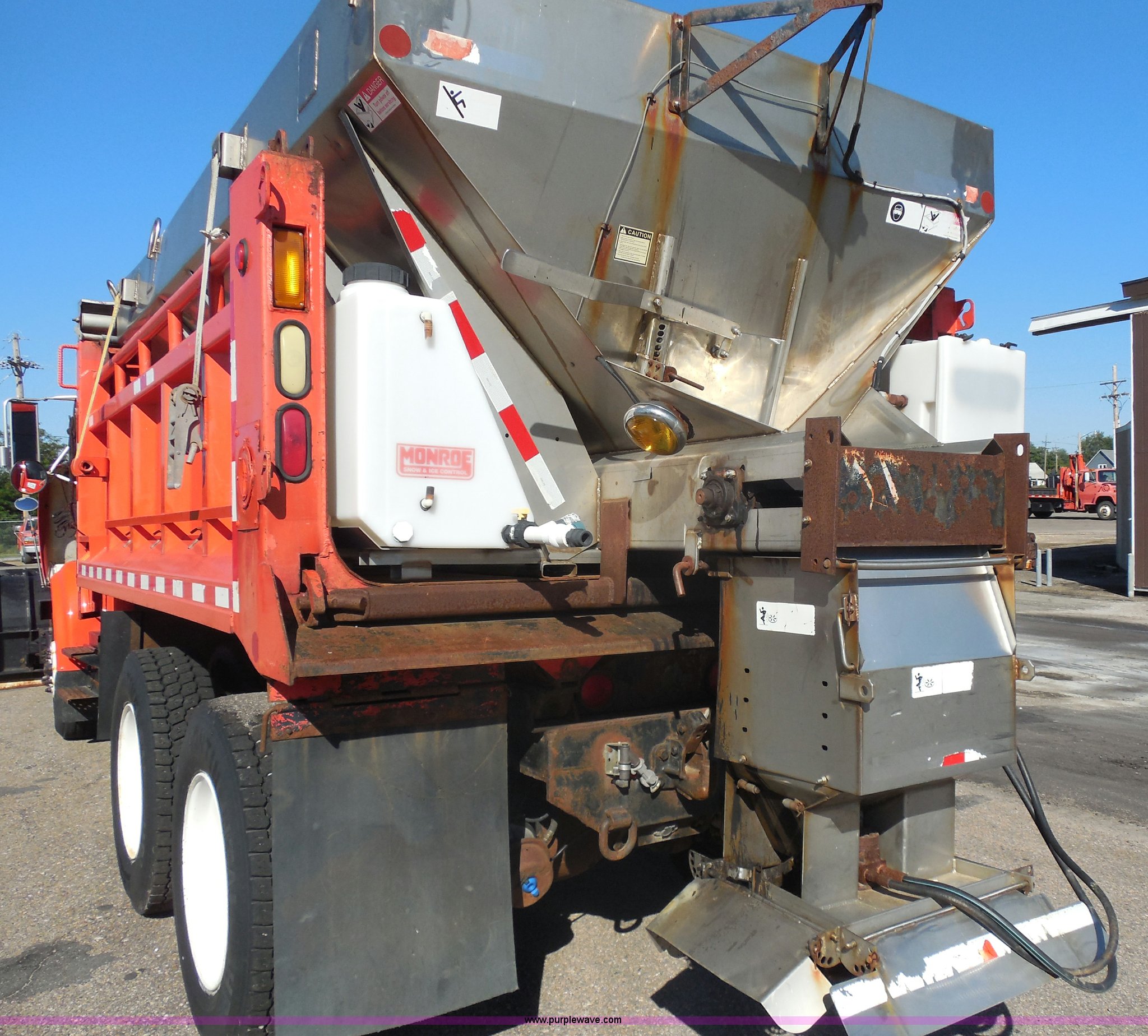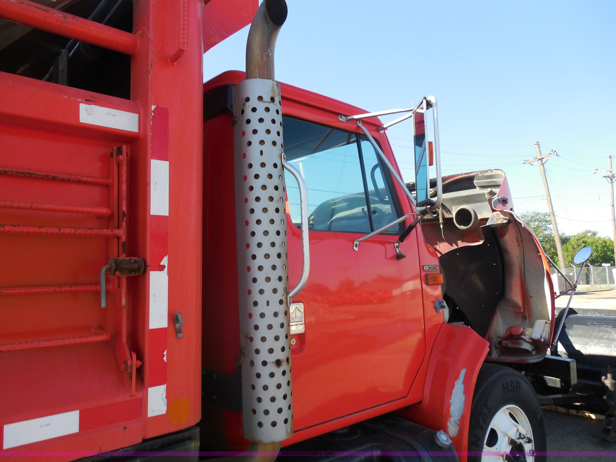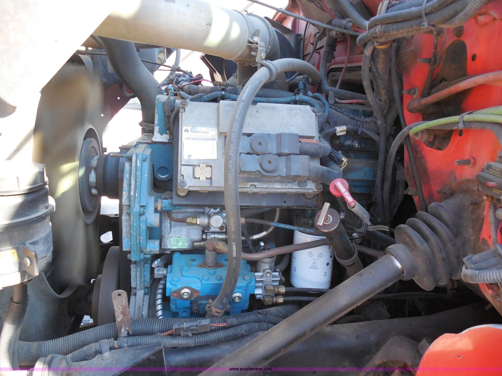 Purple Wave is selling a used Construction Dump Truck in Kansas. This item is a 1999 International 4900 dump truck with the following: 166,616 miles on odometer, International DT530 8.7L L6 diesel engine, Allison MD3060-CR automatic transmission, Nine cu. yd. spreader, 11' snow plow, 275/80R22.5 front tires, 295/75R22.5 rear tires, Paint faded and scratched, Engine misfire, Engine weak, Rust, Right front fender damaged, KDOT ID 264-3119