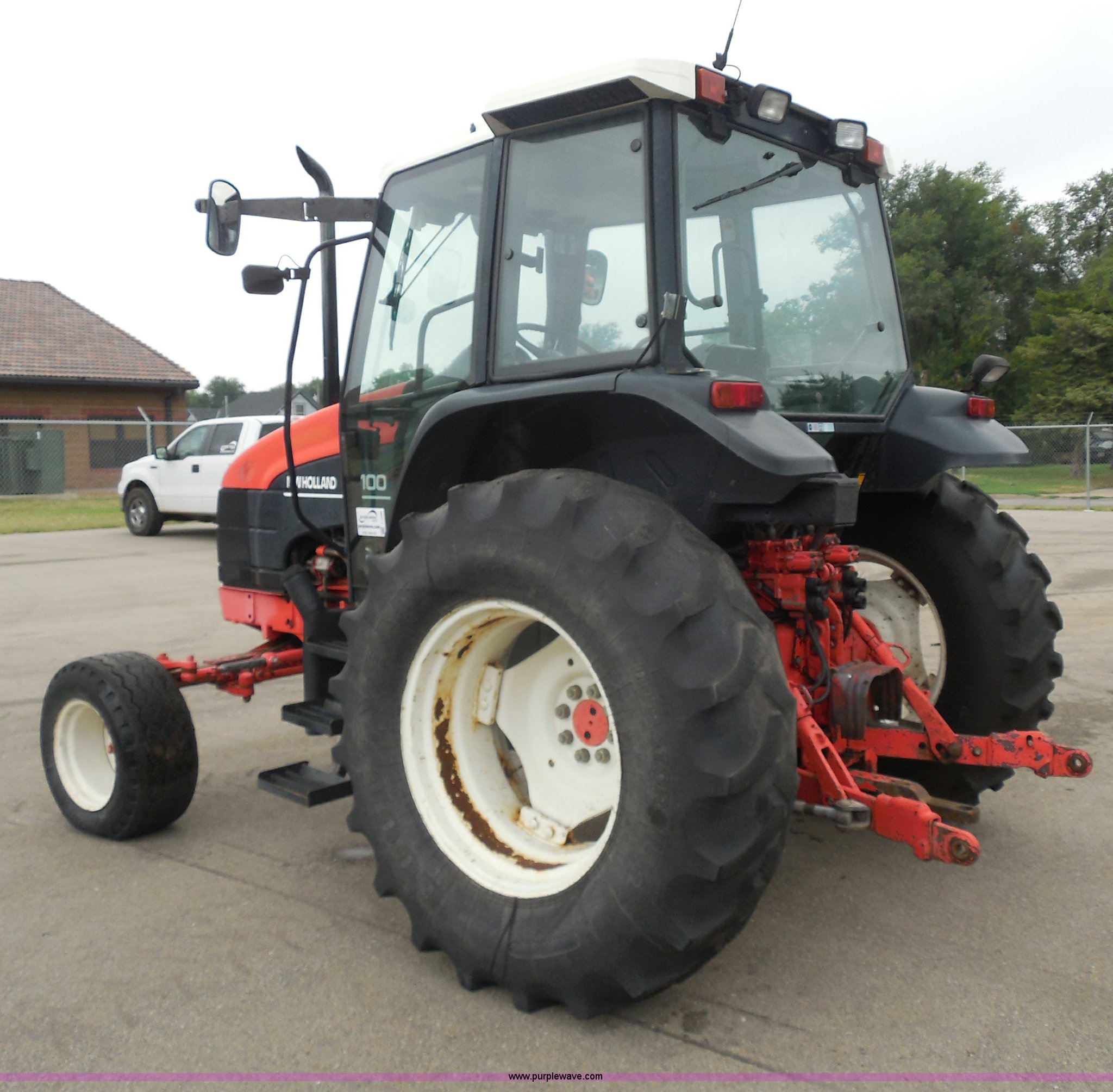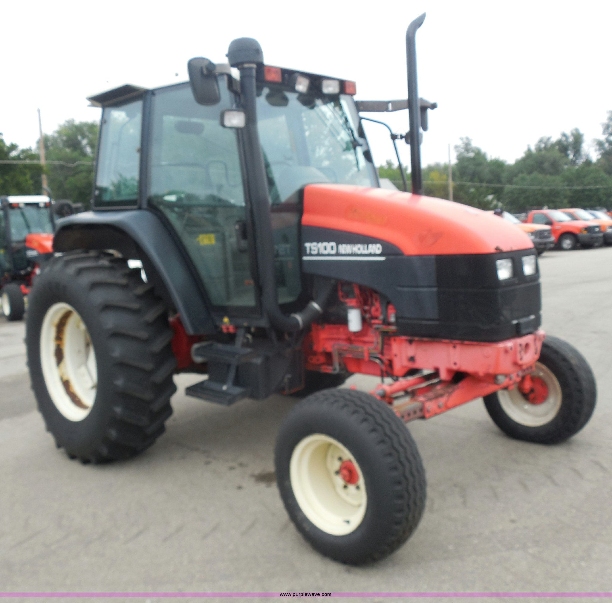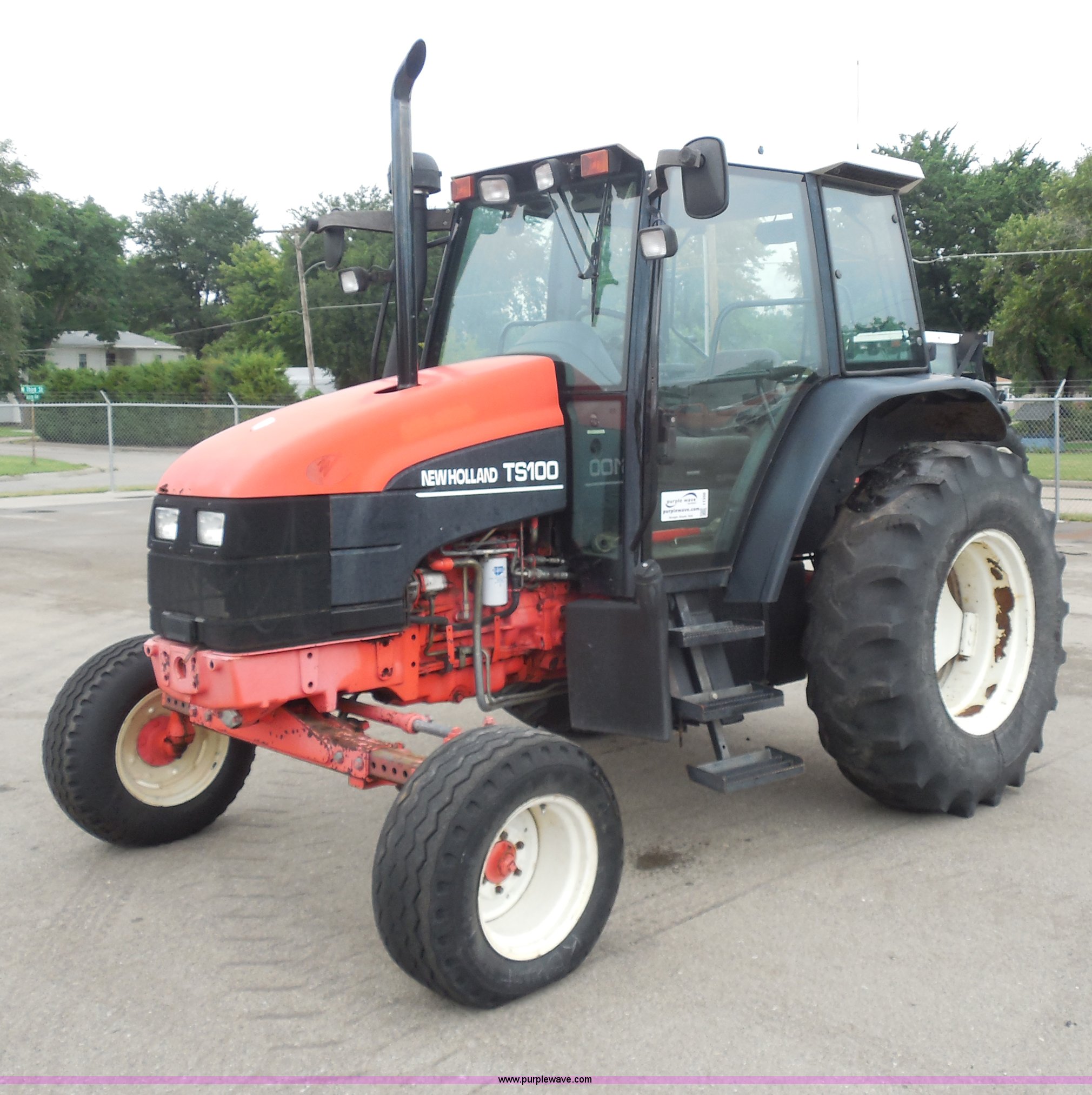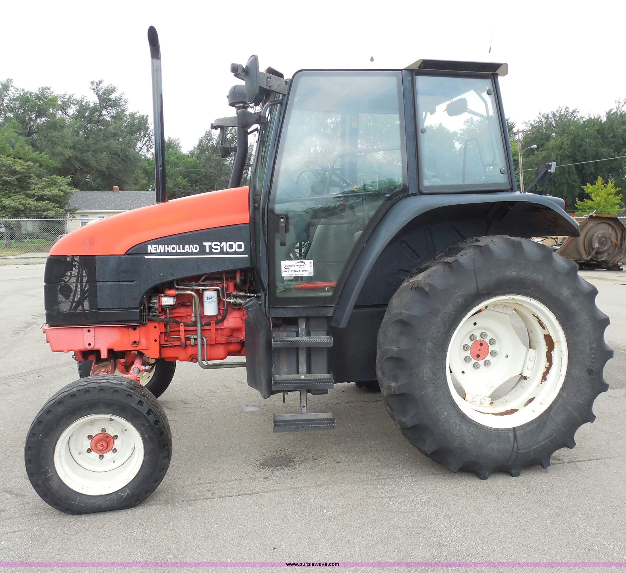 Purple Wave is selling a used Tractor in Kansas. This item is a 1999 Ford TS100 tractor with the following: 5,232 hours on meter, Genesis 5.0L four cylinder diesel engine, Turbocharger, 100 HP, Synchroshift transmission, 12F/12R, AC and heat, 540/1000 PTO, 80 PTO HP, Three point, Draw bar, (4) rear hydraulic remotes, Electrical plugs, Seven and four way, 16" front tires, 11L-16 front tires, 18.4-30 rear tires, Paint faded and scratched, Broken mirror, Three point arms missing, Worn left rear tire, Low hydraulic pressure, Clutch slips, Serial 138724B, KDOT ID 352-2080