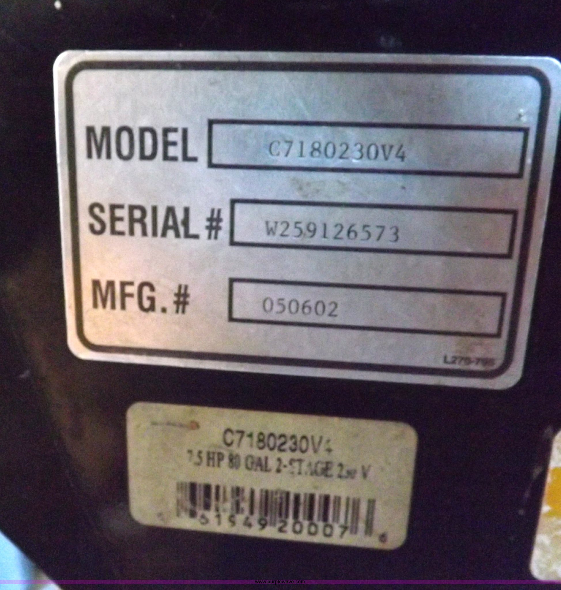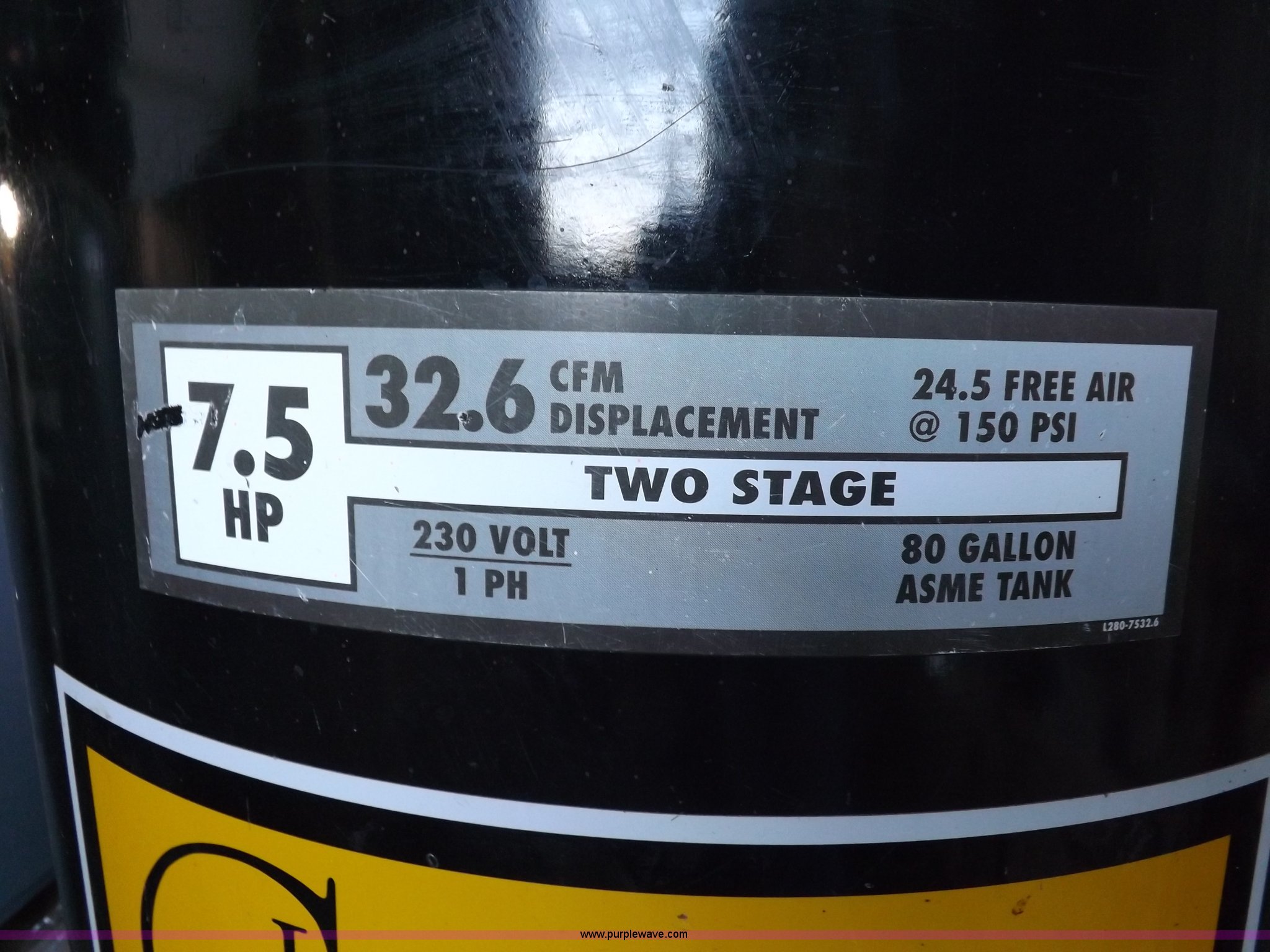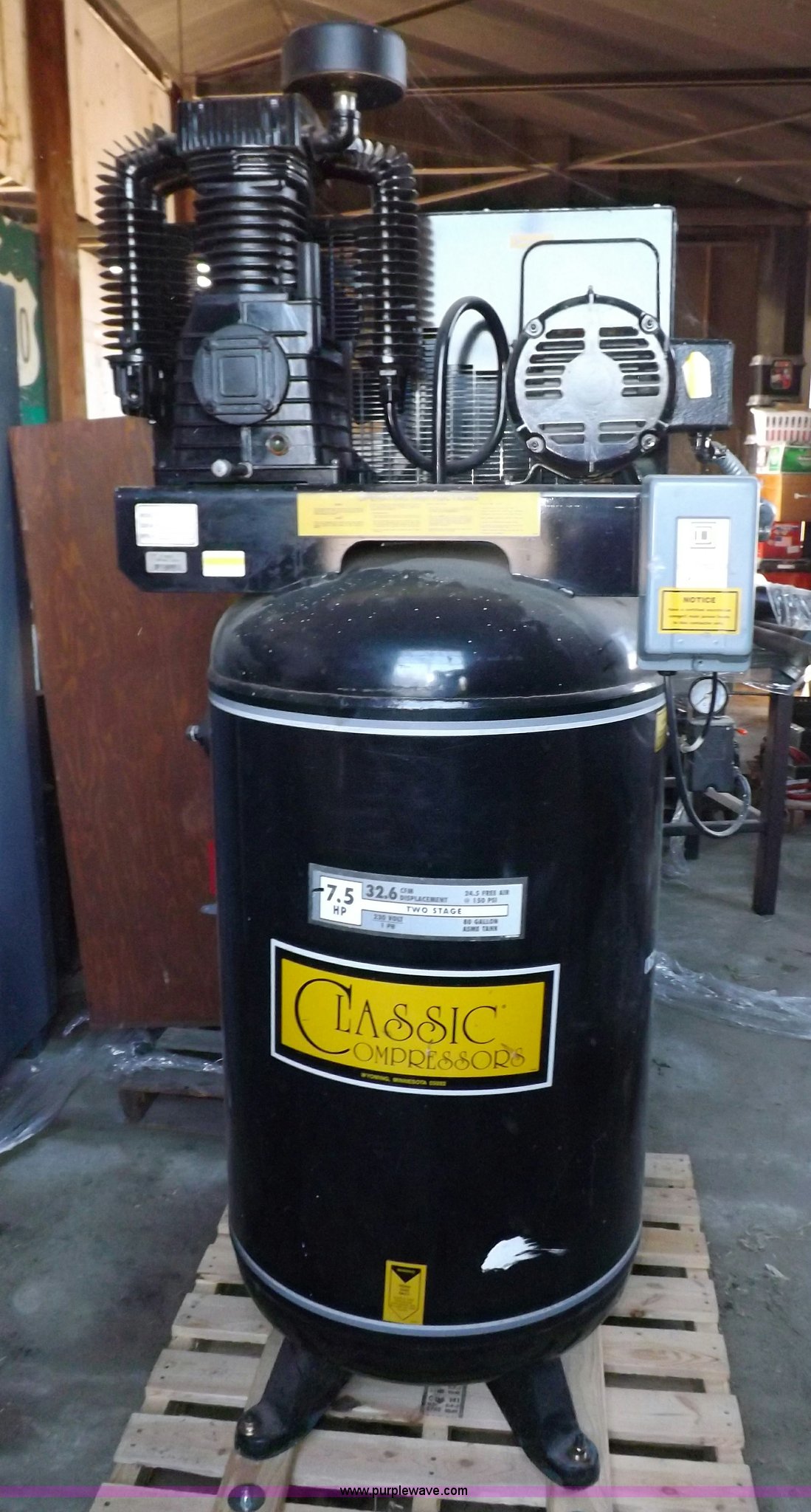 Classic C7180230 vertical air compressor. 80 gallon tank capacity, 208/230V , Single phase, Two stage, 7.5 HP, Trips breakers when used, Issue with motor or compressor, Serial W259126573, KDOT ID 060-1002. KDOT - Garden City. 121 N Campus Dr. Garden City, KS 67846