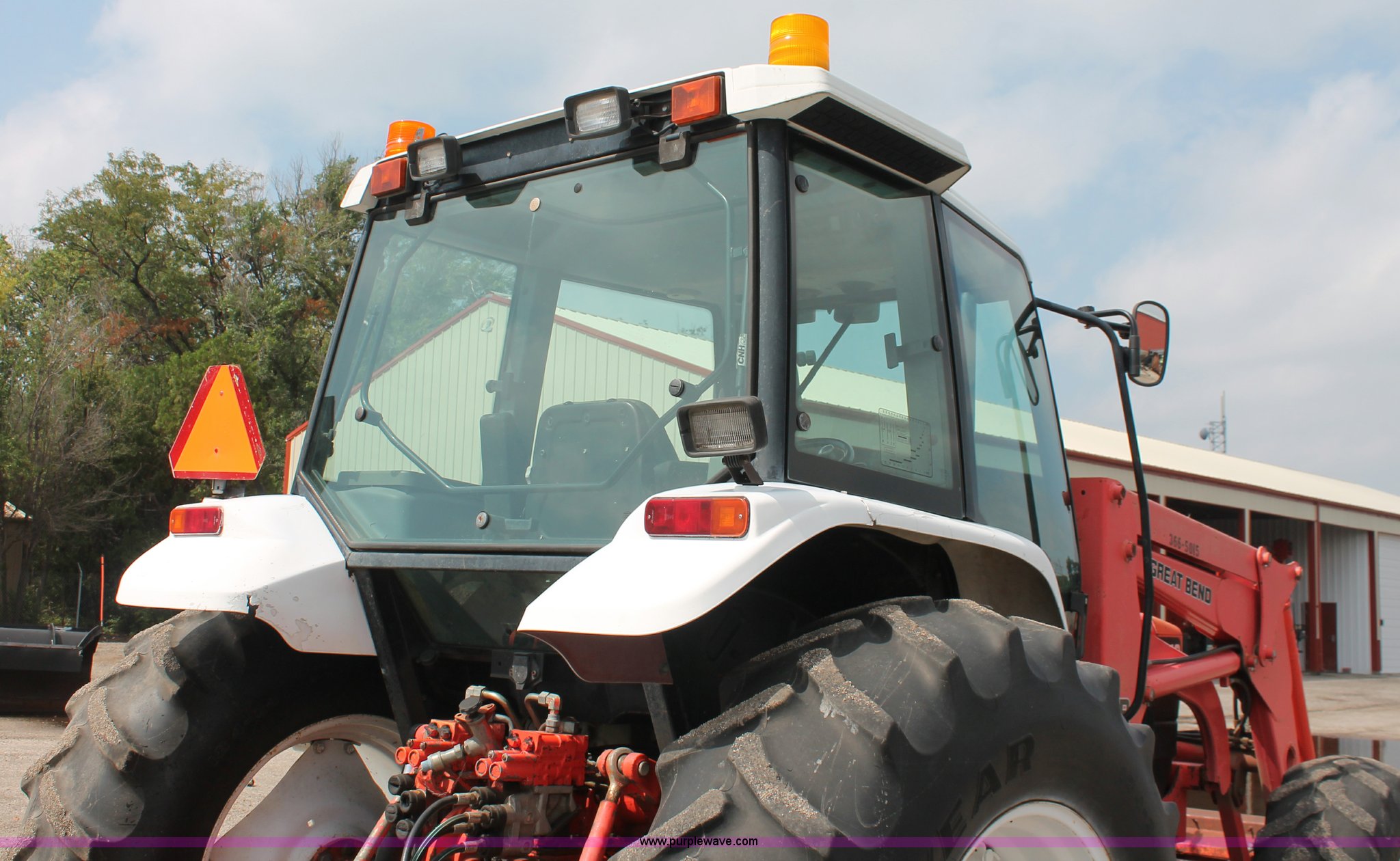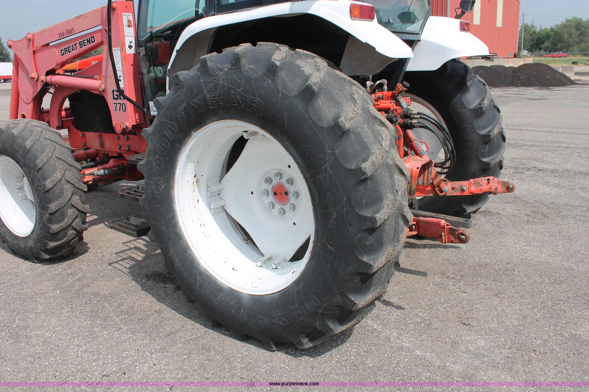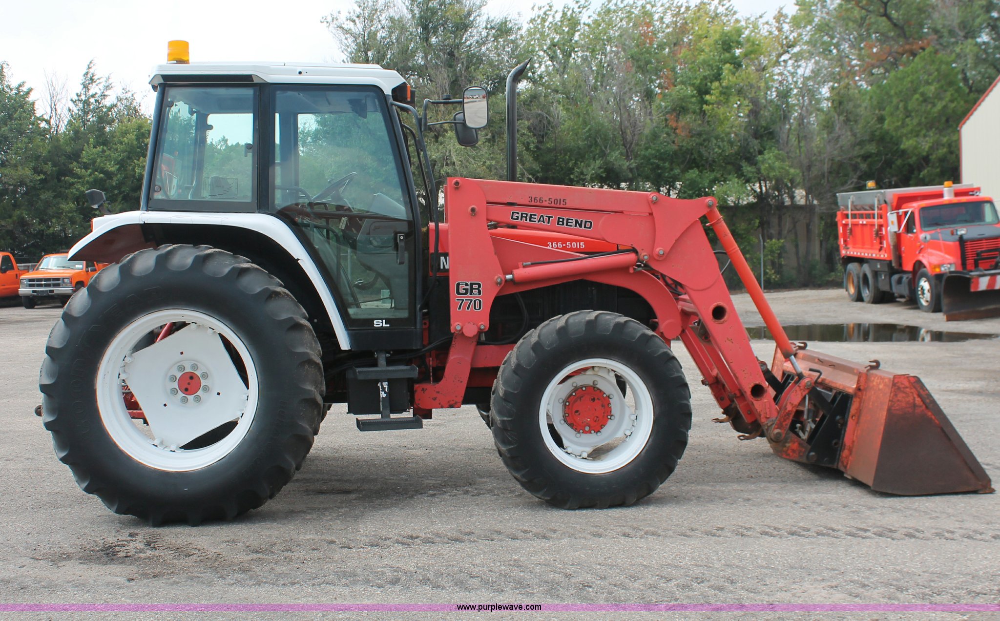 Purple Wave is selling a used Tractor in Kansas. This item is a 1995 Ford New Holland 7740 MFWD tractor with the following: 5,261 hours on meter, New Holland four cylinder diesel engine, 72 HP, Serial PA592273-5M07, Powershift three range transmission, 12F-12R gears, Serial 5M08B, AC and heat, AM/FM, Air suspension seat, Tilt steering wheel, Shades and visors, Tip out side and rear windows, Great Bend 770 loader, 8' bucket, Bolt-on edge, Quick attach, Three point, Draw bar, Auxiliary outlet, 540 PTO, (6) rear hydraulic remotes, (2) capped, 14.9-24 front tires, 18.4-34 rear tires, Paint faded and scratched, Battery dead, Serial 021186B, KDOT ID 366-5015