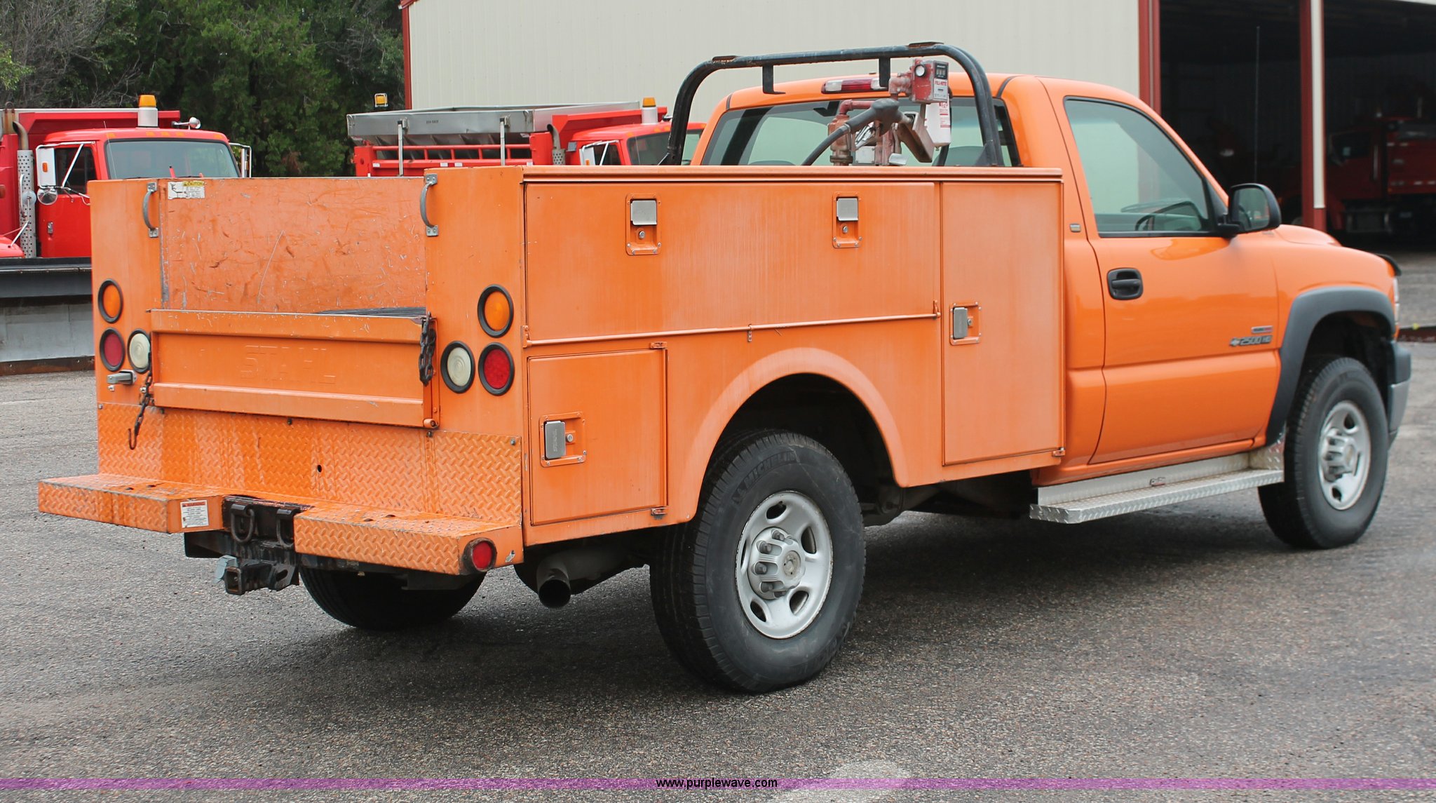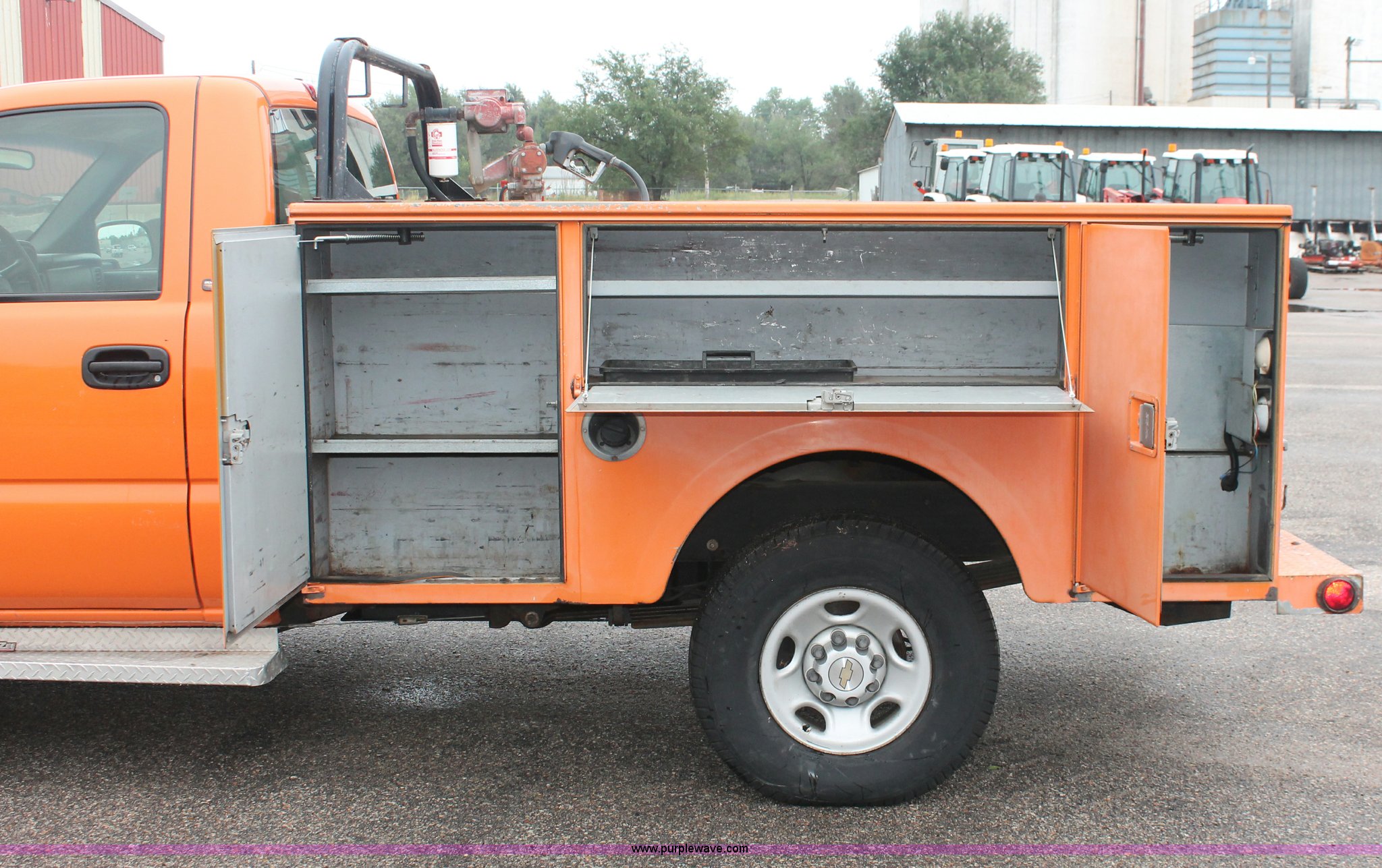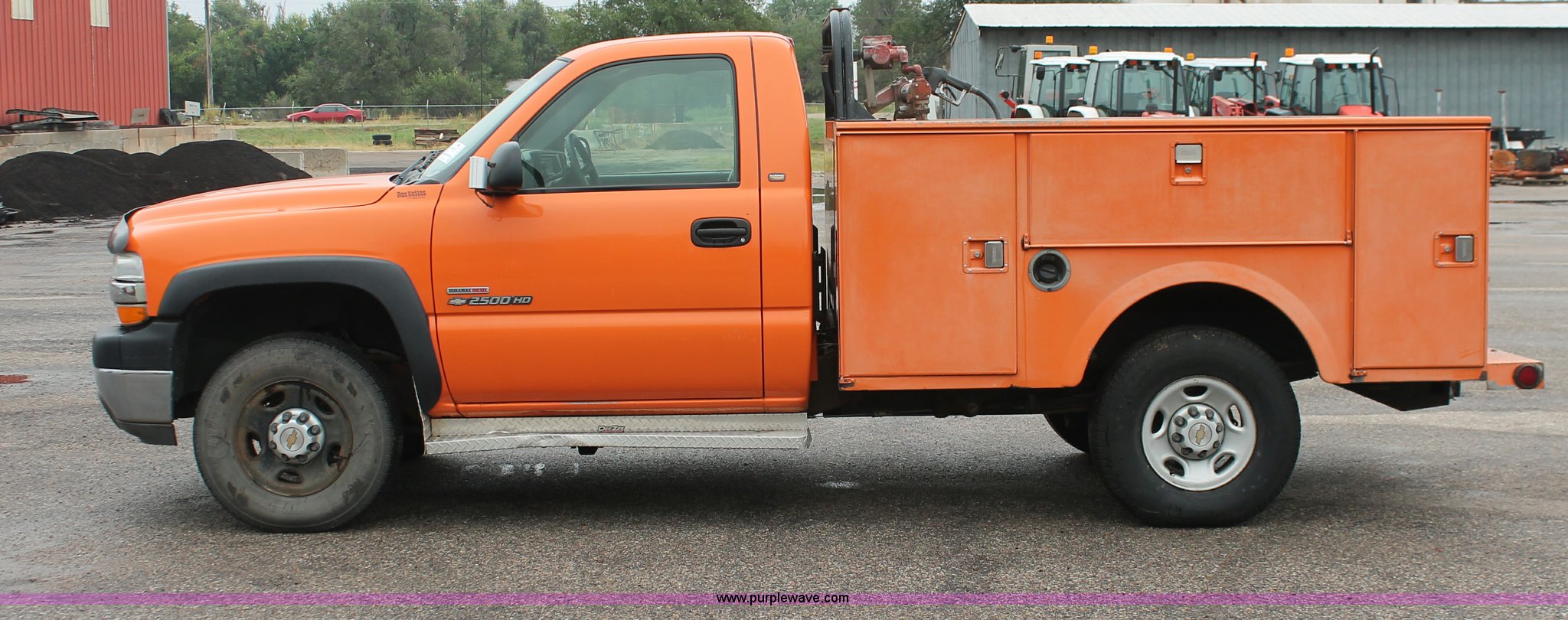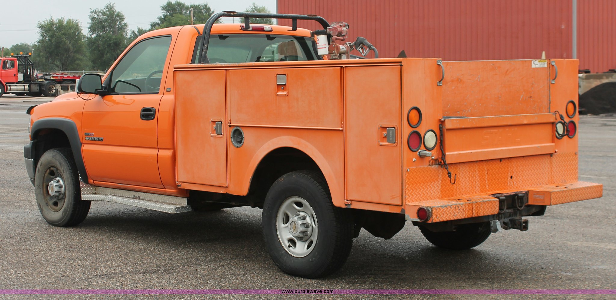 Purple Wave is selling a used Service Truck in Kansas. This item is a 2002 Chevrolet 2500 utility truck with the following: 220,620 miles on odometer, 6.6L V8 OHV 32V turbo diesel engine, Automatic transmission, AC and heat, Tilt, Cruise, AM/FM, Manual windows and locks, Vinyl interior, Stahl utility bed, (6) compartments, Auxiliary fule tank, Fill-Rite pump and meter,, DeeZee running boards, Front tow hooks, Receiver hitch, Trailer wiring, 255/85R16 tires, Paint faded and scratched, KDOT ID 112-5182