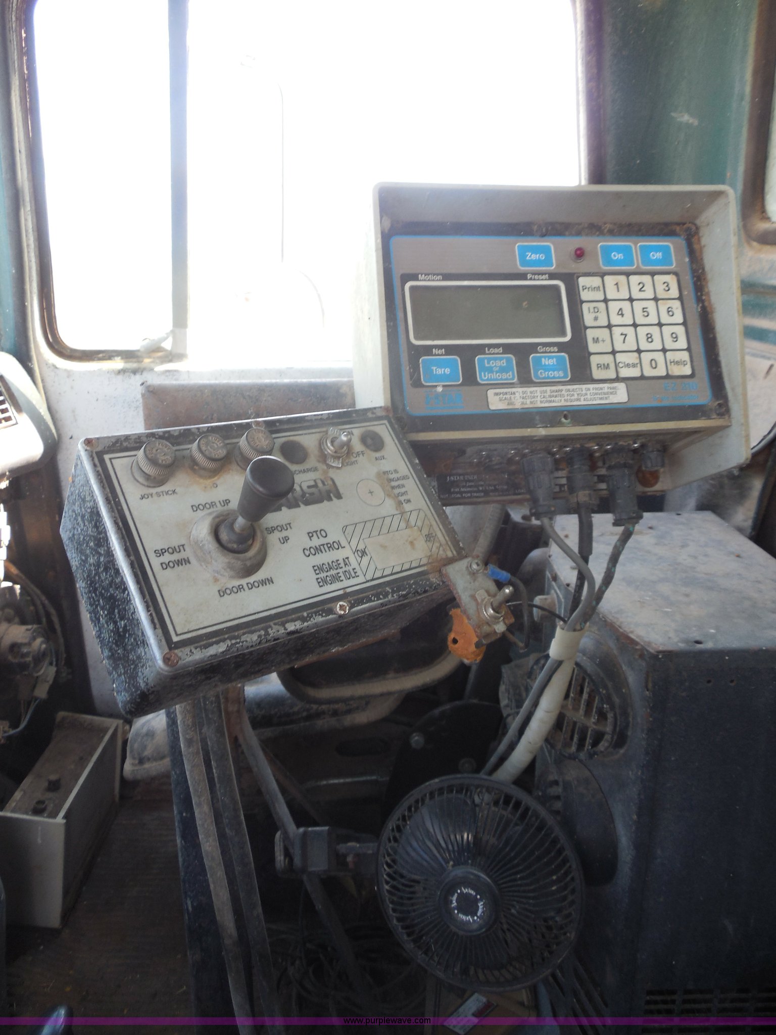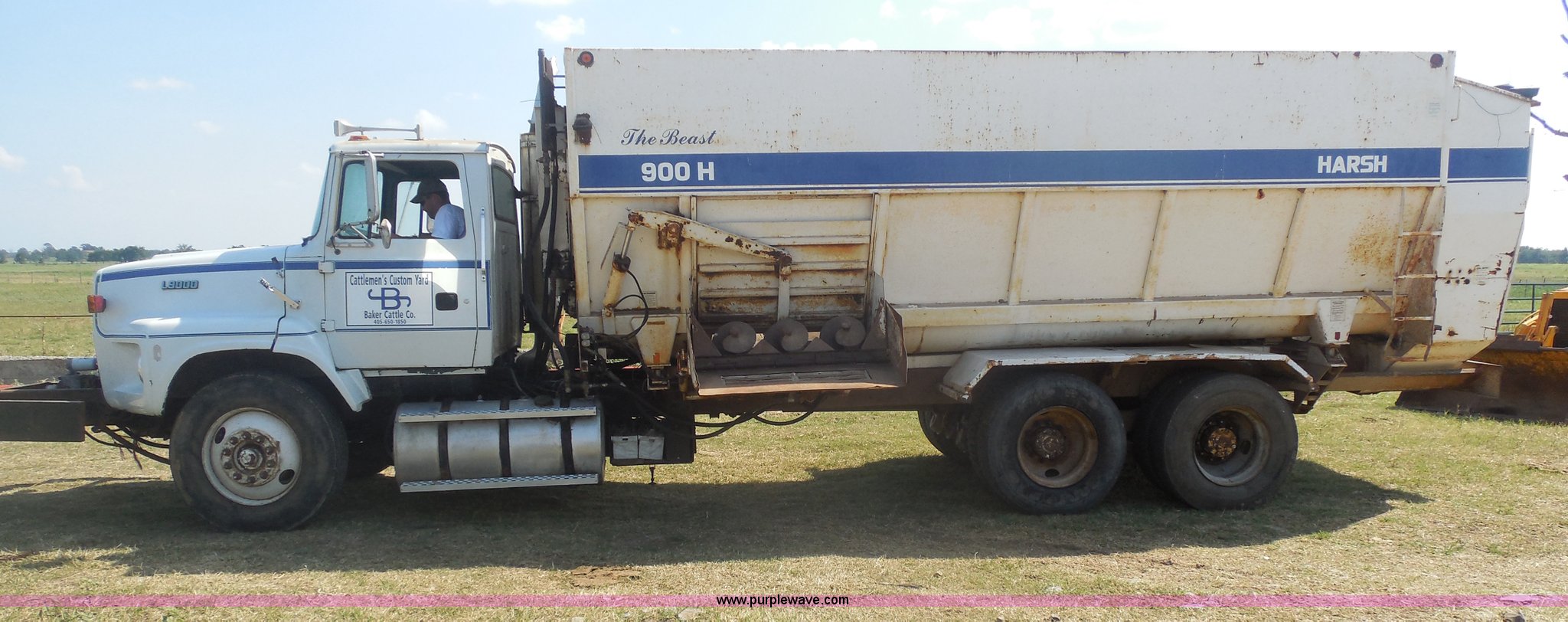 Purple Wave is selling a used Fertilizer or Feed Delivery Truck in Oklahoma. This item is a 1991 Ford LS9000 feed truck with the following: 25,427 miles on odometer, Detroit Diesel Series 60 11.1L L6 diesel engine, Five speed automatic transmission, Heat, Tilt, Cruise, Air suspension seat, Harsh Feeder 900 mixer box, 276"L x 132"W mixer, 20'L inside, Loading scale, (4) horizontal mixing augers, Oil bath chain enclosures, 900 cu. ft. capacity, 21,450 mixer weight, Hydraulic driven system, Visor, Dual fuel tanks, Single exhaust stack, PTO, Air brakes, 11R22.5 tires, GVWR 34,700 lbs, Right front fender damage
