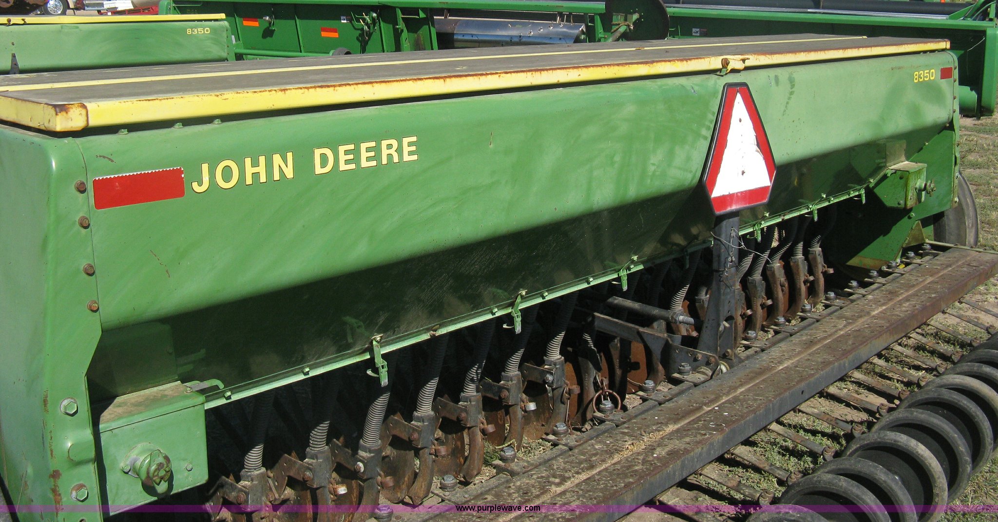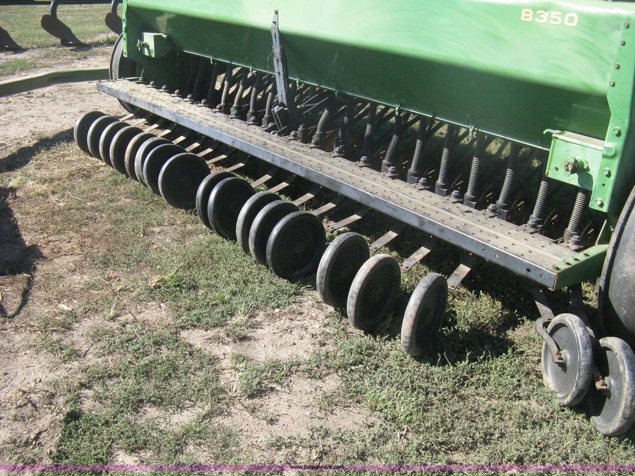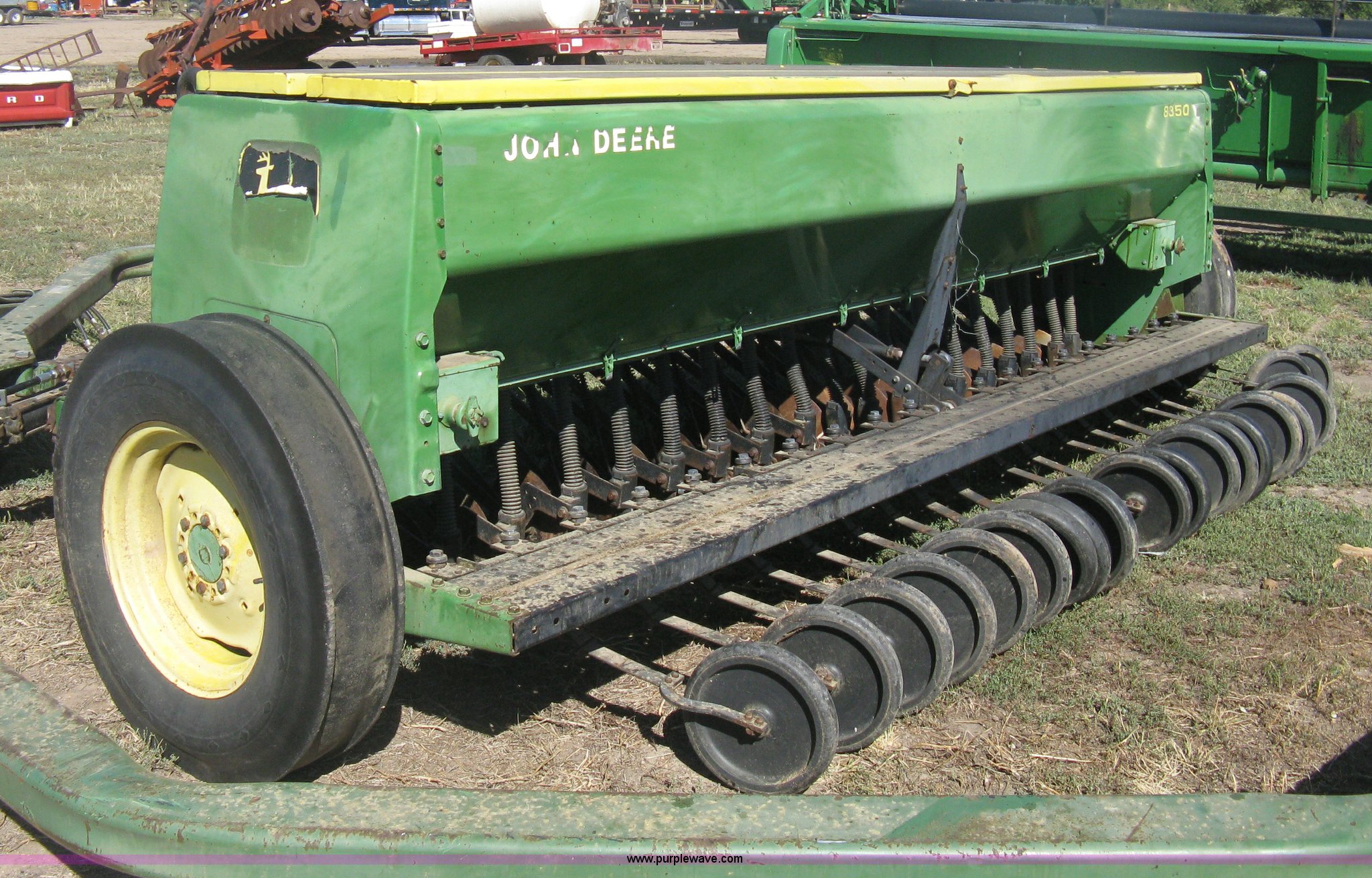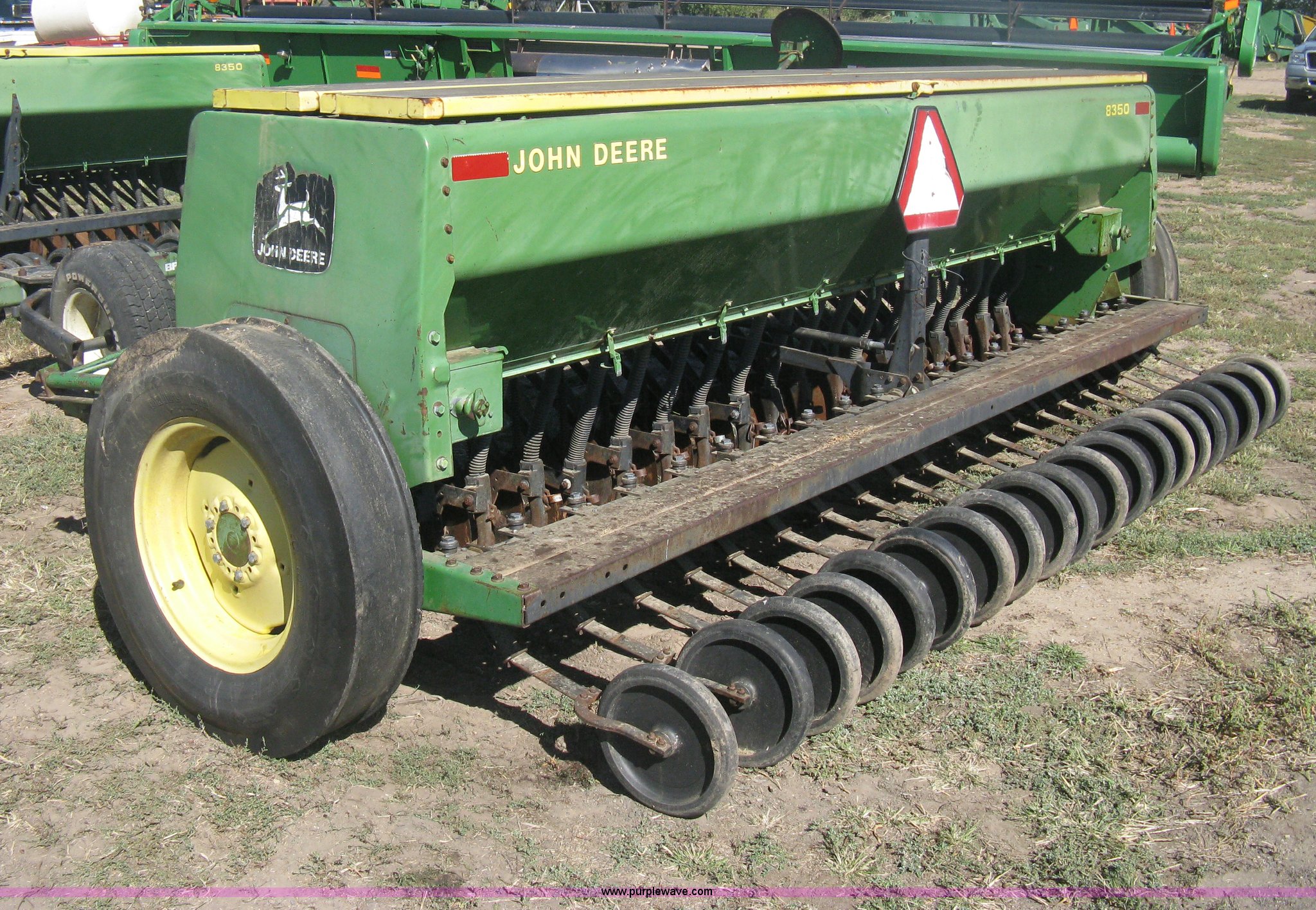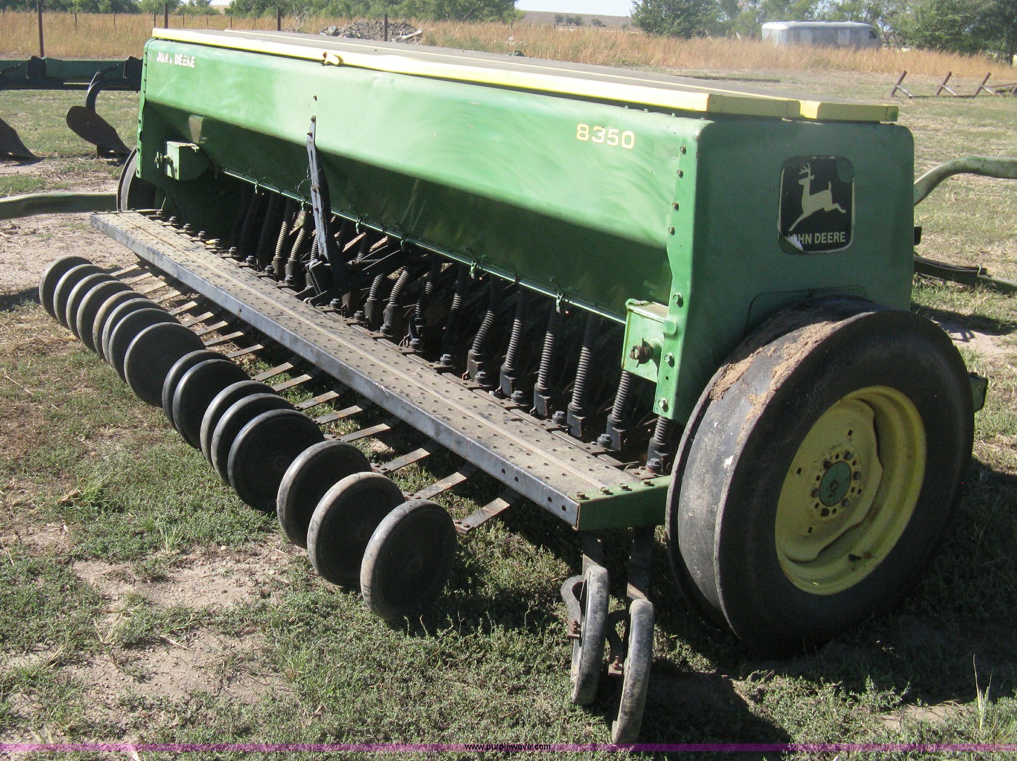 Purple Wave is selling a used Grain Drill or Seeder in Kansas. This item is a (2) John Deere 8350 grain drills with the following: 13' work width, 20 drops, 8" spacing, Seed and fertilizer boxes, Hydraulic lift, Single disk coulters, Six lug wheels, 7.50-20 tires, Baker 2200 tandem drill hitch, Hydraulic fold out, Serial 28849, Serial N08000X058943,
