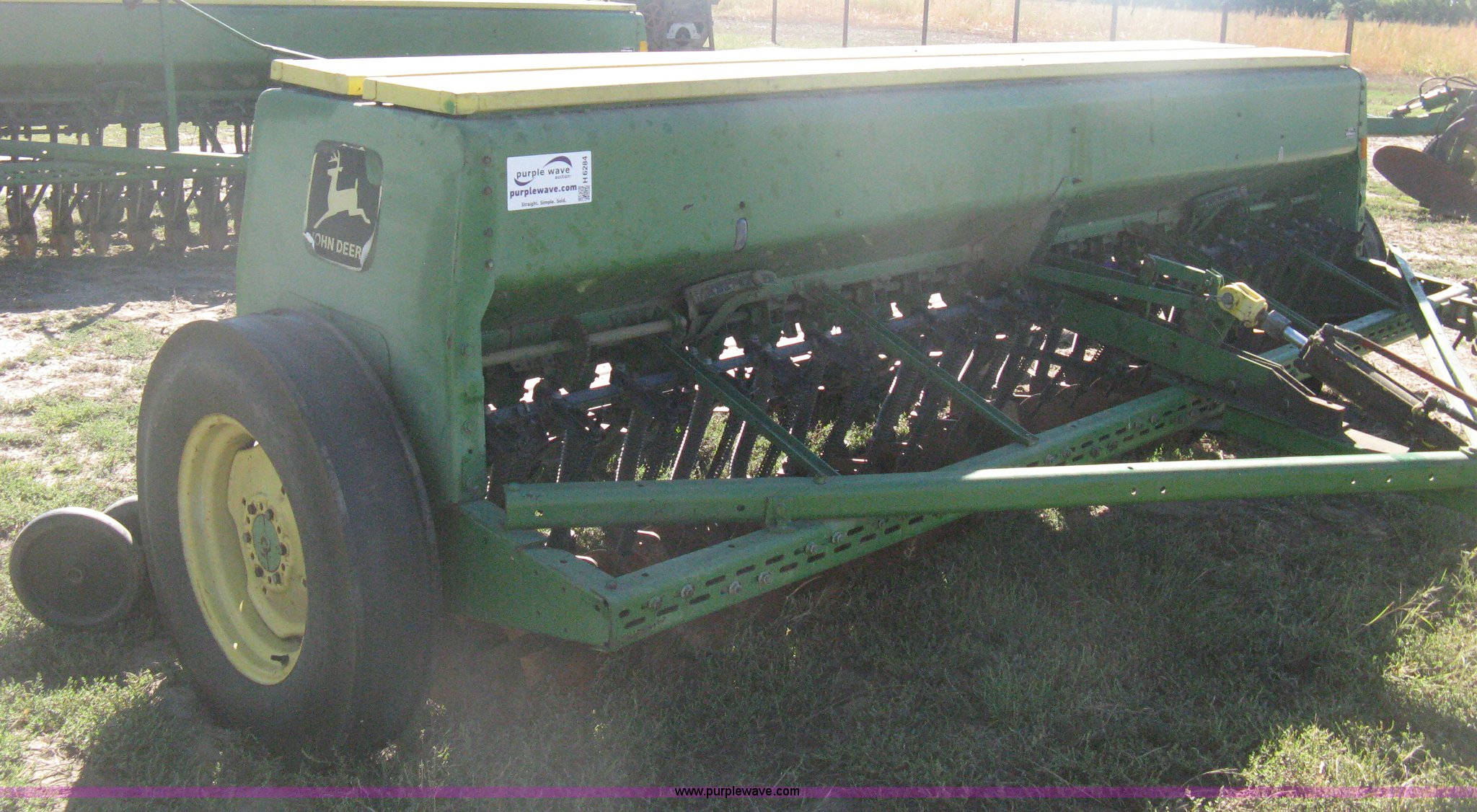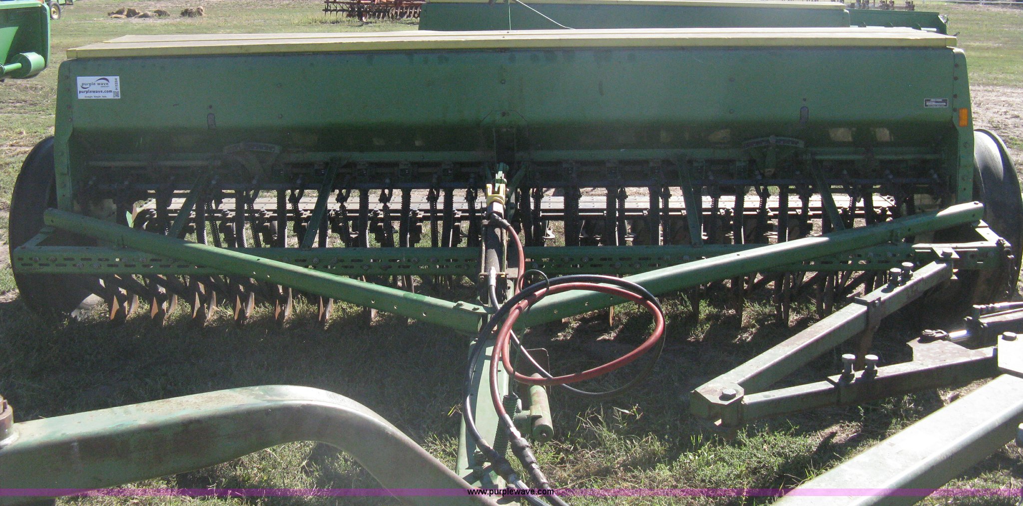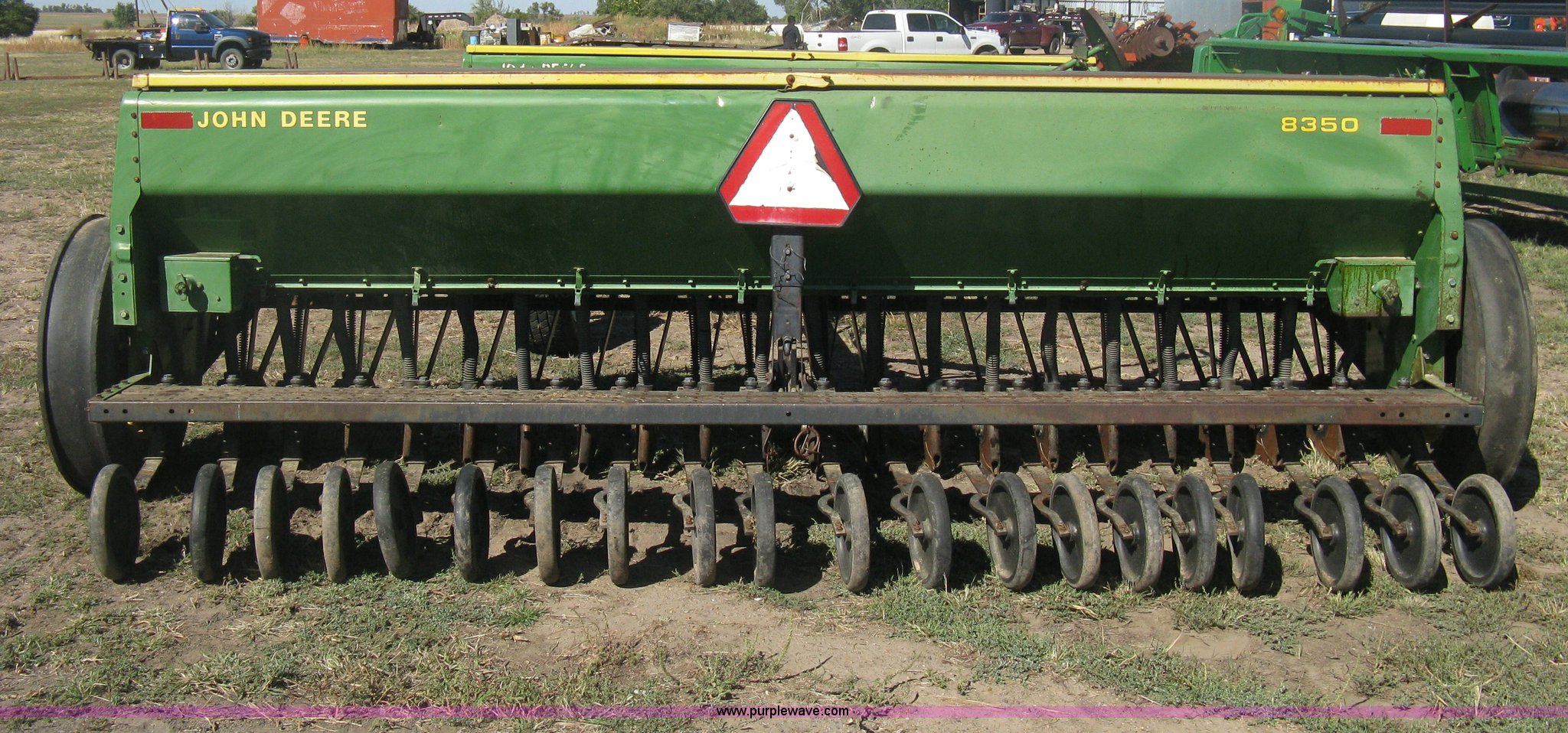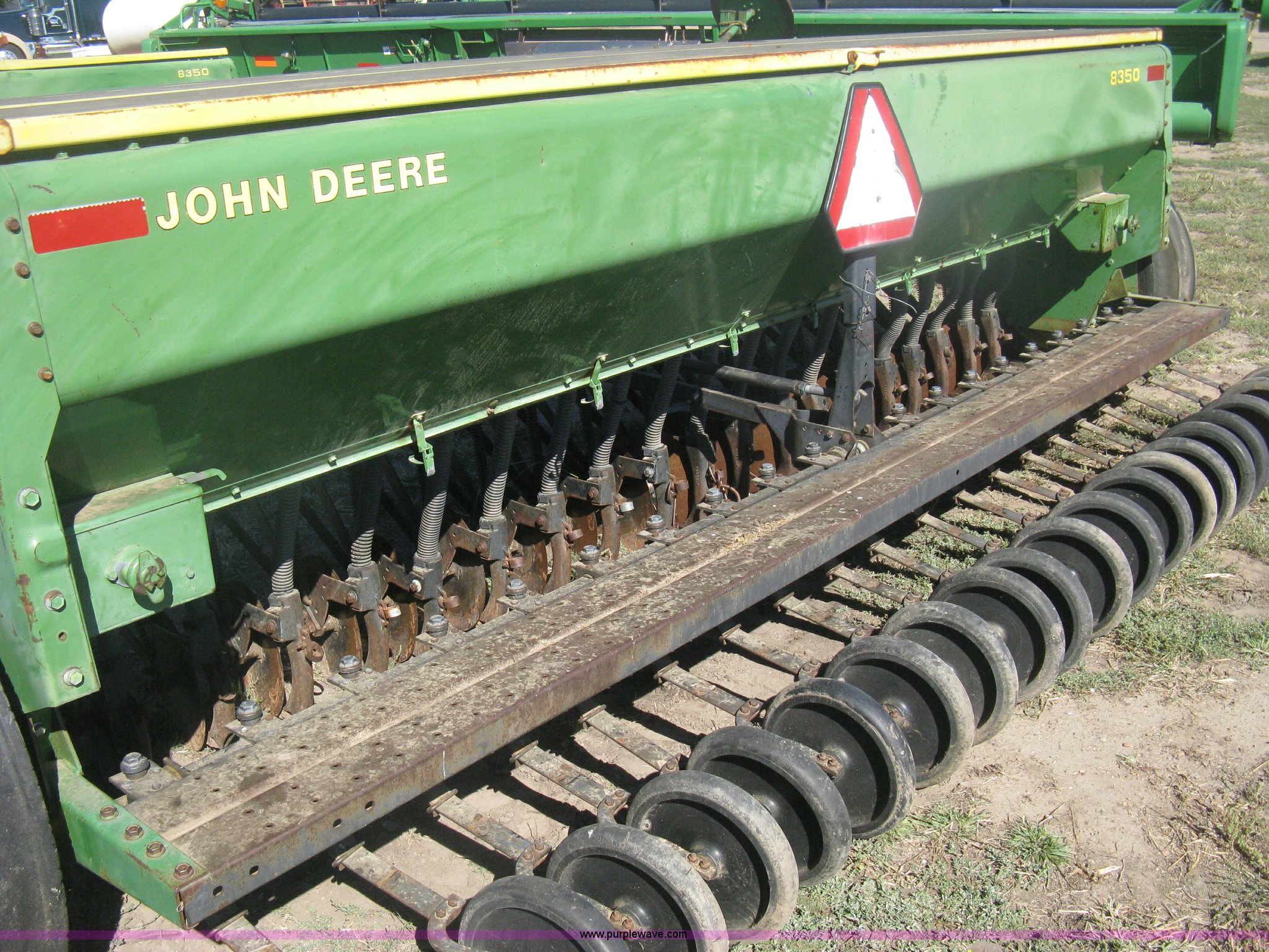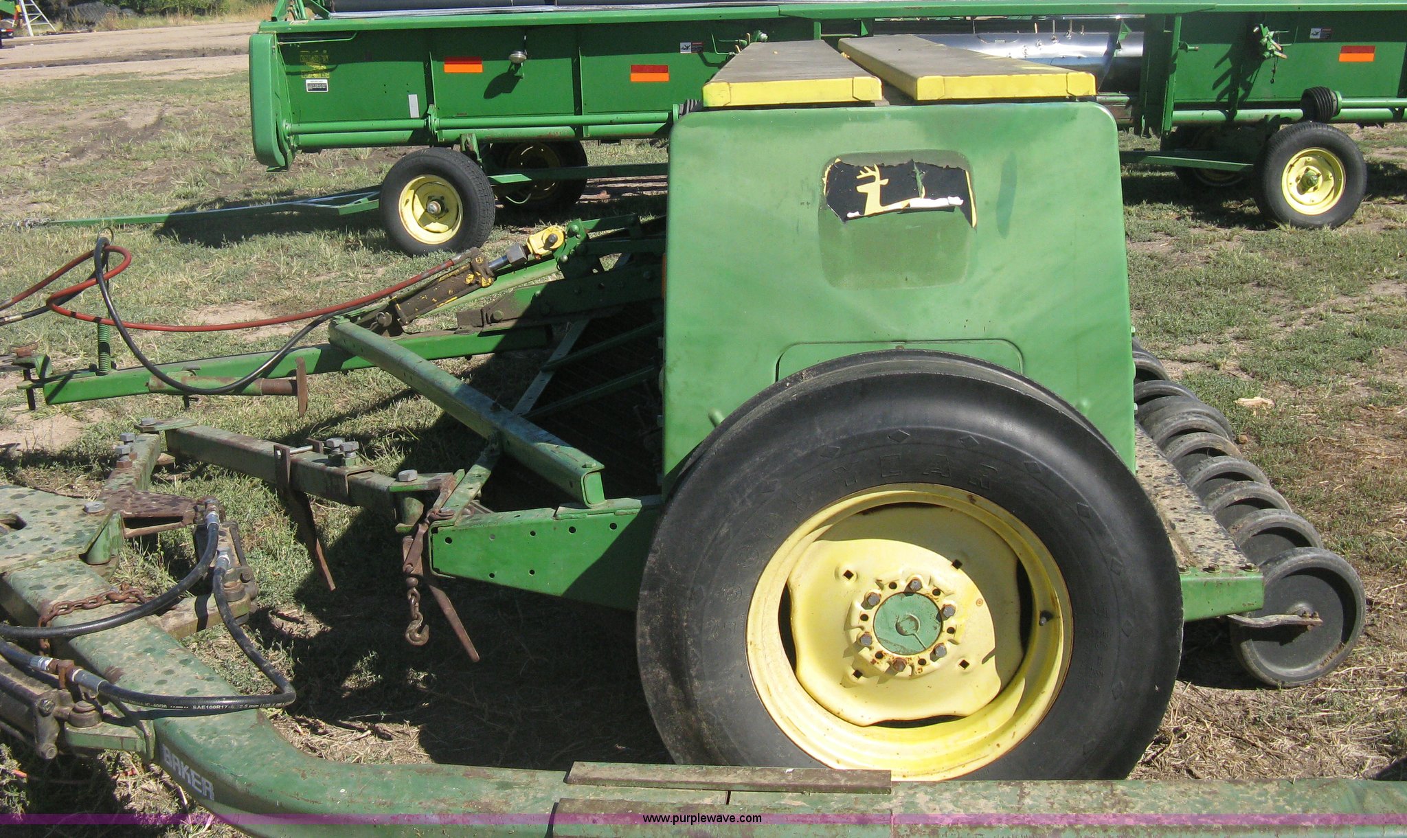 Purple Wave is selling a used Grain Drill or Seeder in Kansas. This item is a (2) John Deere 8350 grain drills with the following: 13' work width, 20 drops, 8" spacing, Seed and fertilizer boxes, Hydraulic lift, Single disk coulters, Six lug wheels, 7.50-20 tires, Baker 2200 tandem drill hitch, Hydraulic fold out, Serial 28849, Serial N08000X058943,