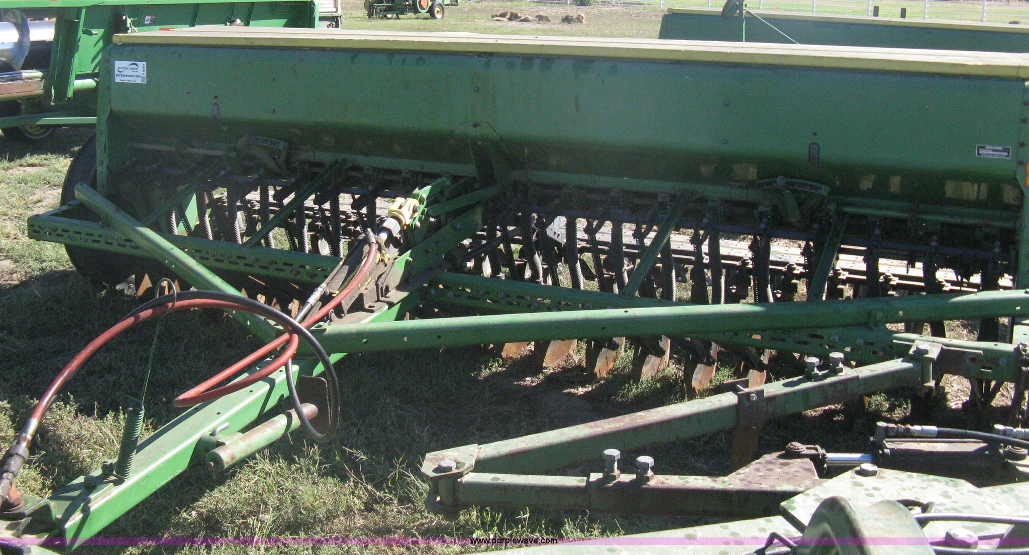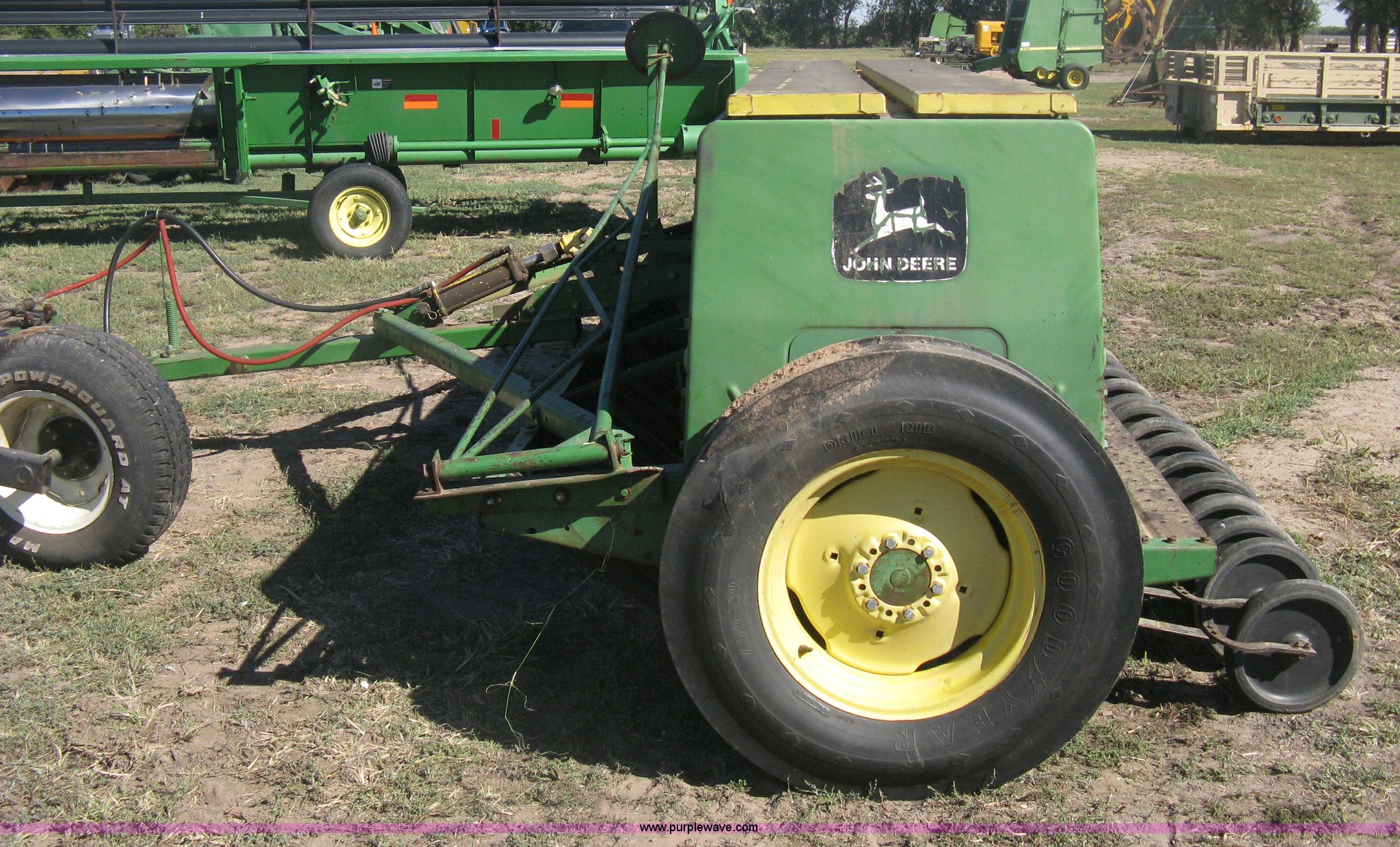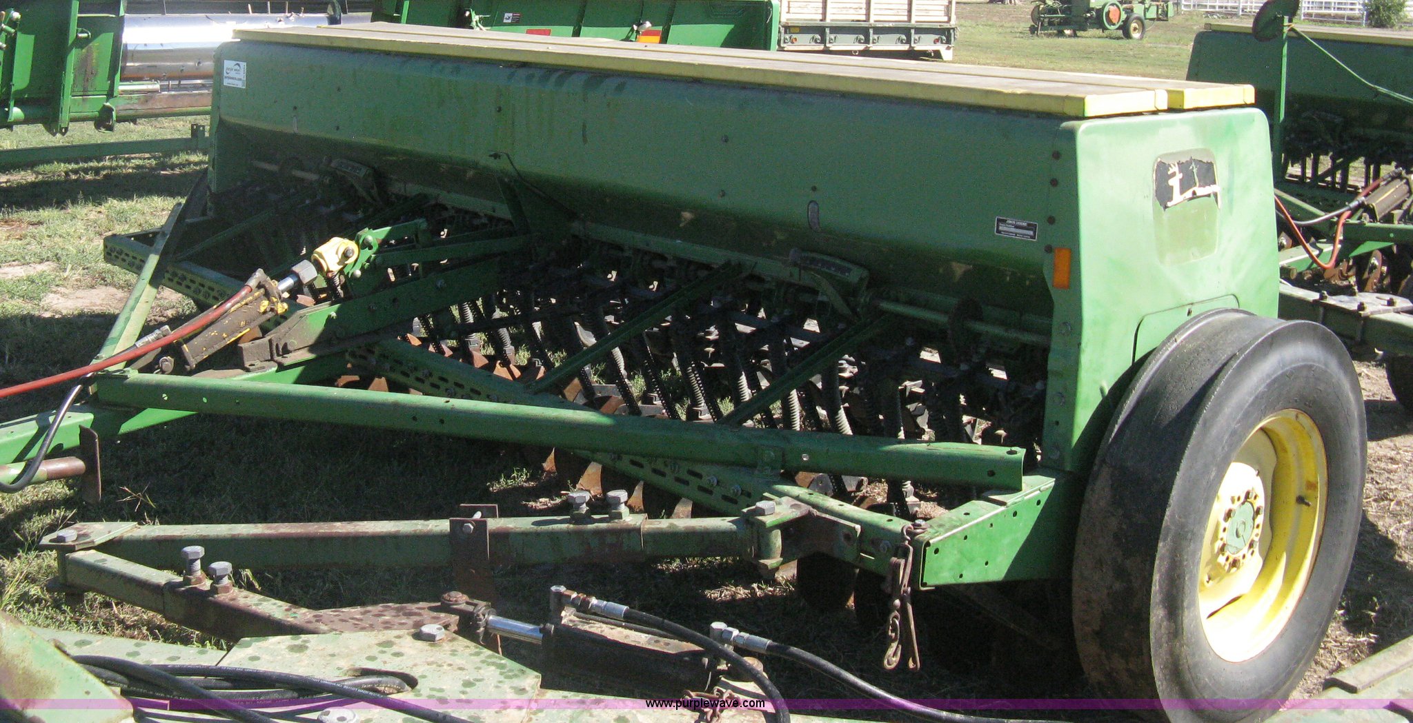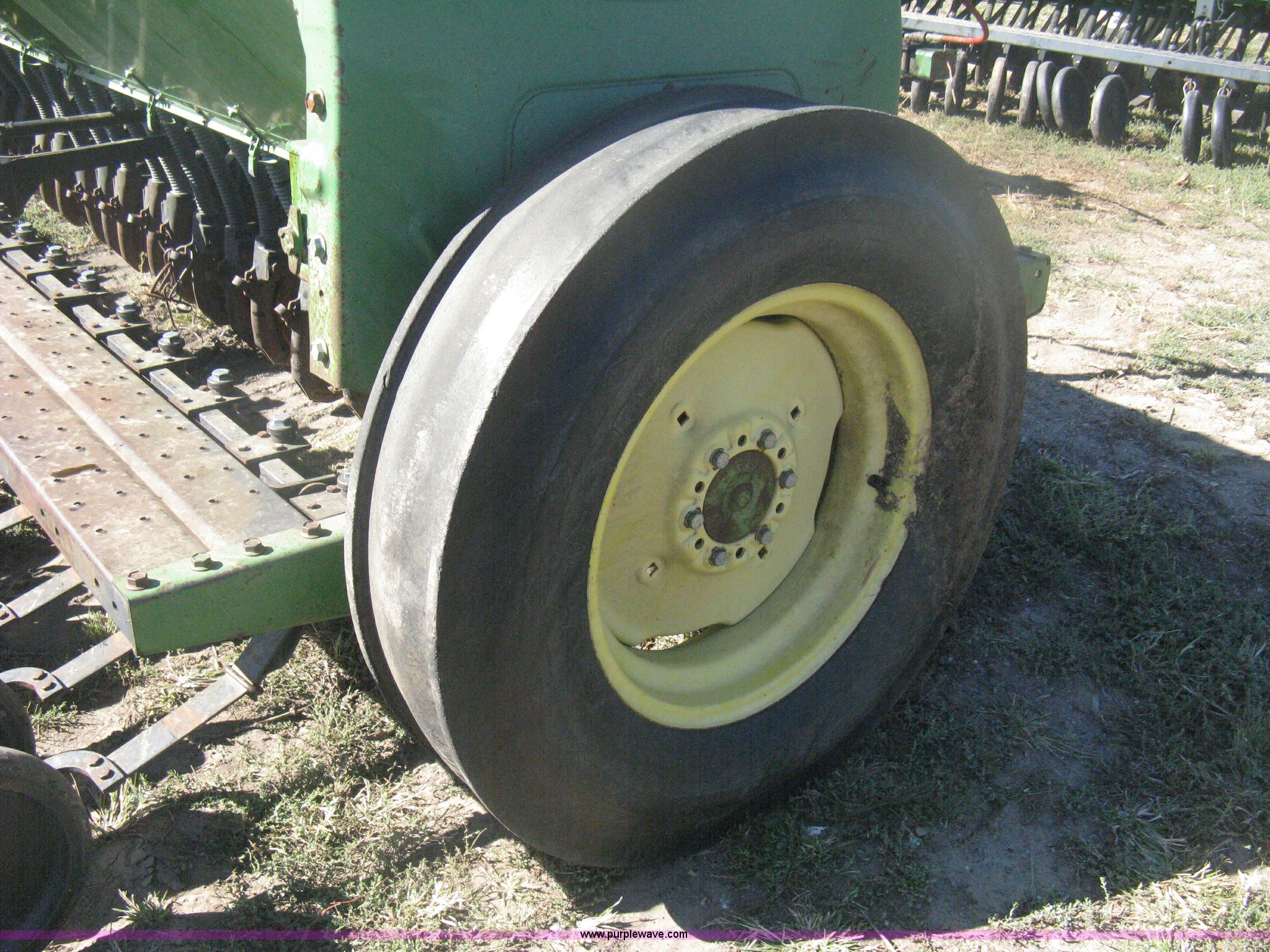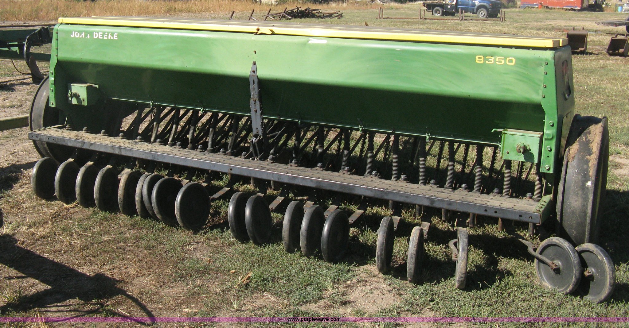 Purple Wave is selling a used Grain Drill or Seeder in Kansas. This item is a (2) John Deere 8350 grain drills with the following: 13' work width, 20 drops, 8" spacing, Seed and fertilizer boxes, Hydraulic lift, Single disk coulters, Six lug wheels, 7.50-20 tires, Baker 2200 tandem drill hitch, Hydraulic fold out, Serial 28849, Serial N08000X058943,