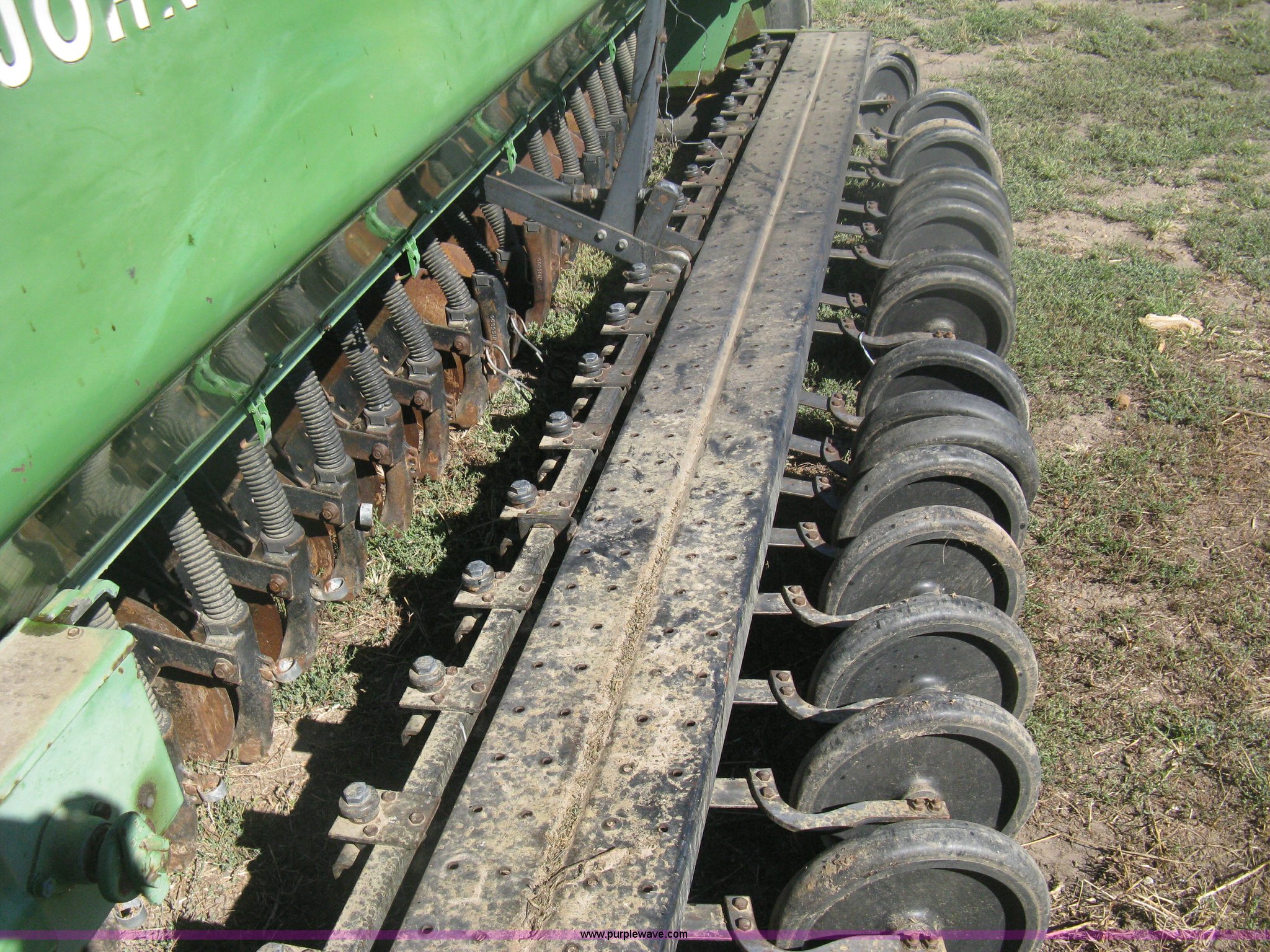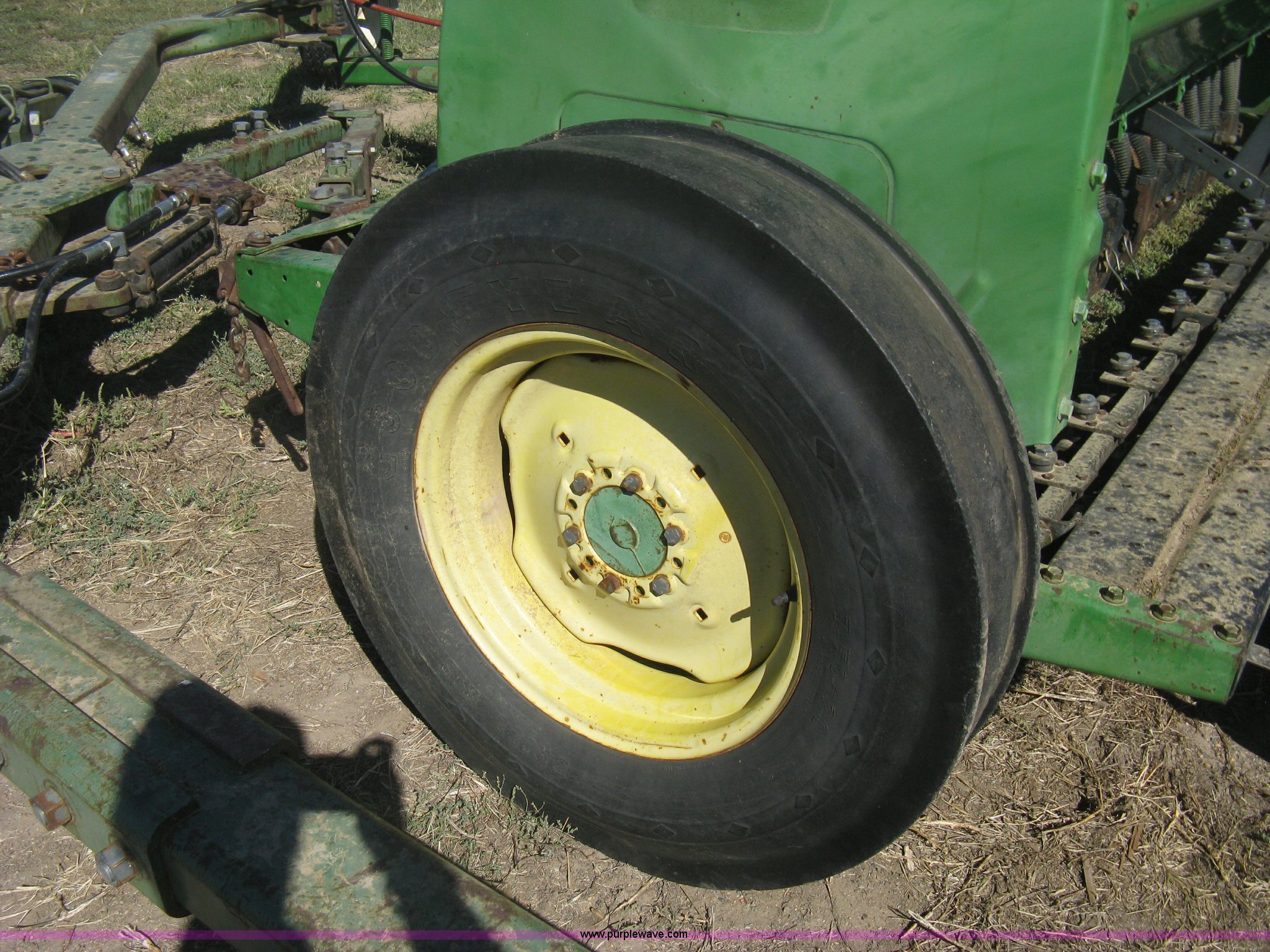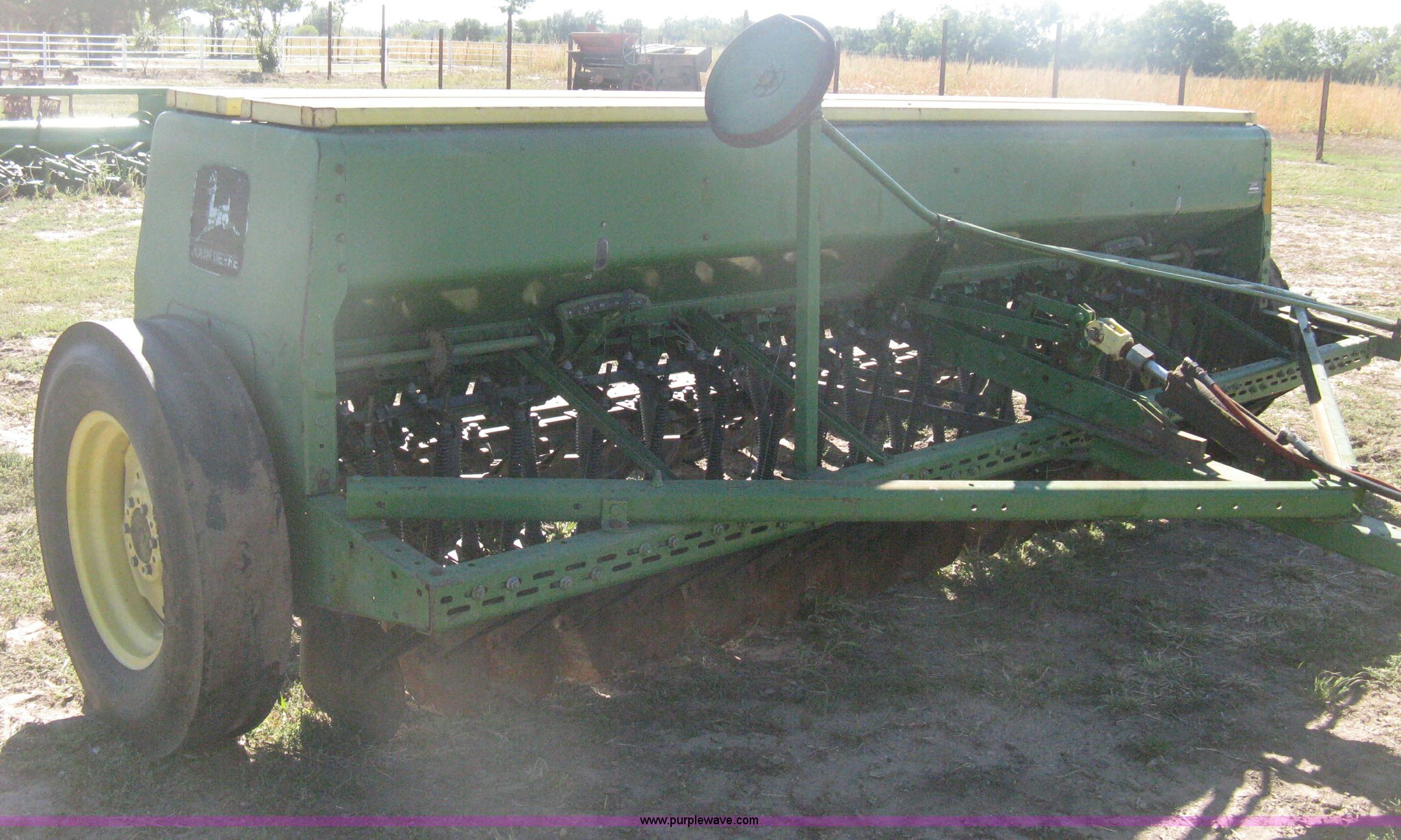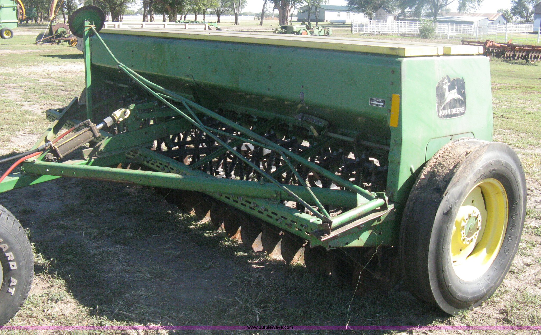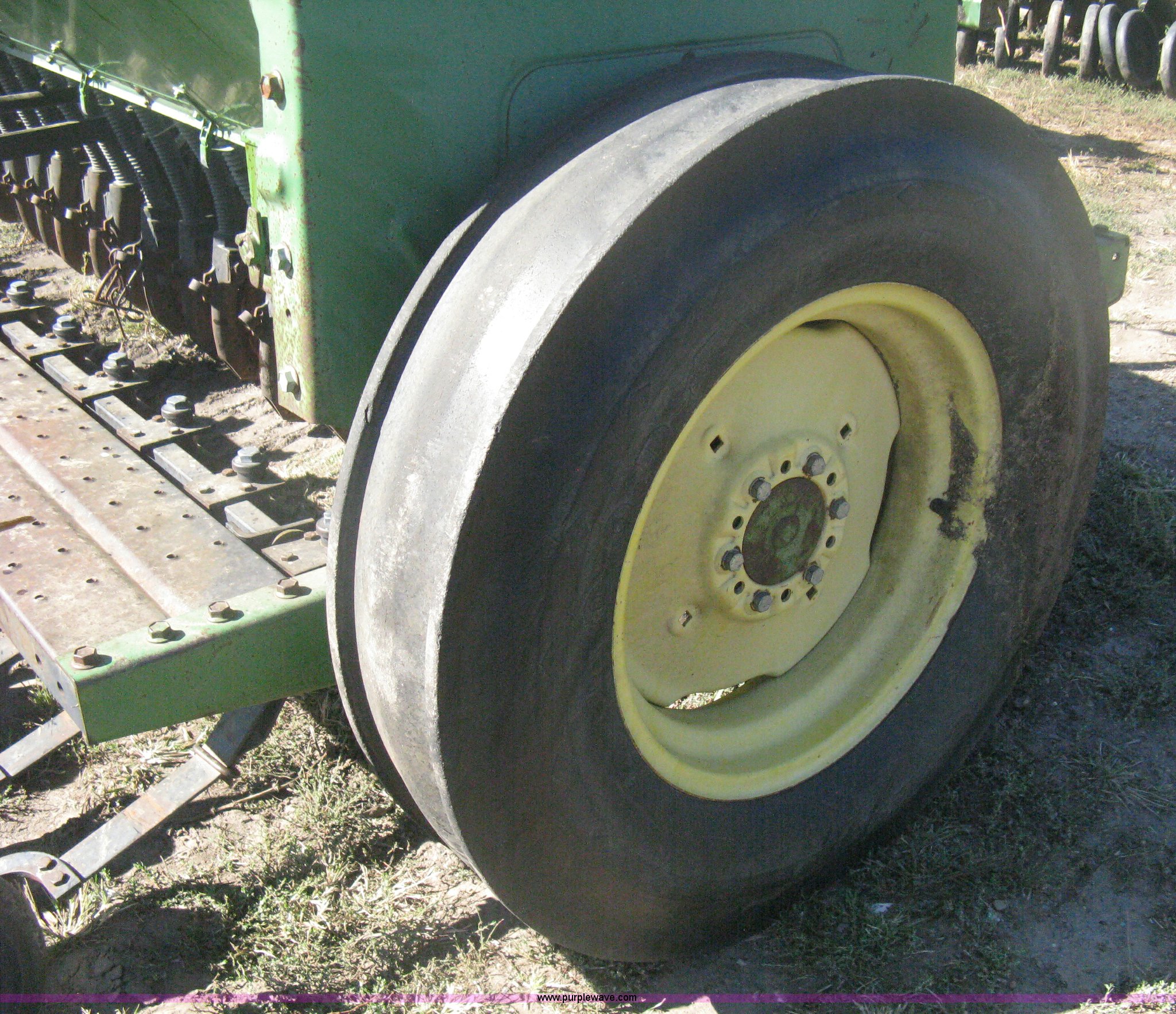 Purple Wave is selling a used Grain Drill or Seeder in Kansas. This item is a (2) John Deere 8350 grain drills with the following: 13' work width, 20 drops, 8" spacing, Seed and fertilizer boxes, Hydraulic lift, Single disk coulters, Six lug wheels, 7.50-20 tires, Baker 2200 tandem drill hitch, Hydraulic fold out, Serial 28849, Serial N08000X058943,