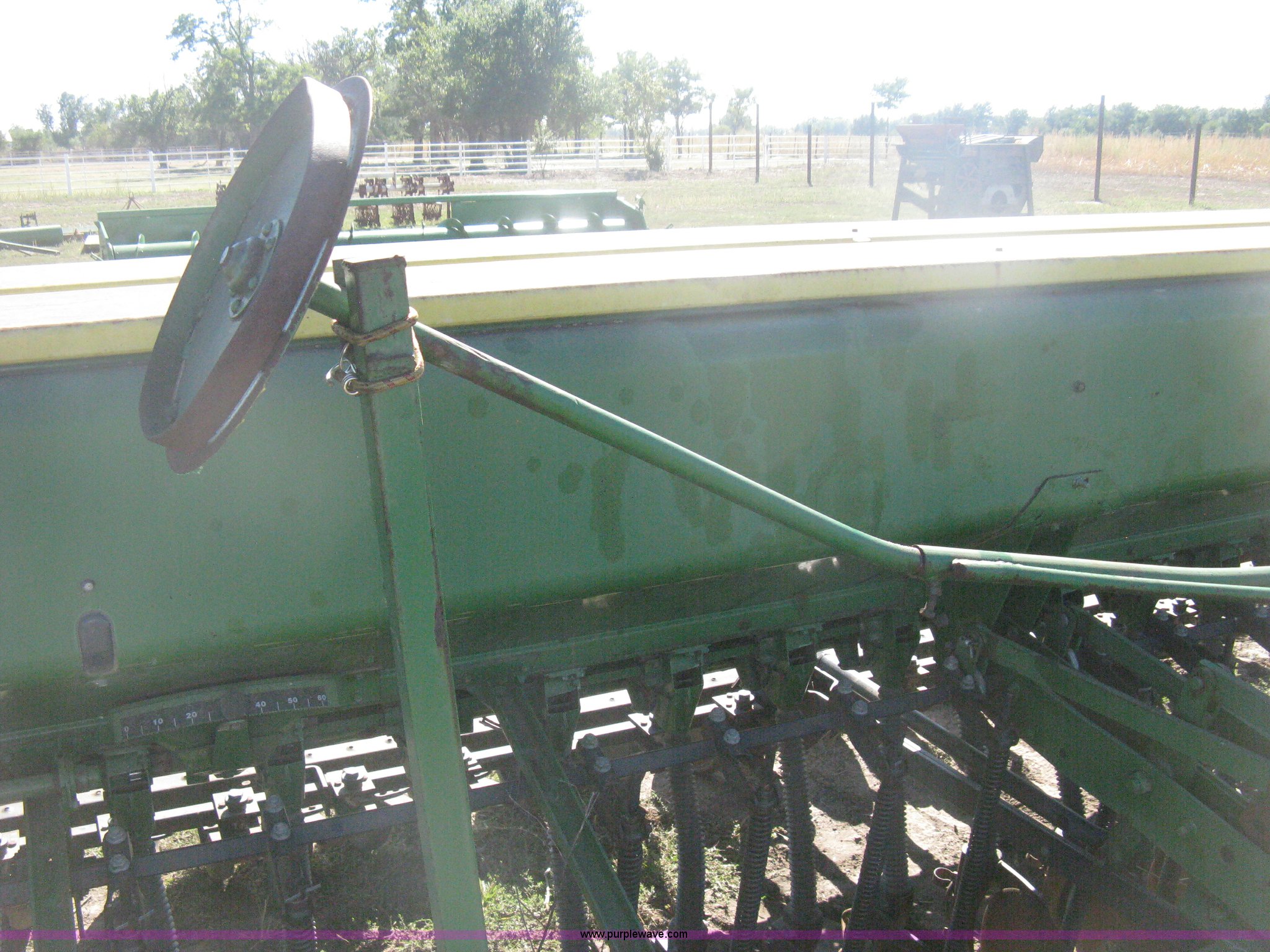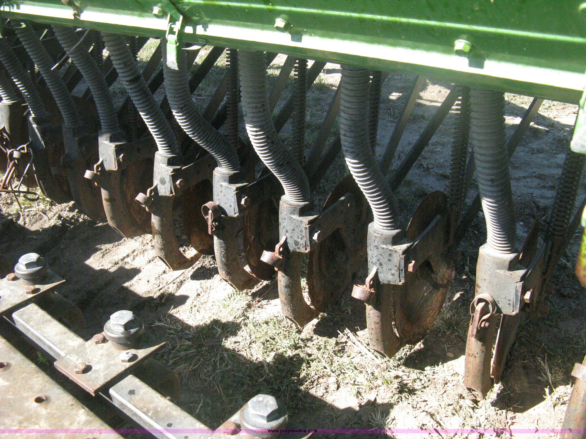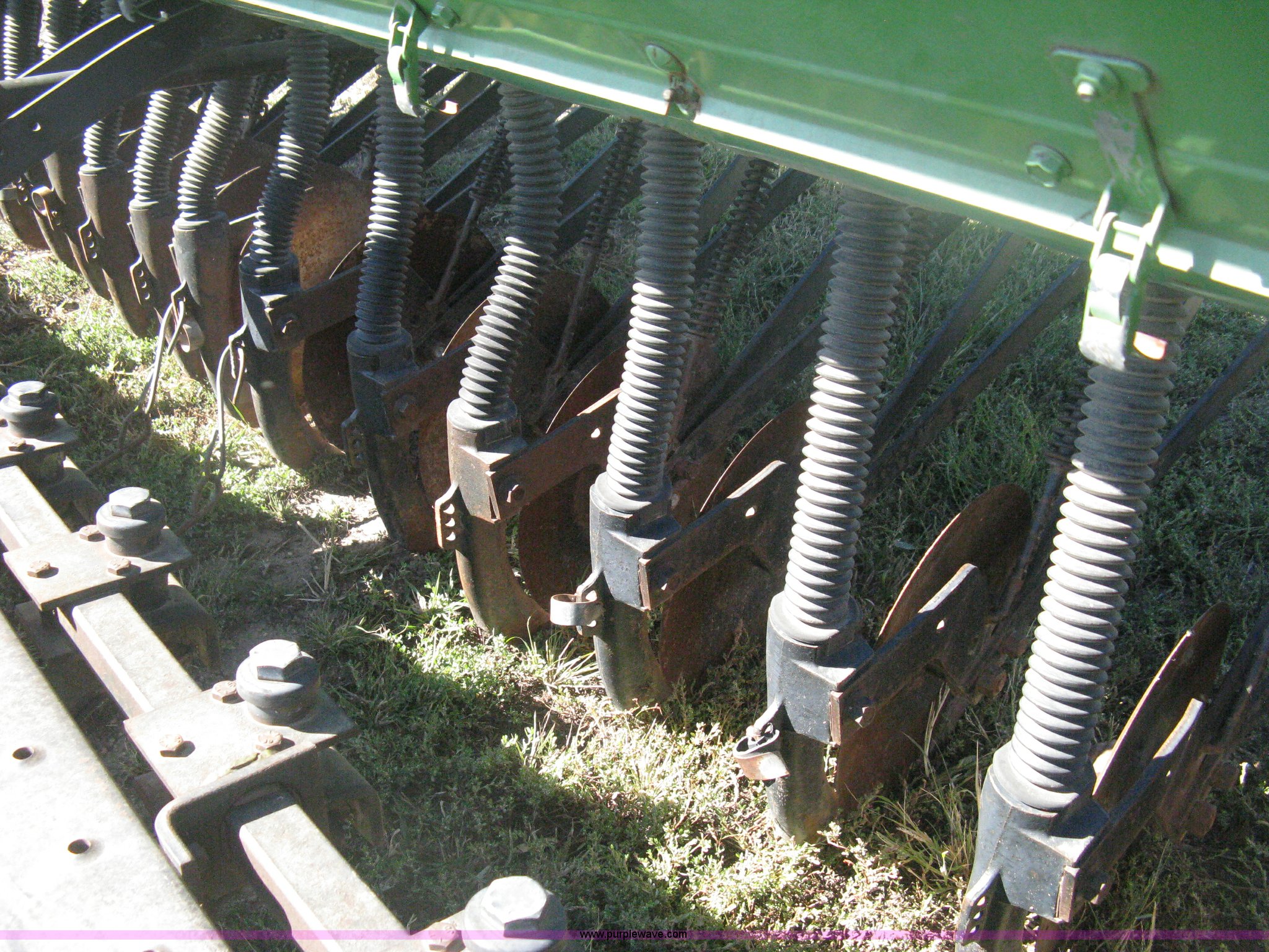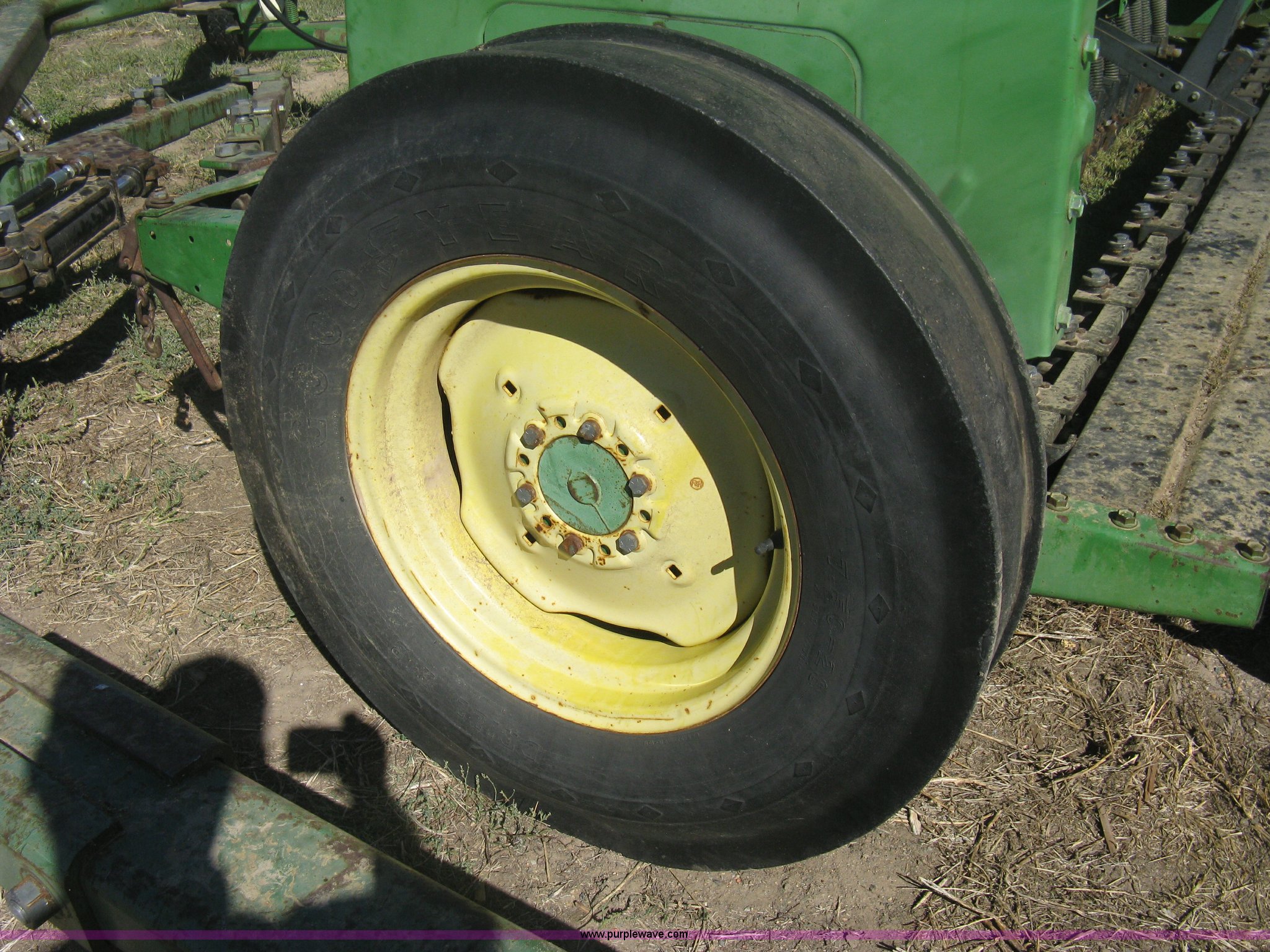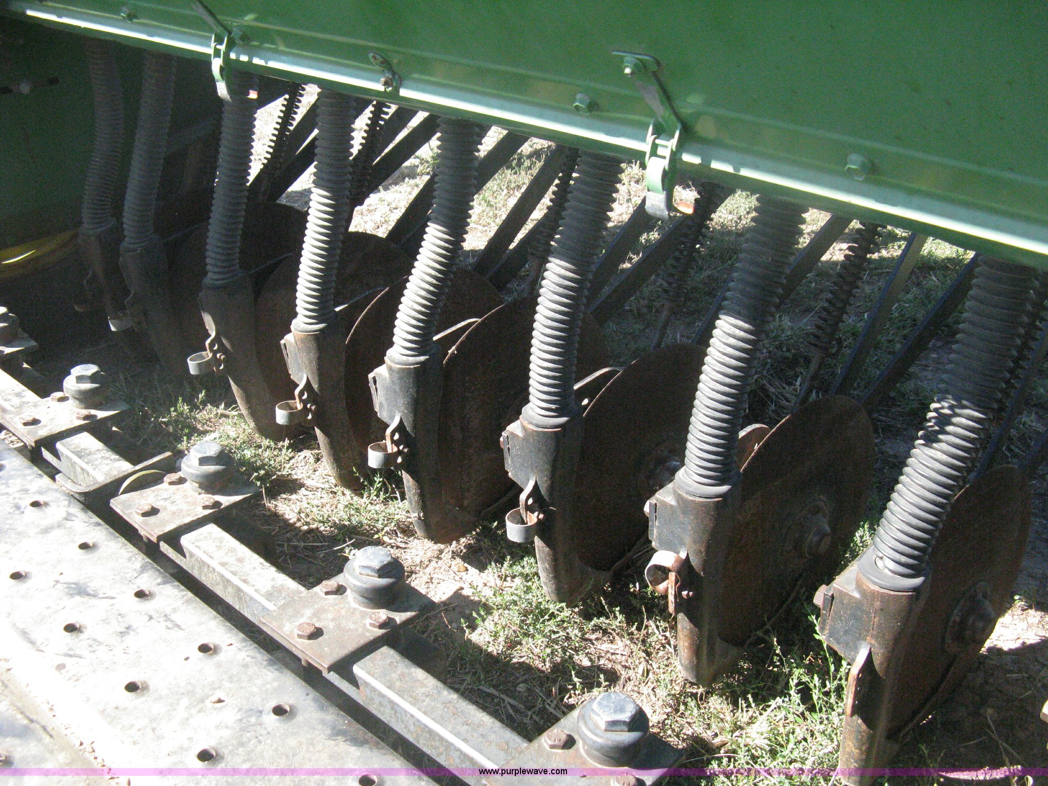 Purple Wave is selling a used Grain Drill or Seeder in Kansas. This item is a (2) John Deere 8350 grain drills with the following: 13' work width, 20 drops, 8" spacing, Seed and fertilizer boxes, Hydraulic lift, Single disk coulters, Six lug wheels, 7.50-20 tires, Baker 2200 tandem drill hitch, Hydraulic fold out, Serial 28849, Serial N08000X058943,
