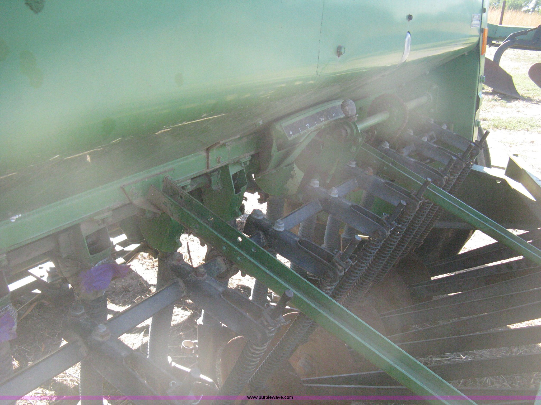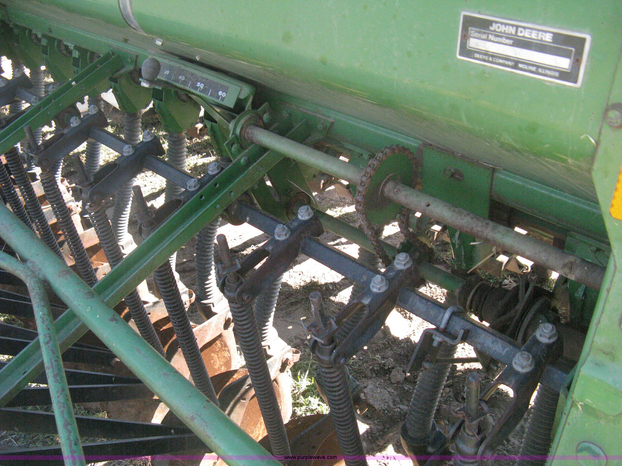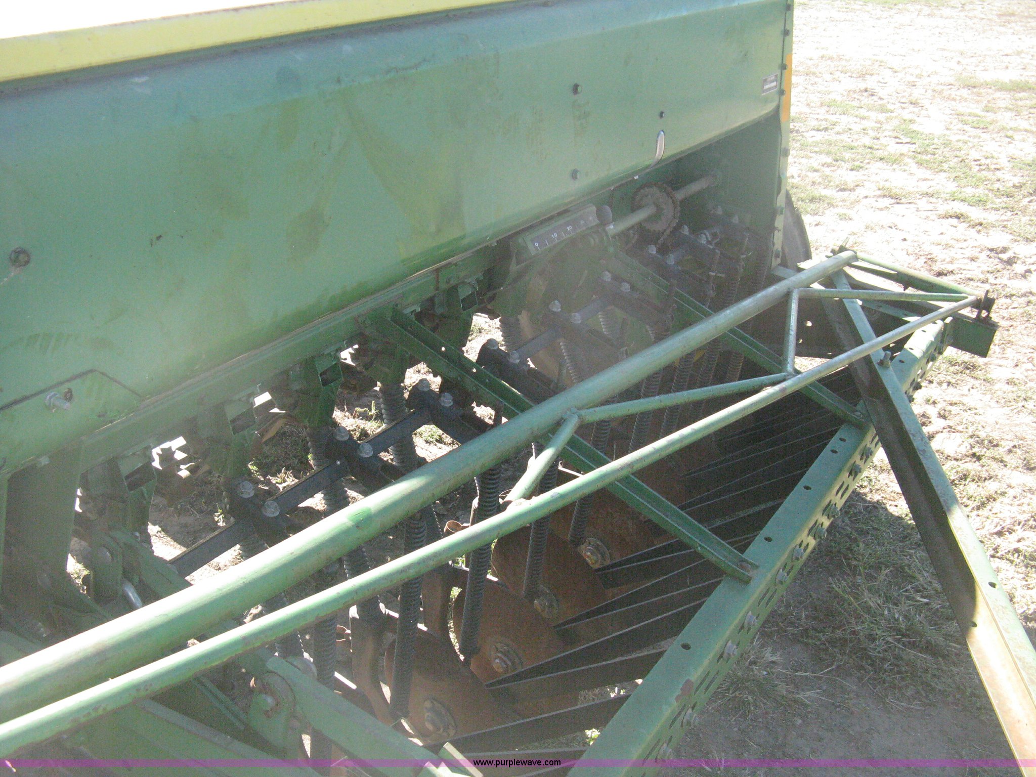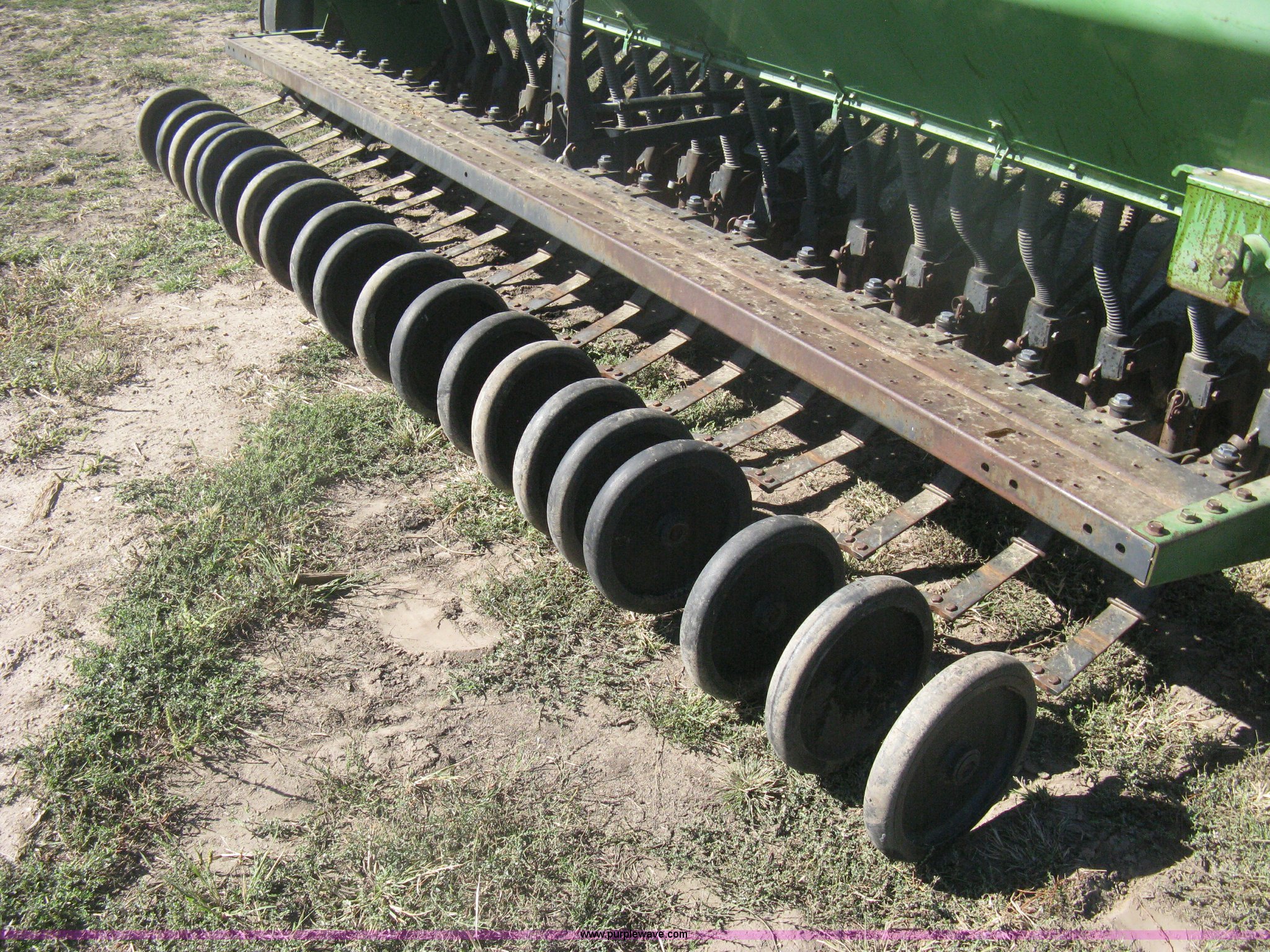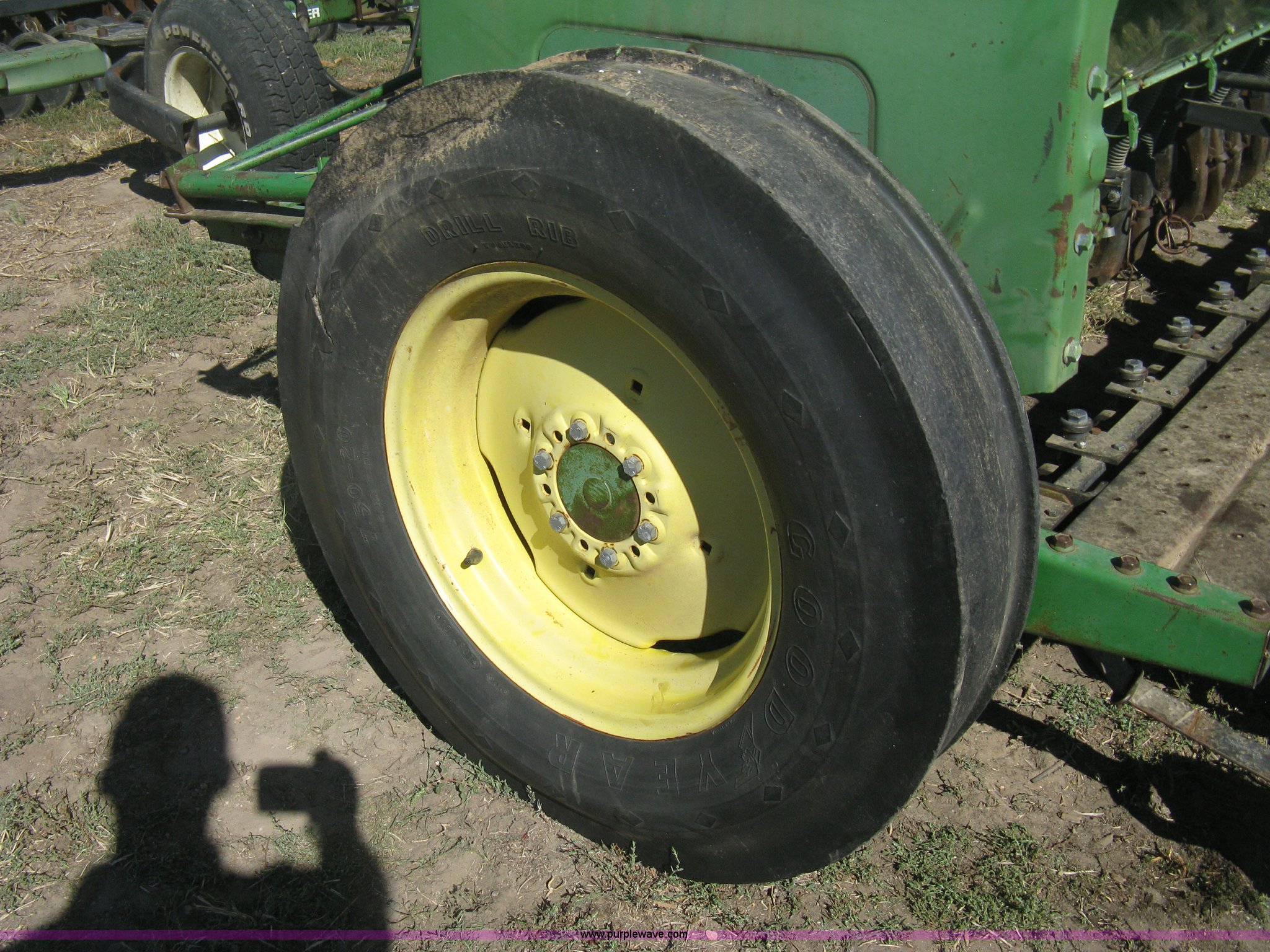 Purple Wave is selling a used Grain Drill or Seeder in Kansas. This item is a (2) John Deere 8350 grain drills with the following: 13' work width, 20 drops, 8" spacing, Seed and fertilizer boxes, Hydraulic lift, Single disk coulters, Six lug wheels, 7.50-20 tires, Baker 2200 tandem drill hitch, Hydraulic fold out, Serial 28849, Serial N08000X058943,