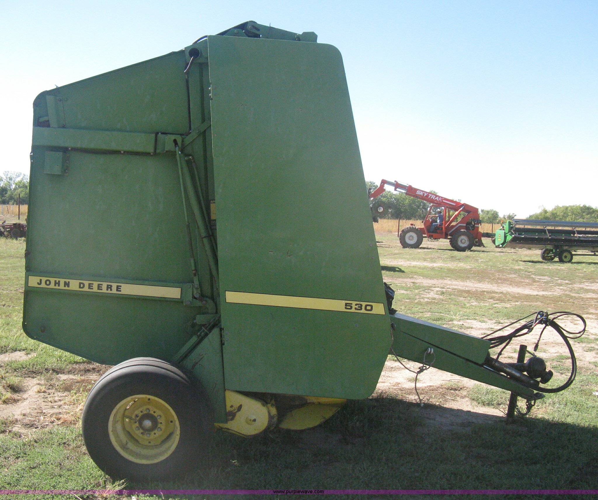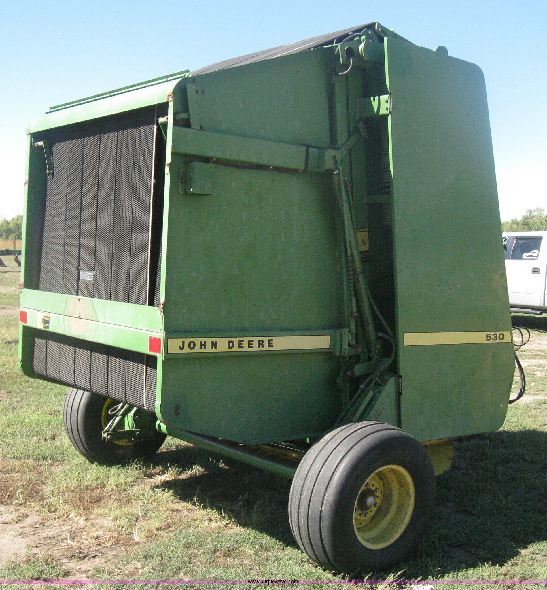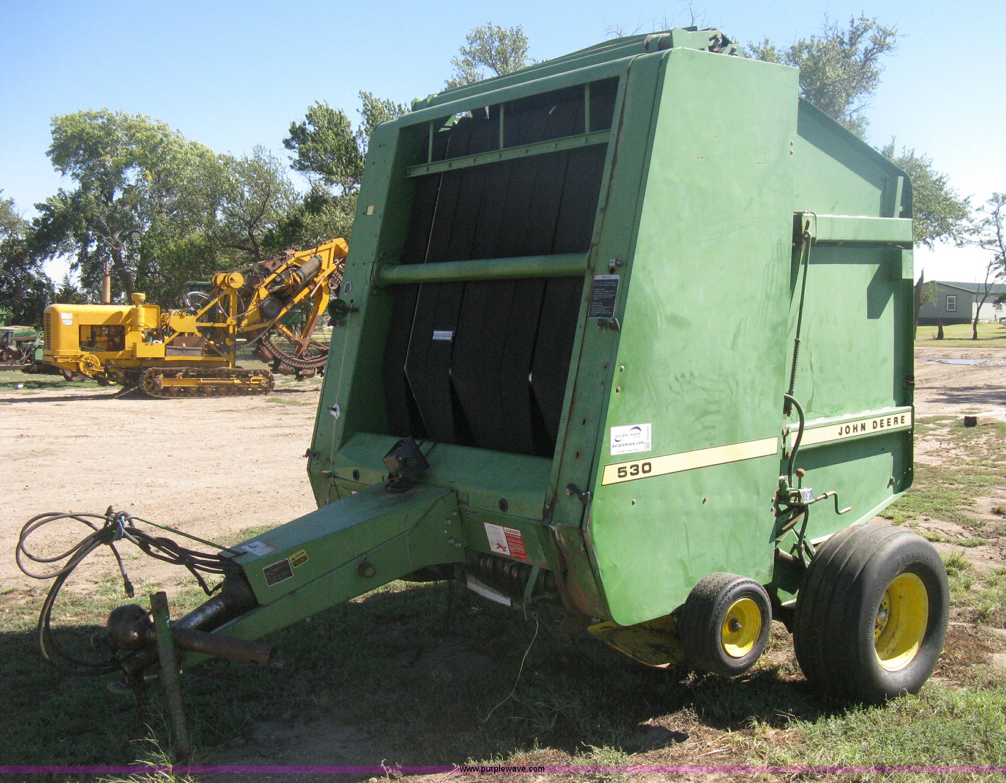 Purple Wave is selling a used Round Baler in Kansas. This item is a John Deere 530 round baler with the following: 540 PTO, Twine tie, John Deere Bale-Trak in-cab monitor, 31x13.50-15 tires, Serial E00530X687835