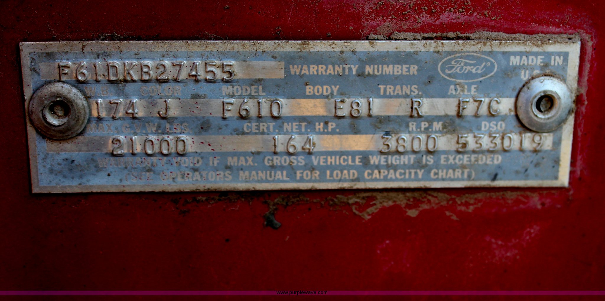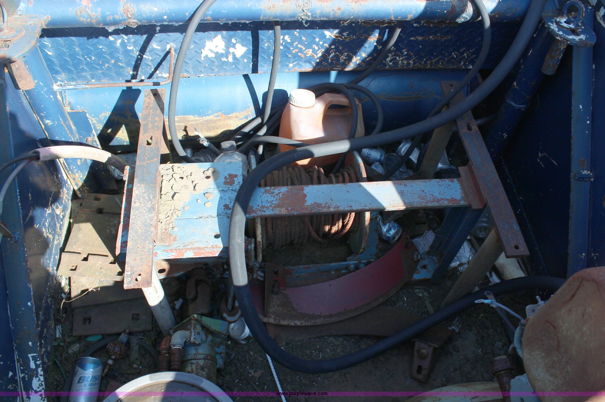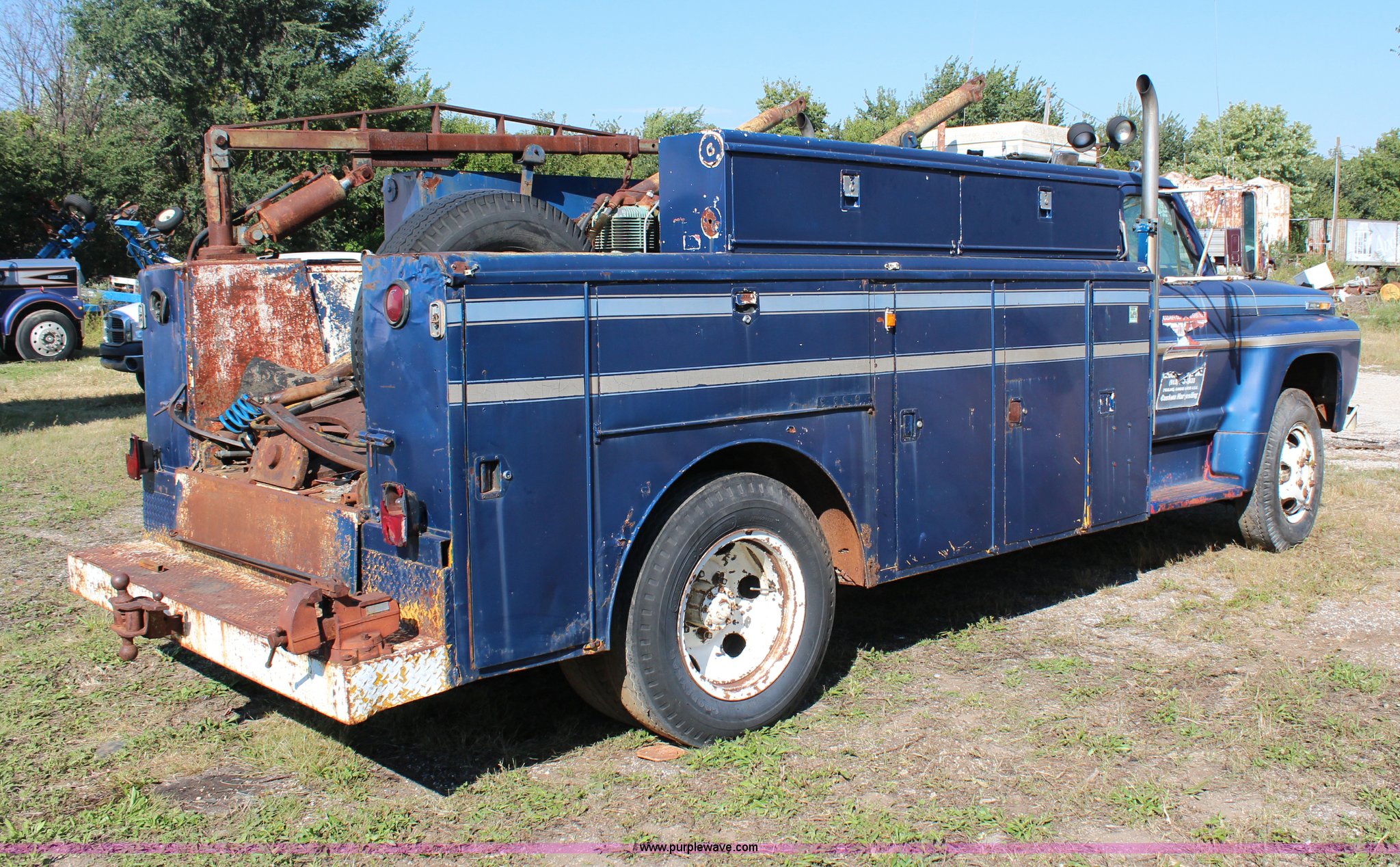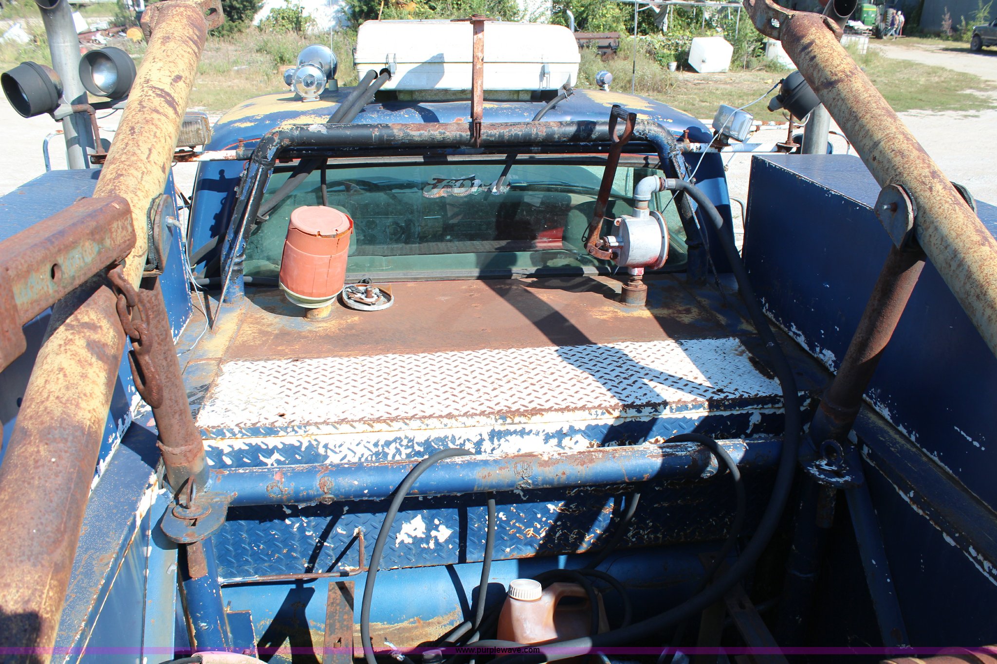 Purple Wave is selling a used Service Truck in Kansas. This item is a 1967 Ford F600 service truck with the following: 60,089 miles on odometer, Cummins 555 C.I.D. V8 diesel engine, Five speed manual transmission, AC and heat, PTO, 12'L utility bed, Air compressor, Engine inoperable, Needs rebuilt, Gin polls, Winch, 12"L bumper, Vise, 400 gallon bed mounted fuel tank, Receiver hitch, 8.25-20 tires, Parts and supplies will be removed from box prior to auction, Some doors are stuck shut on bed, Unknown operating condition, Unit has not been used in 10 years