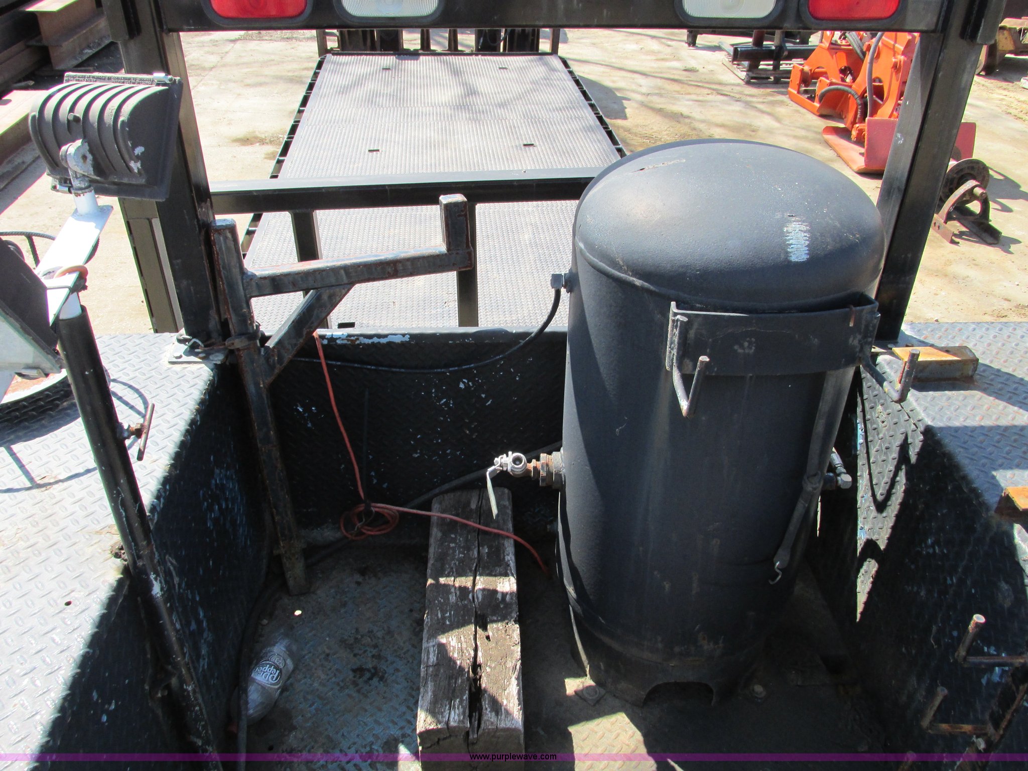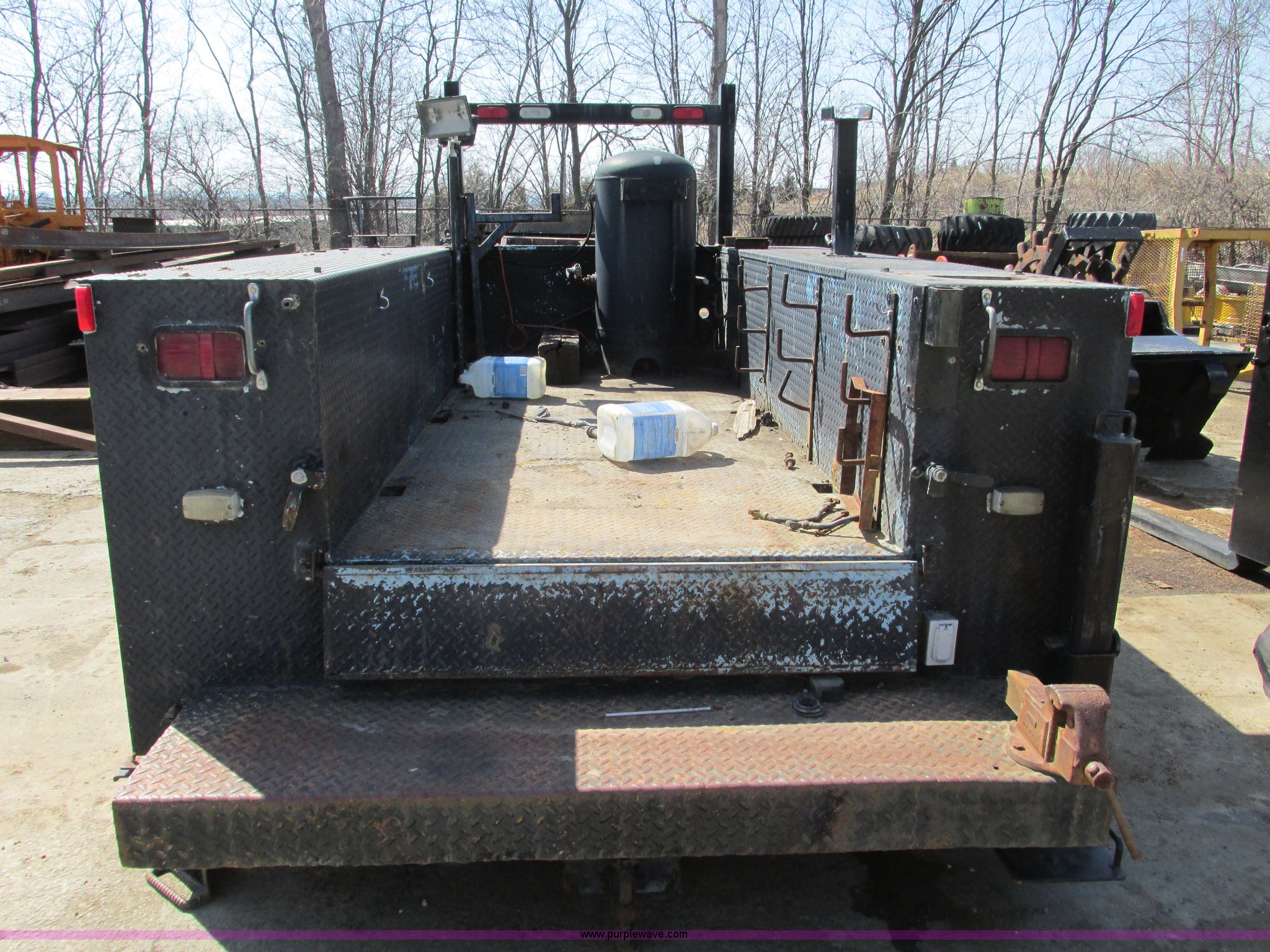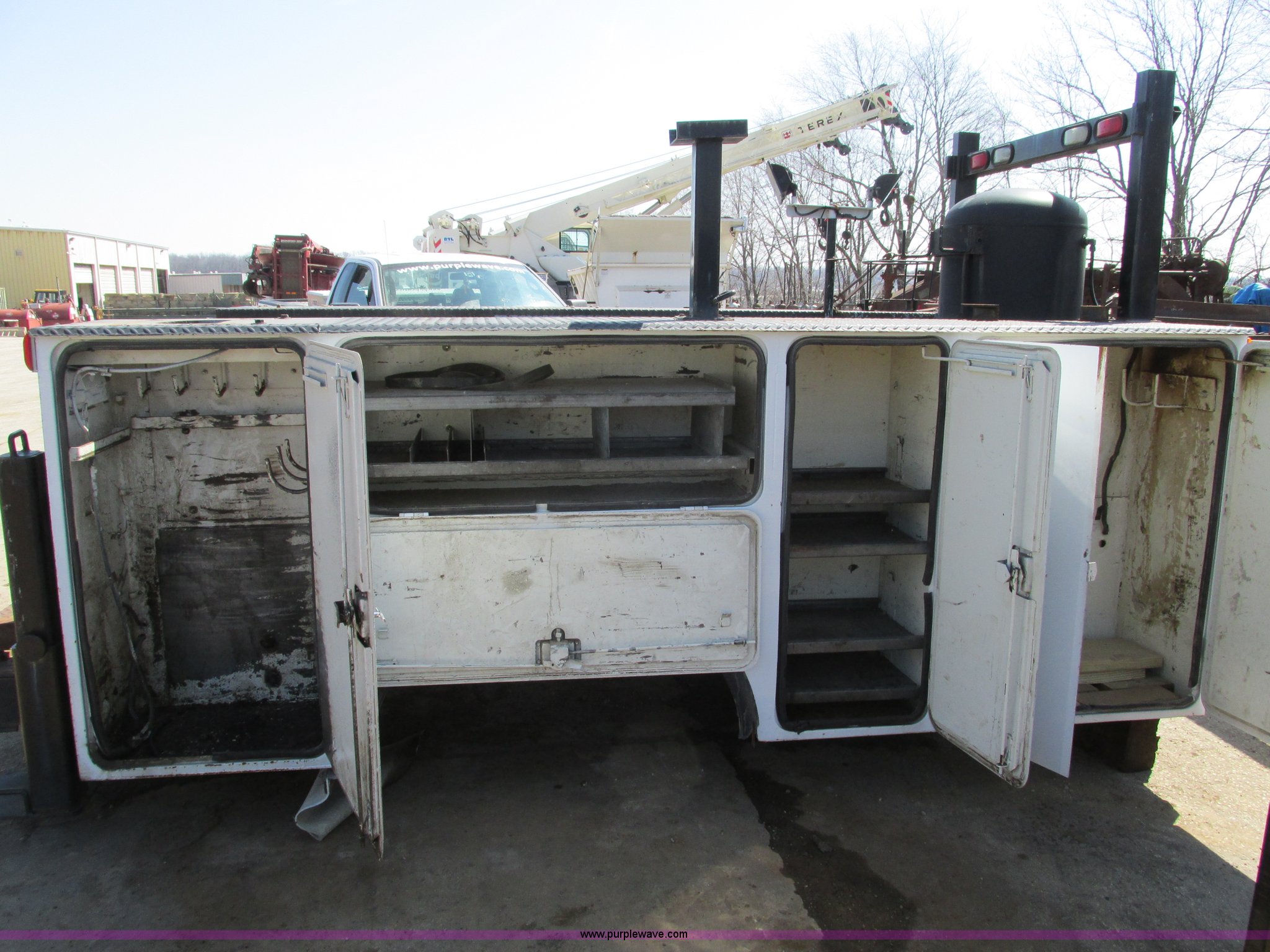 11'L x 94"W utility bed. Headache rack, Rear vise, Manual outriggers on right rear corner, Air tank, Work lights, Cosmetic damage. Damon Pursell Construction. 300 N Church Rd. Liberty, MO 64068