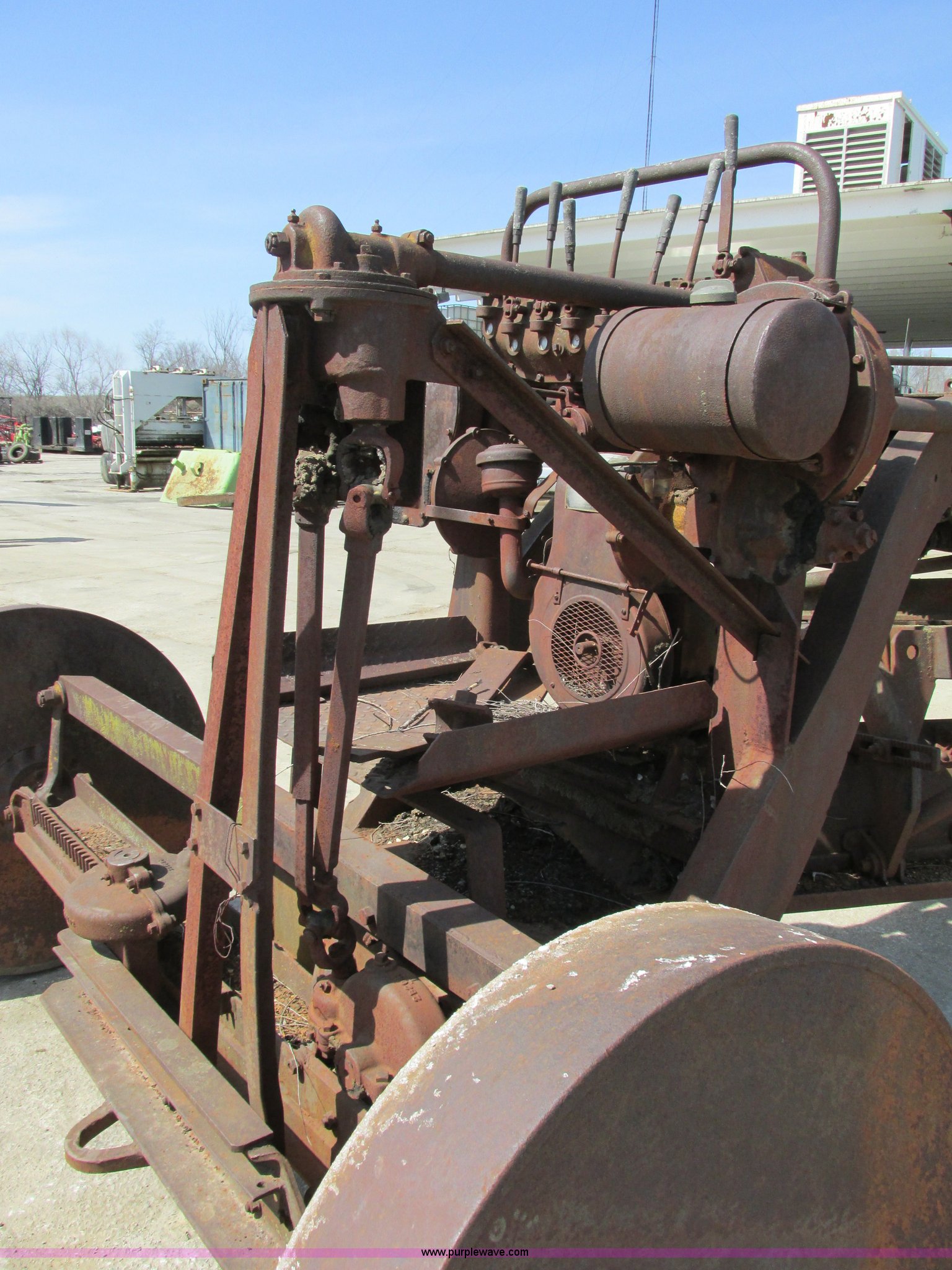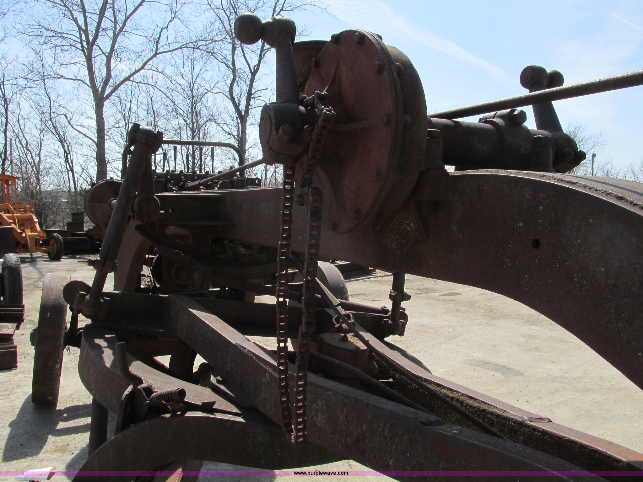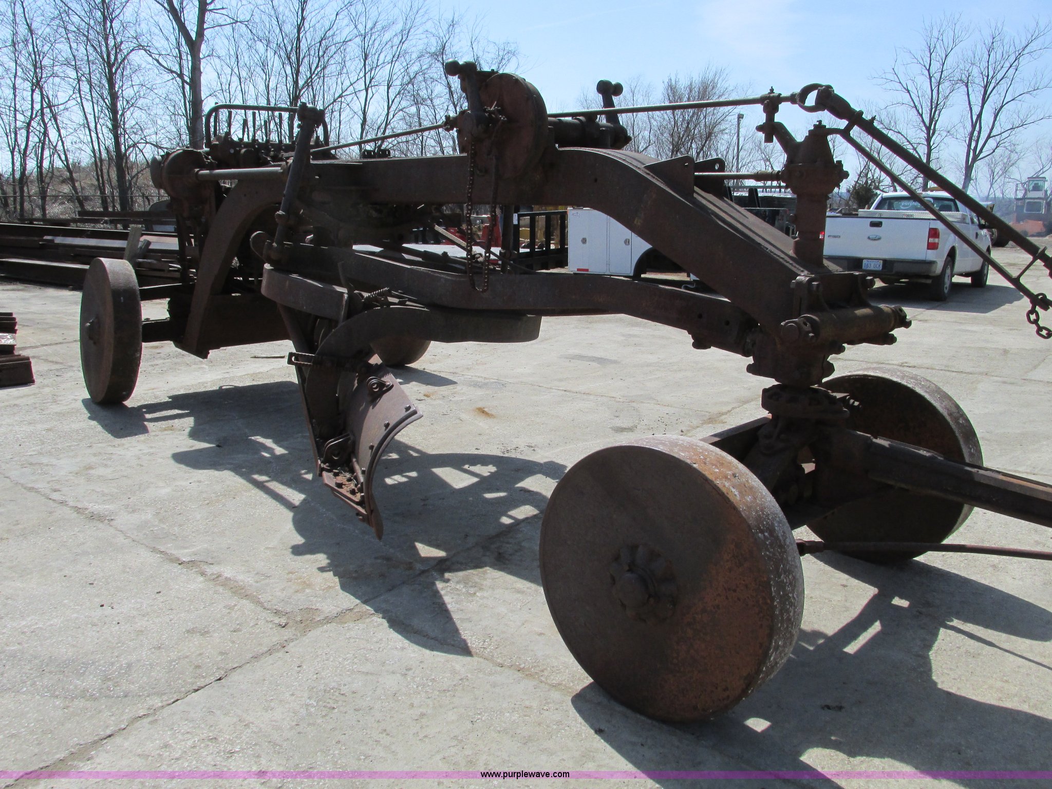 Caterpillar 66 pull behind grader. Wards single cylinder gas engine Model WMOAMH22372, Serial 746664, Article# 872943, Control box, Steel wheels, 12'W blade Smooth bolt-on cutting edge, Serial &H203. Damon Pursell Construction. 300 N Church Rd. Liberty, MO 64068