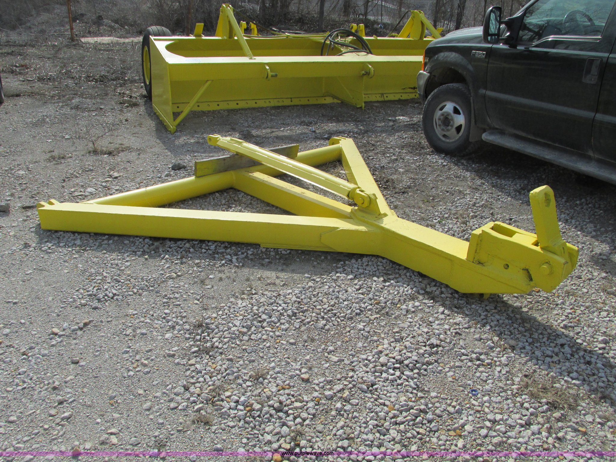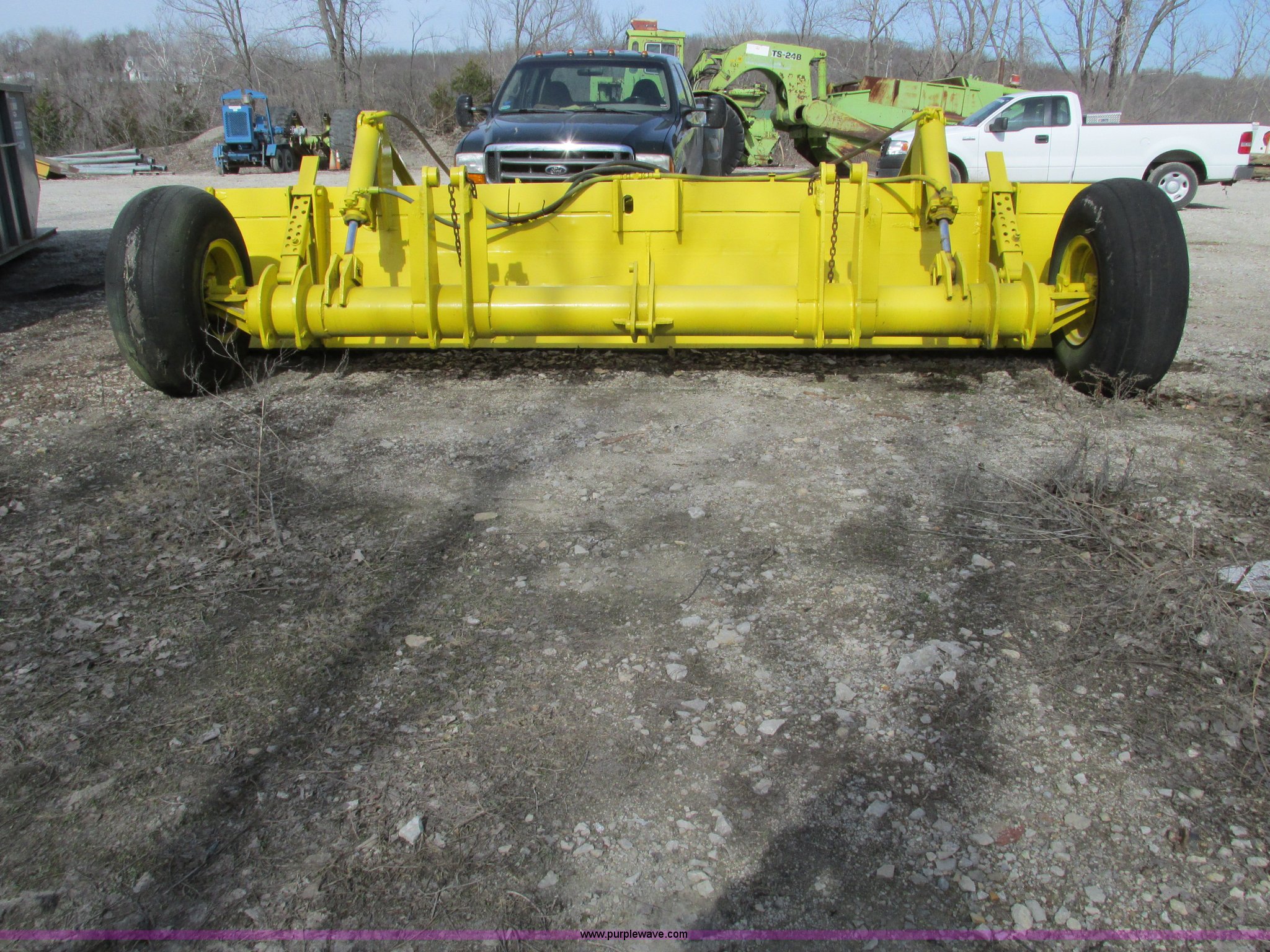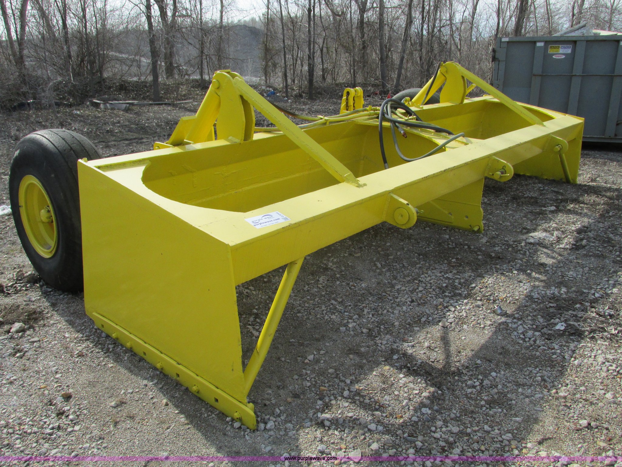 Purple Wave is selling a used Pull Type Scraper in Missouri. This item is a 18' pull behind box blade with the following: Dual cylinders, Smooth bolt-on cutting edge, Hitch removed for transport, Hitch is cracked