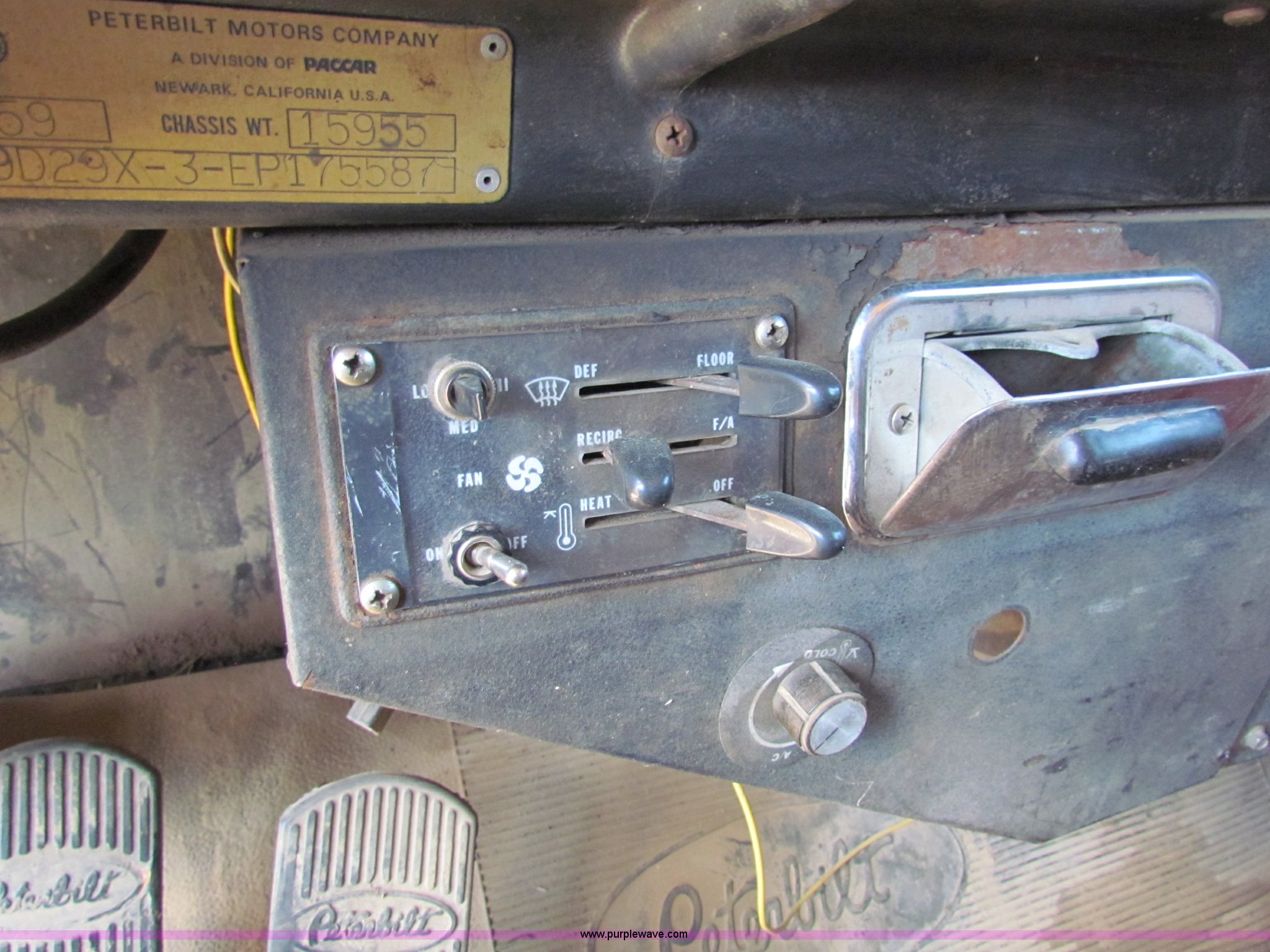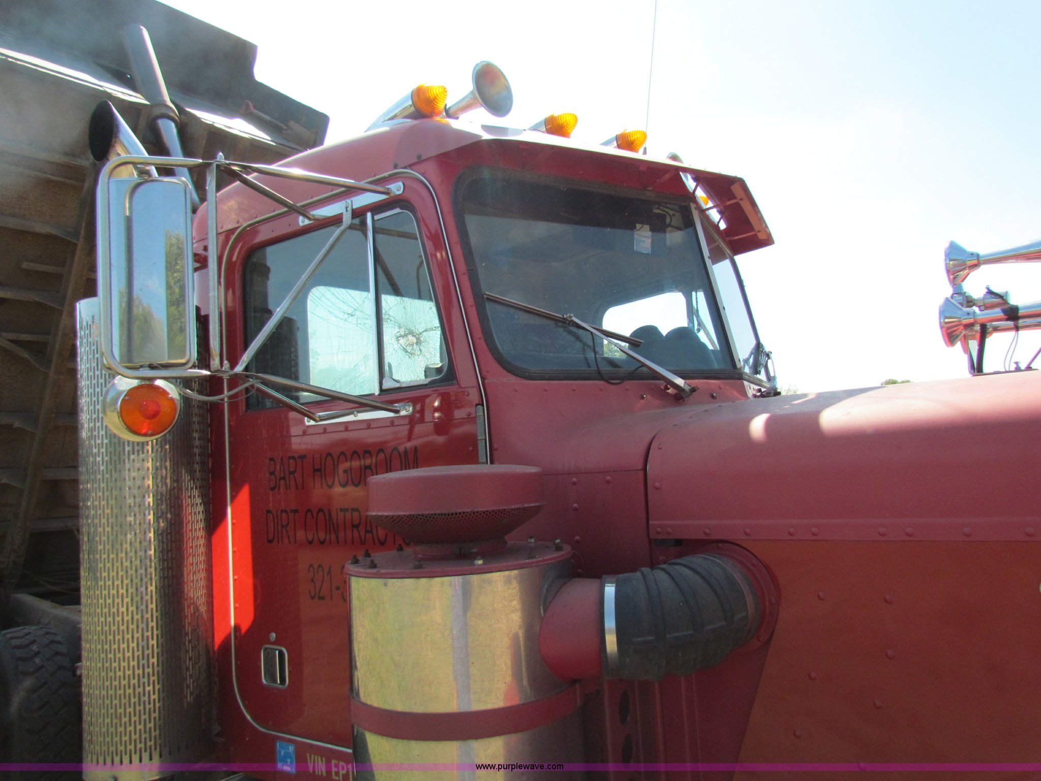 1984 Peterbilt dump truck. 40,519 miles on odometer Not actual mileage, 2,247 hours on meter, Cummins diesel engine, 10 speed manual transmission, Locking power divider, Twin screw, AC and heat AC needs charged, Air suspension seat, Marion 12'L bed Air operated end gate, Exterior visor, Chome bumper, Block heater, Single fuel tank, Train horn, Air brakes, 285/75R24.5 tires, Rear glass broken, Hydraulic cylinder replaced five years ago, Rear pods and power divider rebuilt, (2) additional spare tires, Interior/exterior cosmetic damage. 1XP9D29X3EP175587. Bart Hogoboom Estate. El Dorado, KS 67042