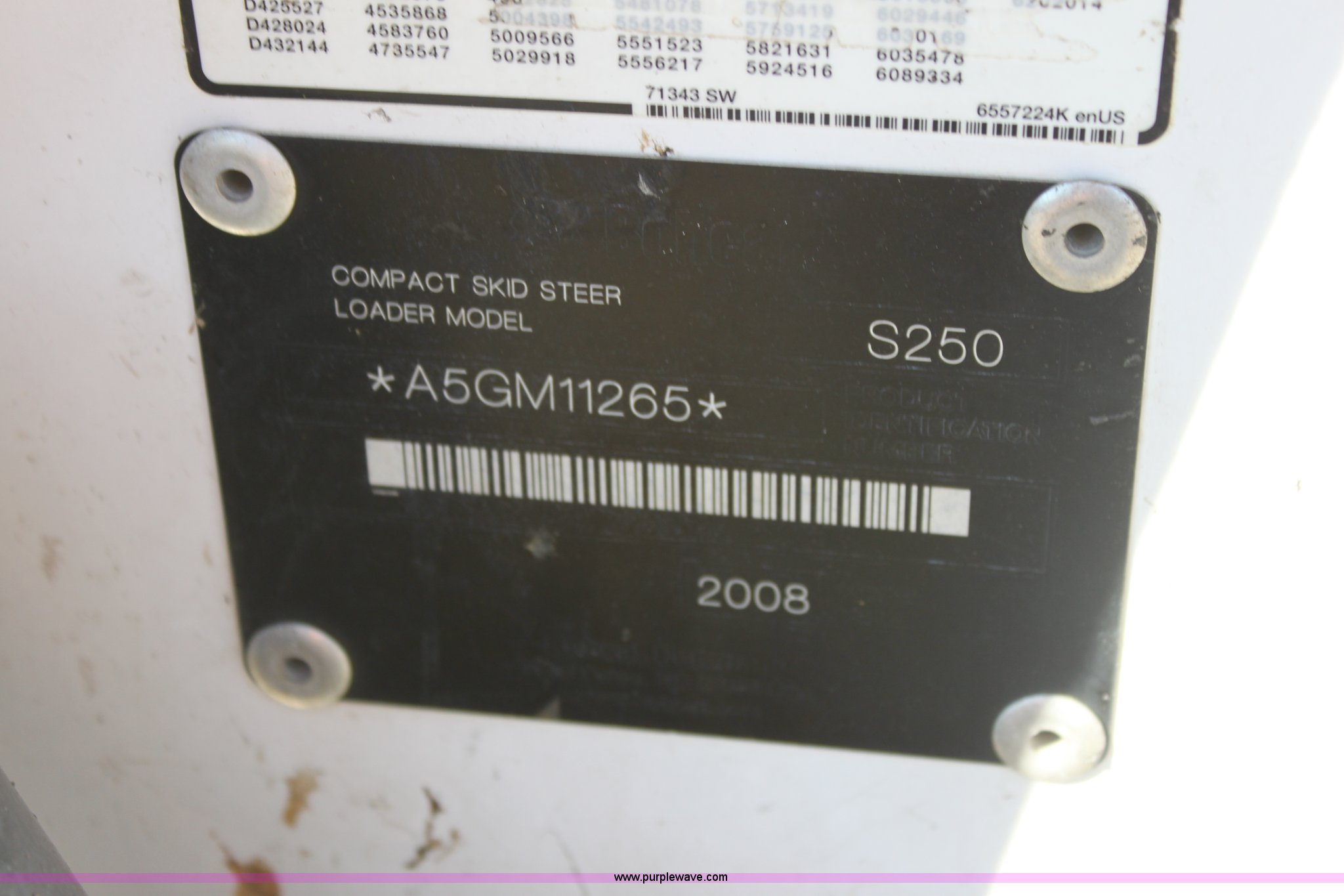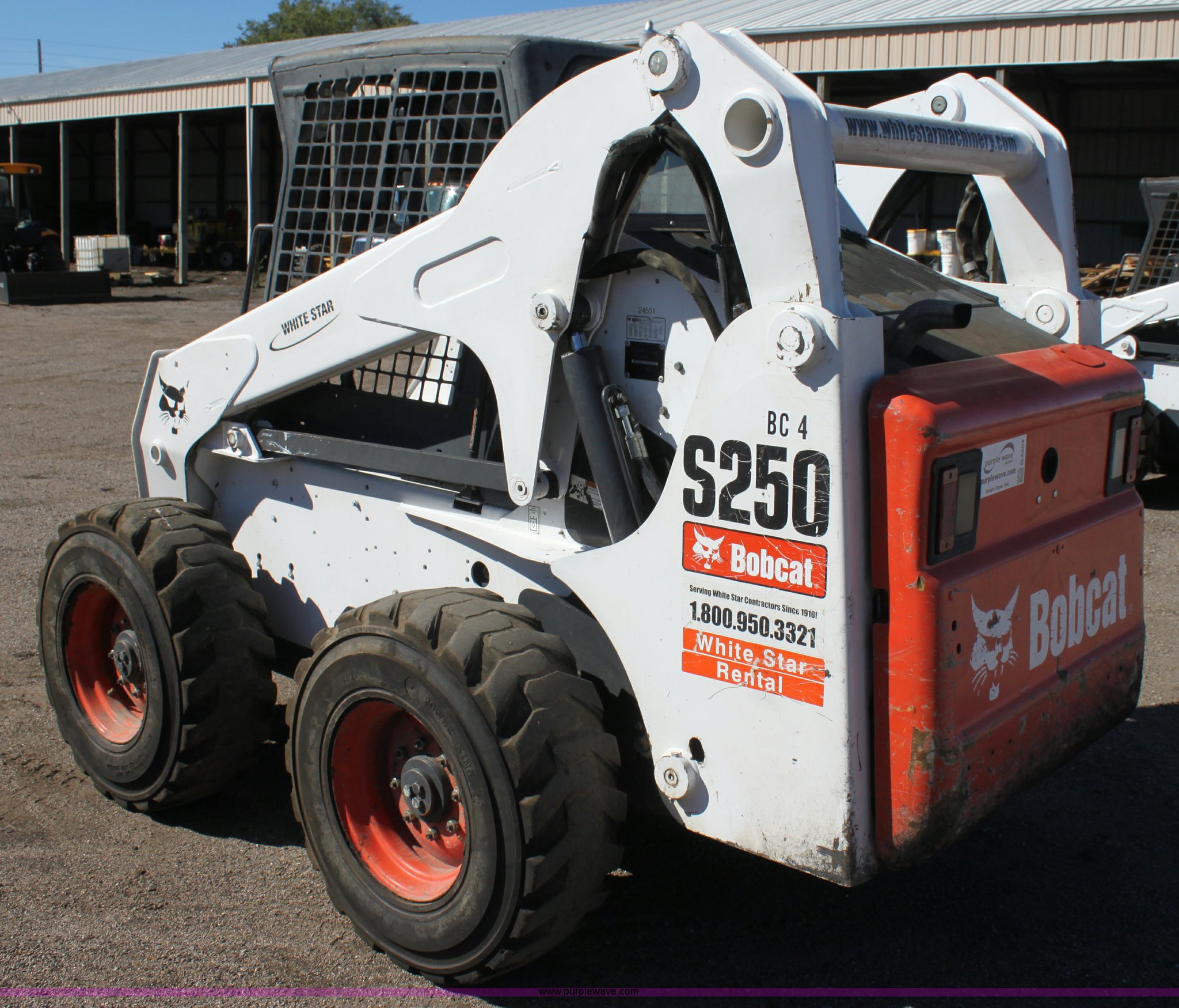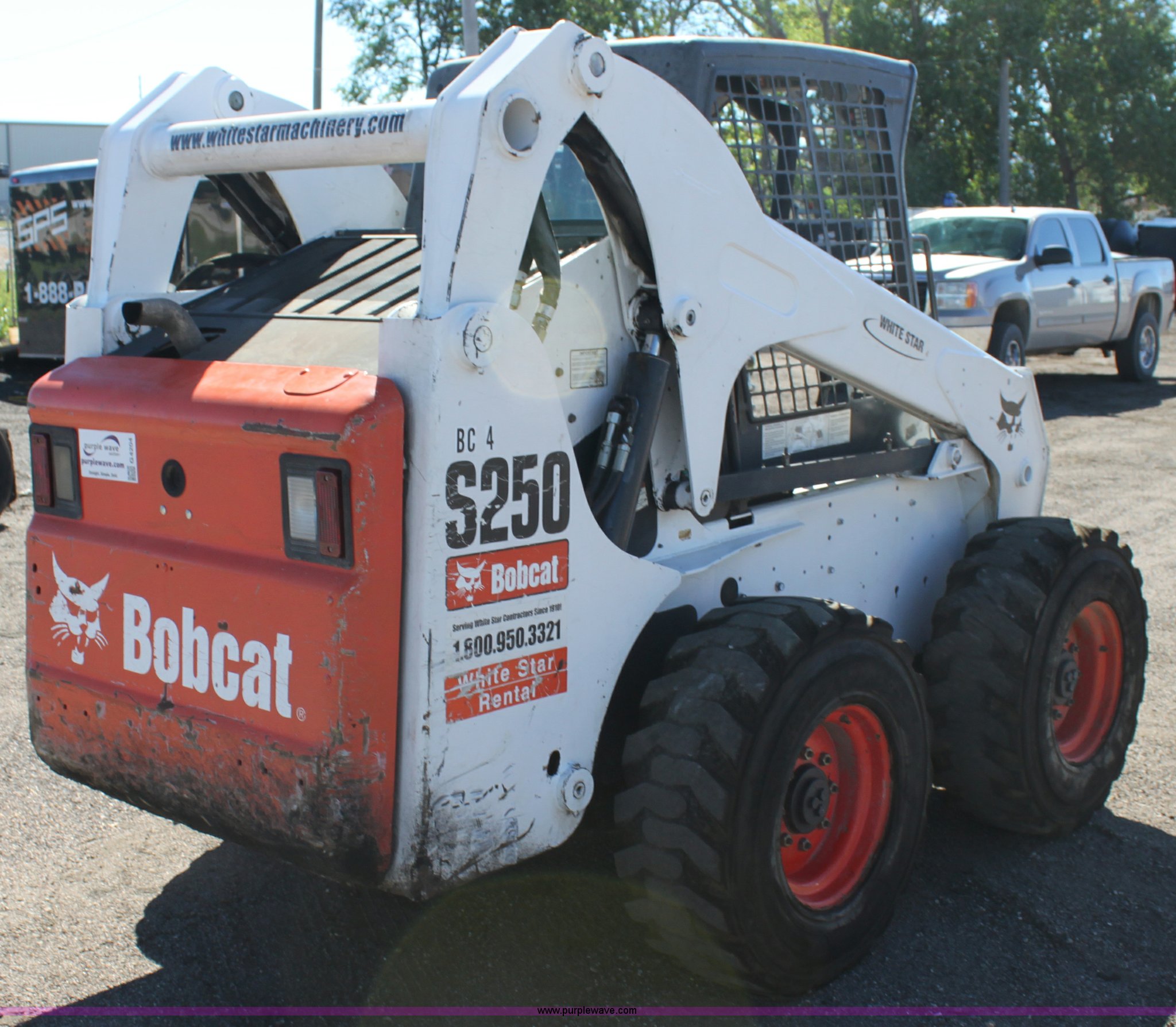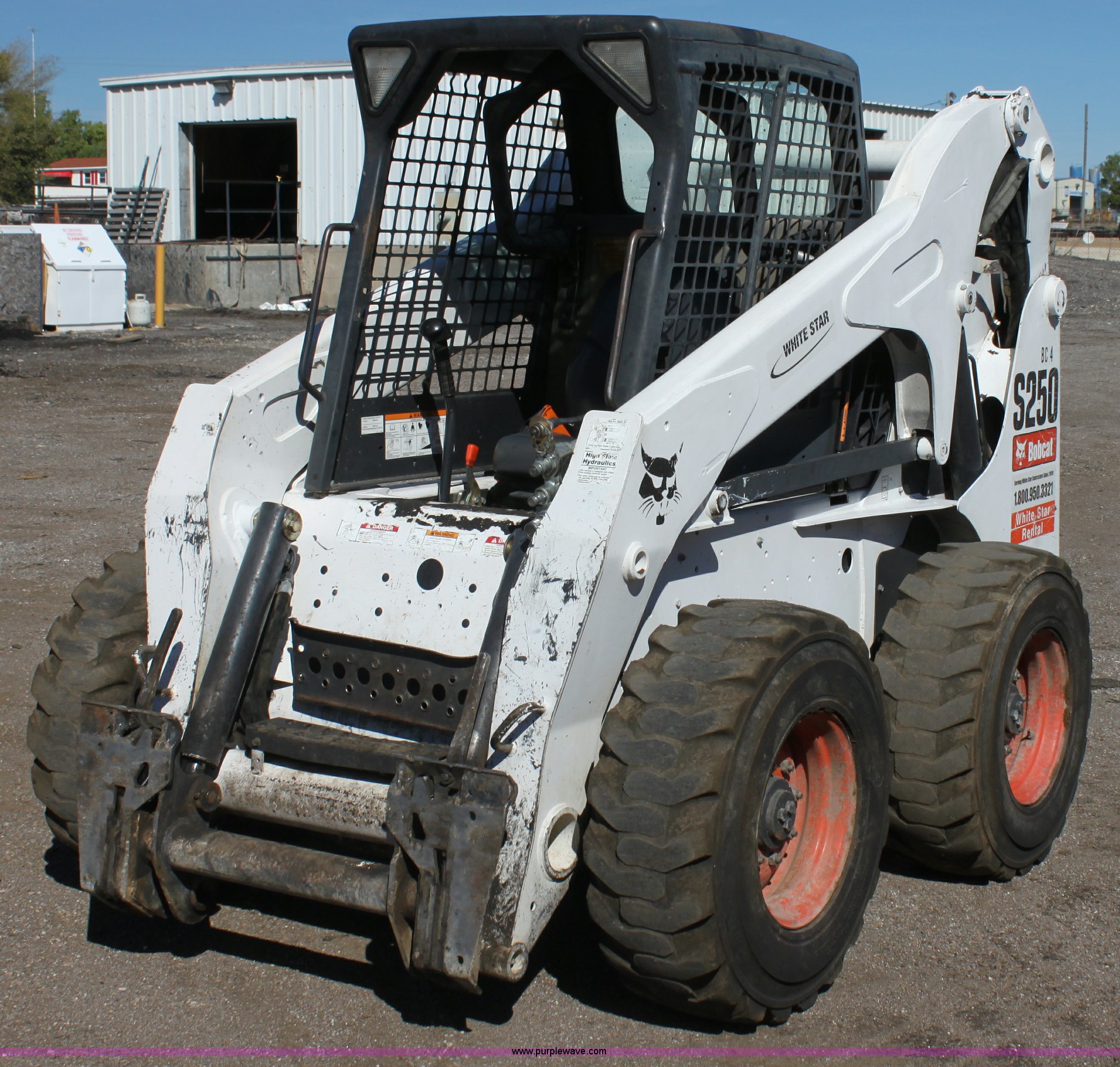 Purple Wave is selling a used Skid Steer Loader in Kansas. This item is a 2008 Bobcat S250 skid steer with the following: 2,045 hours on meter, Kubota four cylinder diesel engine, Traction lock override, Hand and foot controls, High Flow hydraulics, Deluxe instrument panel, Engine block heater, 12-16.5 tires, 7,825 lbs. base operating weight, Serial A5GM11265, SPS# BC4