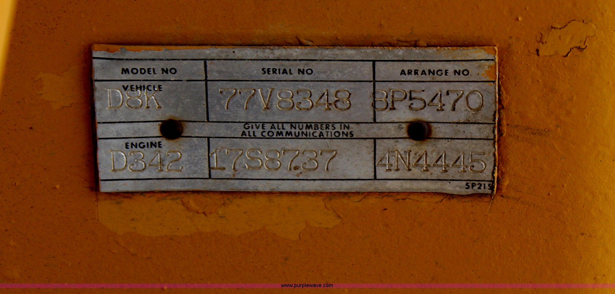 Purple Wave is selling a used Crawler Dozer in Kansas. This item is a 1977 Caterpillar D8K dozer with the following: Caterpillar D342 diesel engine, 300 HP, Three speed powershift transmission, 13'3" blade width, Single cylinder tilt, 22"W track pads, 70,500 lbs. base operating weight, Final drive and steering clutch on left side have less than 100 hours on them, Serial 77V8348