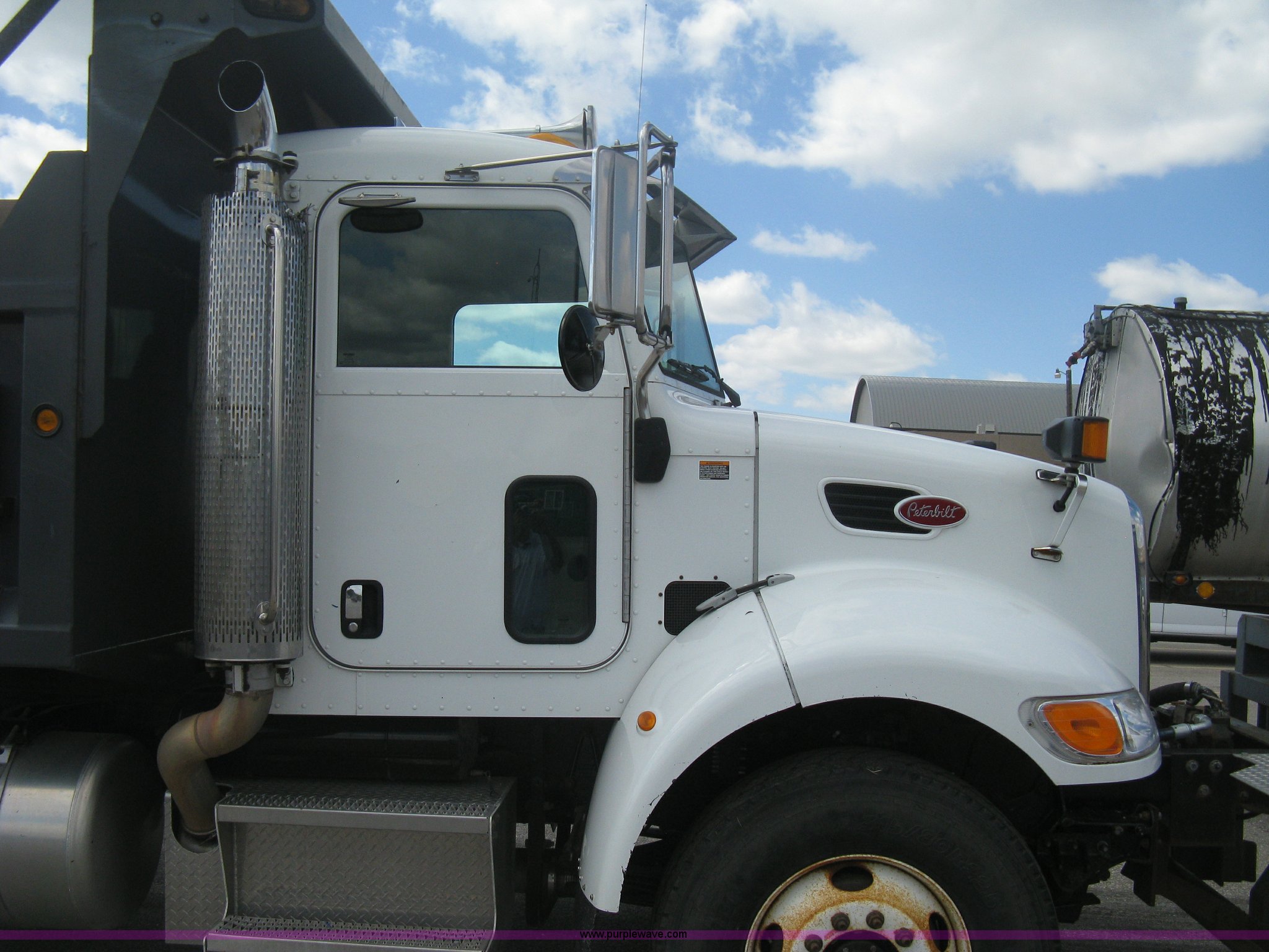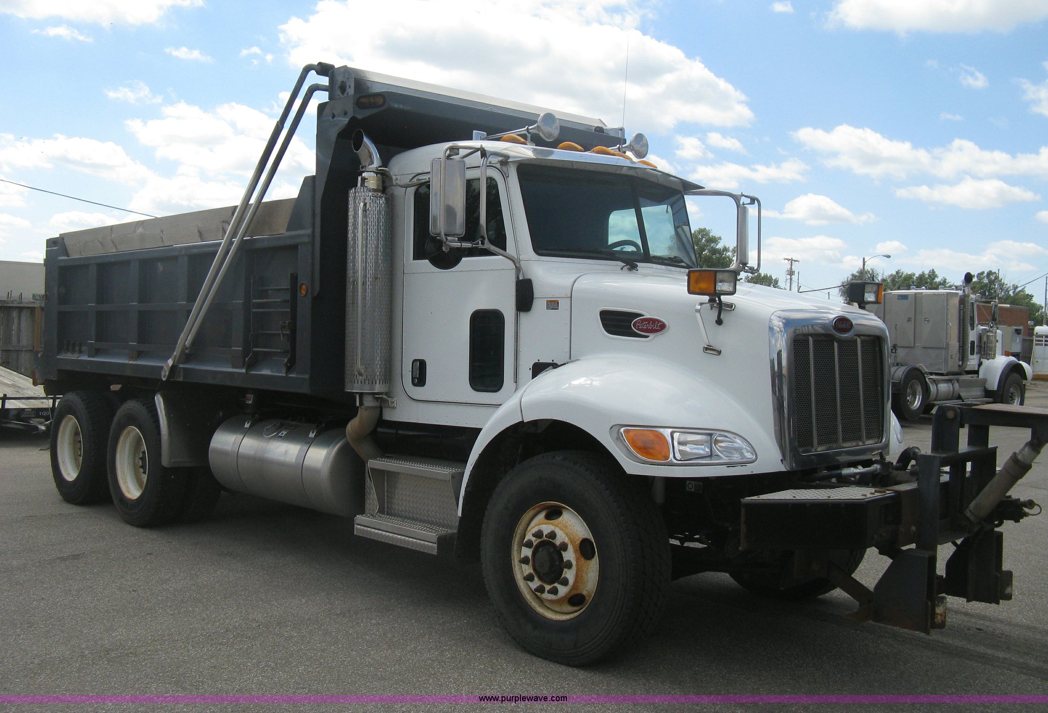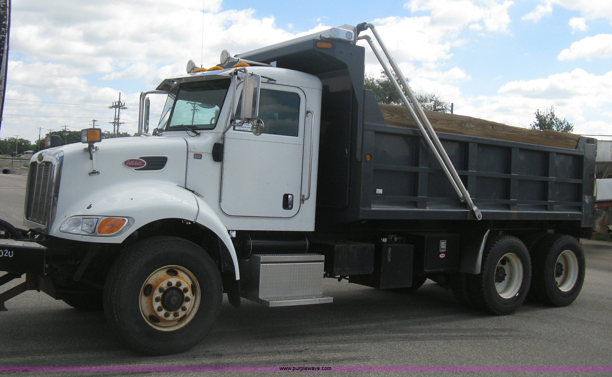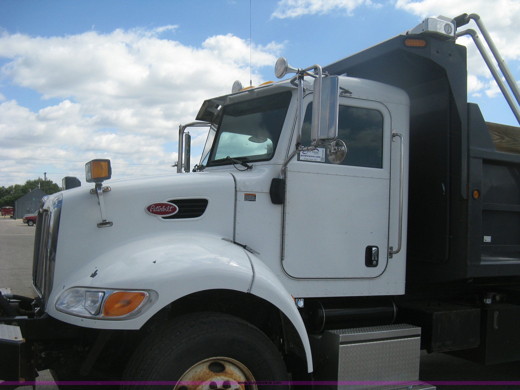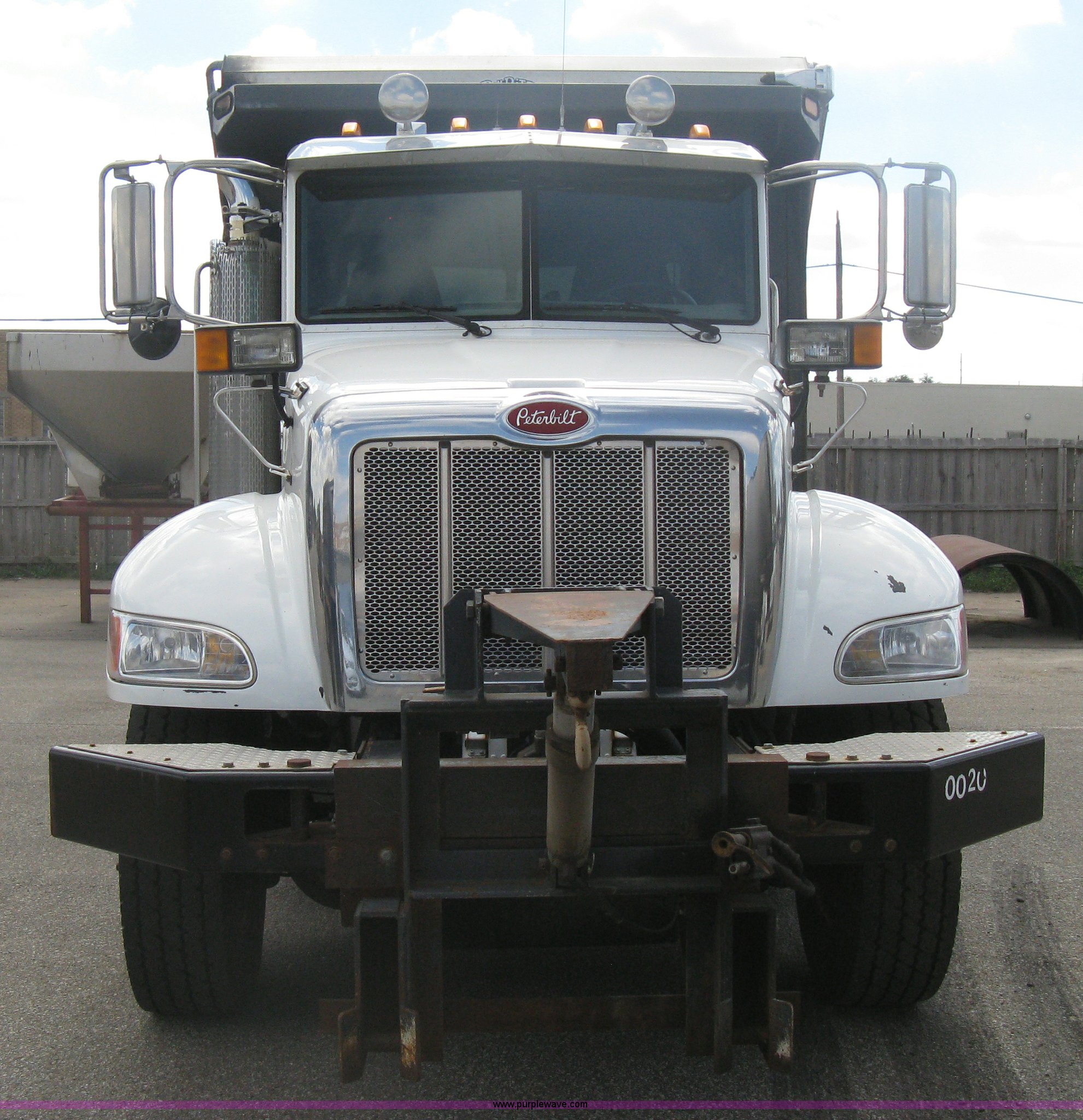 Purple Wave is selling a used Construction Dump Truck in Kansas. This item is a 2008 Peterbilt 340 dump truck with the following: 112,562 miles on odometer, 4,618 hours on meter, Cummins ITC L6 diesel engine, 330 HP, Automatic transmission, Model RTO10910B-A53, Full screw, Full locking differential, AC and heat, Tilt, Cruise, AM/FM, Telescoping steering wheel, Air suspension seat, Heated mirrors, Air ride cab, Daylight passenger window, Mabar DB153659 dump bed, 15'L x 95"W, Tip top side boards, Rollover tarp, Single ram hoist, Air operated end gate, Dickey-John control point digital monitor, Joystick plow and hoist control, Spreader control, Exterior visor, Block heater, Toolboxes, 110 gallon fuel tank, Front mount PTO, Air suspension, Air brakes, Jake brake, 5:29 gear ratio, 315/80R22.5 front tires, 11R22.5 rear tires, GVWR 58,000 lbs, FAWR 18,000 lbs, IAWR 20,000 lbs, RAWR 20,000 lbs, Paint peeling, Front bumper snow plow mounting brackets not included, Unit# 0020