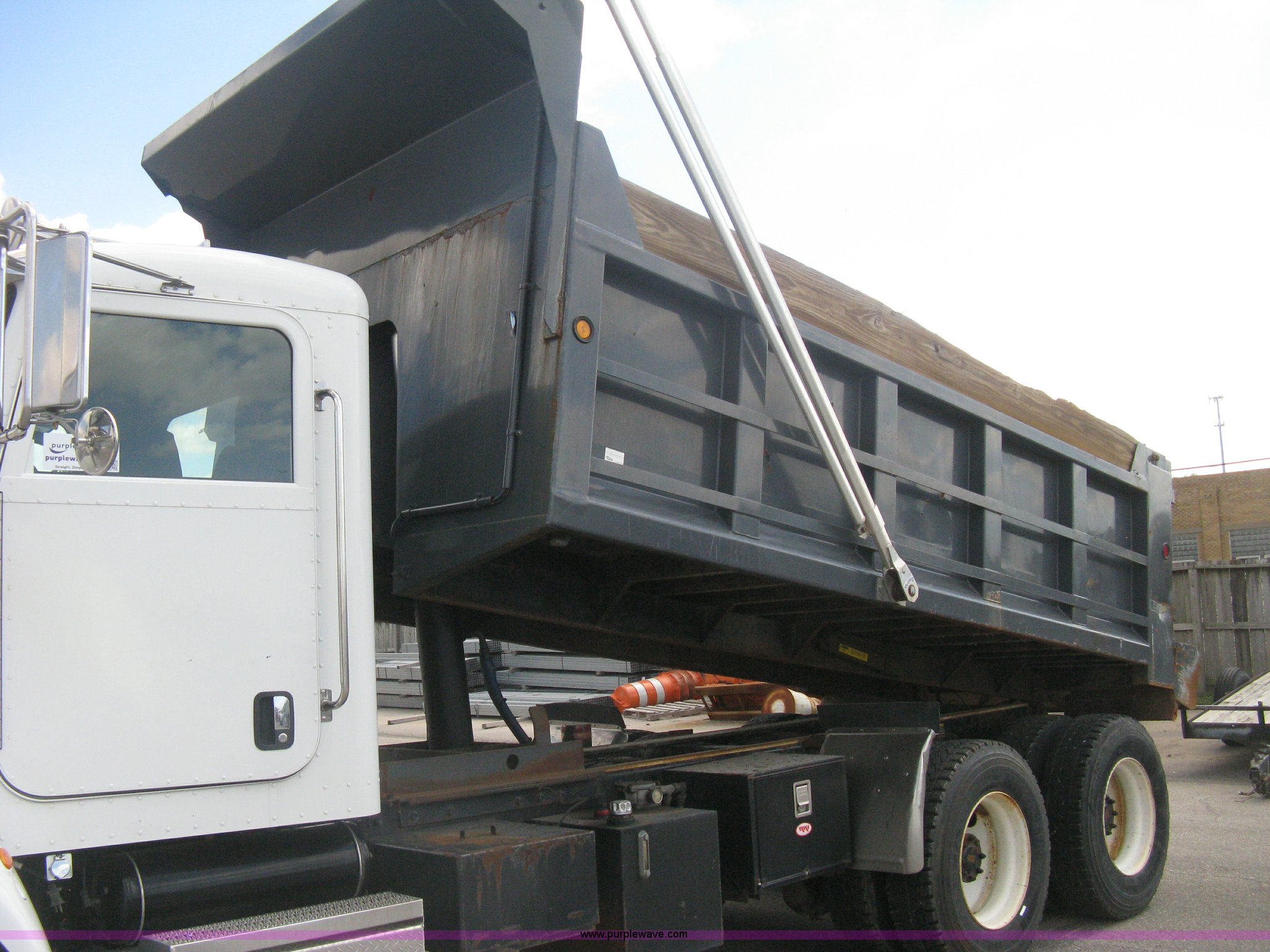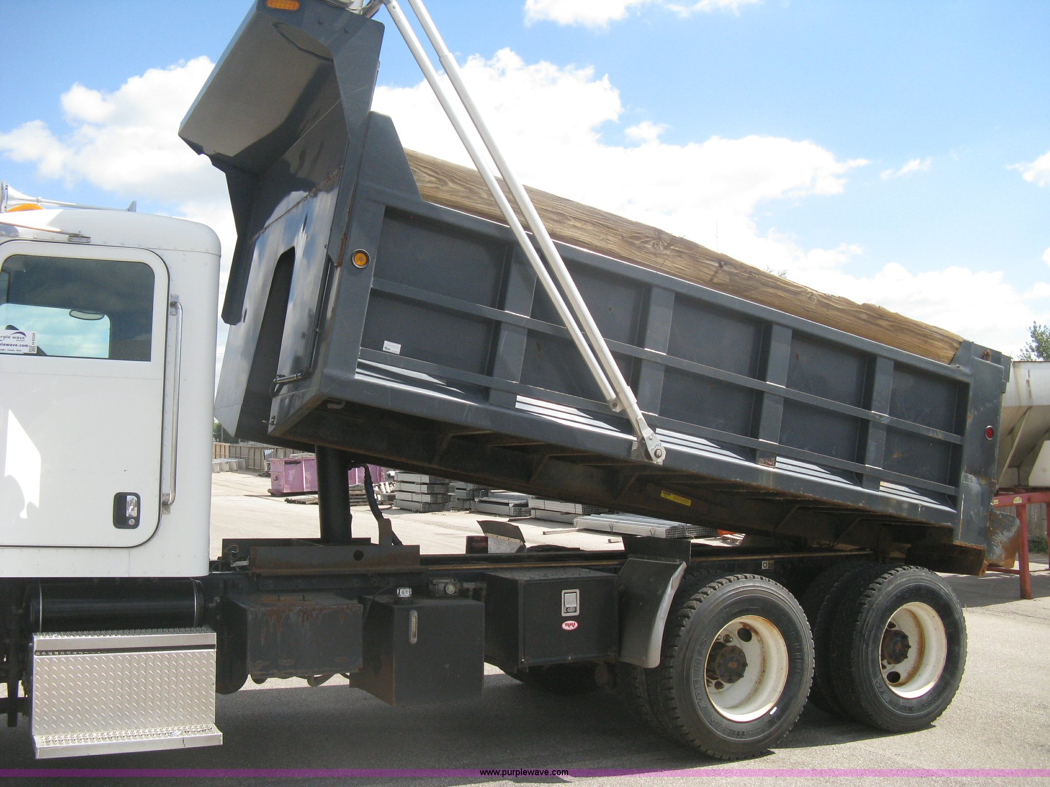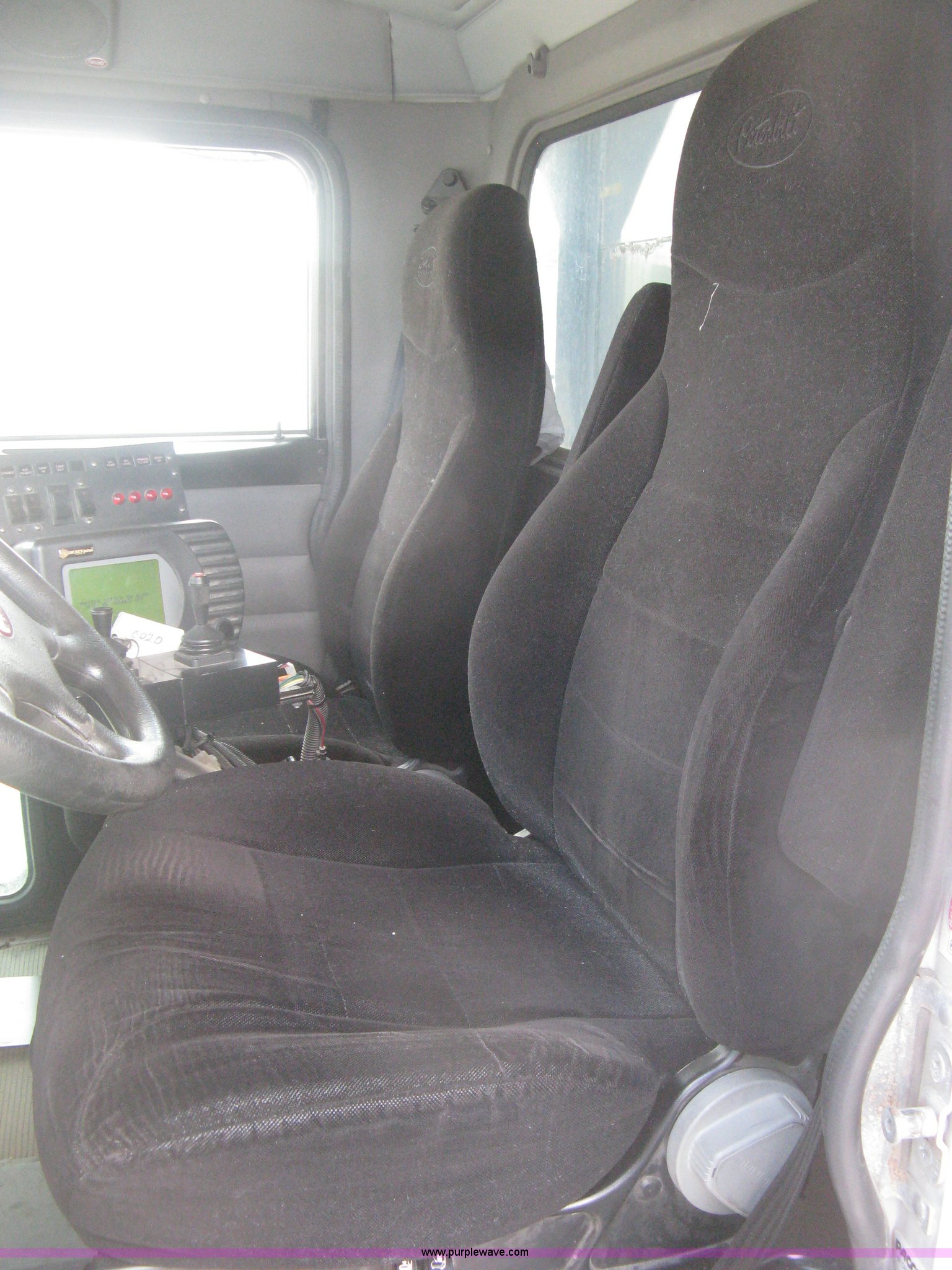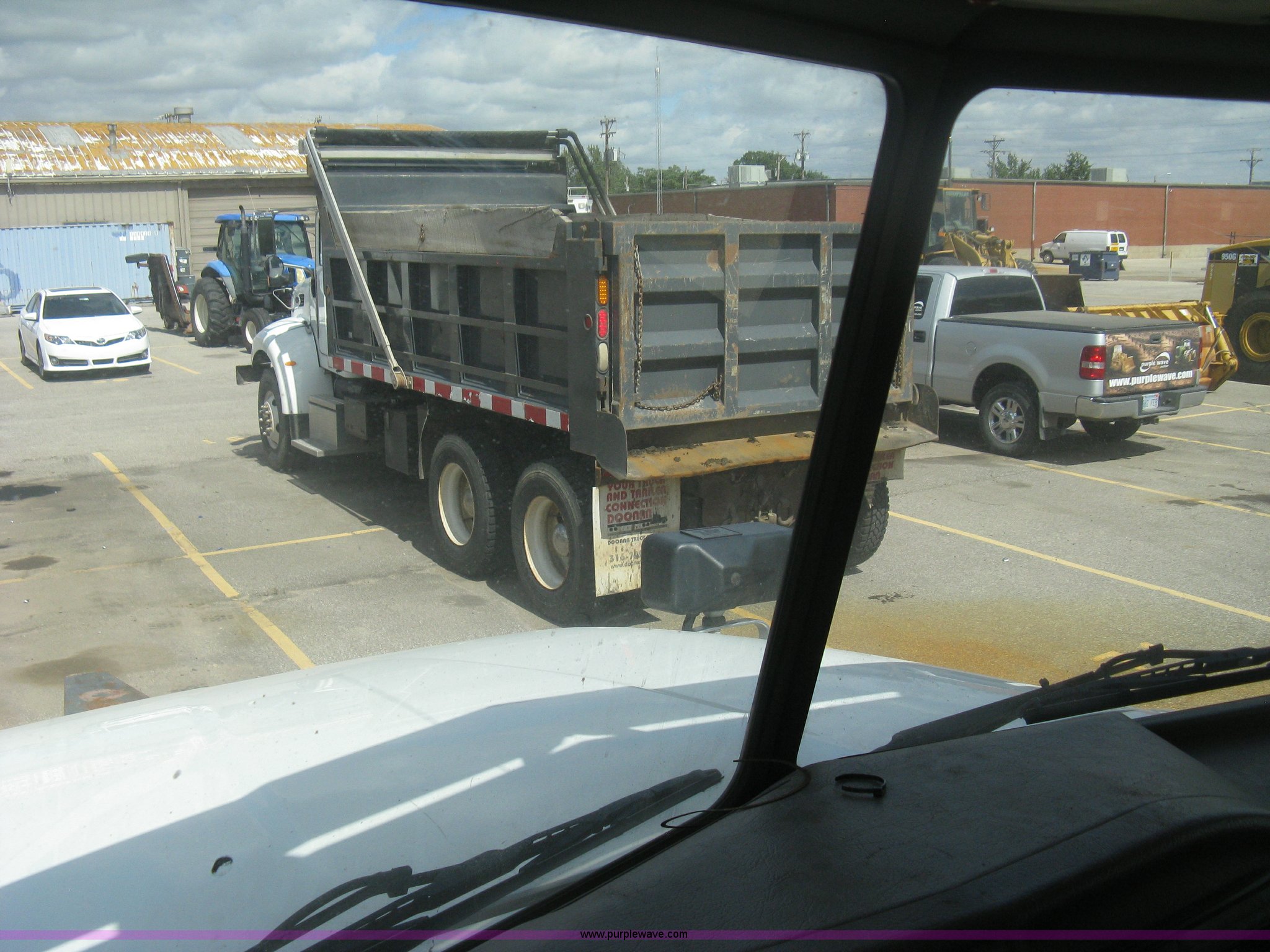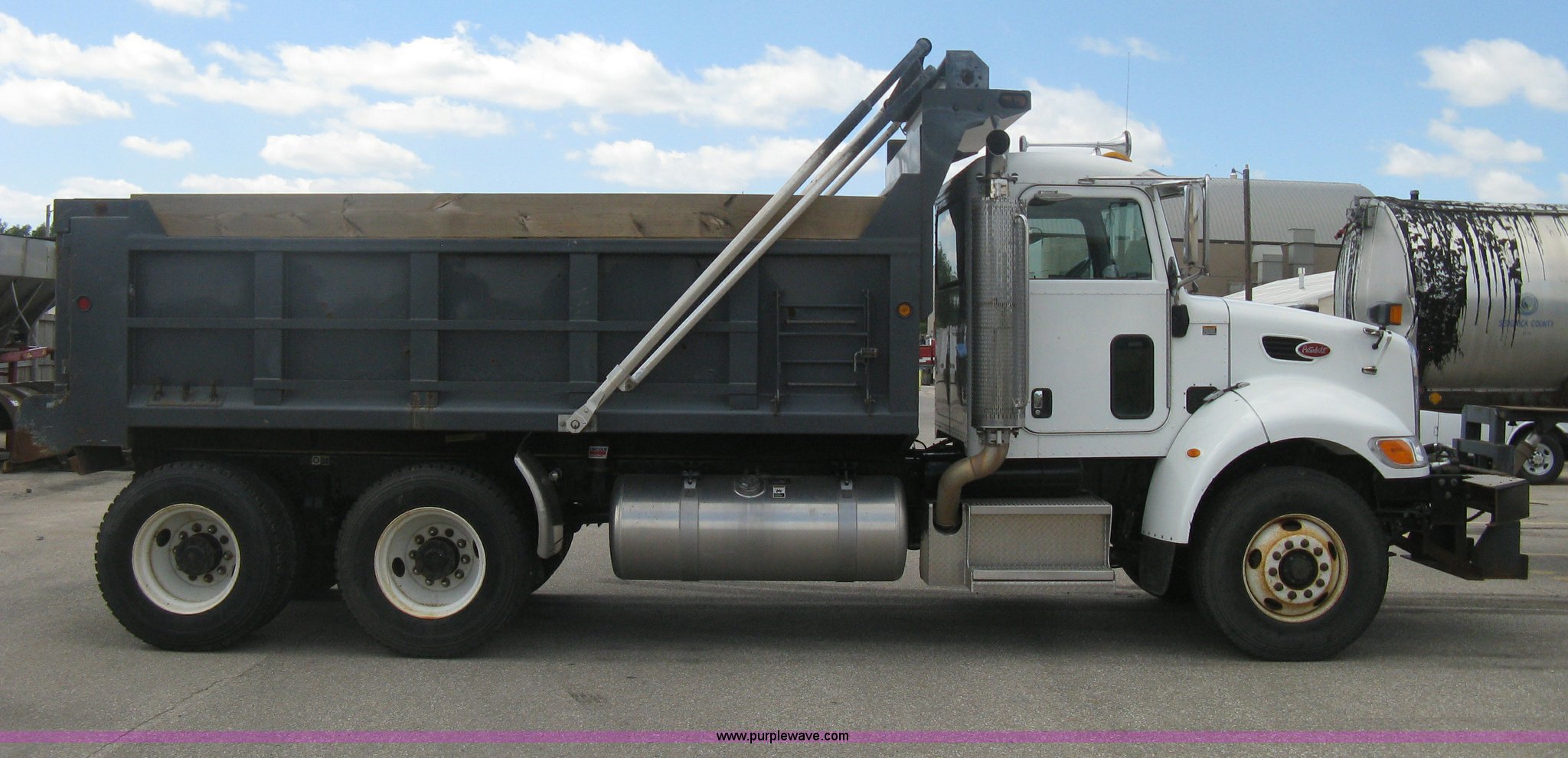 Purple Wave is selling a used Construction Dump Truck in Kansas. This item is a 2008 Peterbilt 340 dump truck with the following: 112,562 miles on odometer, 4,618 hours on meter, Cummins ITC L6 diesel engine, 330 HP, Automatic transmission, Model RTO10910B-A53, Full screw, Full locking differential, AC and heat, Tilt, Cruise, AM/FM, Telescoping steering wheel, Air suspension seat, Heated mirrors, Air ride cab, Daylight passenger window, Mabar DB153659 dump bed, 15'L x 95"W, Tip top side boards, Rollover tarp, Single ram hoist, Air operated end gate, Dickey-John control point digital monitor, Joystick plow and hoist control, Spreader control, Exterior visor, Block heater, Toolboxes, 110 gallon fuel tank, Front mount PTO, Air suspension, Air brakes, Jake brake, 5:29 gear ratio, 315/80R22.5 front tires, 11R22.5 rear tires, GVWR 58,000 lbs, FAWR 18,000 lbs, IAWR 20,000 lbs, RAWR 20,000 lbs, Paint peeling, Front bumper snow plow mounting brackets not included, Unit# 0020