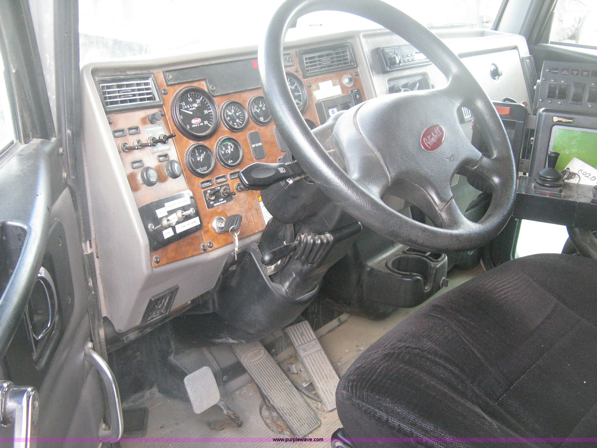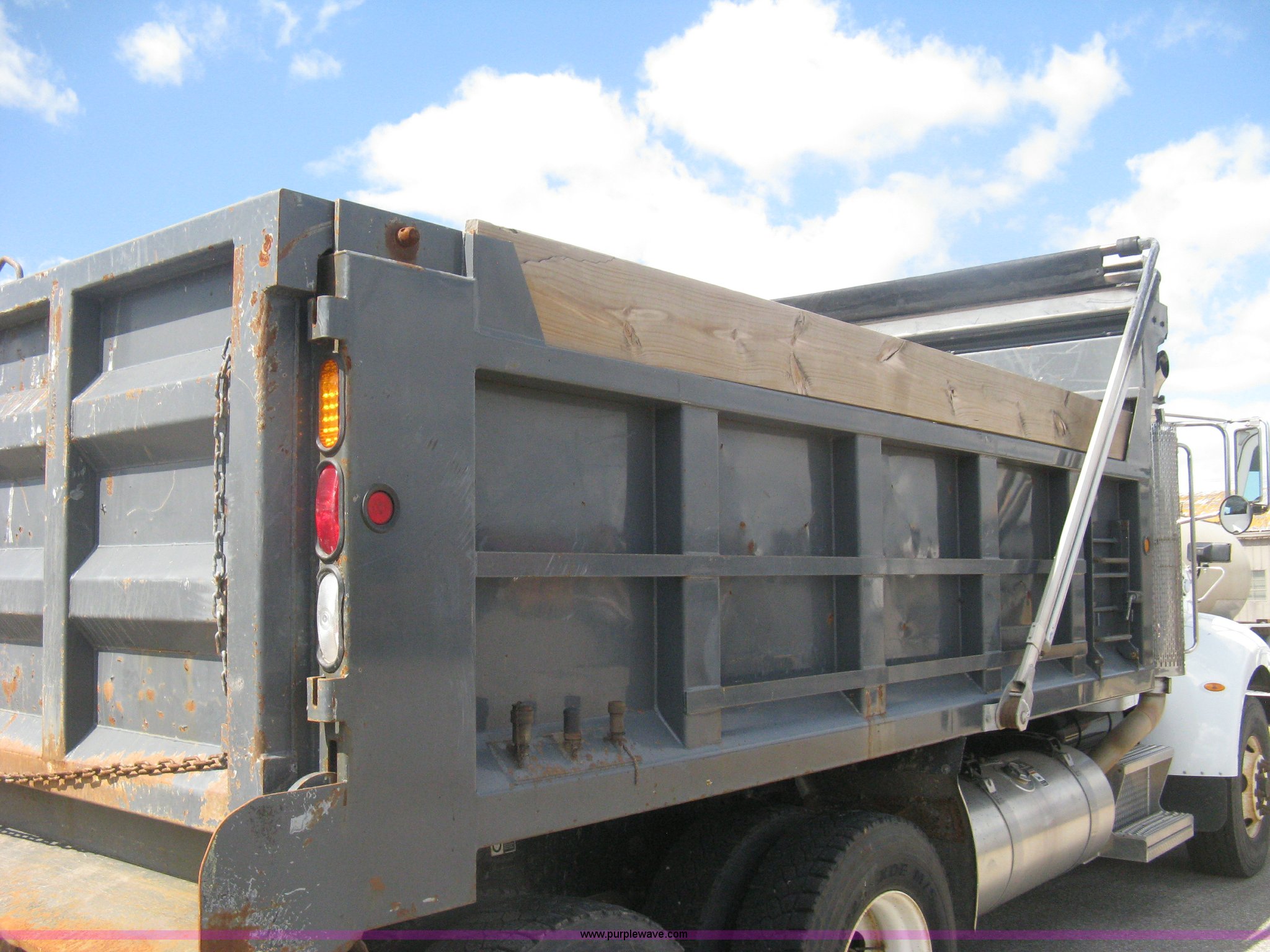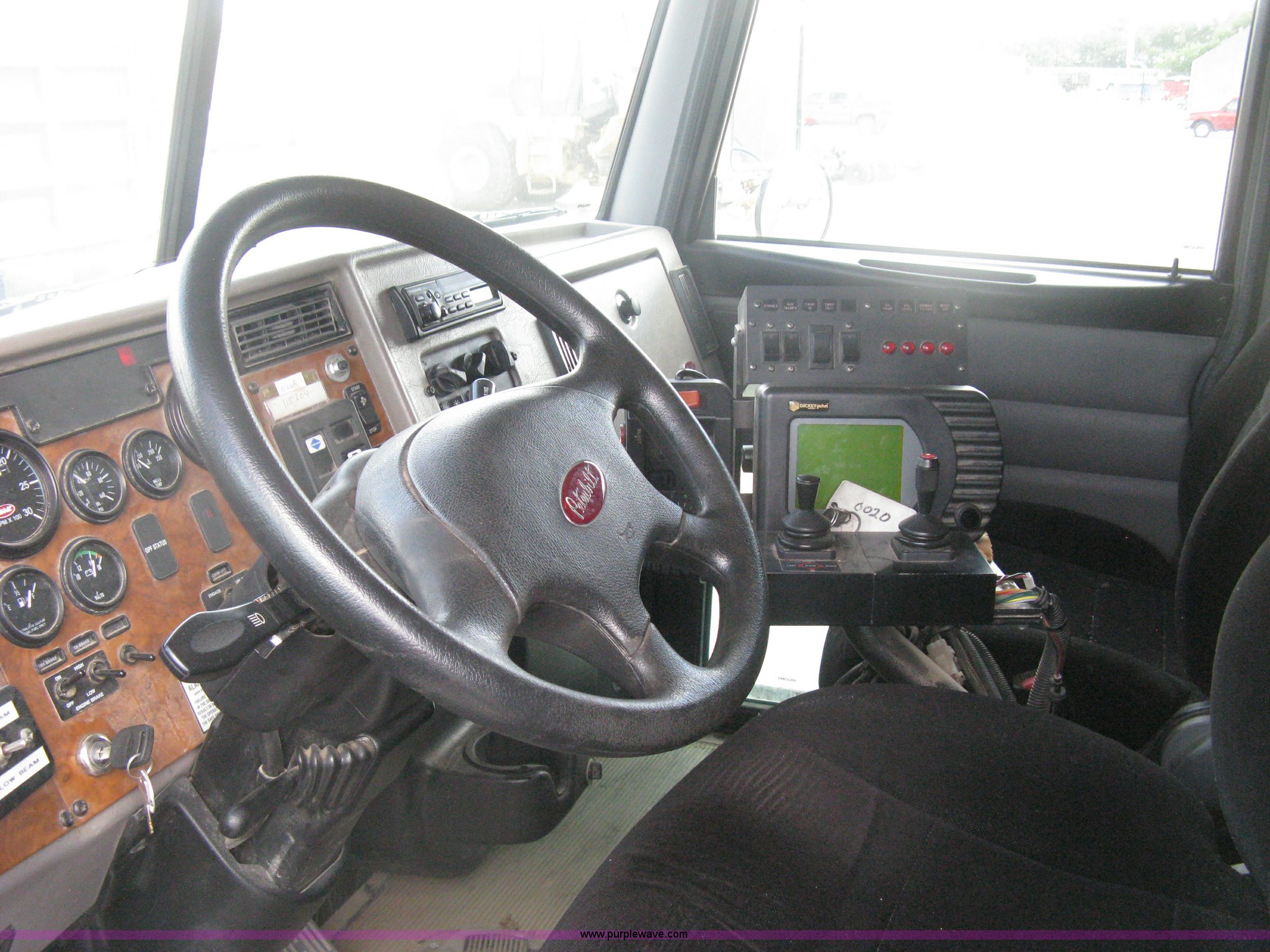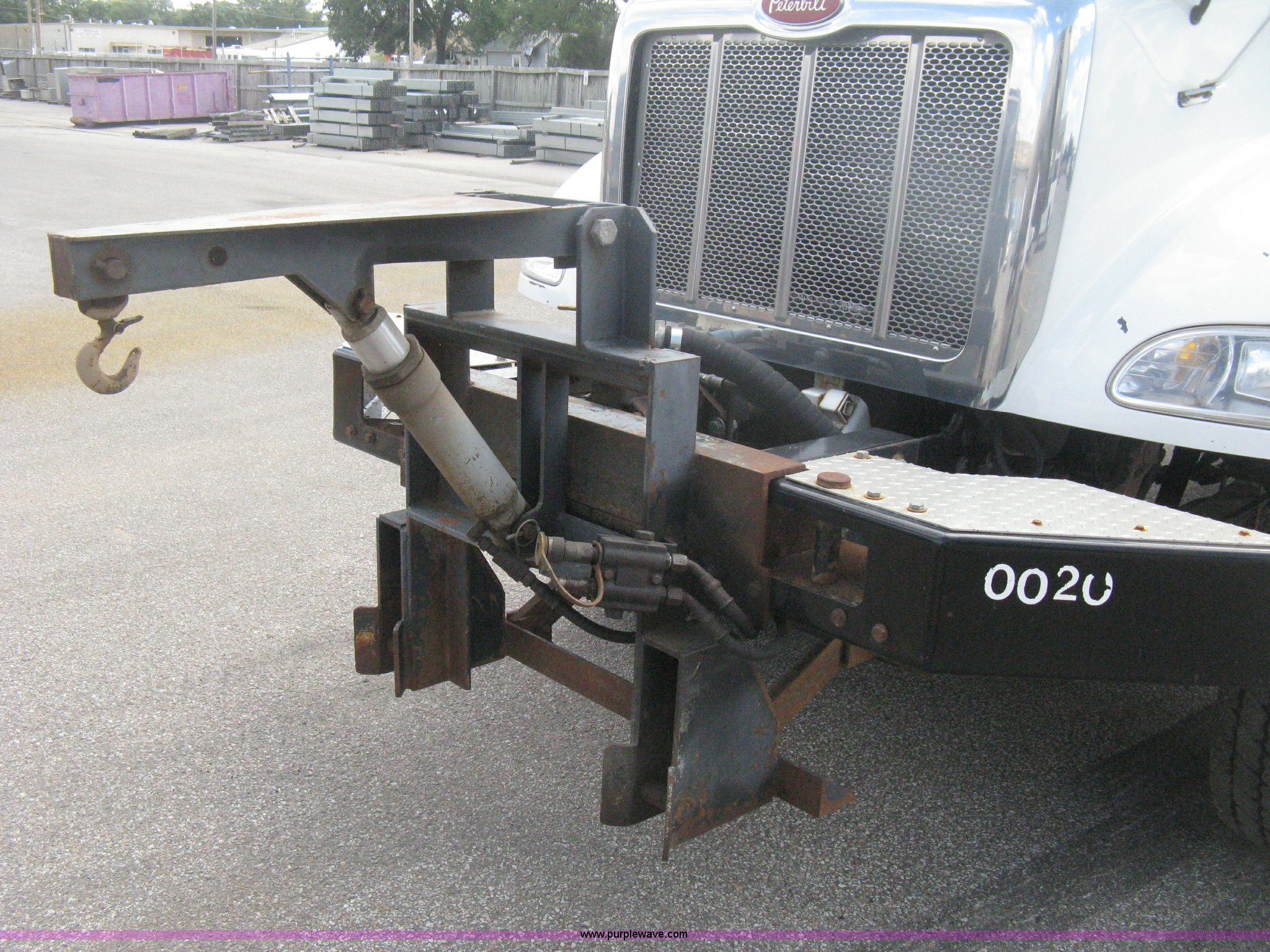 Purple Wave is selling a used Construction Dump Truck in Kansas. This item is a 2008 Peterbilt 340 dump truck with the following: 112,562 miles on odometer, 4,618 hours on meter, Cummins ITC L6 diesel engine, 330 HP, Automatic transmission, Model RTO10910B-A53, Full screw, Full locking differential, AC and heat, Tilt, Cruise, AM/FM, Telescoping steering wheel, Air suspension seat, Heated mirrors, Air ride cab, Daylight passenger window, Mabar DB153659 dump bed, 15'L x 95"W, Tip top side boards, Rollover tarp, Single ram hoist, Air operated end gate, Dickey-John control point digital monitor, Joystick plow and hoist control, Spreader control, Exterior visor, Block heater, Toolboxes, 110 gallon fuel tank, Front mount PTO, Air suspension, Air brakes, Jake brake, 5:29 gear ratio, 315/80R22.5 front tires, 11R22.5 rear tires, GVWR 58,000 lbs, FAWR 18,000 lbs, IAWR 20,000 lbs, RAWR 20,000 lbs, Paint peeling, Front bumper snow plow mounting brackets not included, Unit# 0020