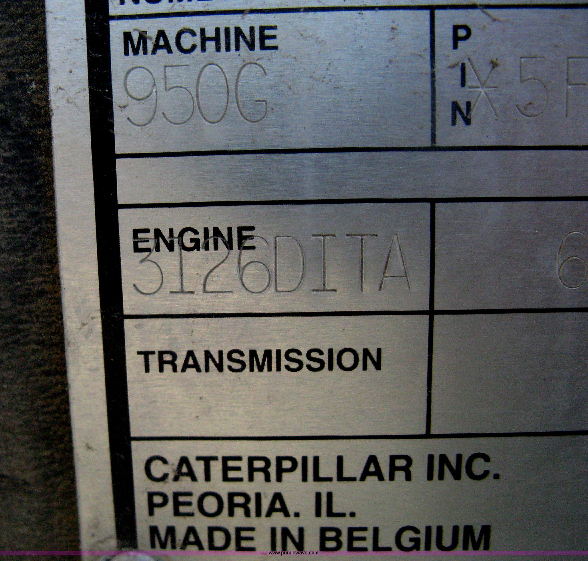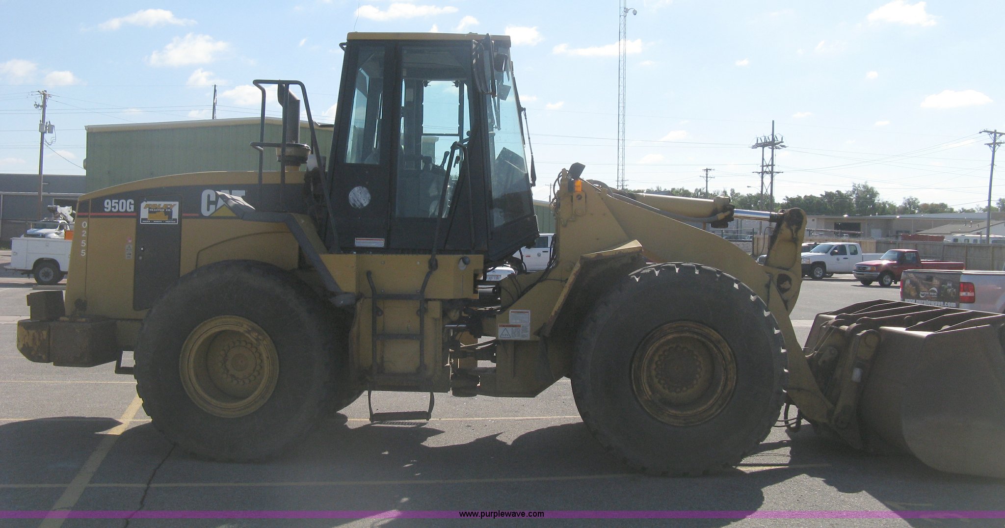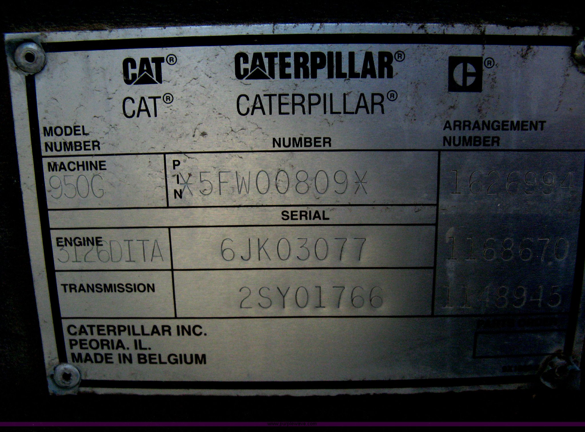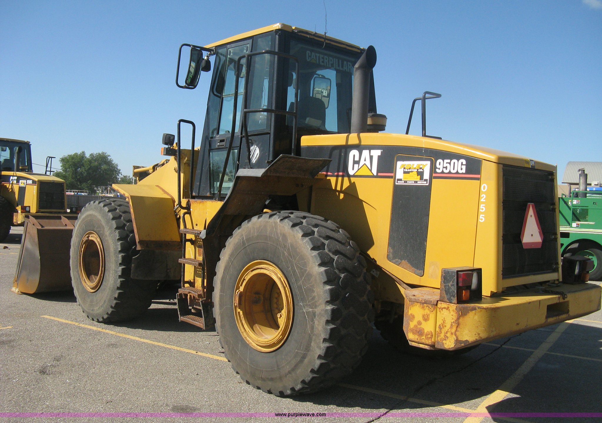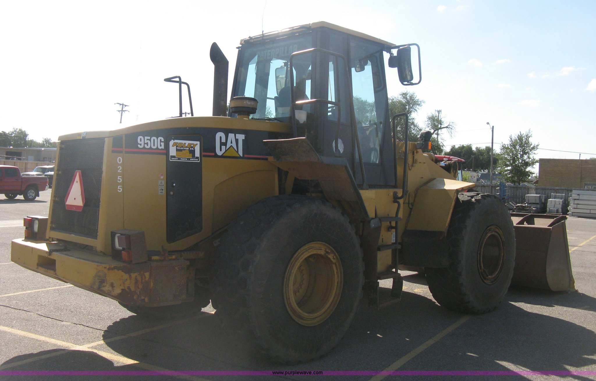 Purple Wave is selling a used Wheel Loader in Kansas. This item is a 1999 Caterpillar 950G wheel loader with the following: 7,840 hours on meter, Caterpillar six cylinder diesel engine, Model 3126DITA, Serial 6JK63077, Four speed powershift transmission, Serial 2SY01766, Enclosed cab, AC and heat, Tilt steering, Non-operational radio, Suspension seat, Joystick loader control with kick down button, Auxiliary hydraulics, Caterpillar quick coupler, Serial 3WL48639, 114"W bucket, Bolt-on edge, Automatic greasing unit, Michelin 23.5R25 tires, 39,200 lbs. base operating weight, Rust, Power lift engine hood inoperable, One owner, Serial 5FW00809, Unit# 0255