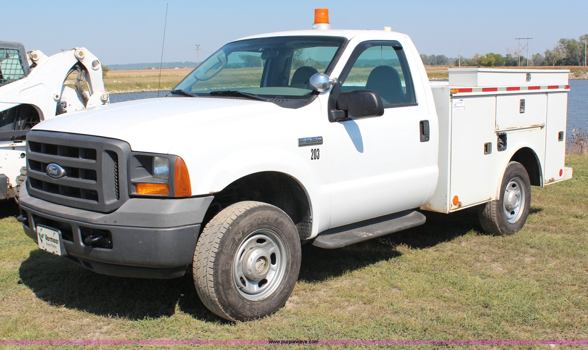 Purple Wave is selling a used Service Truck in Kansas. This item is a 2005 Ford F250 Super Duty XL service truck with the following: 158,837 miles on odometer, 5.4L V8 SOHC 16V gas engine, Automatic transmission, Four wheel drive, AC and heat, Tilt, Cruise, AM/FM, Manual windows and locks, Vinyl interior, 8'L utility bed, Strobe light, Spotlight, Receiver hitch, 245/75R17 tires