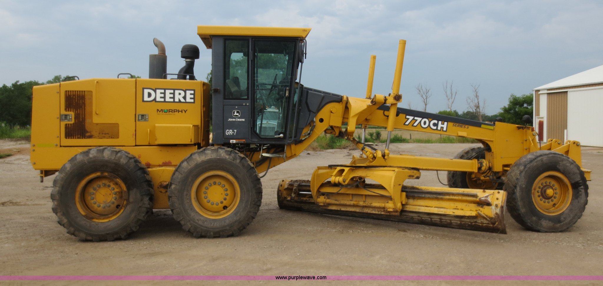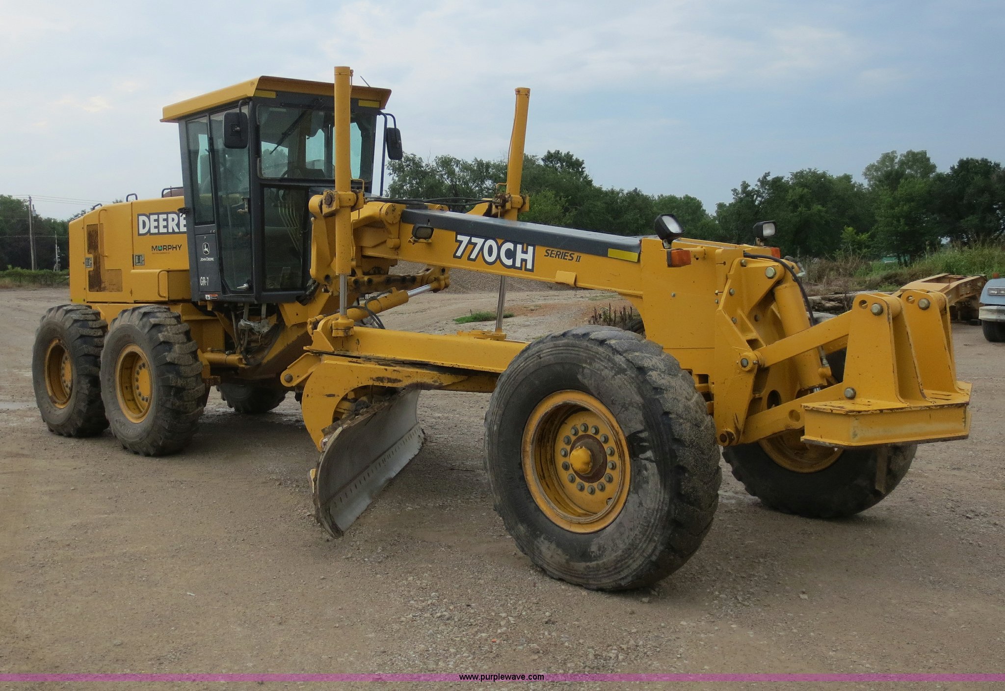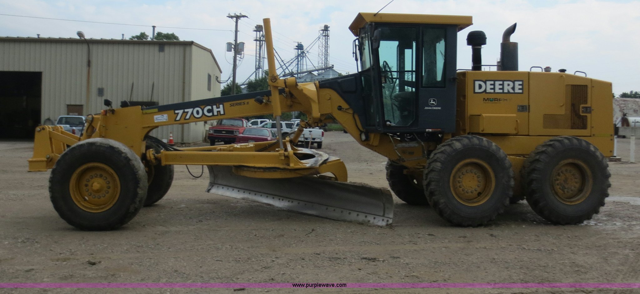 Purple Wave is selling a used Motor Grader in Kansas. This item is a 2002 John Deere 770CH Series II motor grader with the following: 11,650 hours on meter, John Deere six cylinder diesel engine, Serial RG6081H153728, Powershift transmission, 8F-8R gears, Differential lock, AC and heat, AM/FM radio, Air ride seat, EROPS, Front work lights, Articulated frame, 14' moldboard with tip control and side shift, Front scarifier, 14.00R24 tires, Part and operators manuals included, Parking brake does not work properly, Engine has minor blow by, Serial DW770CH584156