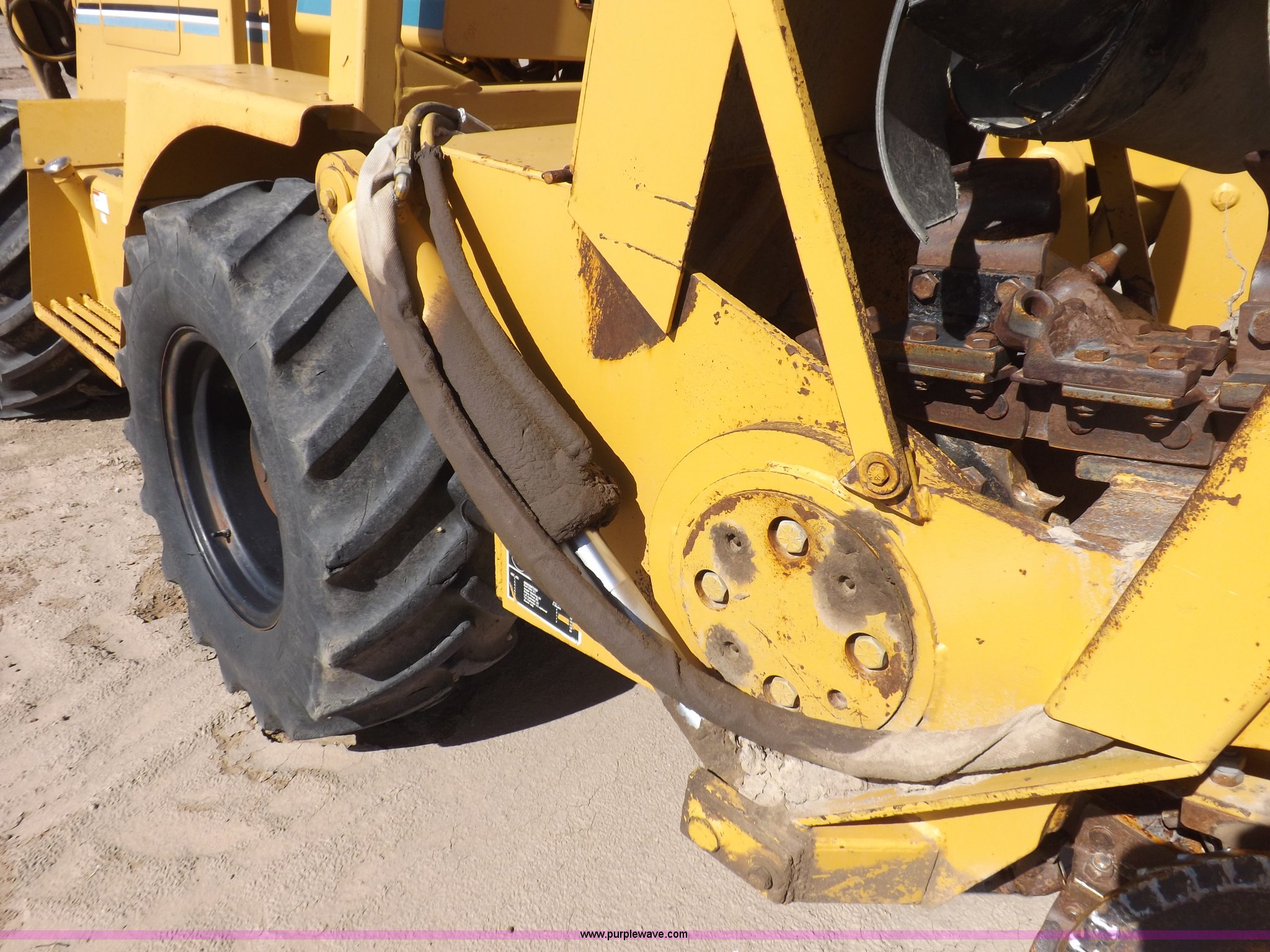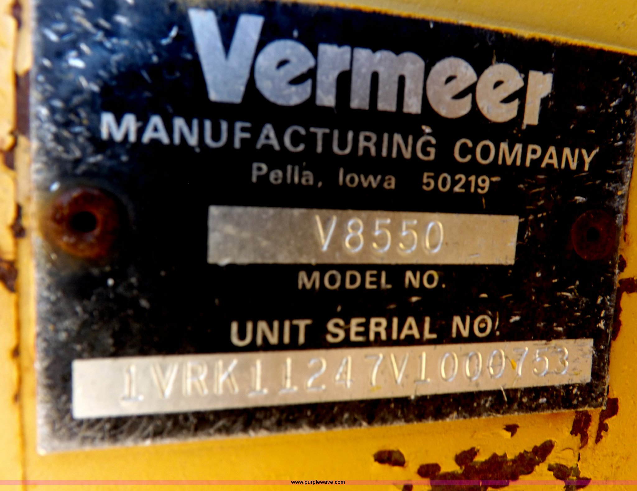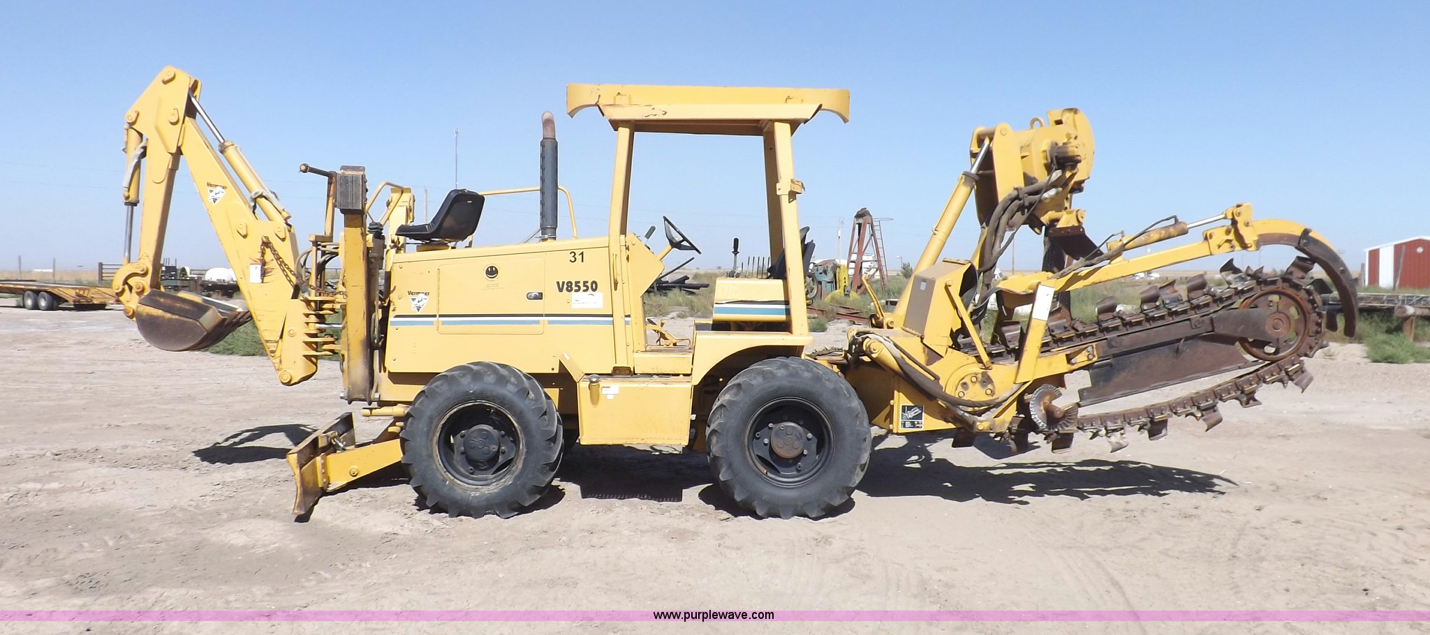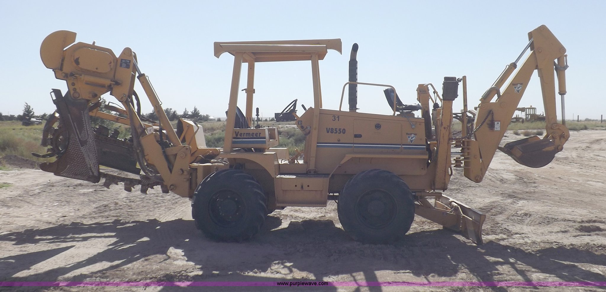 Purple Wave is selling a used Trencher or Rock Saw in Kansas. This item is a 1997 Vermeer V8550 trencher with the following: 1,524 hours on meter, Four cylinder turbo diesel engine, V9300 backhoe attachment, Two stick controls, 18" bucket, Serial 1VRG10093T1000633, V8000 six-way back fill blade, 80"W, Weld-on edge, Serial VP503057V1001482, 5' x 8" trencher, Cupped and carbide teeth, Hydraulic drive, Hydraulic crumb shoe, Spoil auger, Plow shank, 3' to shoe, Overhead product feed shoe, Trace wire roll carrier, 38 x 8.00-20 tires, Serial 1VRK11247V1000753