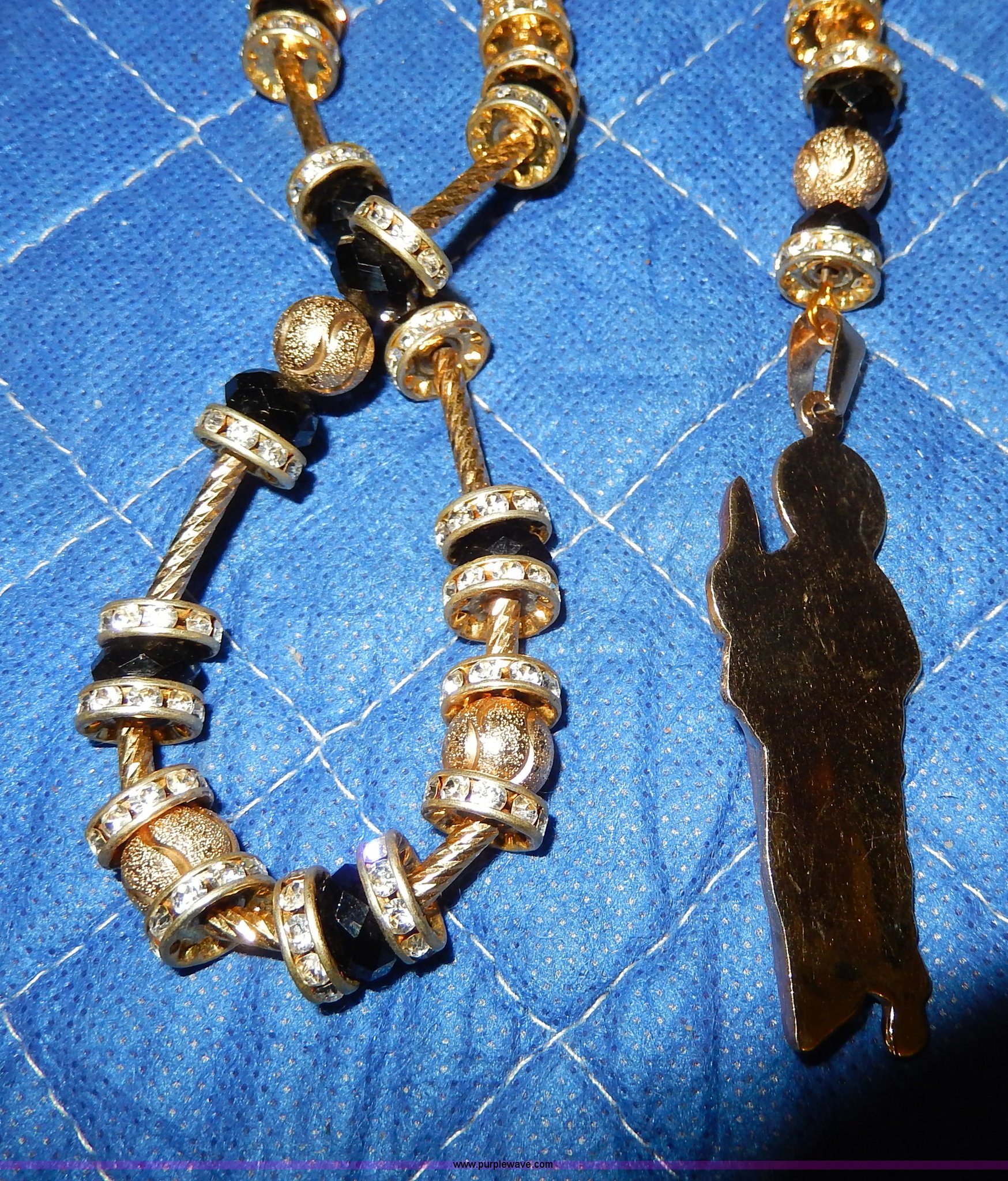 Purple Wave is selling a used Jewelery in Kansas. This item is a Assorted jewelry with the following: (2) sets of earrings with stones, 4" bracelet/hair fob with stones, Religious pendant with stones, 17" chain