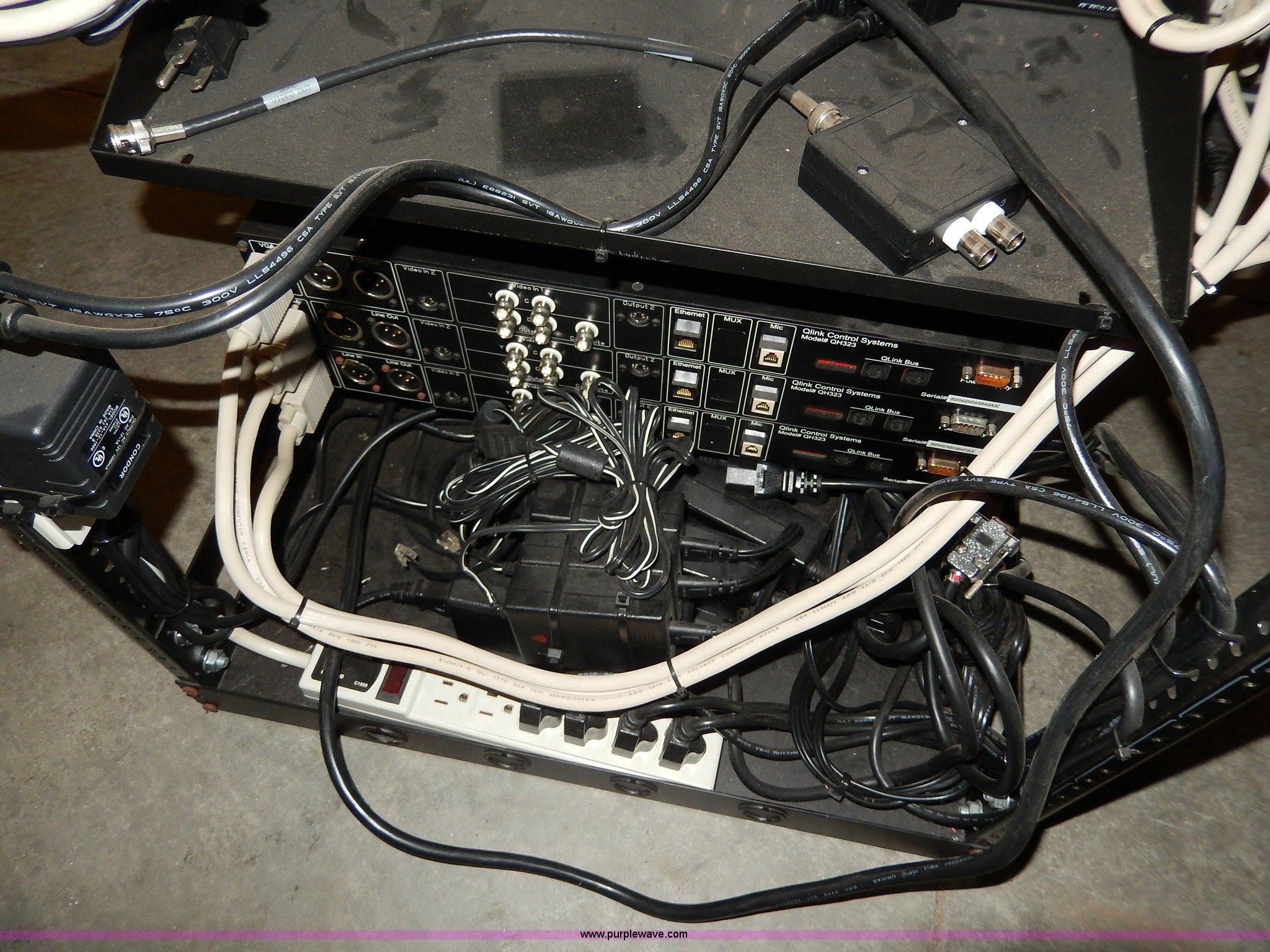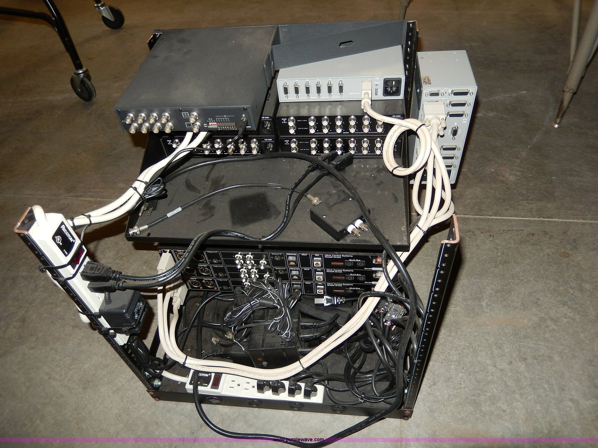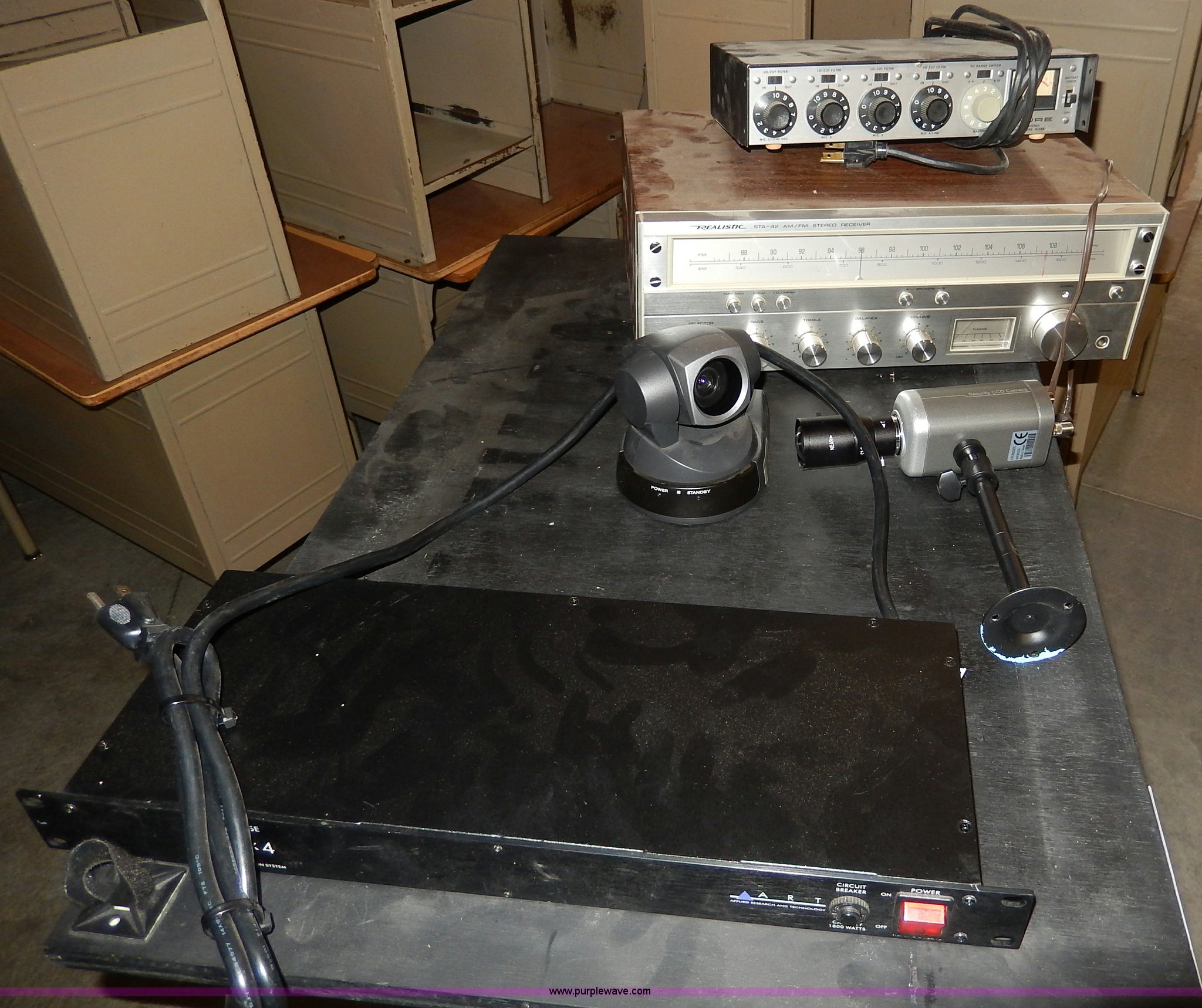 Purple Wave is selling a used Electronics in Kansas. This item is a Assorted electronics with the following: Speakers, Remotes, Cables, Stereo receiver, Microphone mixer, Security cameras, Television cart