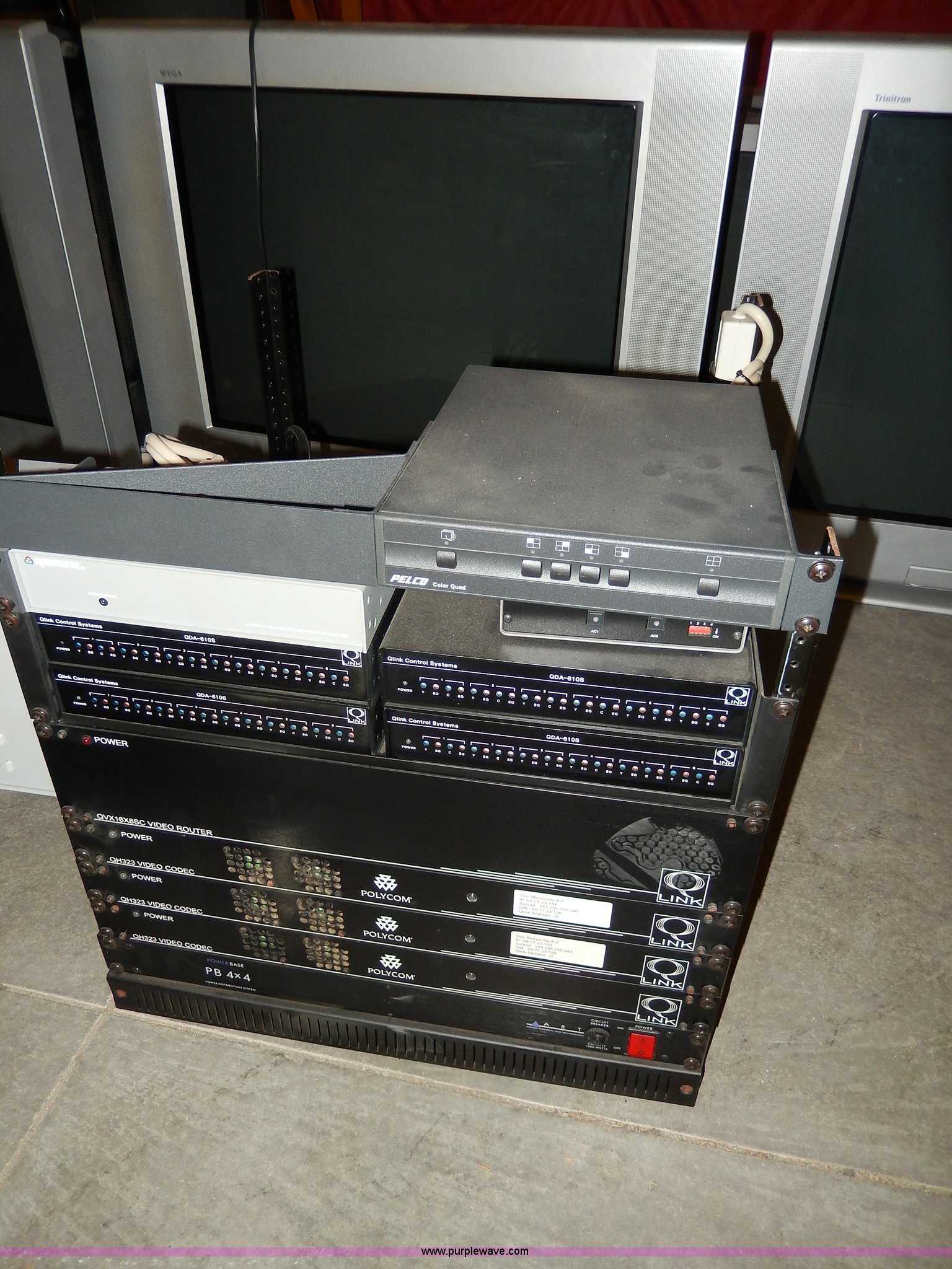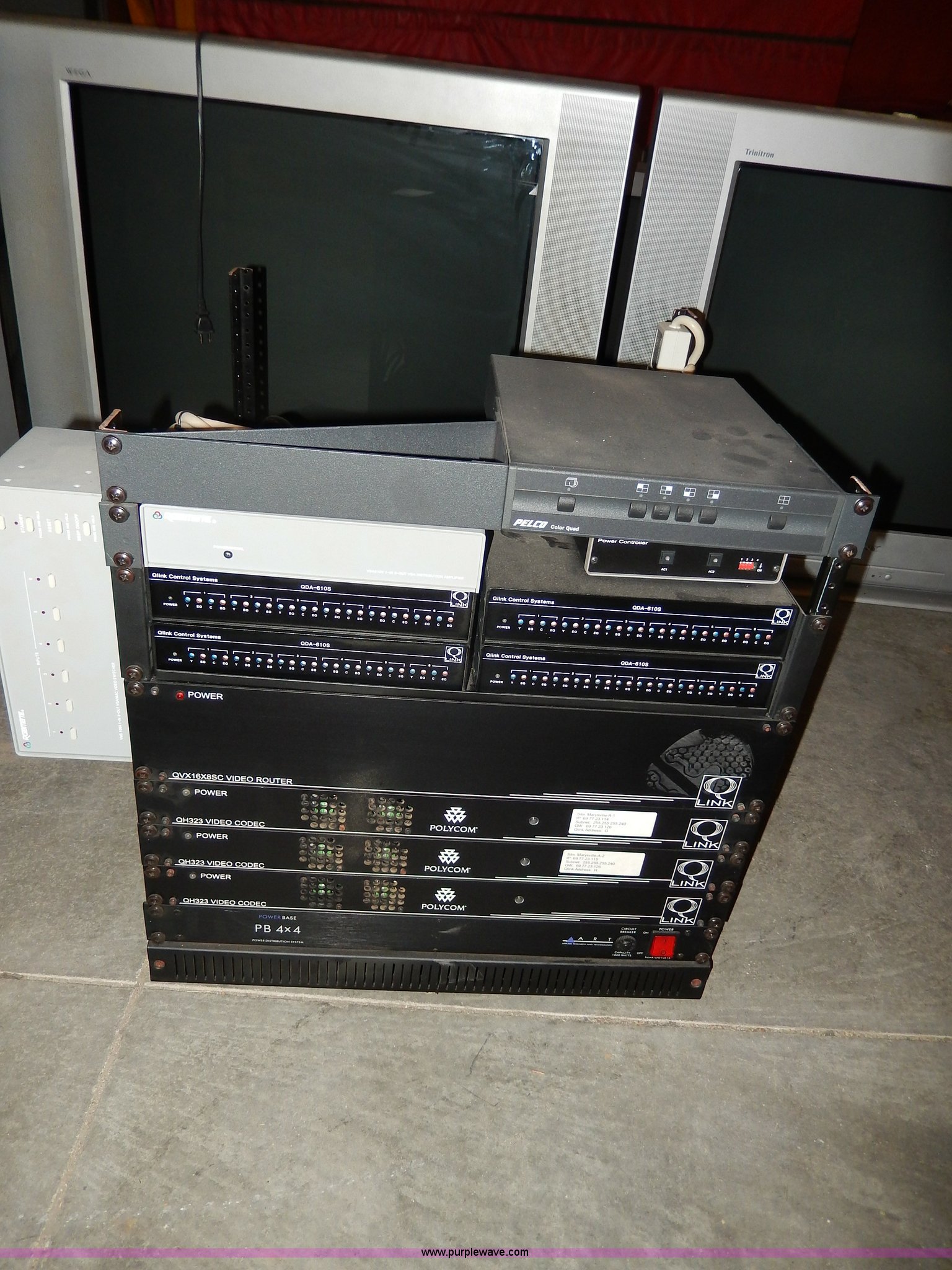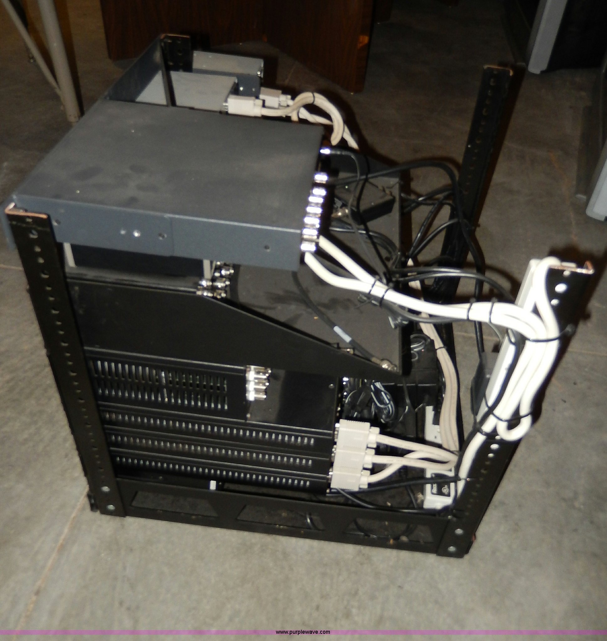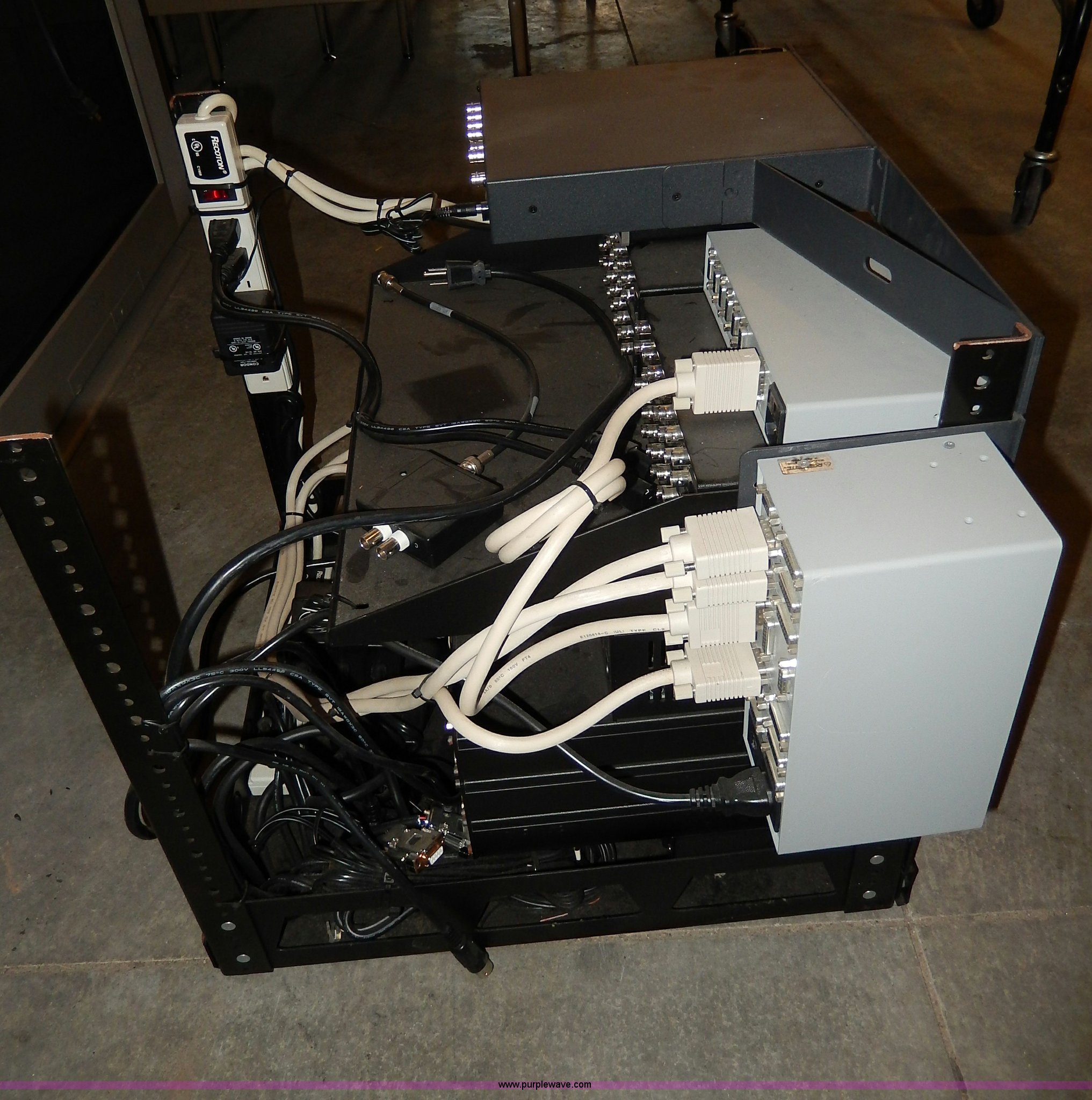 Purple Wave is selling a used Electronics in Kansas. This item is a Assorted electronics with the following: Speakers, Remotes, Cables, Stereo receiver, Microphone mixer, Security cameras, Television cart