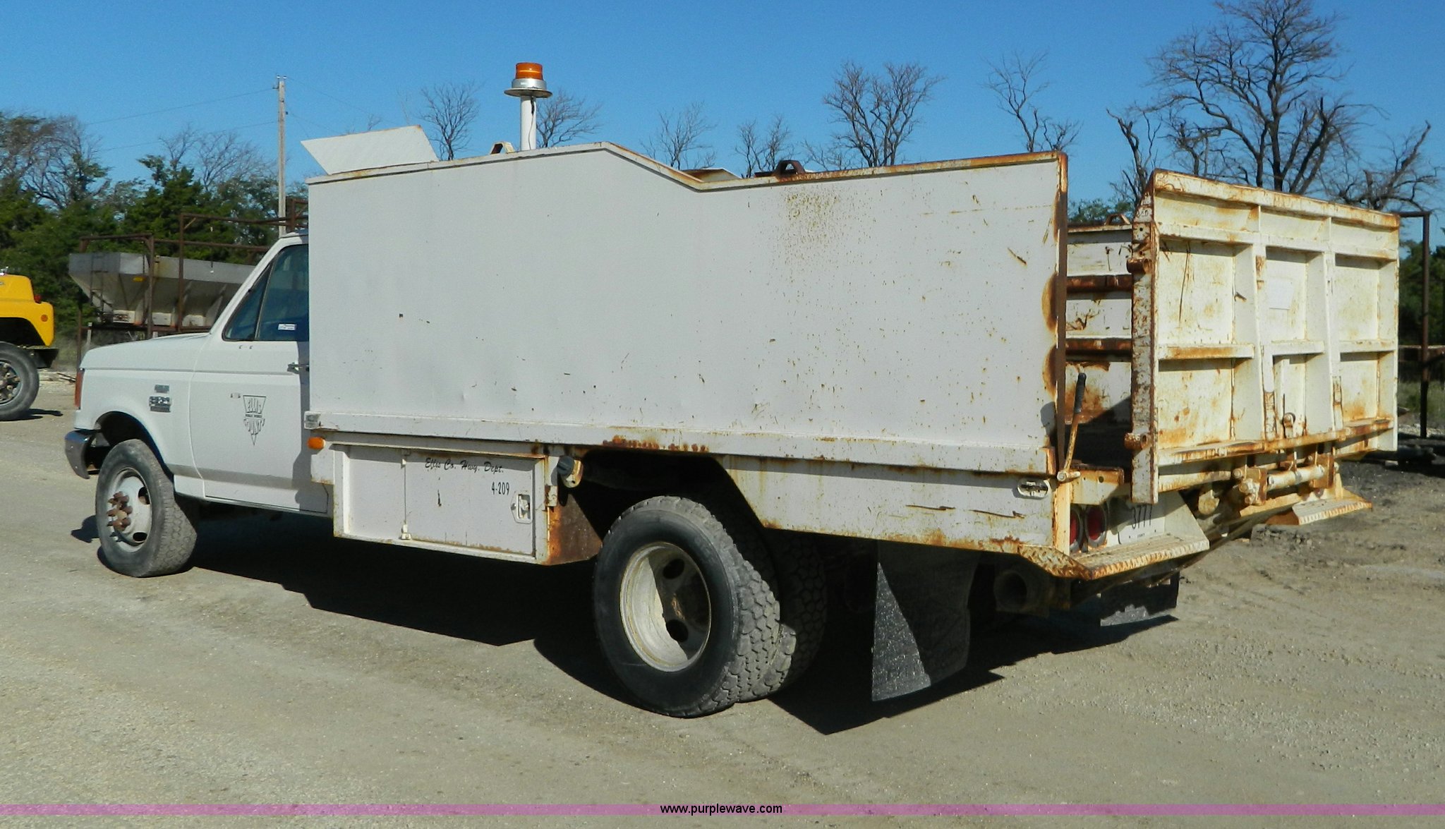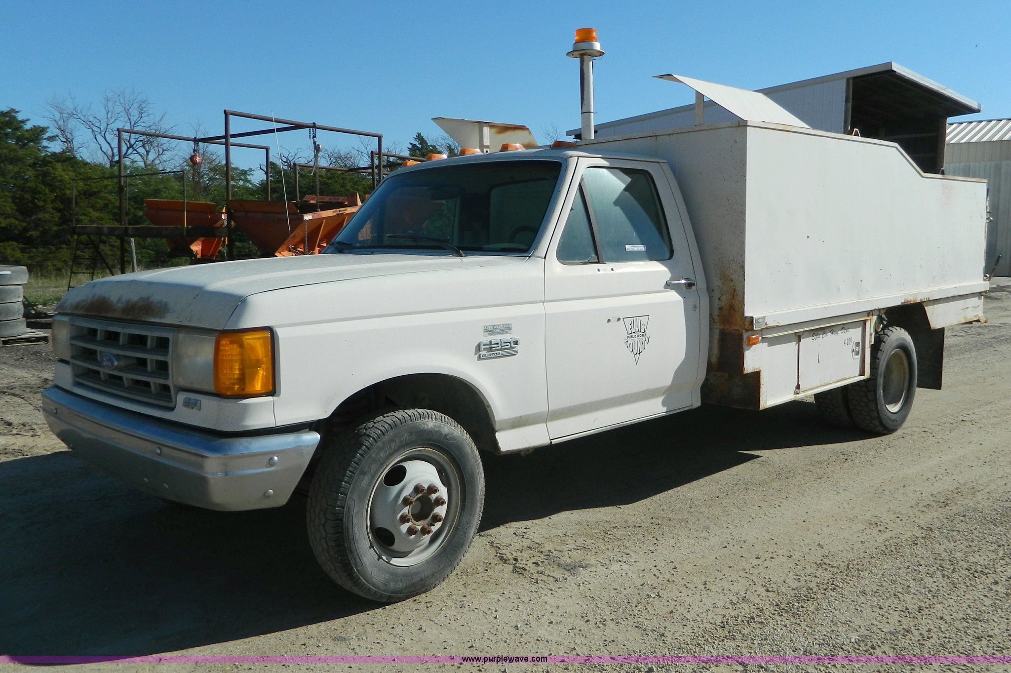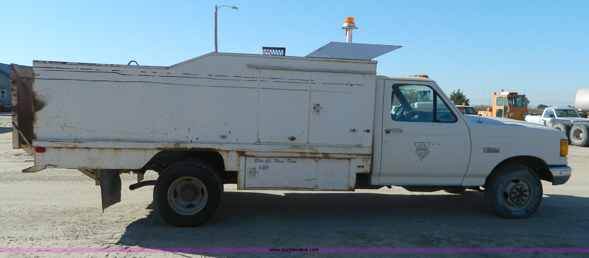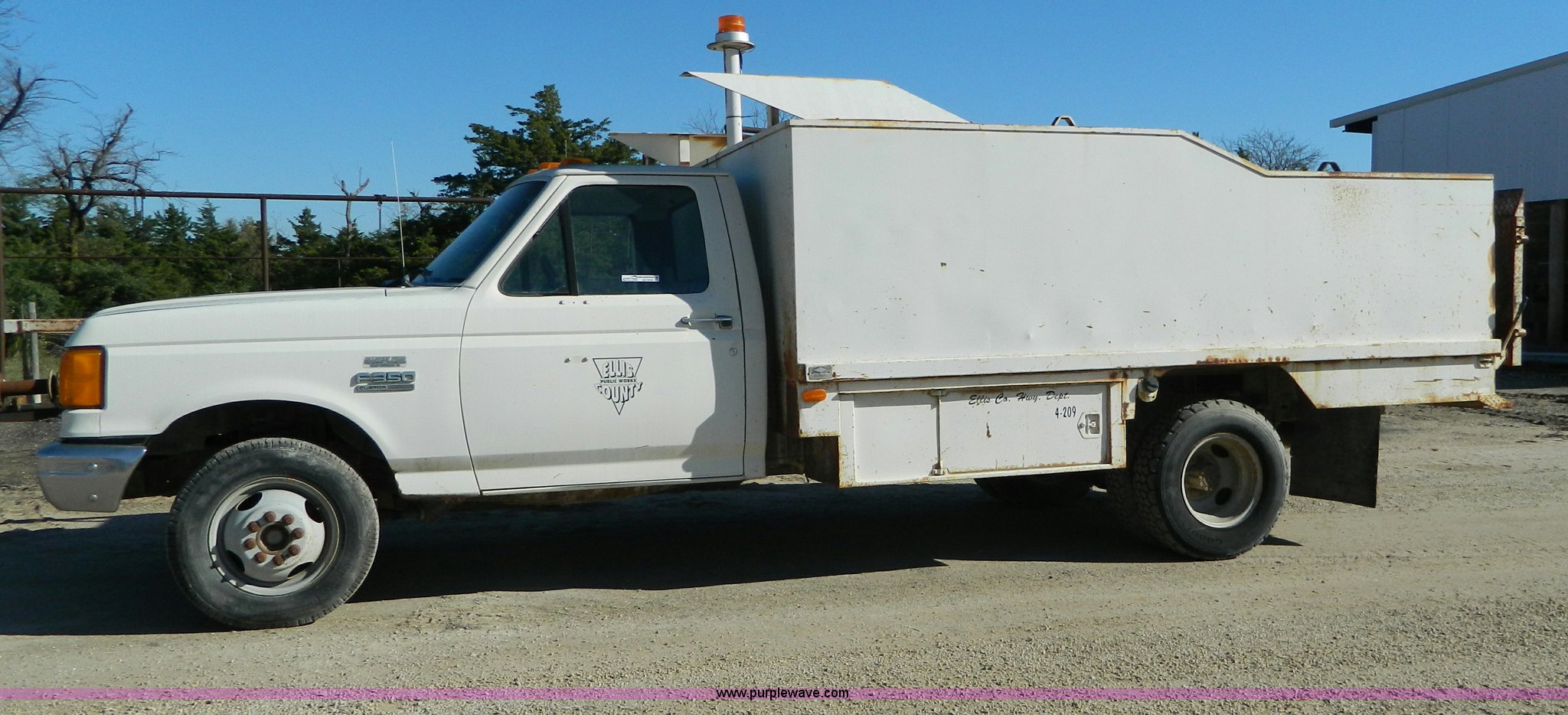 1990 Ford F350 sign truck. 225,676 miles on odometer, 5.8L V8 OHV 16V gas engine, Five speed manual transmission, AC and heat, Manual windows and locks, Tommylift end gate, LT225/75R16 front tires, LT215/85R16 rear tires, GVWR 10,000 lbs. 1FDJF37H6LKA34724. Ellis County Public Works. 1195 280th Avenue. Hays, KS 67601