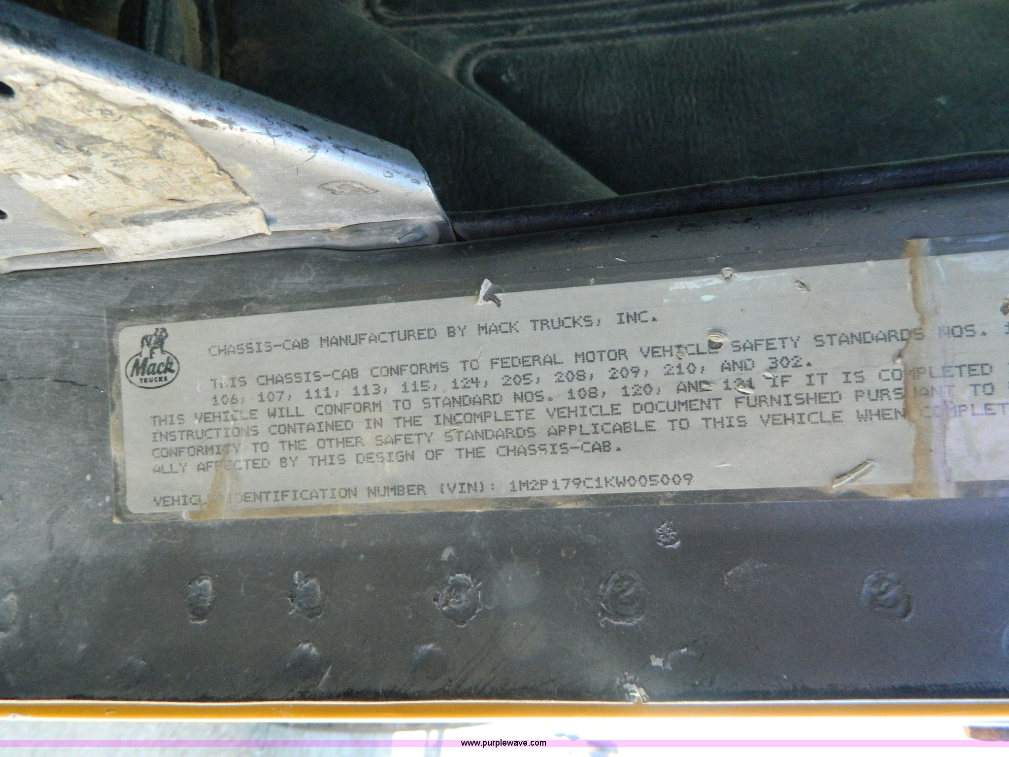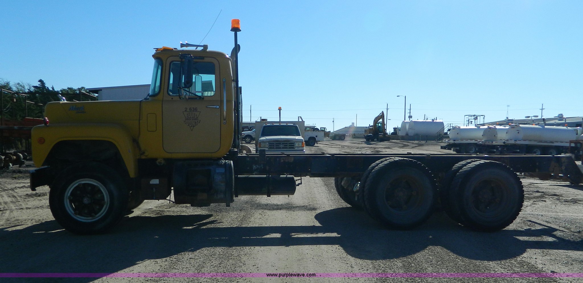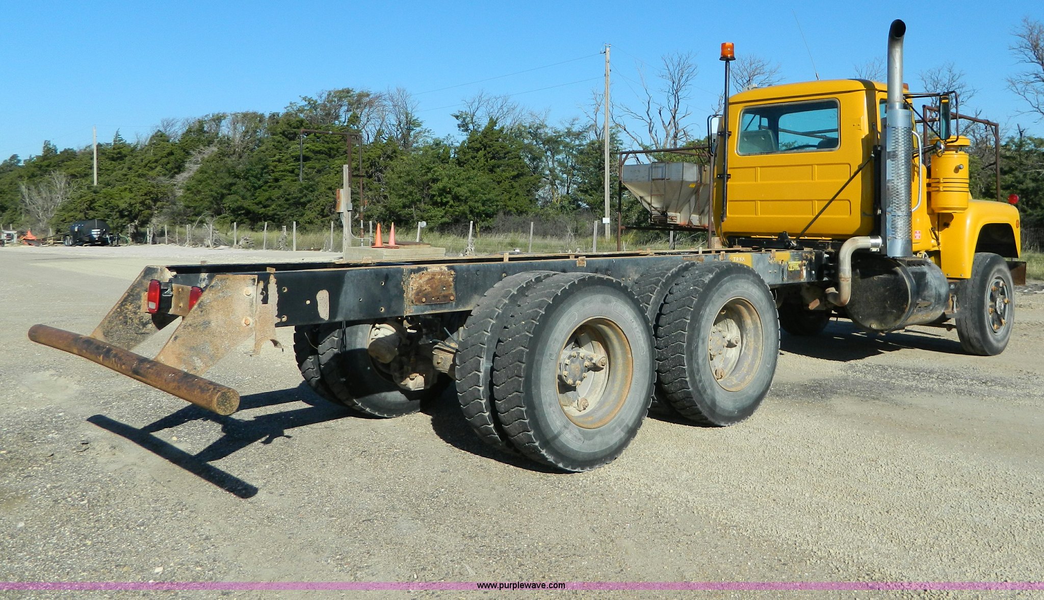 Purple Wave is selling a used Truck Chassis in Kansas. This item is a 1989 Mack RD690S truck cab and chassis with the following: 409,500 miles on odometer, Mack E6 11.0L L6 diesel engine, 275 HP, Five speed manual transmission, Heat, 59 gallon fuel tank, Double frame, Power steering, Spring suspension, Dayton wheels, 11R22.5 tires