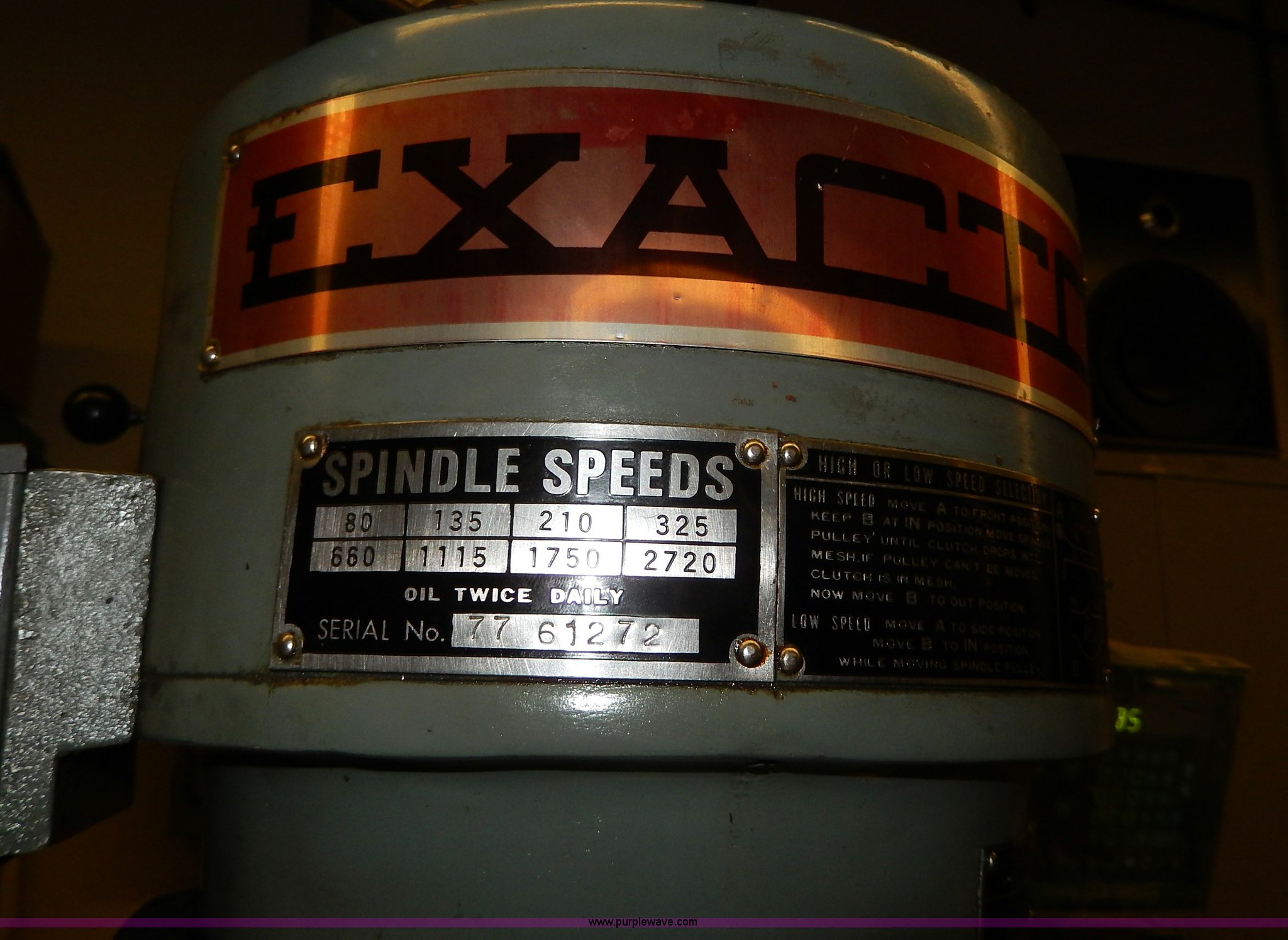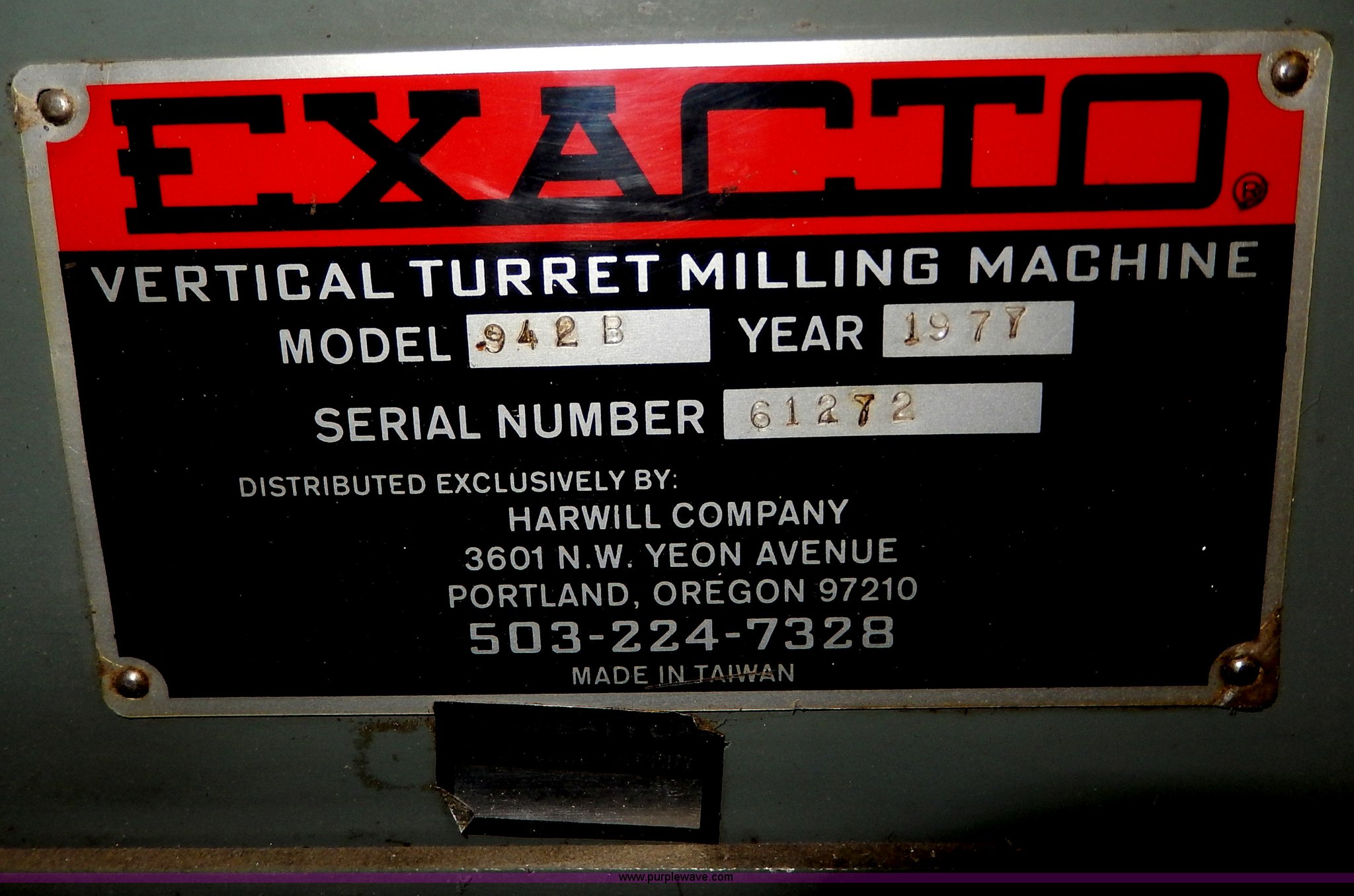 1977 Exacto 942B vertical turret milling machine has sold in Manhattan, Kansas for $3630. Item AP9993 sold on November 5th, 2013.