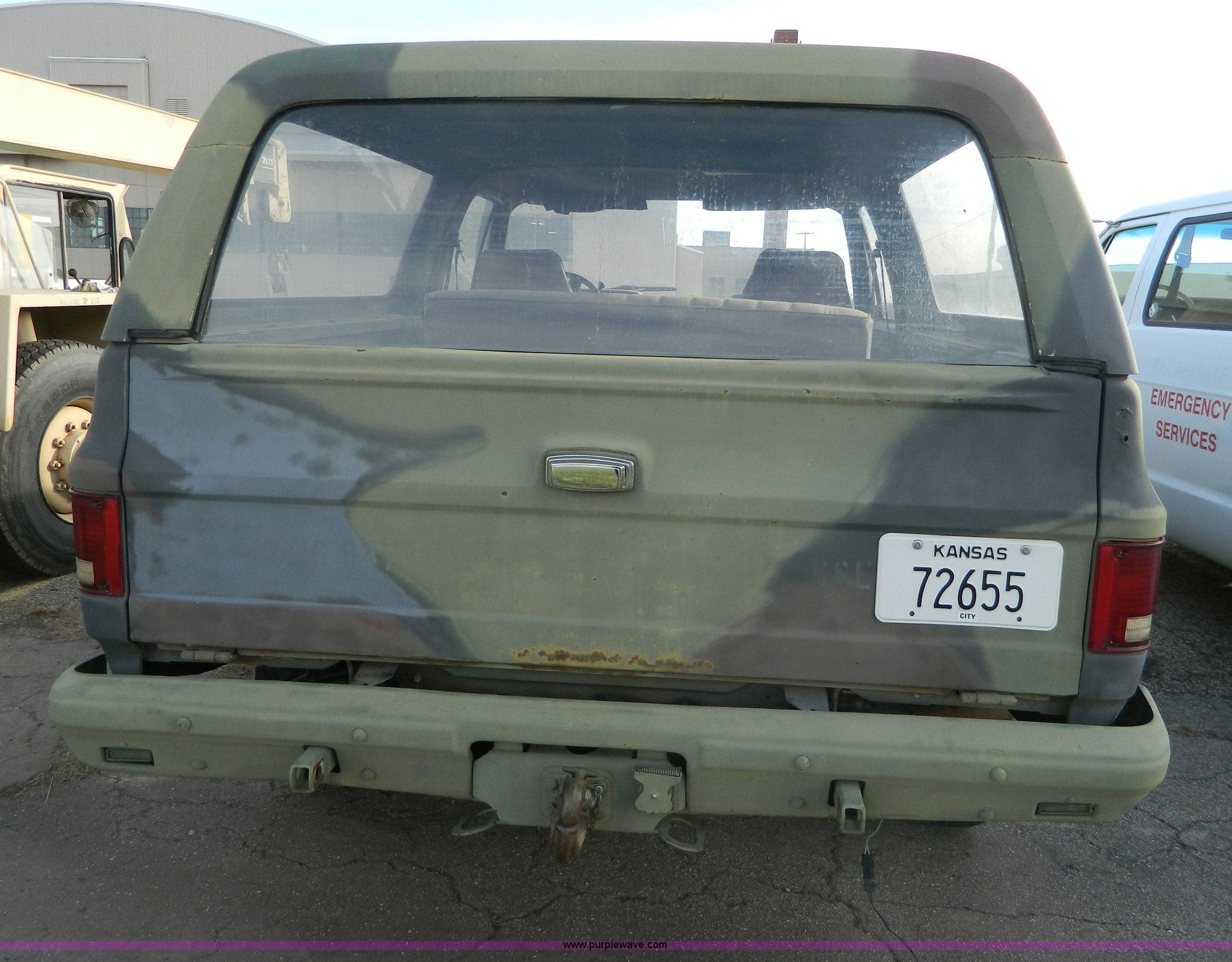Purple Wave is selling a used Passenger Vehicle in Kansas. This item is a 1985 Chevrolet D10 Military Blazer SUV with the following: 25,994 miles on odometer, 6.2L V8 OHV diesel engine, Automatic transmission, Four wheel drive, Heat, Manual windows and locks, Vinyl interior, 31x10.5R15 tires, Rust, Cosmetic damage