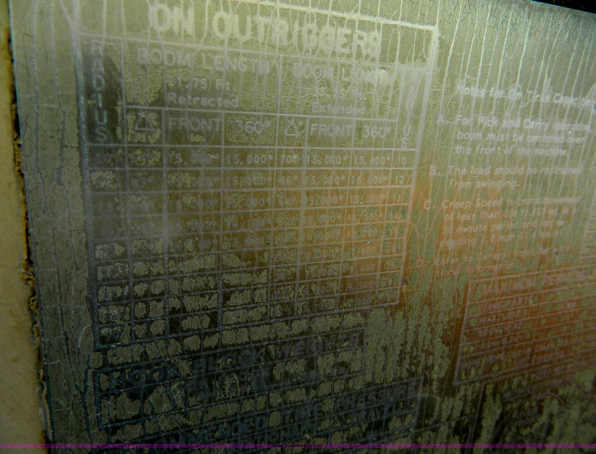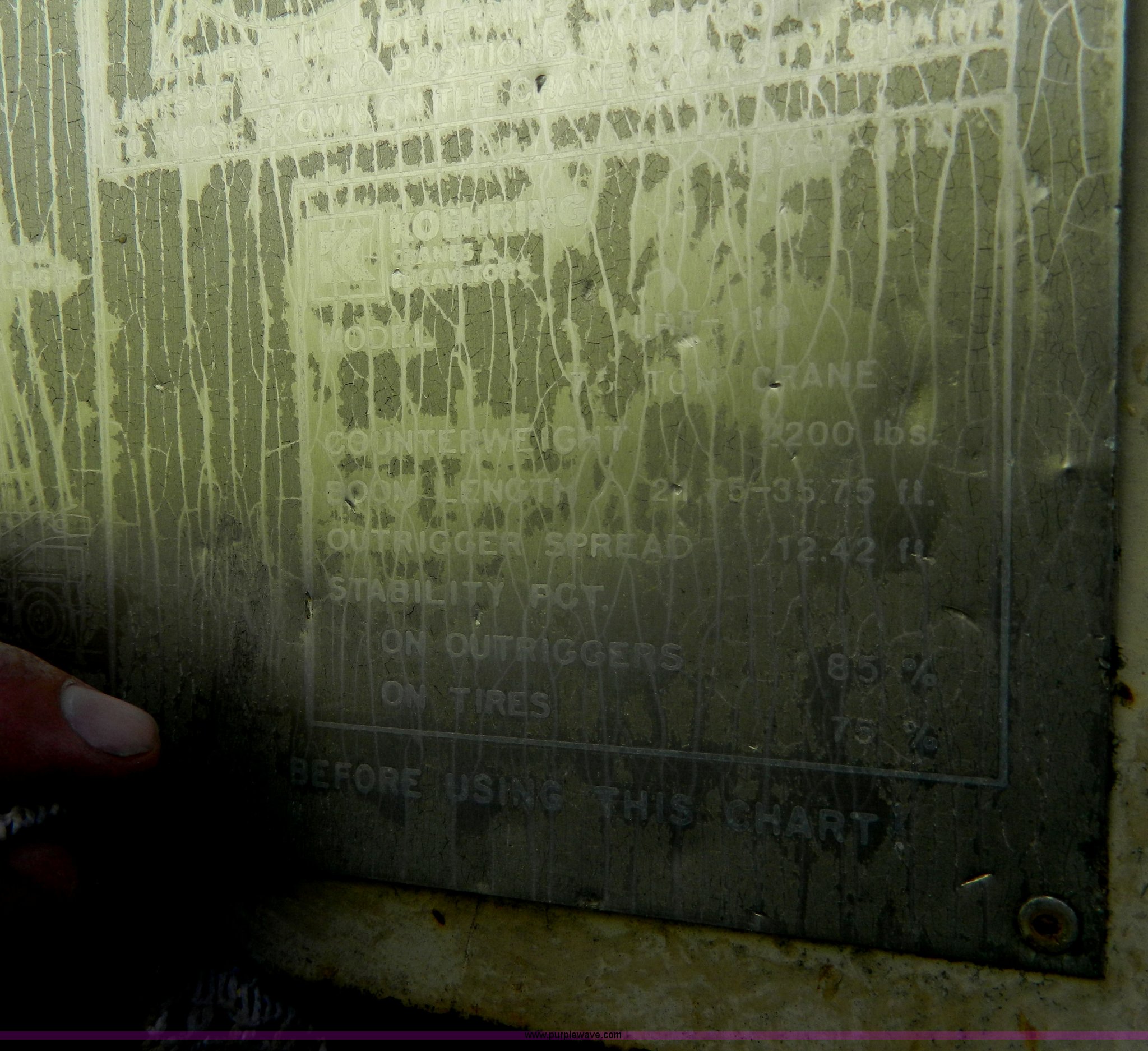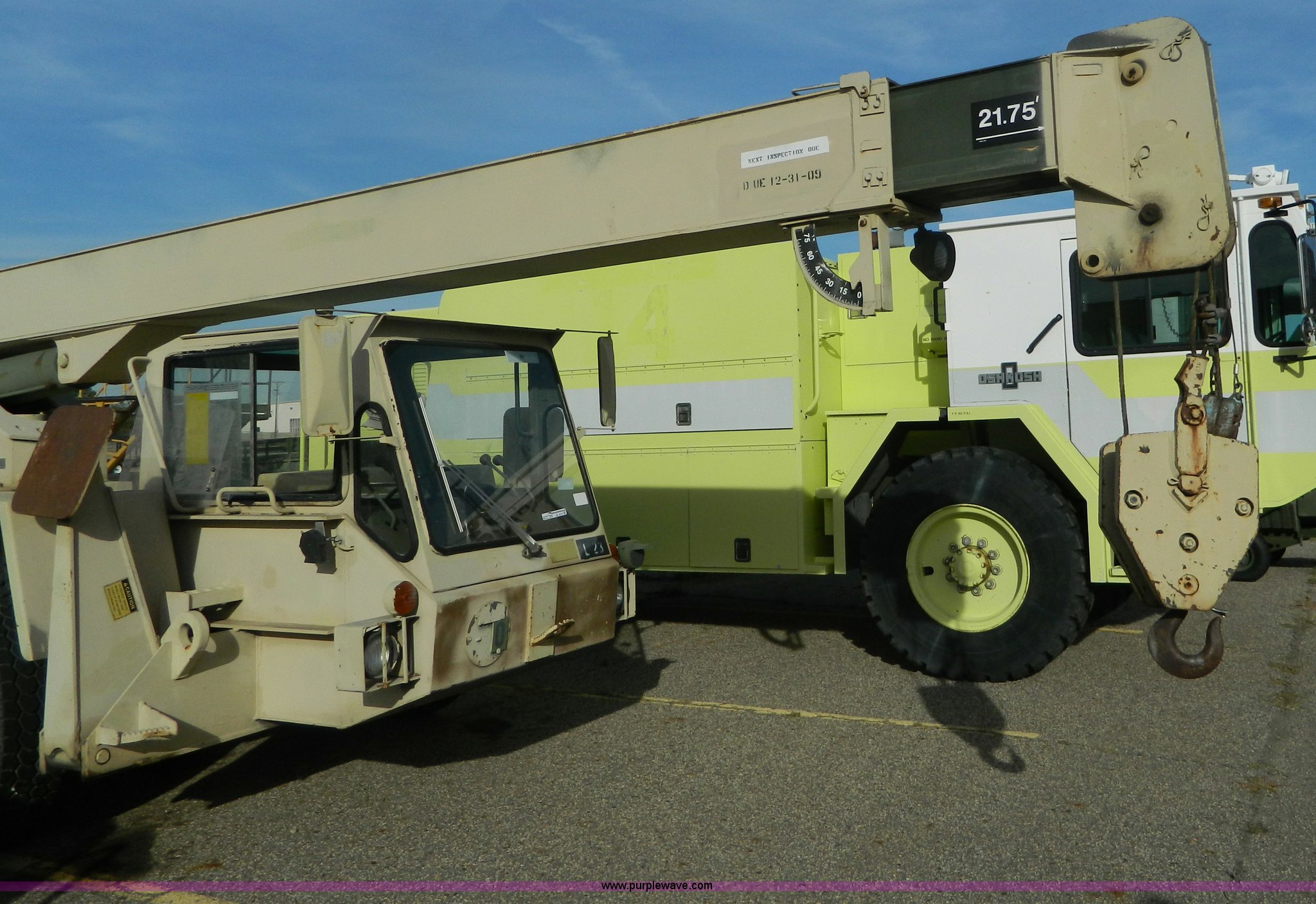U.S. Surplus LRT-10 wheel mounted crane. 973 hours on meter, Diesel engine, 4F-1R gears, Four wheel drive, 21.75' boom, 7 ton capacity, 12' outrigger spread, 12R22.5 tires, 22,750 lbs. base operating weight, Boom has bleed down issue, Serial 99142. 3237 Arnold. Salina, KS 67401