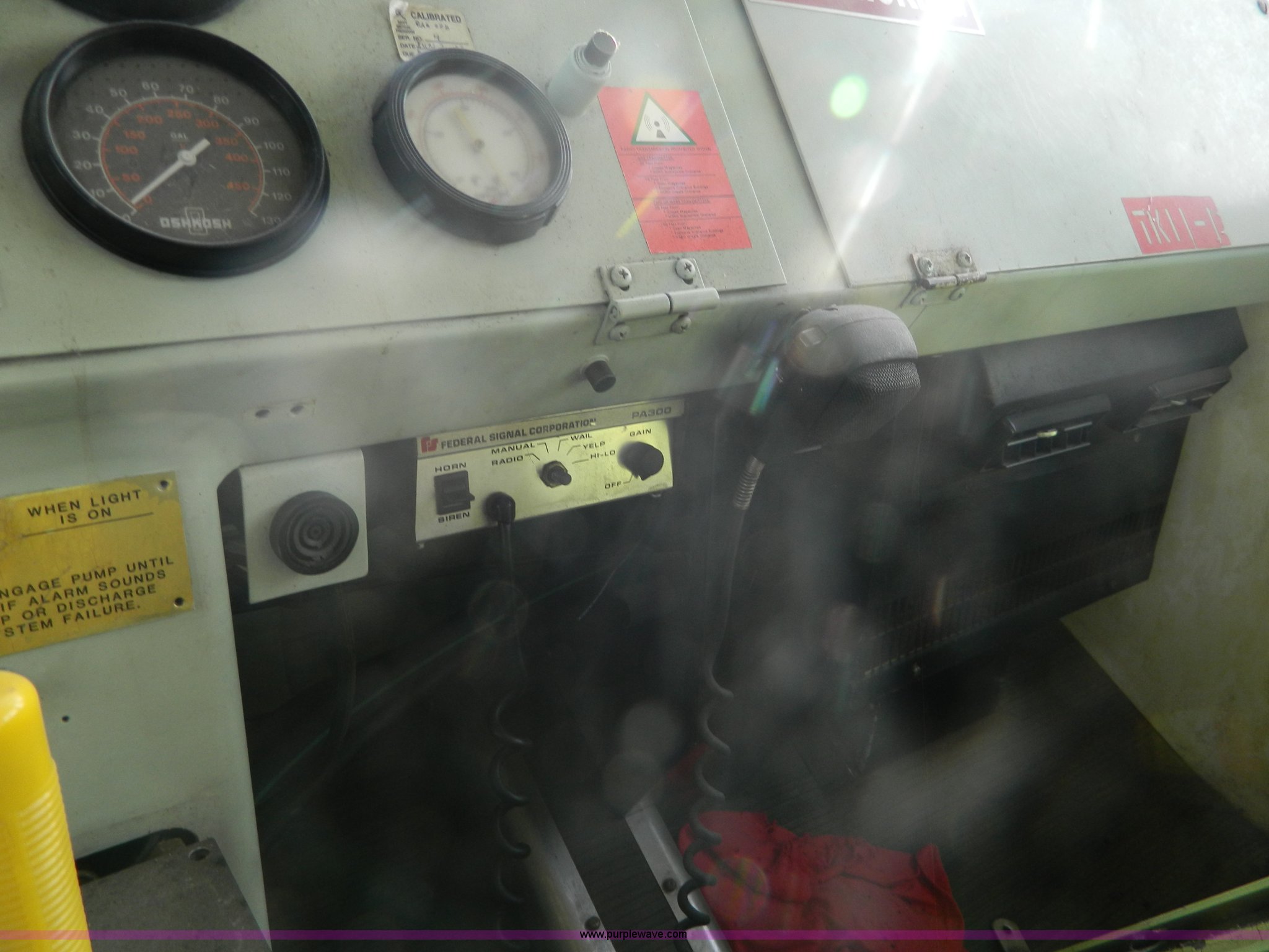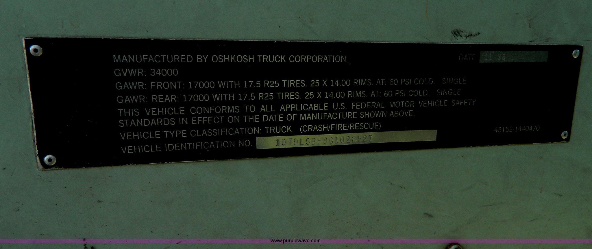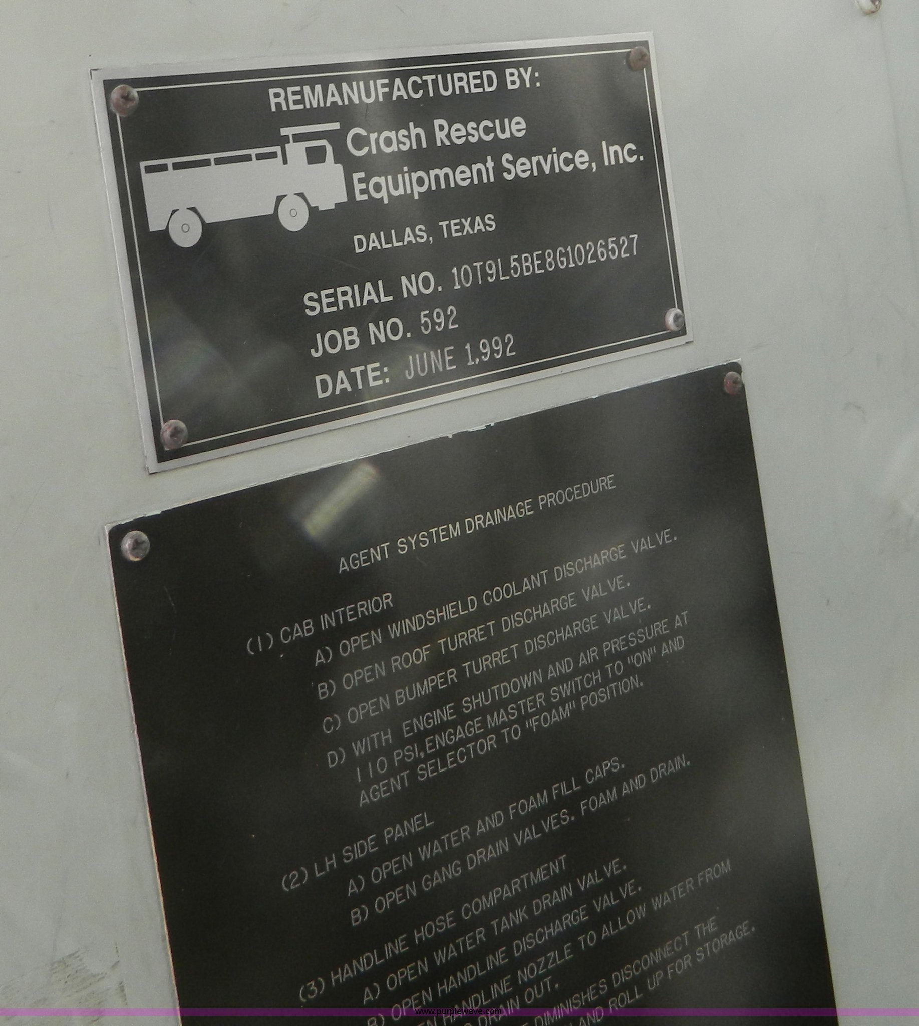 1985 Oshkosh ARFF firetruck. 14,675 miles on odometer, 2,742 hours on meter, Cummins NTC-400 diesel engine, Automatic transmission, Differential lock, Heat, 1,000 gallon water tank, Triple Agent hose reel and nozzle, Roof and bumper turrets, 500 gpm roof turret, 250 gpm bumper turret, 700 gpm pump, Air brakes, 17.5R22.5 tires, GVWR 34,000 lbs, 21,400 lbs empty weight, Needs battery. Seller is a government entity who will be assigning and distributing the title. Please contact the seller for distribution questions. 10T9L5BE8G1026527. 3237 Arnold. Salina, KS 67401