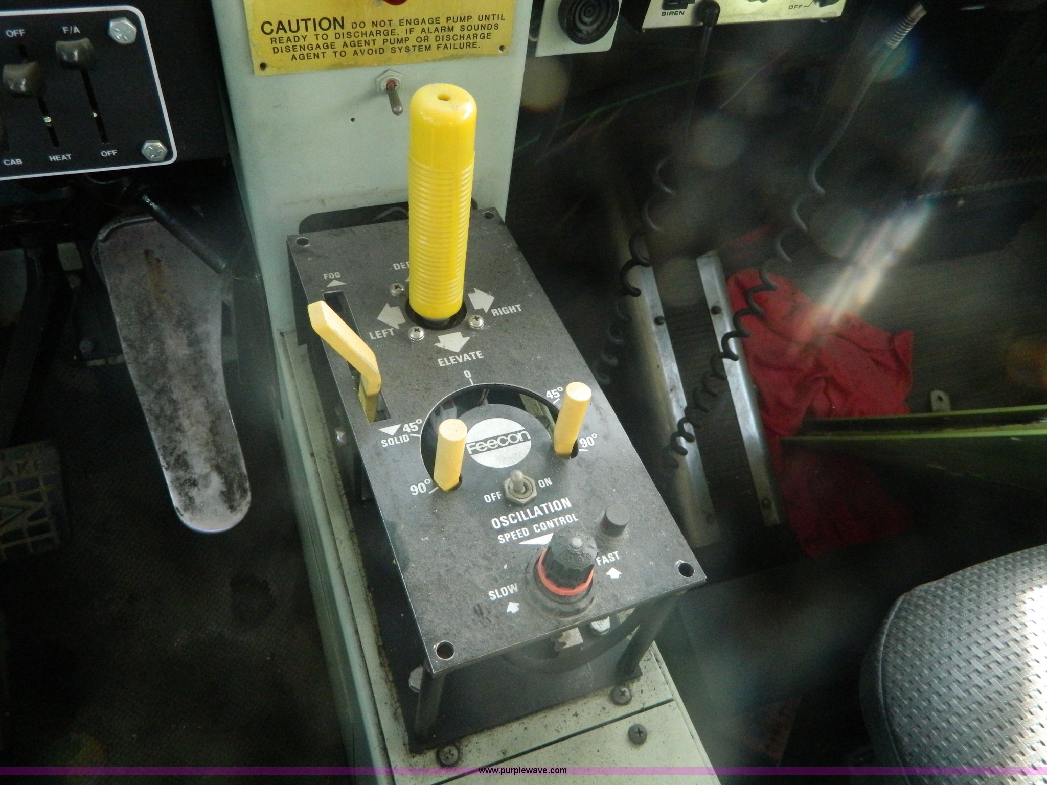 Purple Wave is selling a used Fire Truck or Emergency Vehicle in Kansas. This item is a 1985 Oshkosh ARFF firetruck with the following: 14,675 miles on odometer, 2,742 hours on meter, Cummins NTC-400 diesel engine, Automatic transmission, Differential lock, Heat, 1,000 gallon water tank, Triple Agent hose reel and nozzle, Roof and bumper turrets, 500 gpm roof turret, 250 gpm bumper turret, 700 gpm pump, Air brakes, 17.5R22.5 tires, GVWR 34,000 lbs, 21,400 lbs empty weight, Needs battery