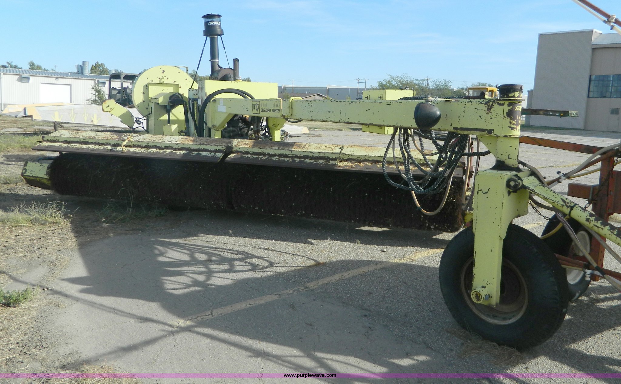 Purple Wave is selling a used Broom in Kansas. This item is a Blizzard Buster hydraulic broom with the following: 593 hours on meter, Caterpillar 3208 diesel engine, 16' broom, Pintle hitch, Serial 150014