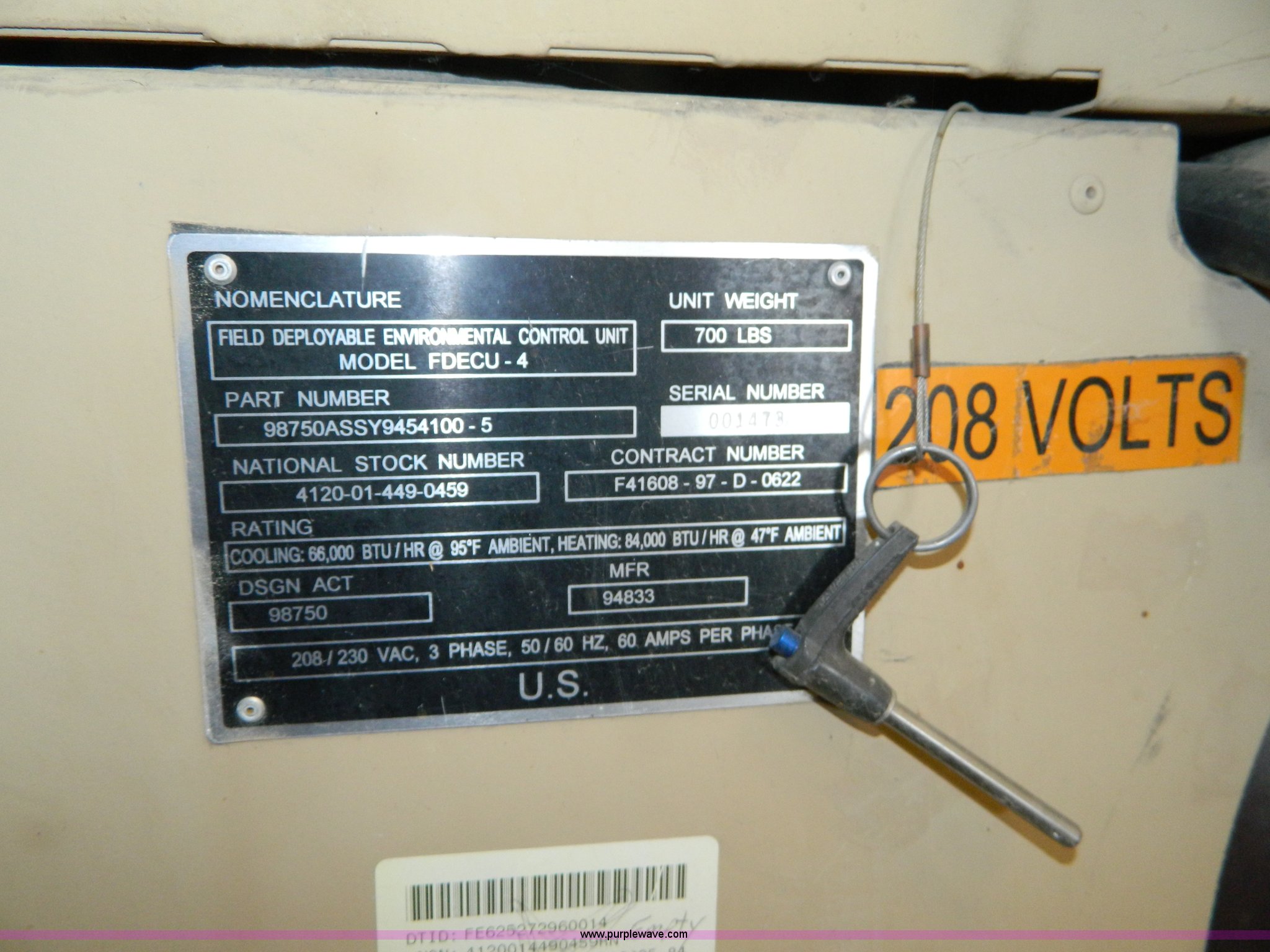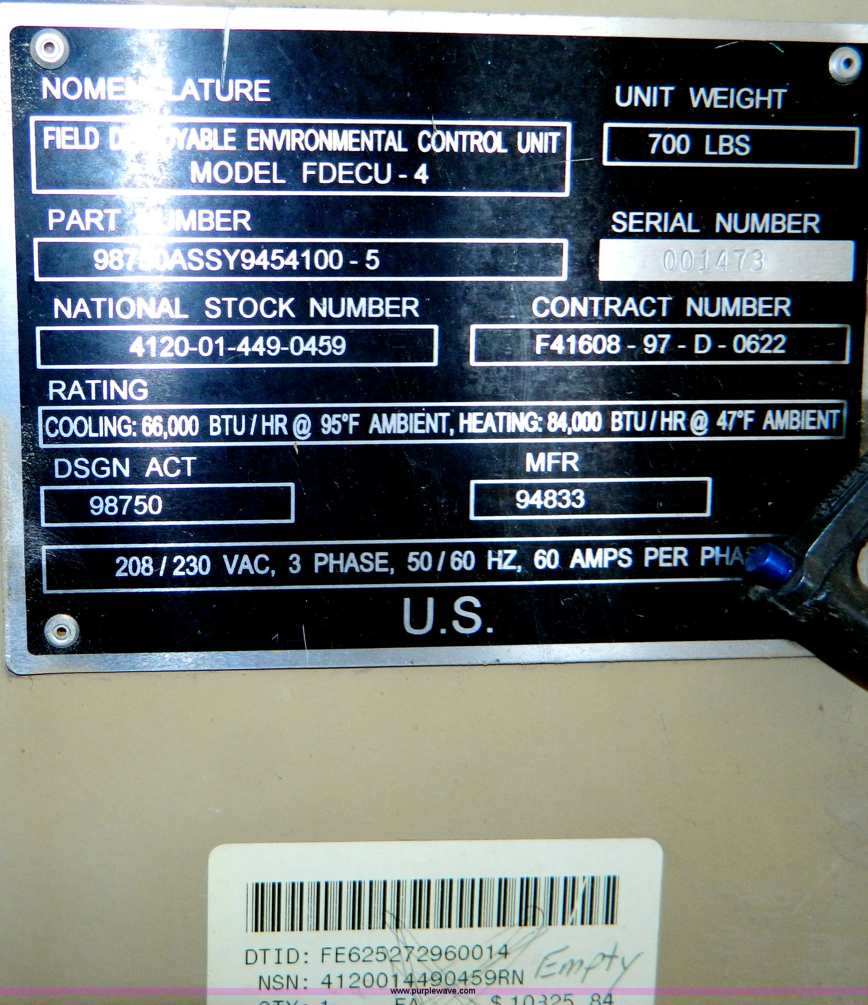 Purple Wave is selling a used Tools in Kansas. This item is a U.S. Army surplus portable AC unit with the following: Model FDECU-4, Three phase, Serial 001473