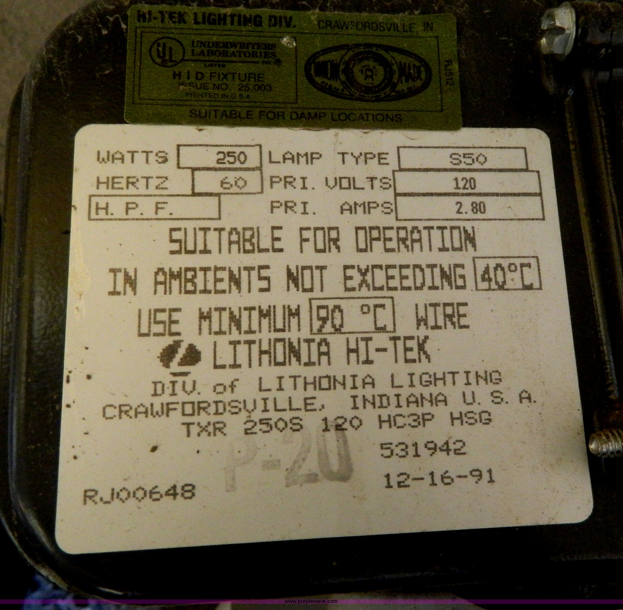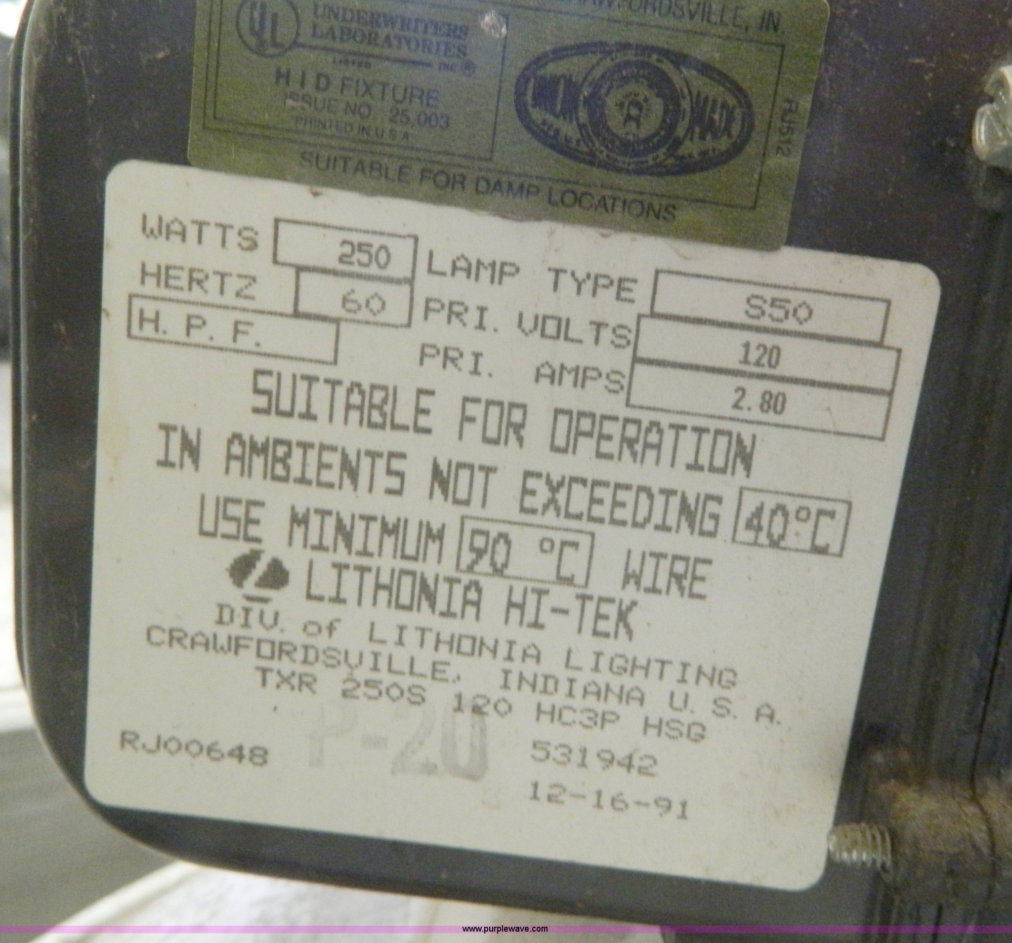Purple Wave is selling a used Building Materials in Kansas. This item is a (13) Lithonia S50 lights with the following: 250 watts, 120V