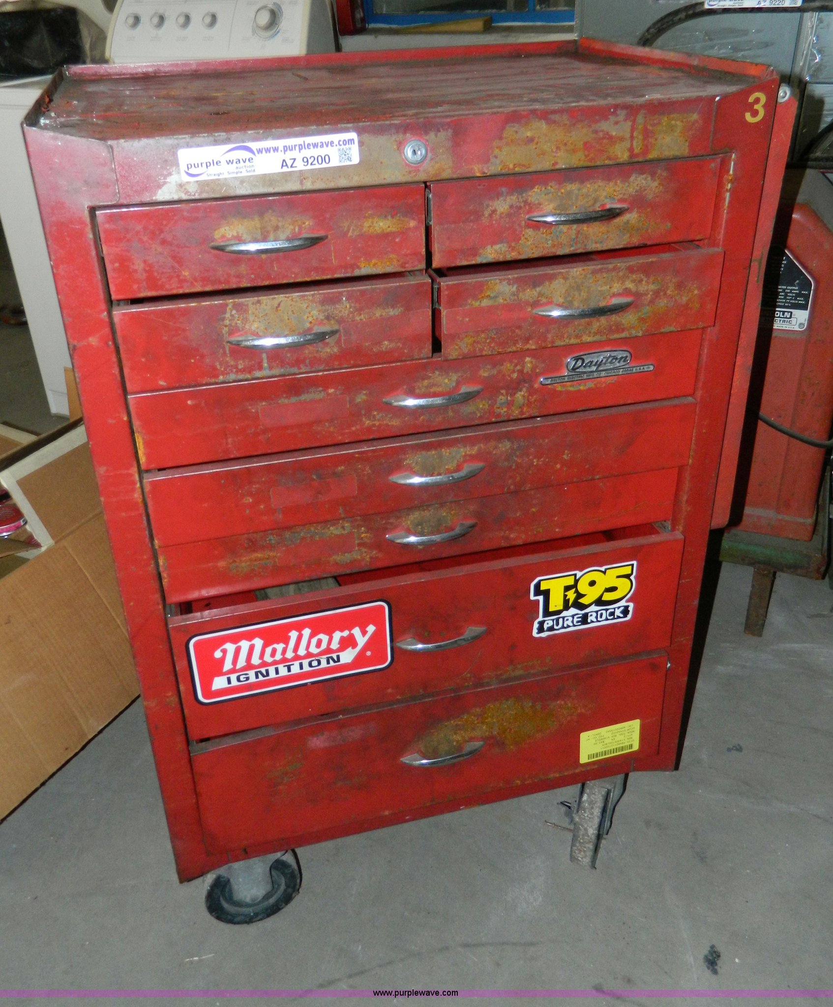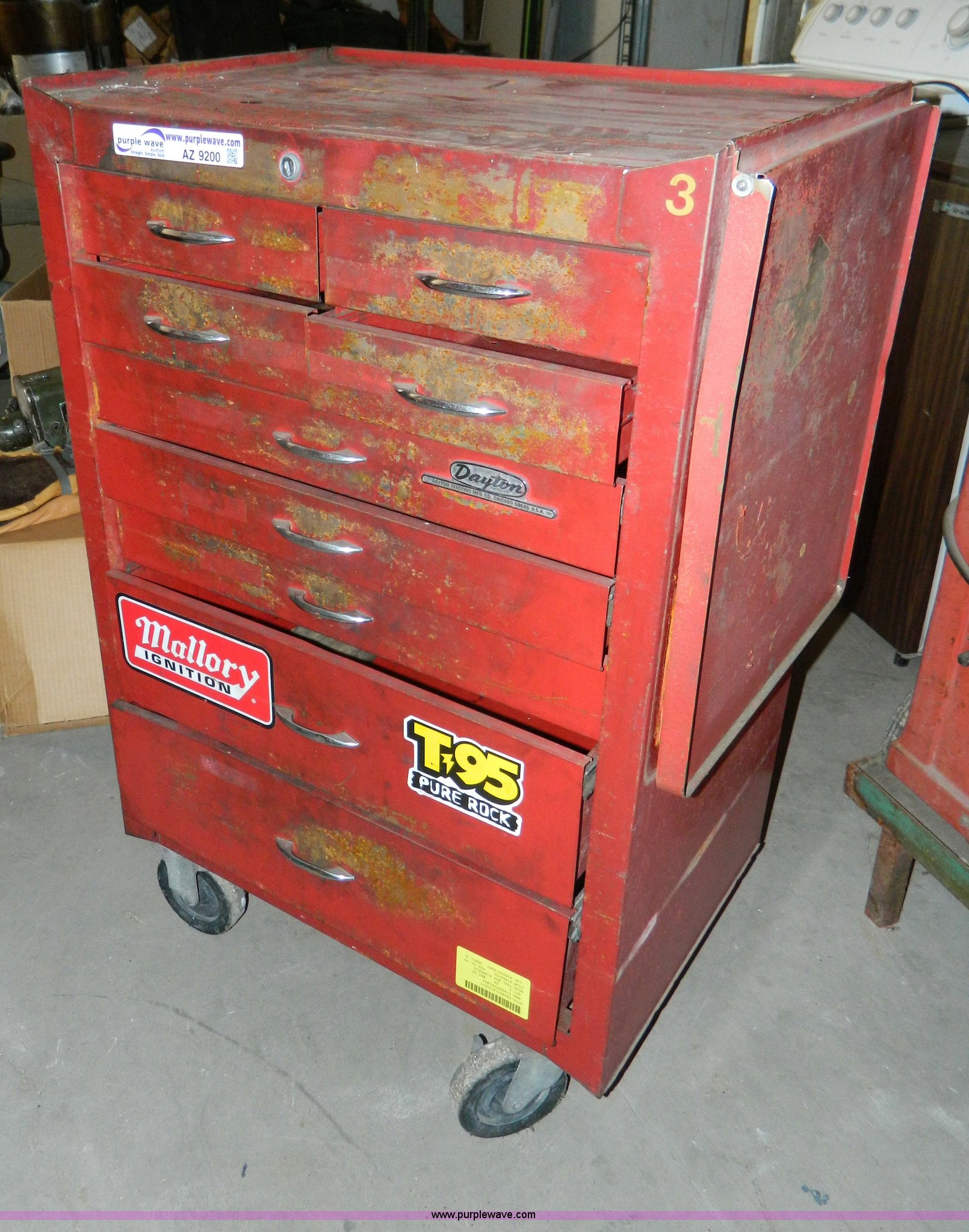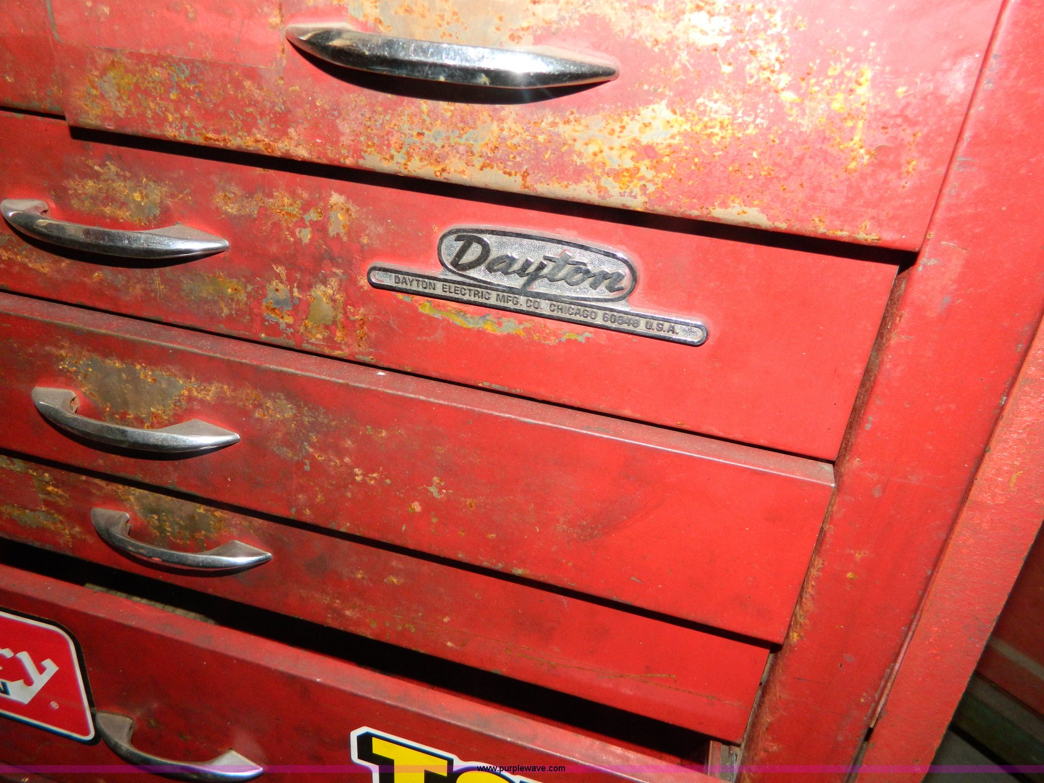 Purple Wave is selling a used Tools in Kansas. This item is a Dayton nine drawer bottom box tool cabinet with the following: Casters