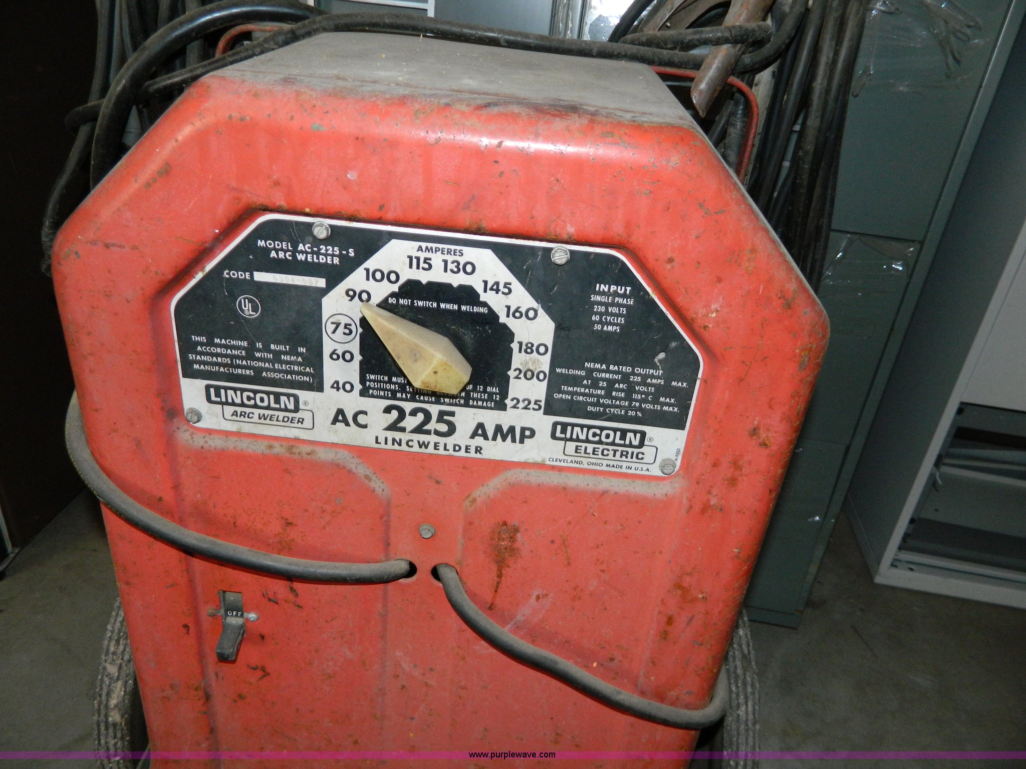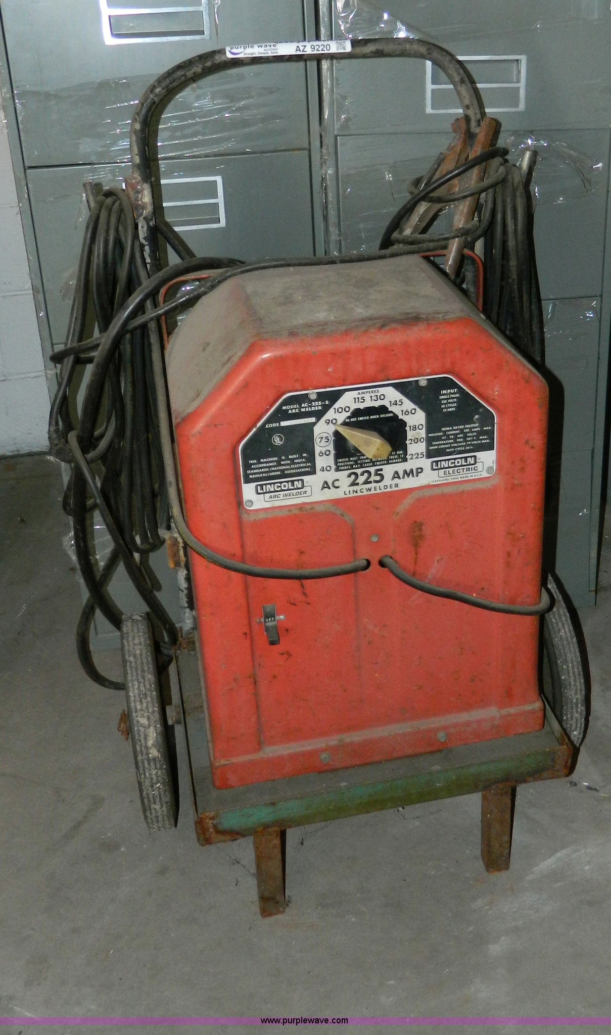 Purple Wave is selling a used Welder (Manual) in Kansas. This item is a Lincoln arc welder with the following: 225 amp, Leads, Cart, Serial 6304-907
