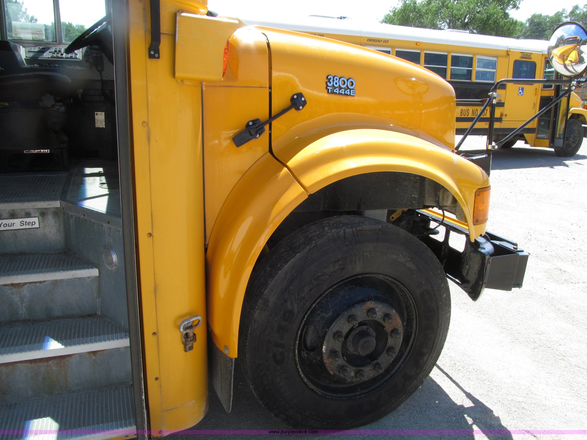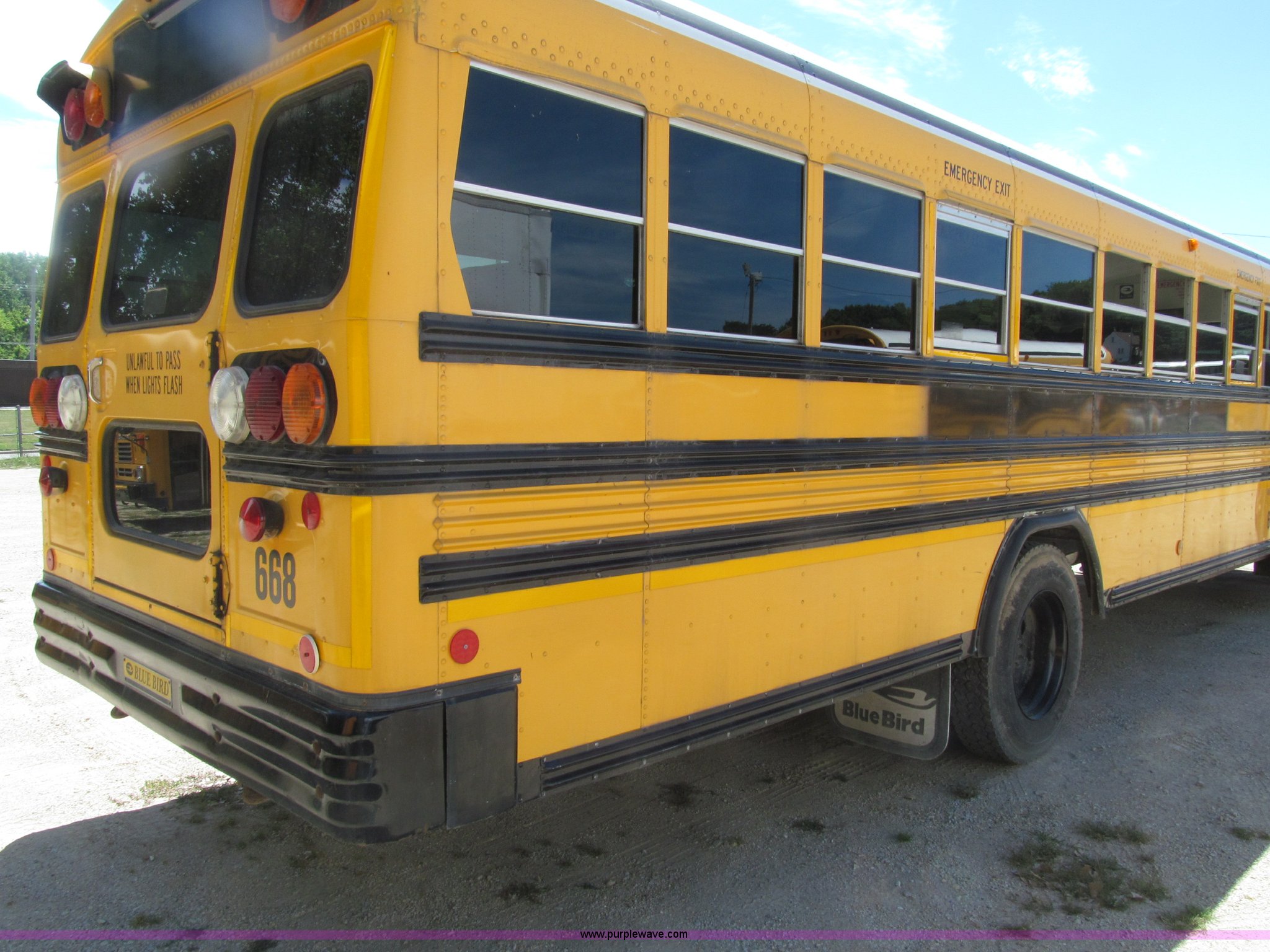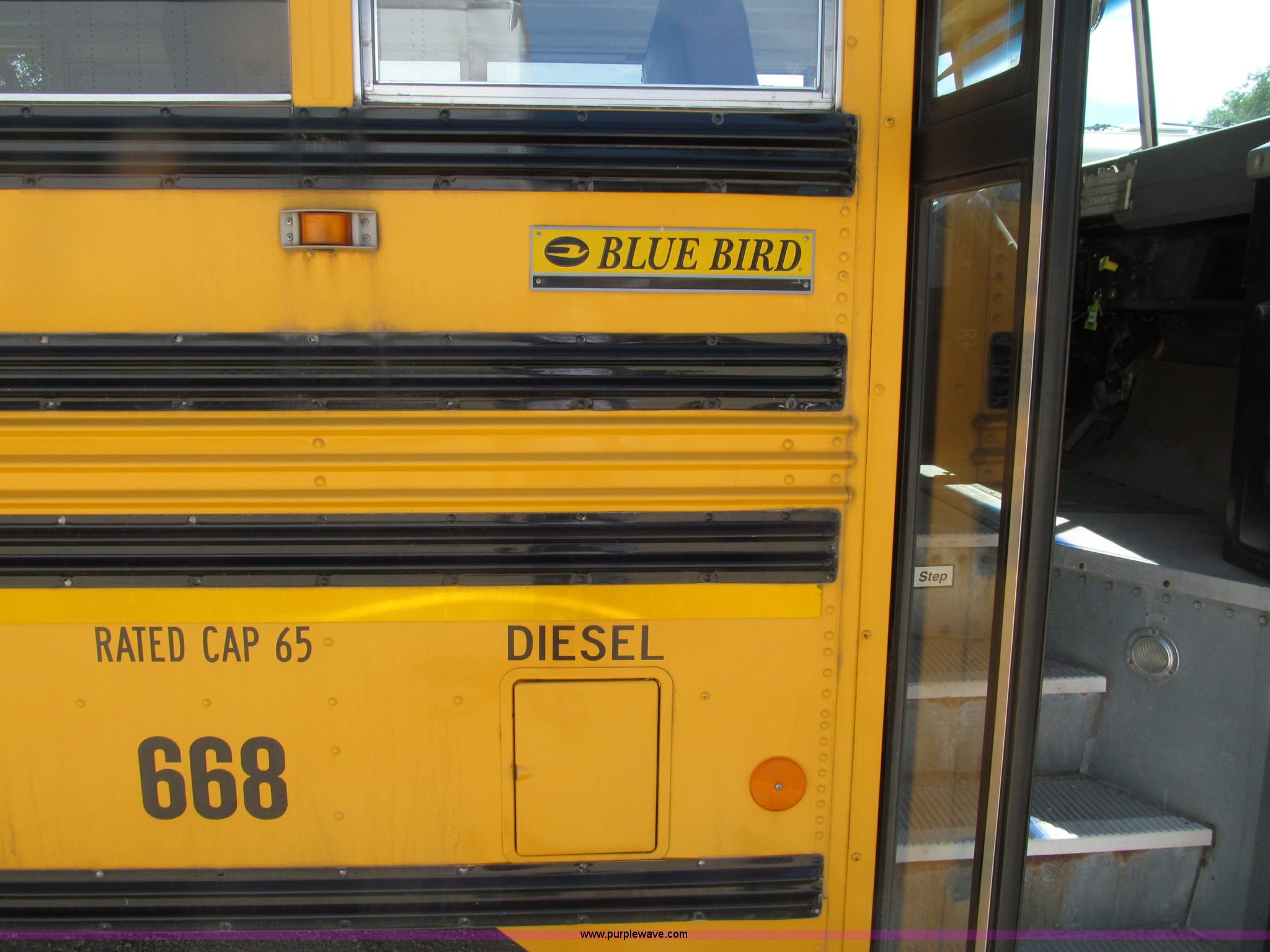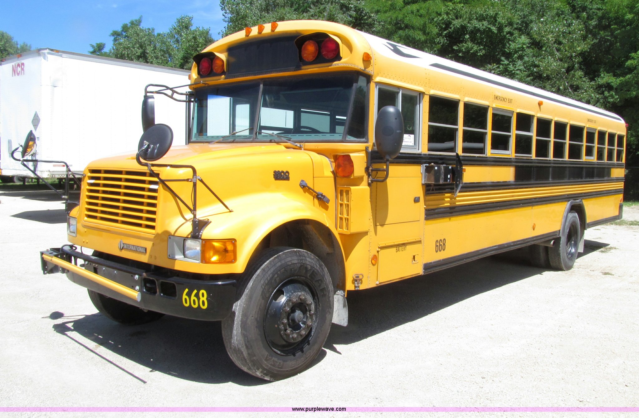 Purple Wave is selling a used Bus in Iowa. This item is a 2003 International 3800 school bus with the following: 117,766 actual miles, 8,923 hours on meter, International T444E 7.3L V8 turbo diesel engine, Automatic transmission, Heat, Tilt, Cruise, AM/FM/cassette, Manual windows, Vinyl interior, Bostrom air suspension driver's seat, 65 passenger capacity, Bluebird body, Body No. M113347, (7) emergency egress, Air suspension, Air brakes, 254" wheelbase, 10R22.5 tires, GVWR 29,500 lbs, FAWR 10,000 lbs, RAWR 19,500 lbs, Unit# 668