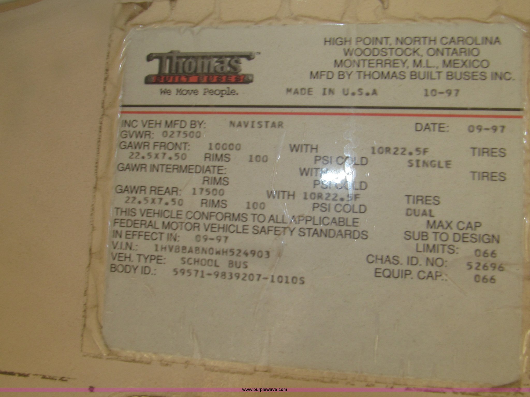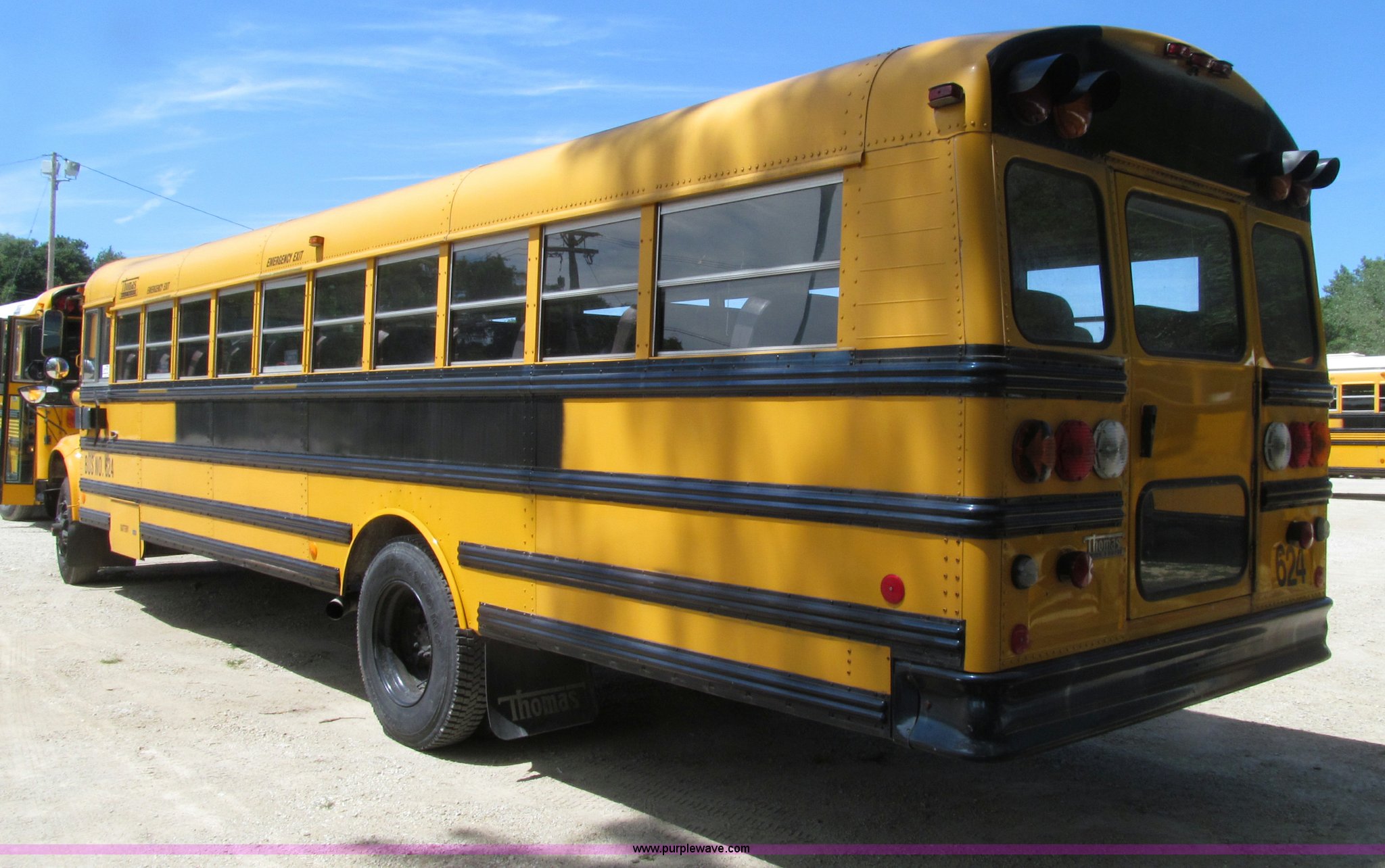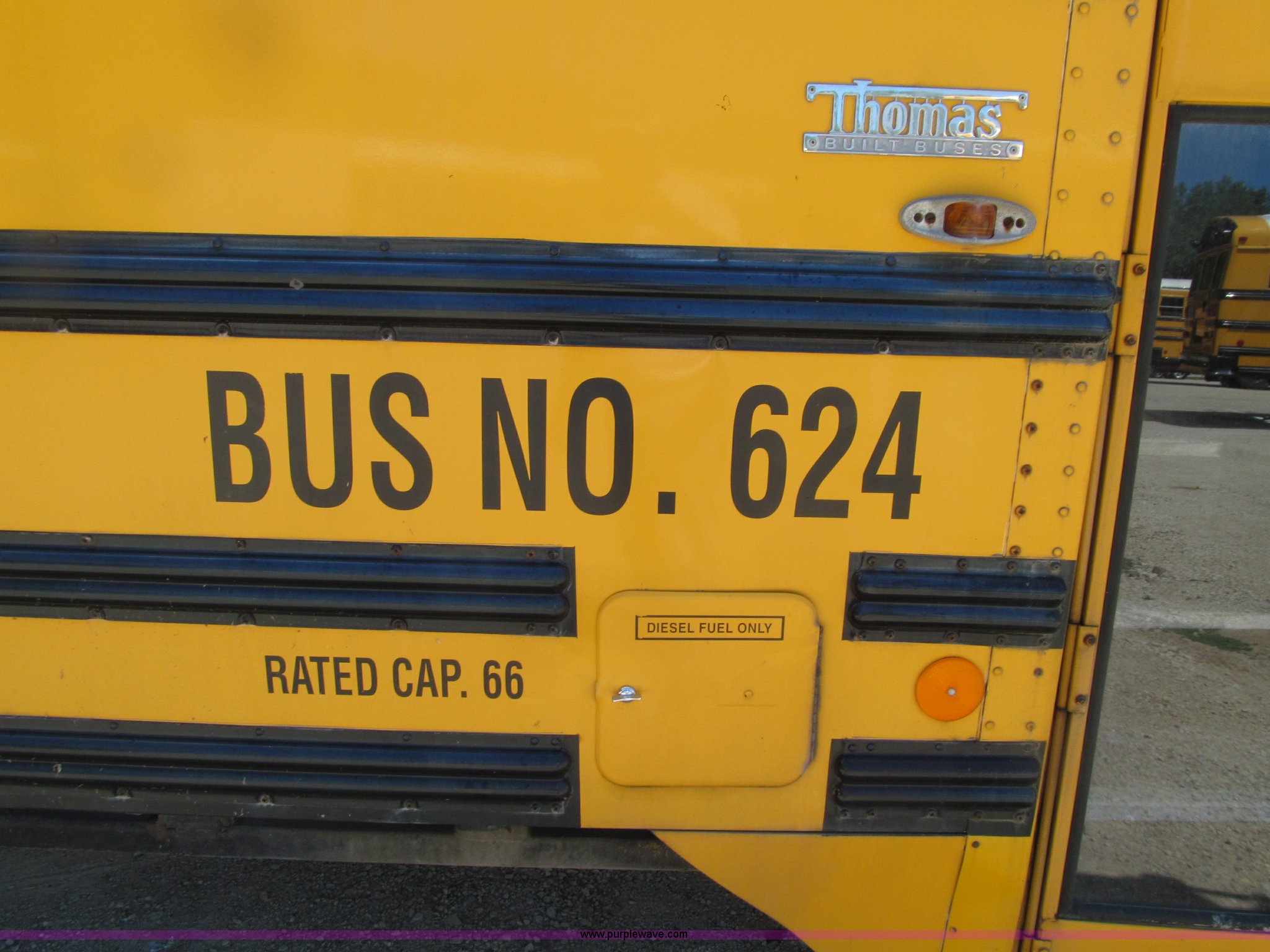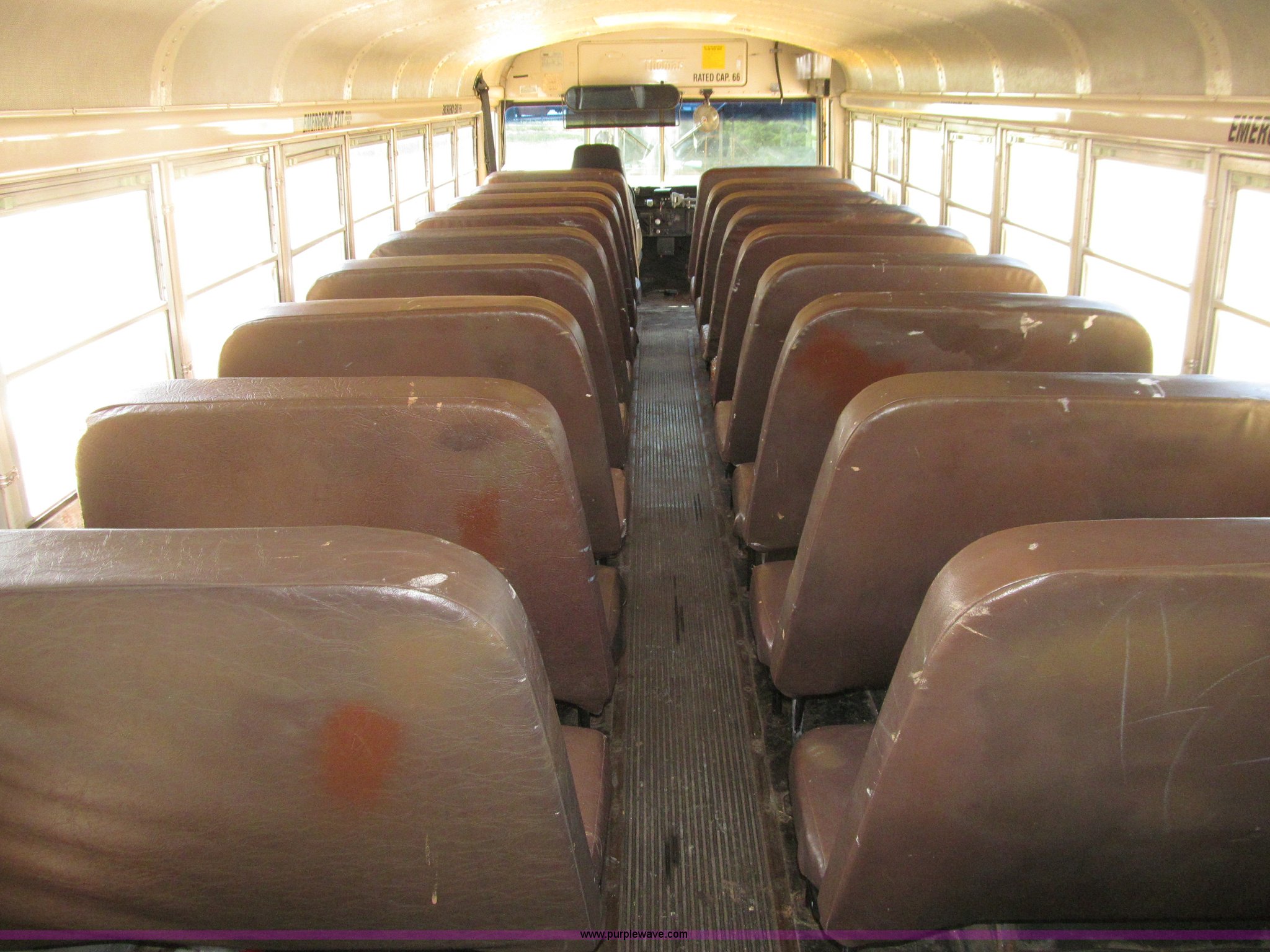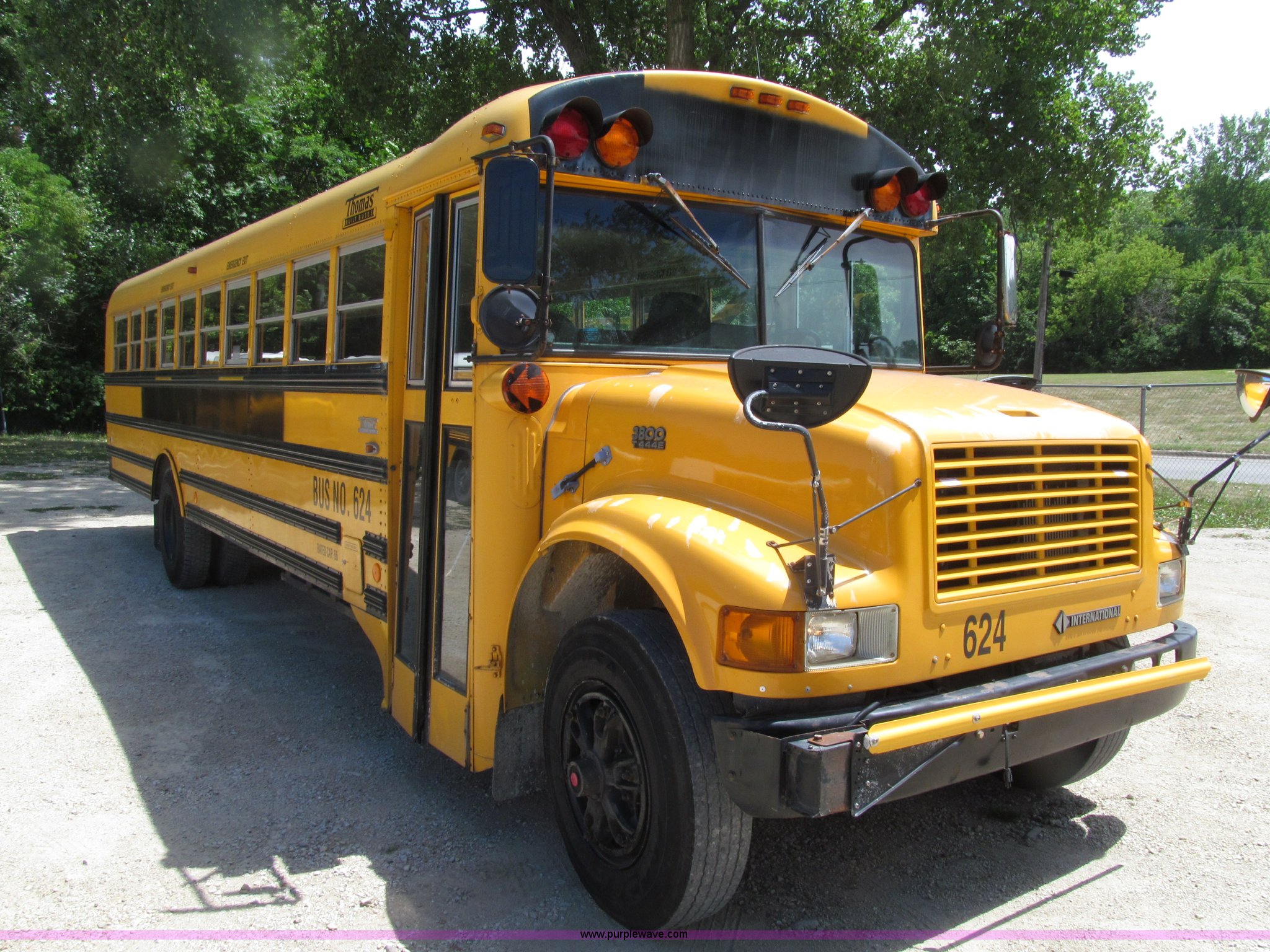Purple Wave is selling a used Bus in Iowa. This item is a 1998 International 3800 Thomas school bus with the following: 195,670 acutal miles, 14,145 hours on meter, International T444 7.3L V8 diesel engine, 210 HP, Automatic transmission, Heat, Tilt, Cruise, Manual windows, Cush-N-Aire driver's seat, Vinyl interior, (7) emergency egress, 66 passenger capacity, Spring suspension, Air brakes, 10R22.5 tires, GVWR 27,500 lbs, FAWR 10,000 lbs, RAWR 17,500 lbs, Numerous paint stains on seats, Unit# 624